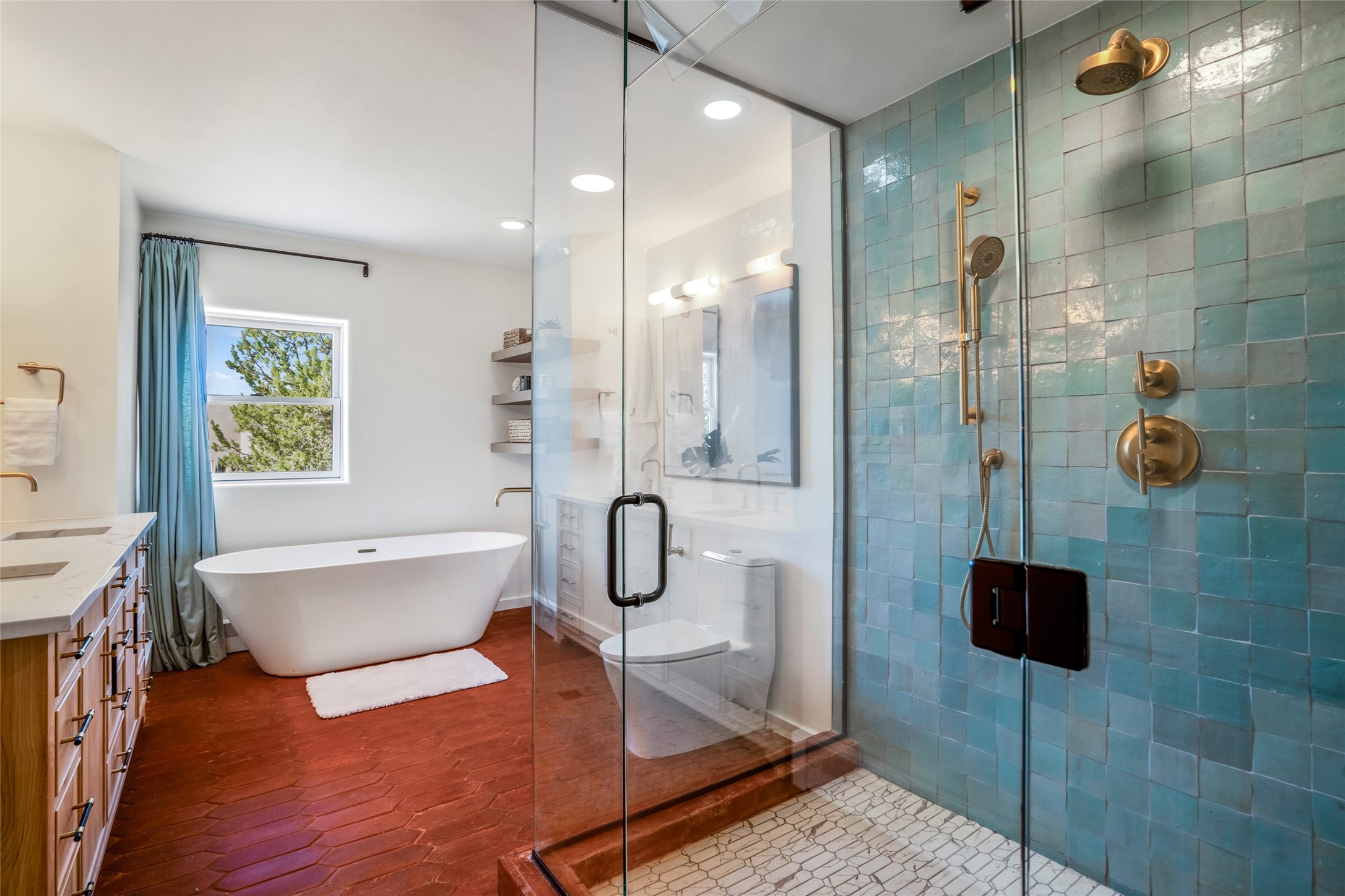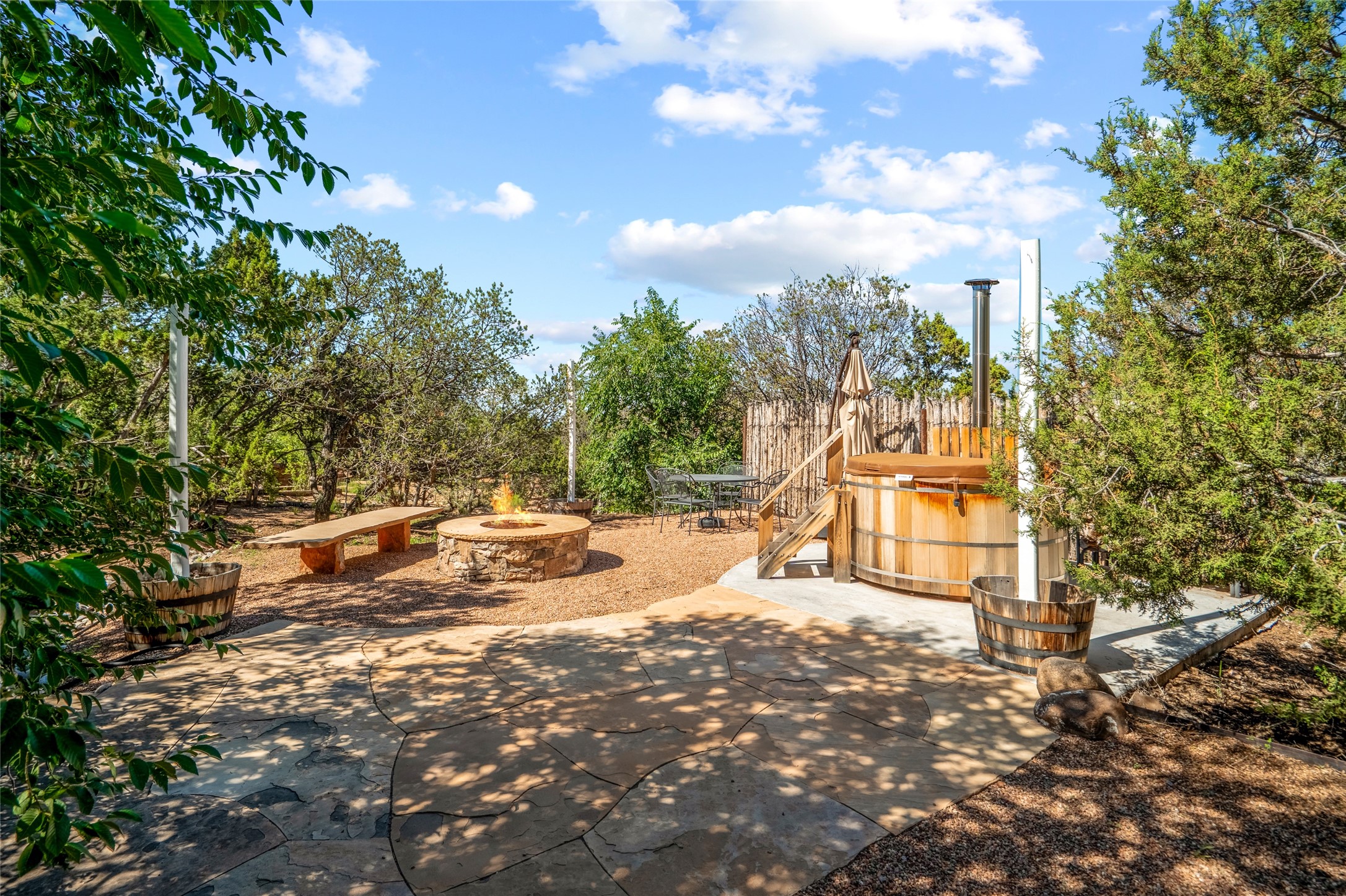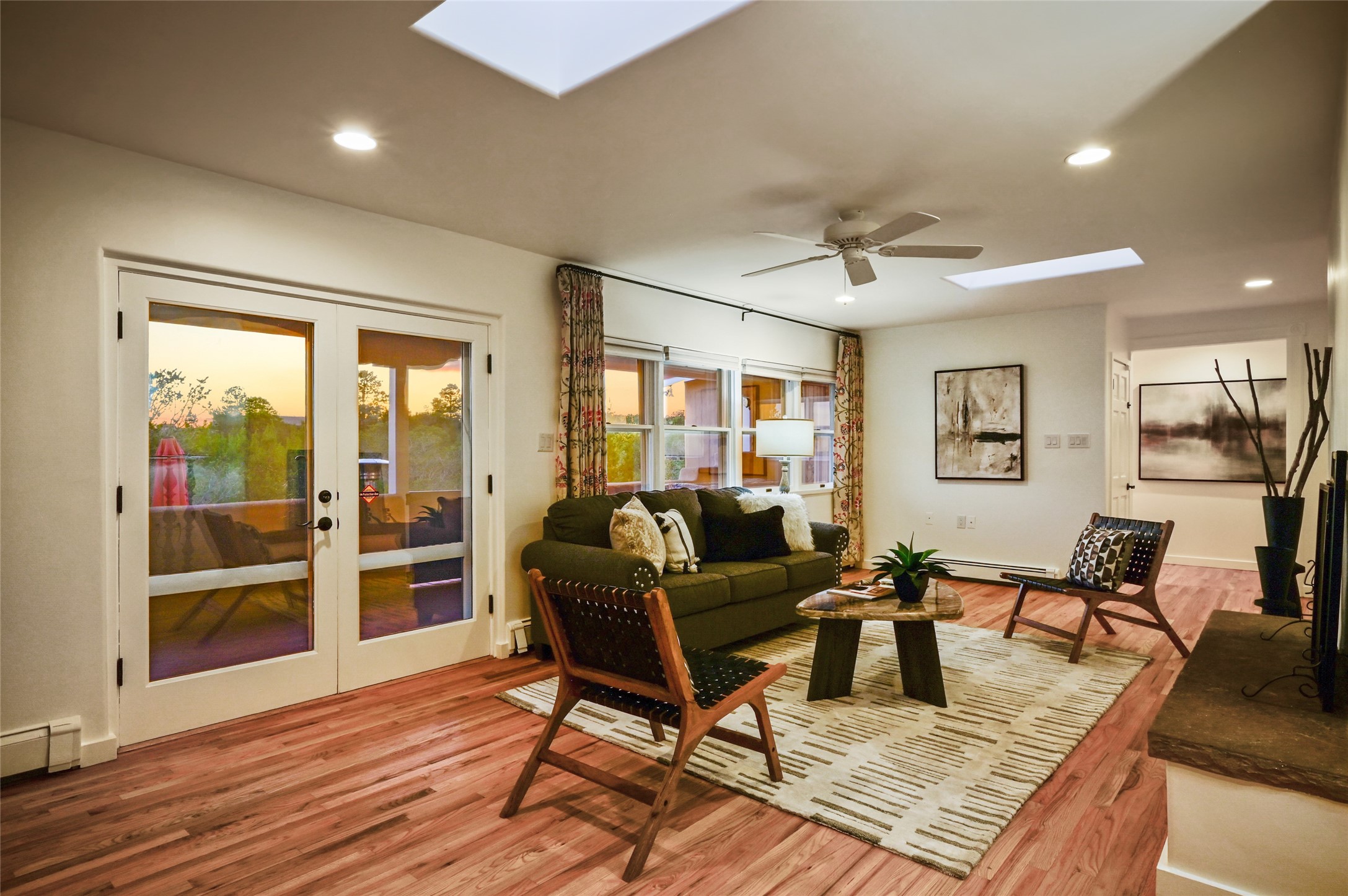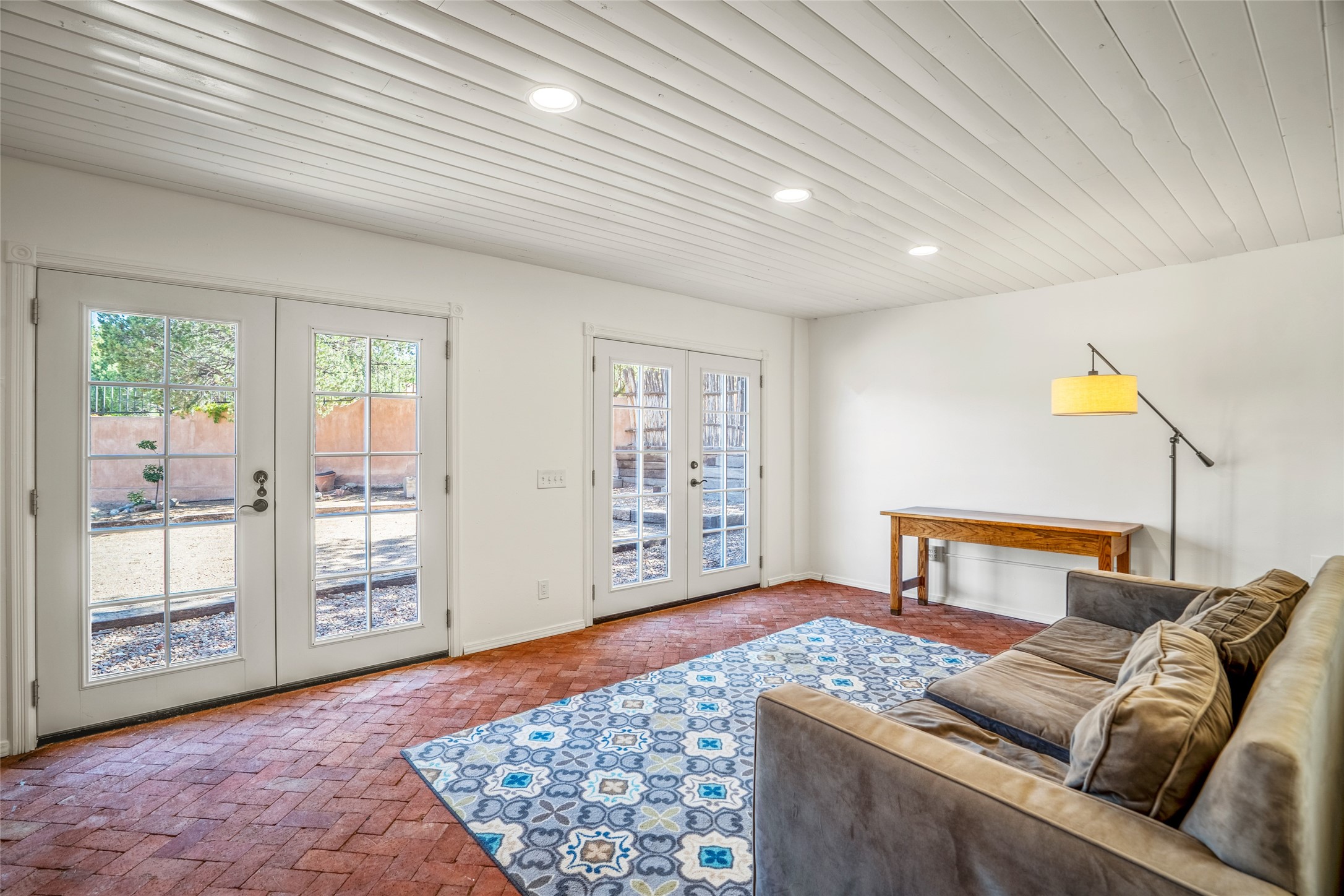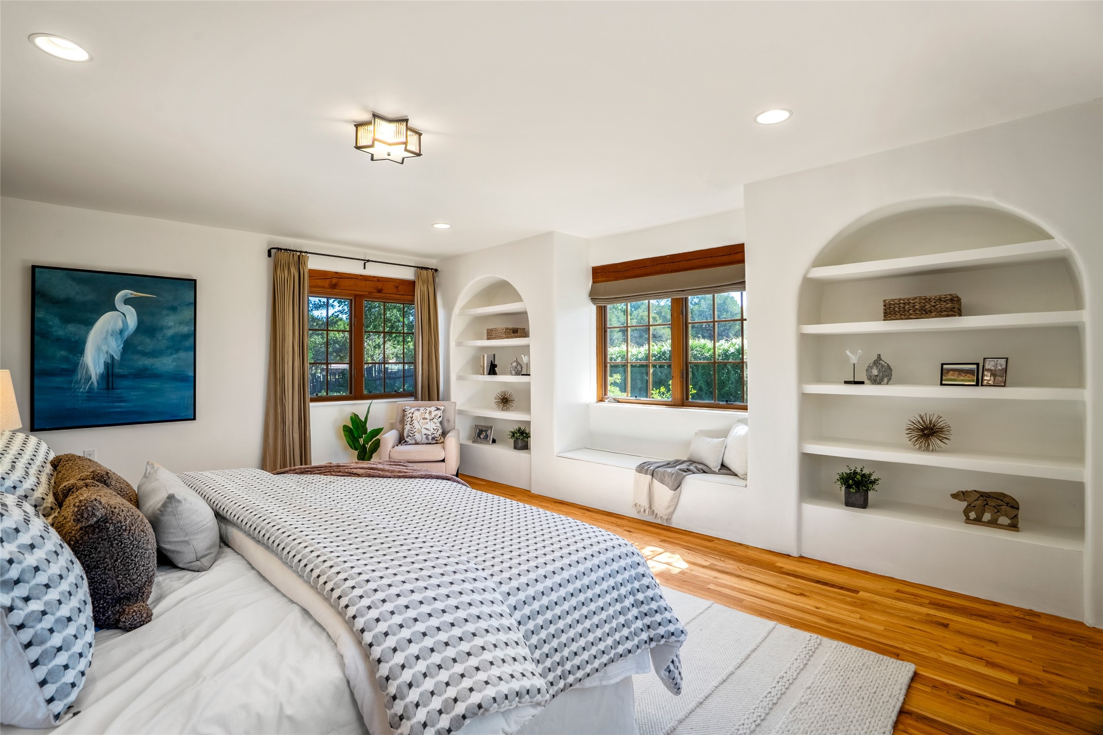 Spacious home near the downtown Plaza, Canyon Road, restaurants, and shopping. Five bedroom home plus a large downstairs area that is perfect as an attached guest house, multi-generational living, studio or office(s). Dual living areas upstairs, both with fireplaces. The dining area has french doors opening up to the front patio perfectly accommodating large gatherings. Lovely, cozy primary suite with a large updated bathroom featuring a large shower and soaking tub. Spacious bright kitchen featuring stainless steel appliances, walk-in pantry, and large breakfast nook area overlooking the City. The portal area on the west side of the home is perfect for evening dining or morning coffee. The downstairs area has two multi-purpose rooms, with the fifth bedroom/bathroom being located downstairs. Newer solar system just a few years old that is owned. Large and spacious basement storage area. Lovely views of the City lights, Ortiz, Sandia, and Sangre de Cristo Mountains.