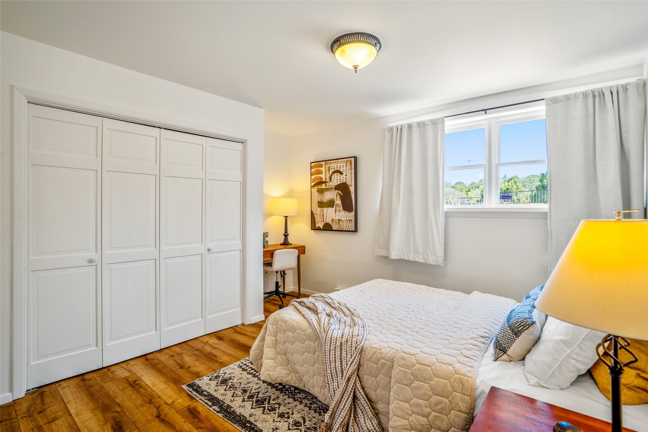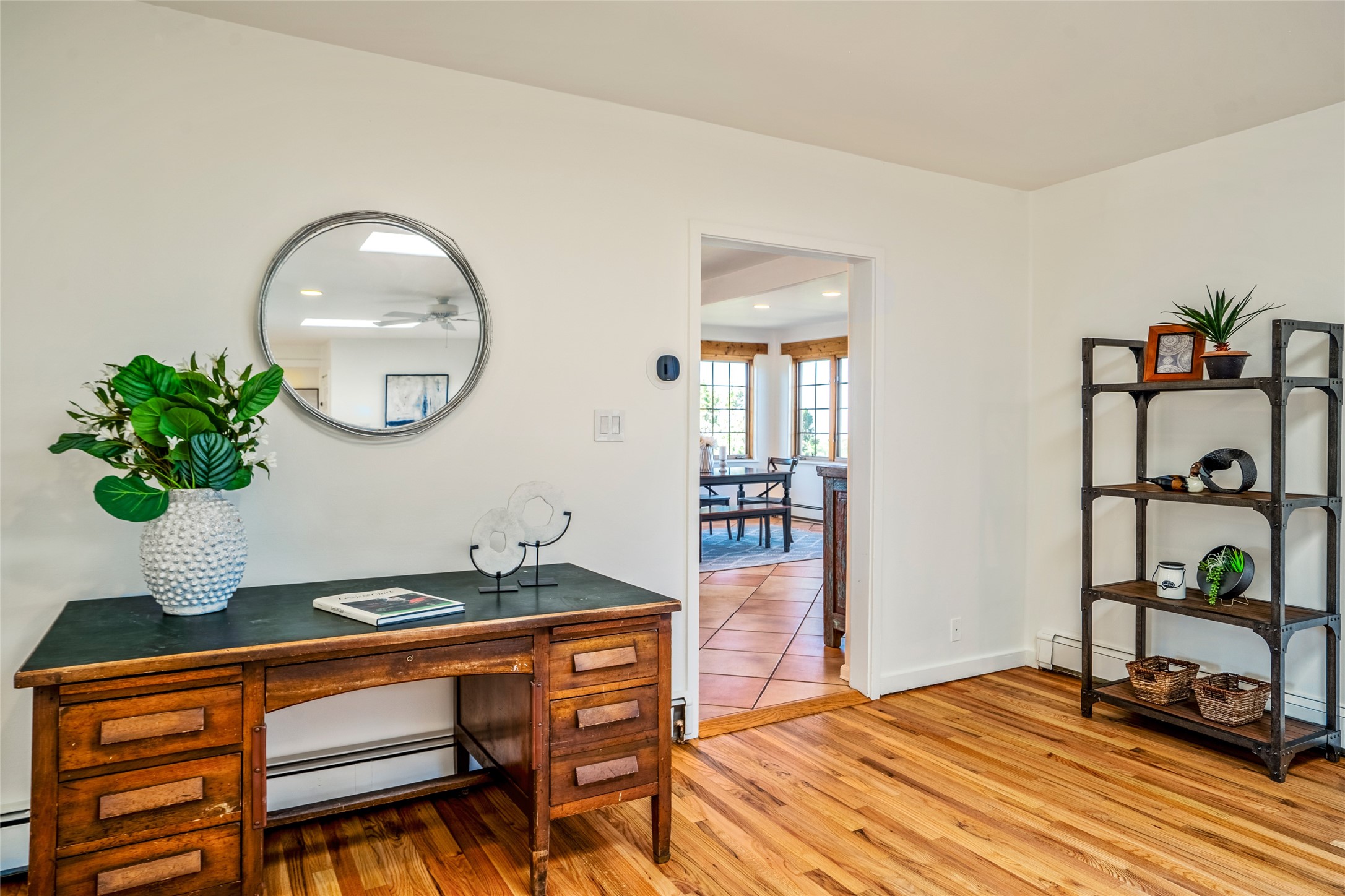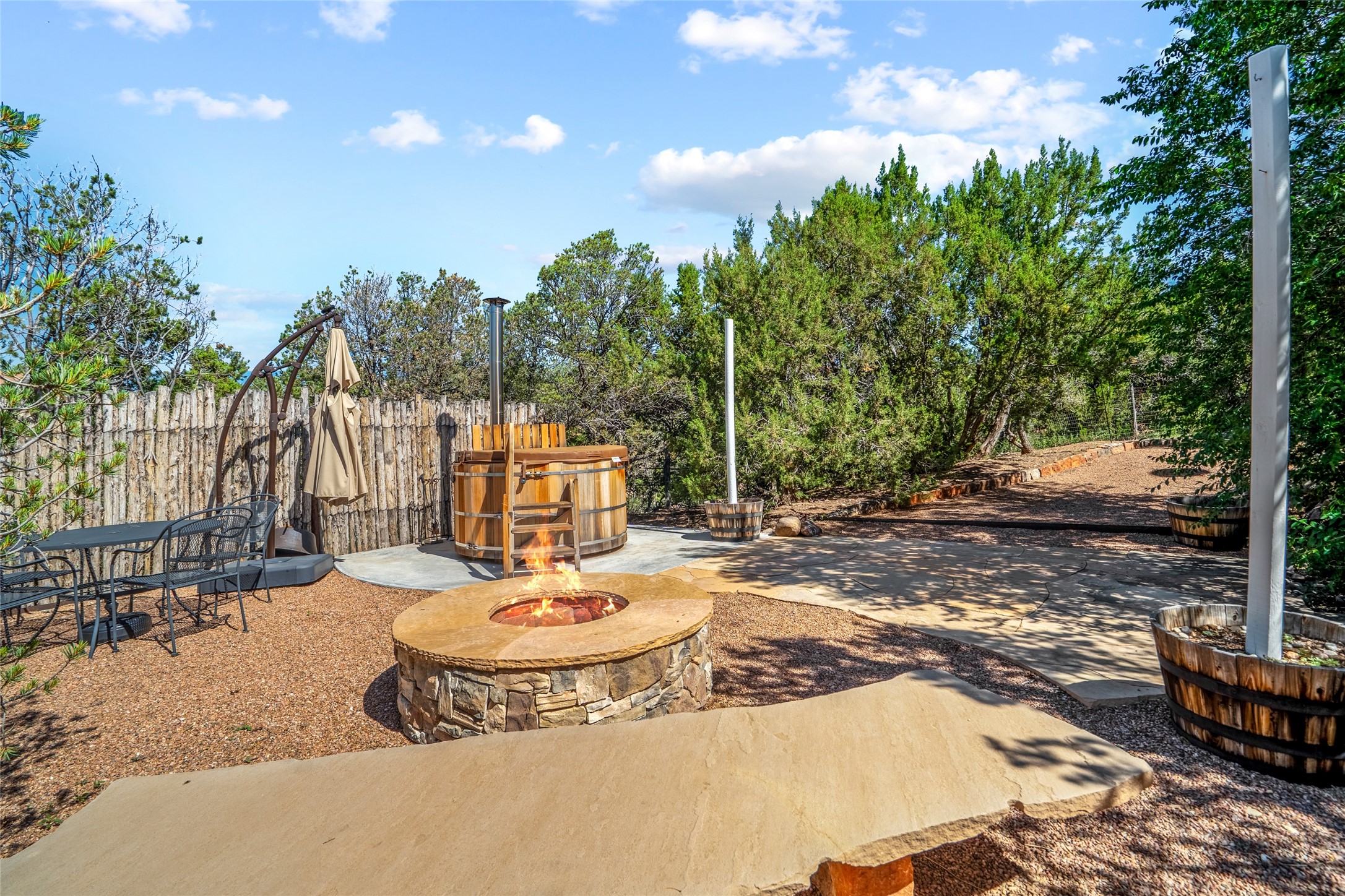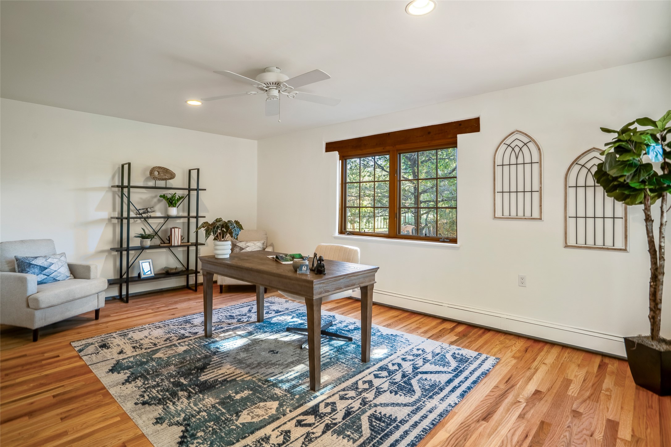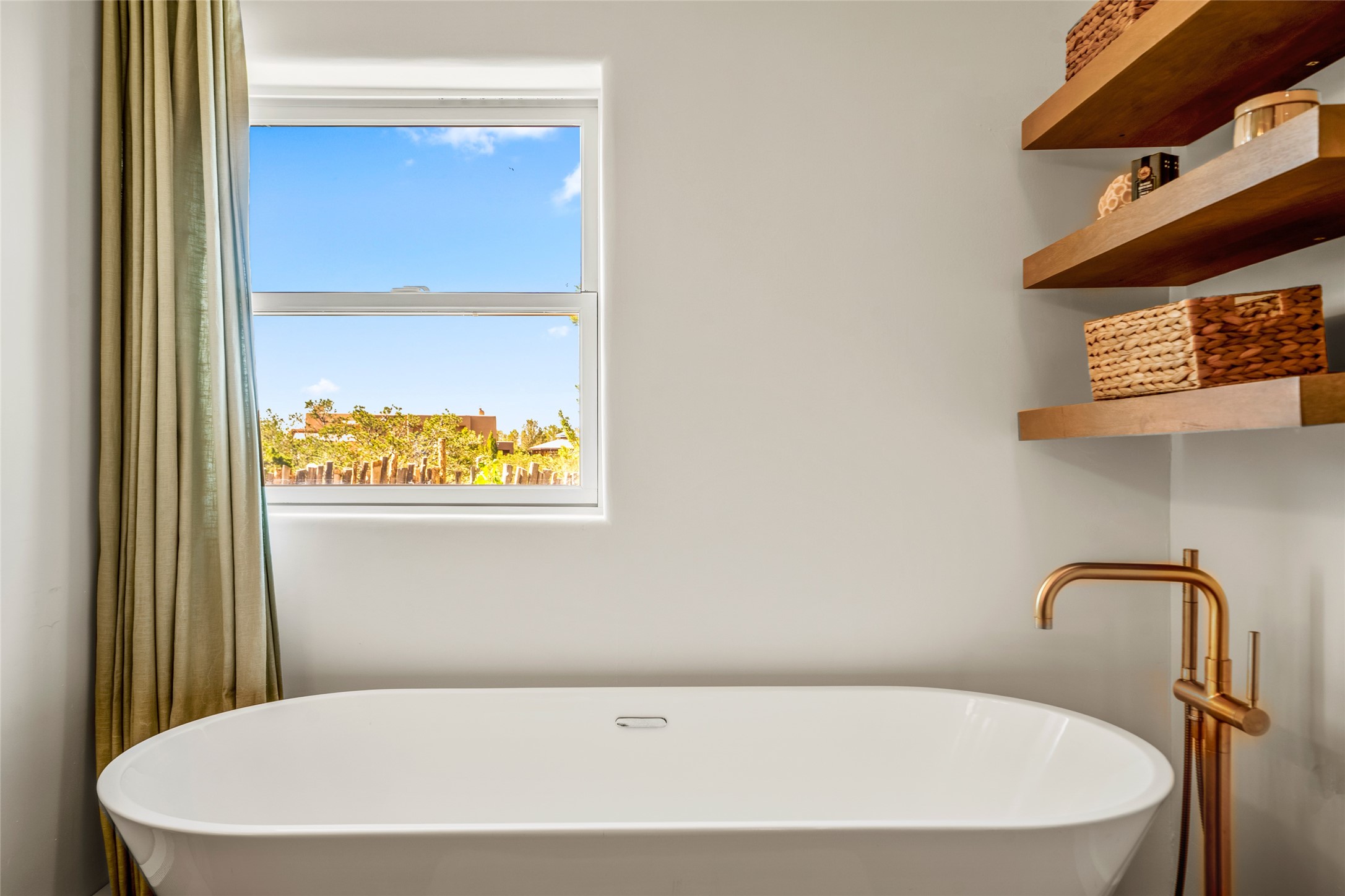 Spacious home near the downtown Plaza, Canyon Road, restaurants, and shopping. Five bedroom home plus a large downstairs area that is perfect as an attached guest house, multi-generational living, studio or office(s). Dual living areas upstairs, both with fireplaces. The dining area has french doors opening up to the front patio perfectly accommodating large gatherings. Lovely, cozy primary suite with a large updated bathroom featuring a large shower and soaking tub. Spacious bright kitchen featuring stainless steel appliances, walk-in pantry, and large breakfast nook area overlooking the City. The portal area on the west side of the home is perfect for evening dining or morning coffee. The downstairs area has two multi-purpose rooms, with the fifth bedroom/bathroom being located downstairs. Newer solar system just a few years old that is owned. Large and spacious basement storage area. Lovely views of the City lights, Ortiz, Sandia, and Sangre de Cristo Mountains.