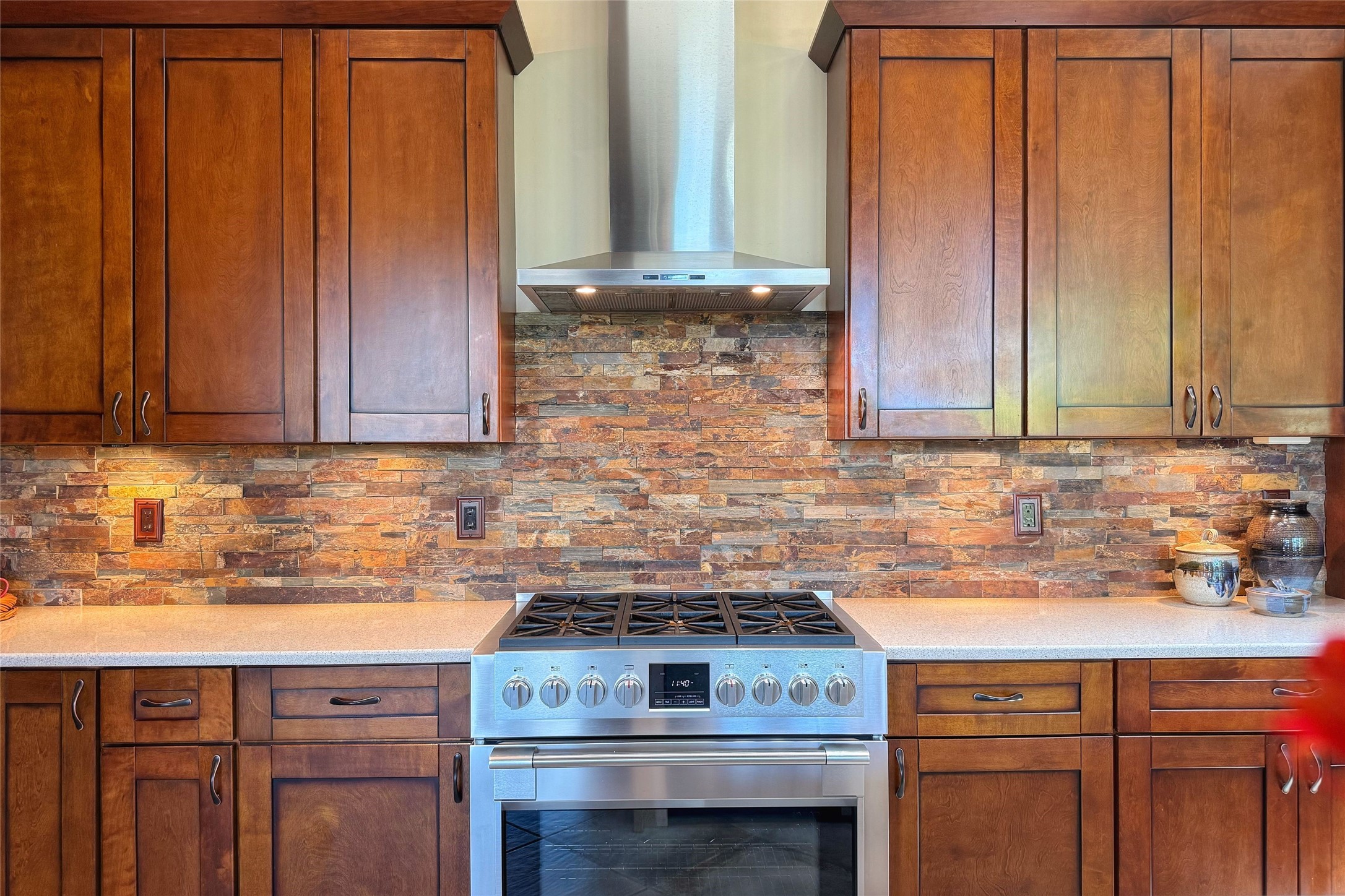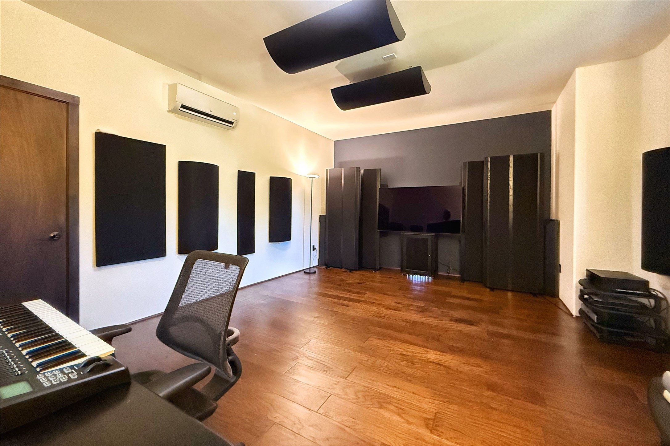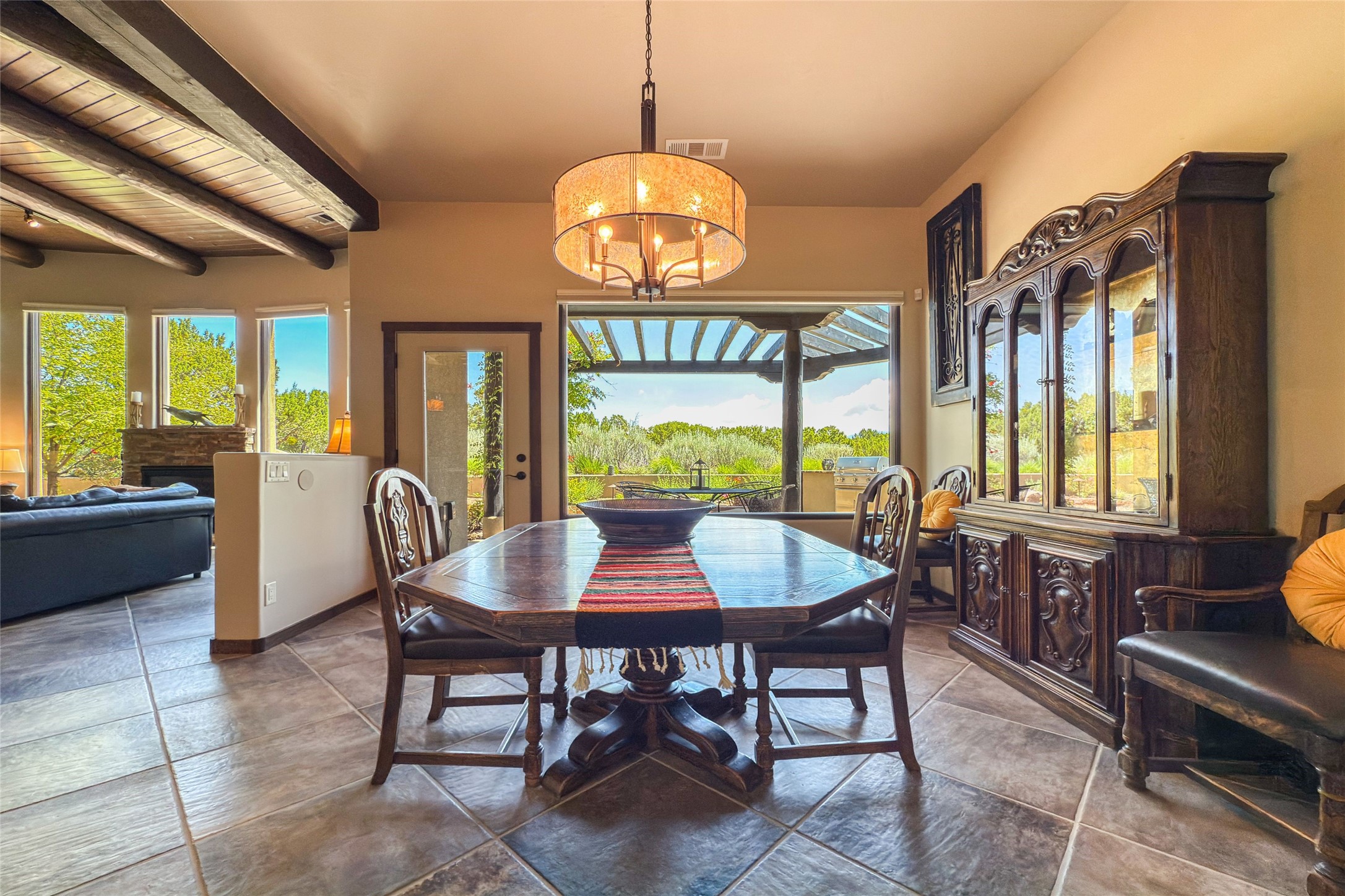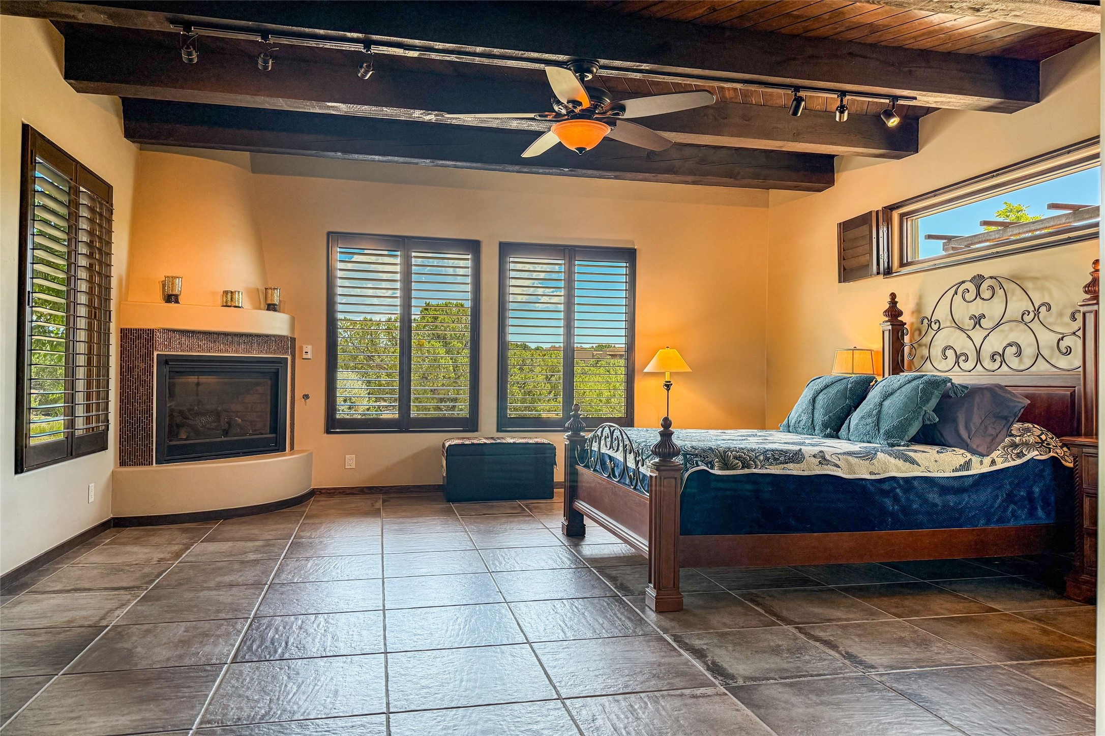 Peaceful elegance with sunset views. Welcome to a serene, custom-crafted sanctuary where timeless design meets contemporary comfort. Nestled in a quiet setting, this exceptional property offers stunning Sangre and Jemez mountain views, just minutes from the exclusive amenities of Las Campanas, including the Ranch Estates equestrian facilities. Every detail of this thoughtfully designed home reflects architectural elegance and ease of living. Distinctive arches, stained ceiling beams, and porcelain tile flooring create an inviting aesthetic. The curved hallways eliminate visible doorways in main areas, encouraging seamless, tranquil flow. The living room features an Anasazi stacked stone fireplace, expansive bay windows, and programmable remote-controlled shades. The chef's kitchen offers a large waterfall island, JennAir appliances, Fulgor range, custom cabinetry, and Anasazi stone backsplash--ideal for both daily use and stylish entertaining. A State-of-the-art sound studio capable of professional music production features hardwood flooring and was built using a sophisticated, advanced sound proofing wall spring system which effectively blocks noise and vibration transfer. The studio has a dedicated 20-amp panel, and mini split for comfort. This space would make an excellent media room for anyone! The spacious primary suite includes a gas kiva fireplace, large picture windows with Sangre views, portal access, and a spa-like bath with Caesarstone finishes, corner windows, and oversized shower. Two additional ensuite bedrooms--one with bay windows and one flex/guest space--offer comfort and versatility. Outdoor living includes a built-in grill, granite counters, water feature, and flagstone paths winding through native landscaping and a 4-cistern-fed irrigation system. Additional highlights include custom wood shutters on all windows, skylights throughout, stained doors/baseboards, new paint, and new tankless water heater. A rare blend of elegance, privacy, and ease.