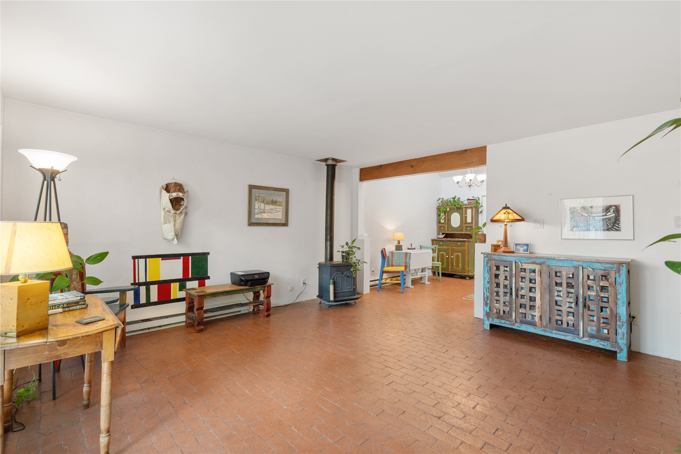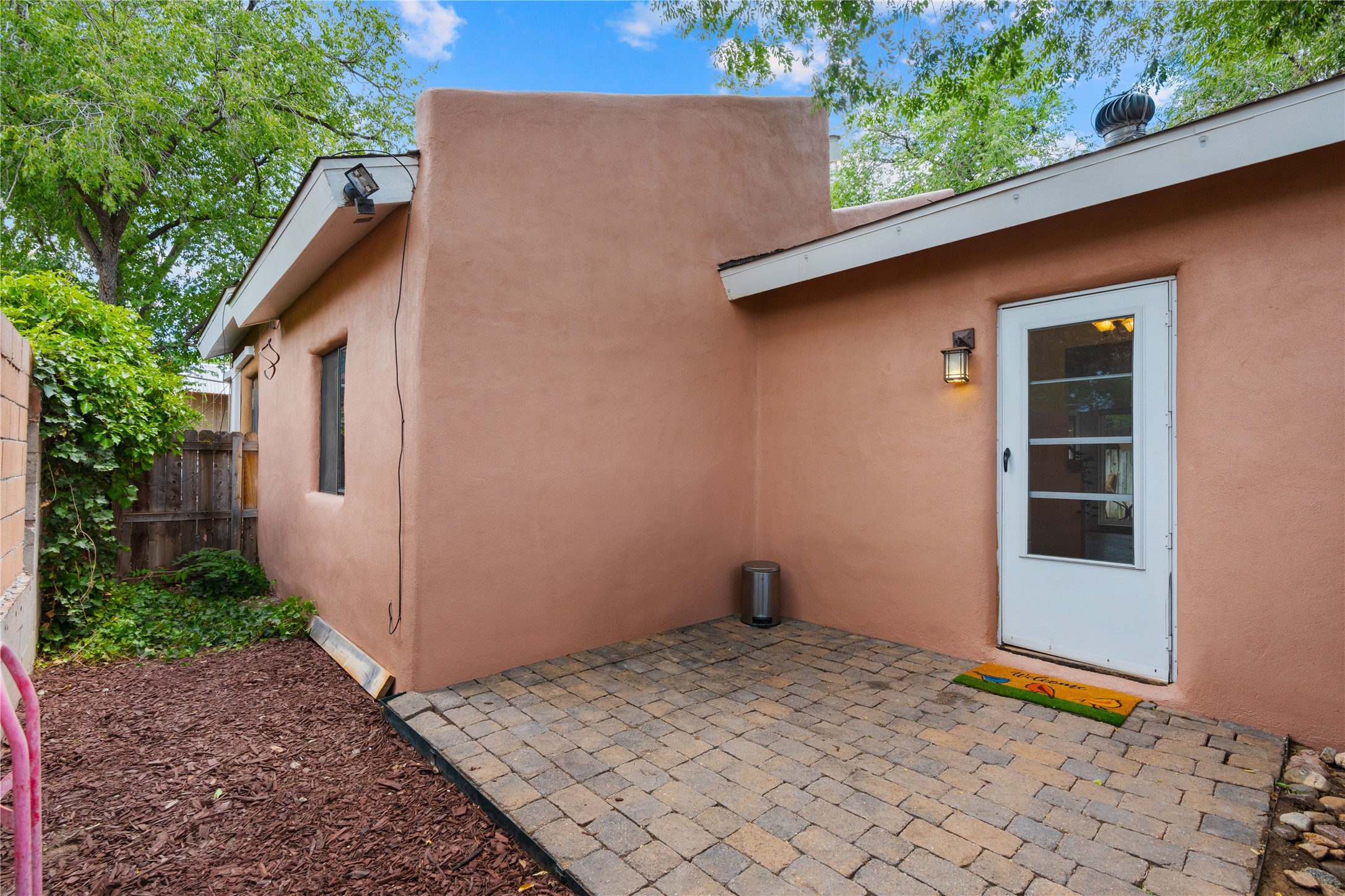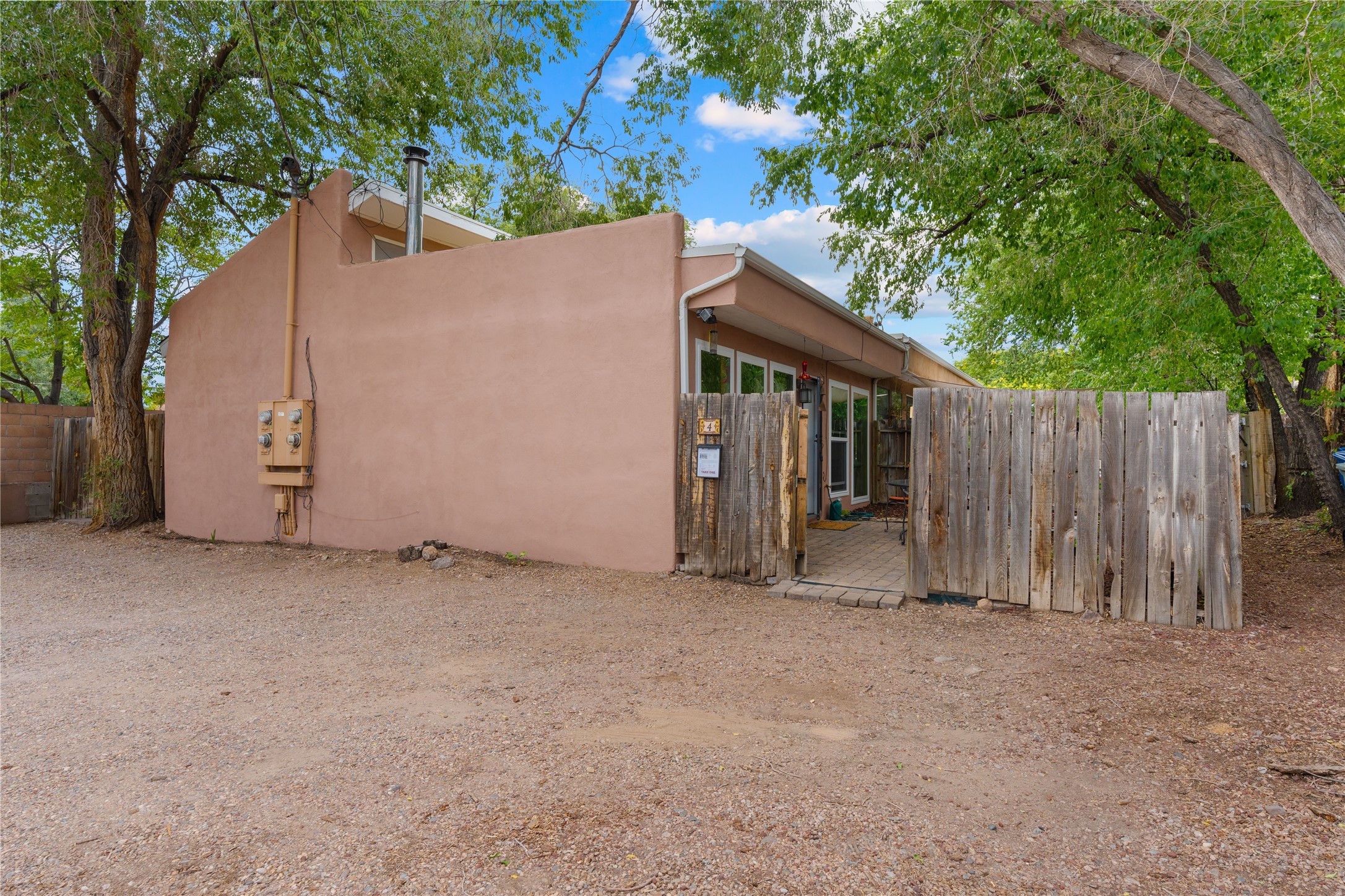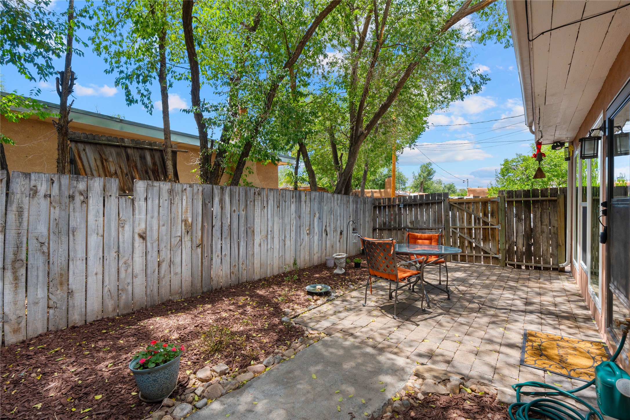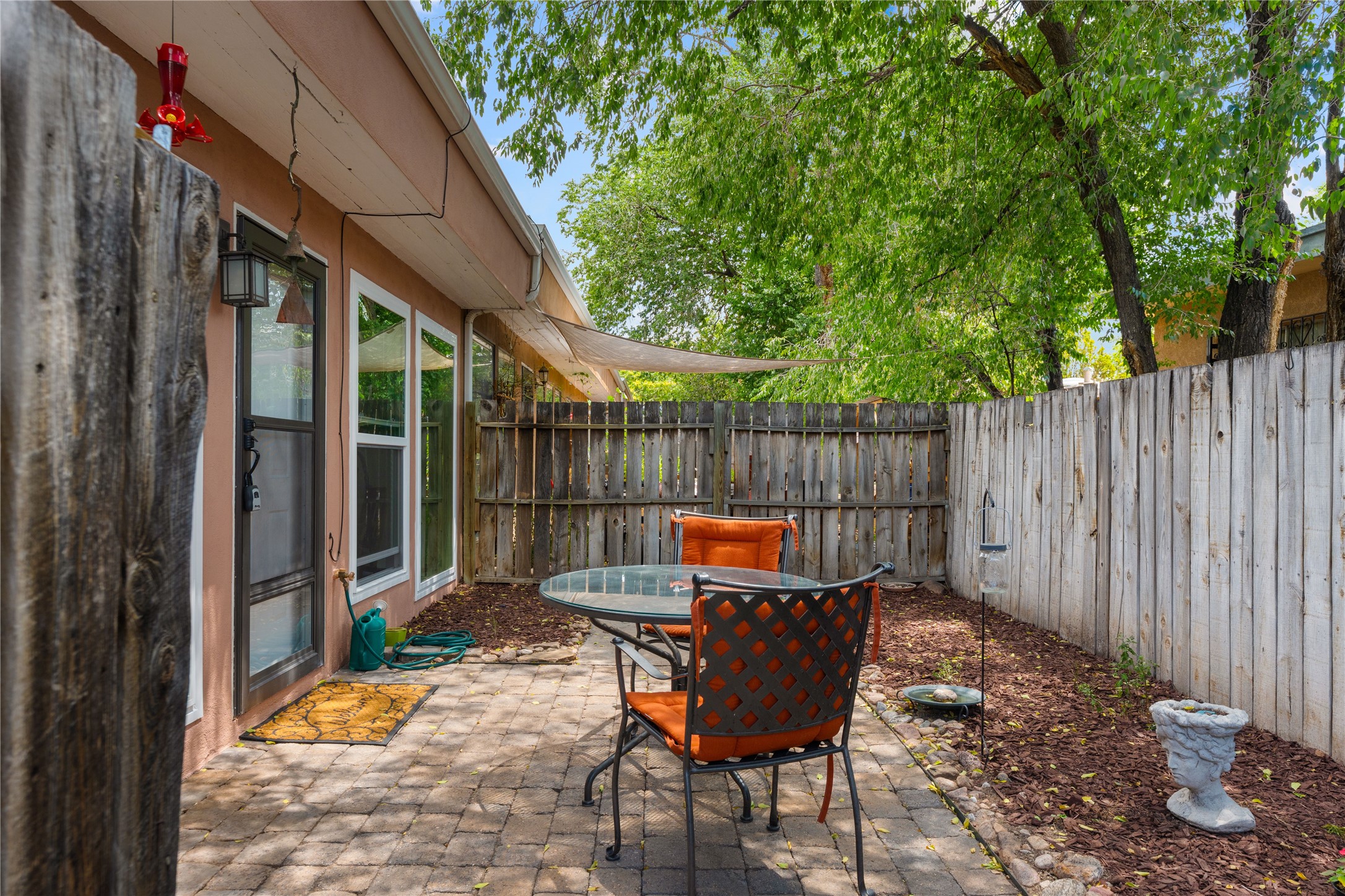 Tucked away on a quiet, tree-lined street, this two-bedroom, one-bath condo offers the perfect blend of privacy and convenience. Located just a short stroll from the vibrant downtown plaza, farmer's market, local galleries, restaurants, and boutique shopping, you'll enjoy the best of in-town living in a serene setting. One of only four units in a peaceful complex, this home features low HOA fees that include insurance and refuse service. Step inside to a warm, open concept living space with brick floors, passive solar design, and a cozy woodburning stove. The new double-pane windows provide natural light while ensuring year-round comfort. Recent upgrades include a new water heater, walk-in shower with safety bars, and a Eurepean-style washer/dryer combo. No steps. Two private patios shaded by mature trees offer ideal outdoor spaces for relaxing or entertaining. Additional perks include two dedicated off-street parking spots. Note: Enter the condo on Ambrosio Street and look for the Sotheby's sign. Please park on the street.