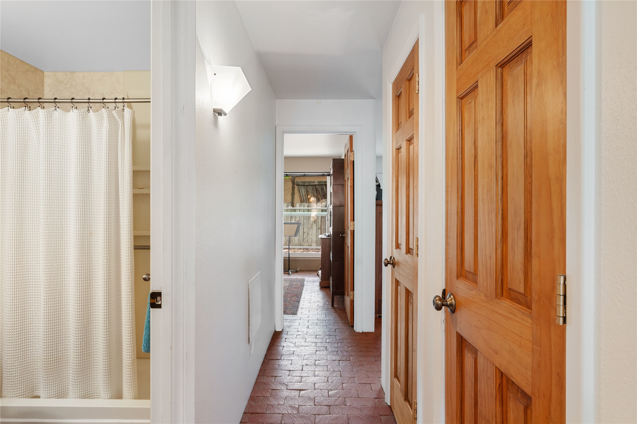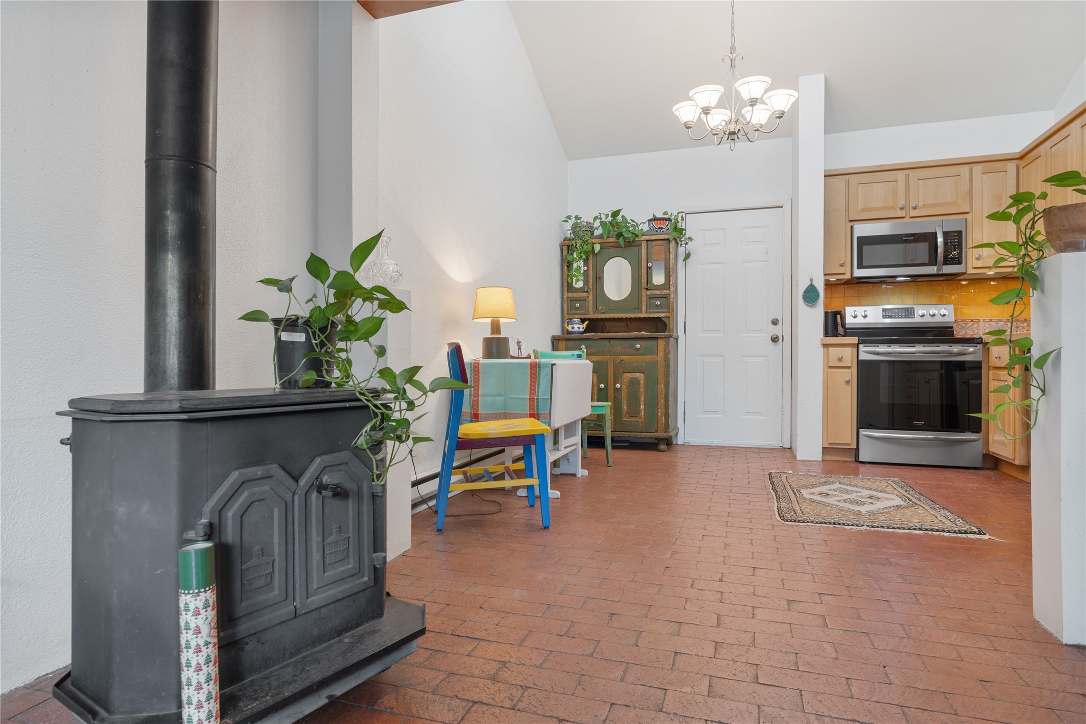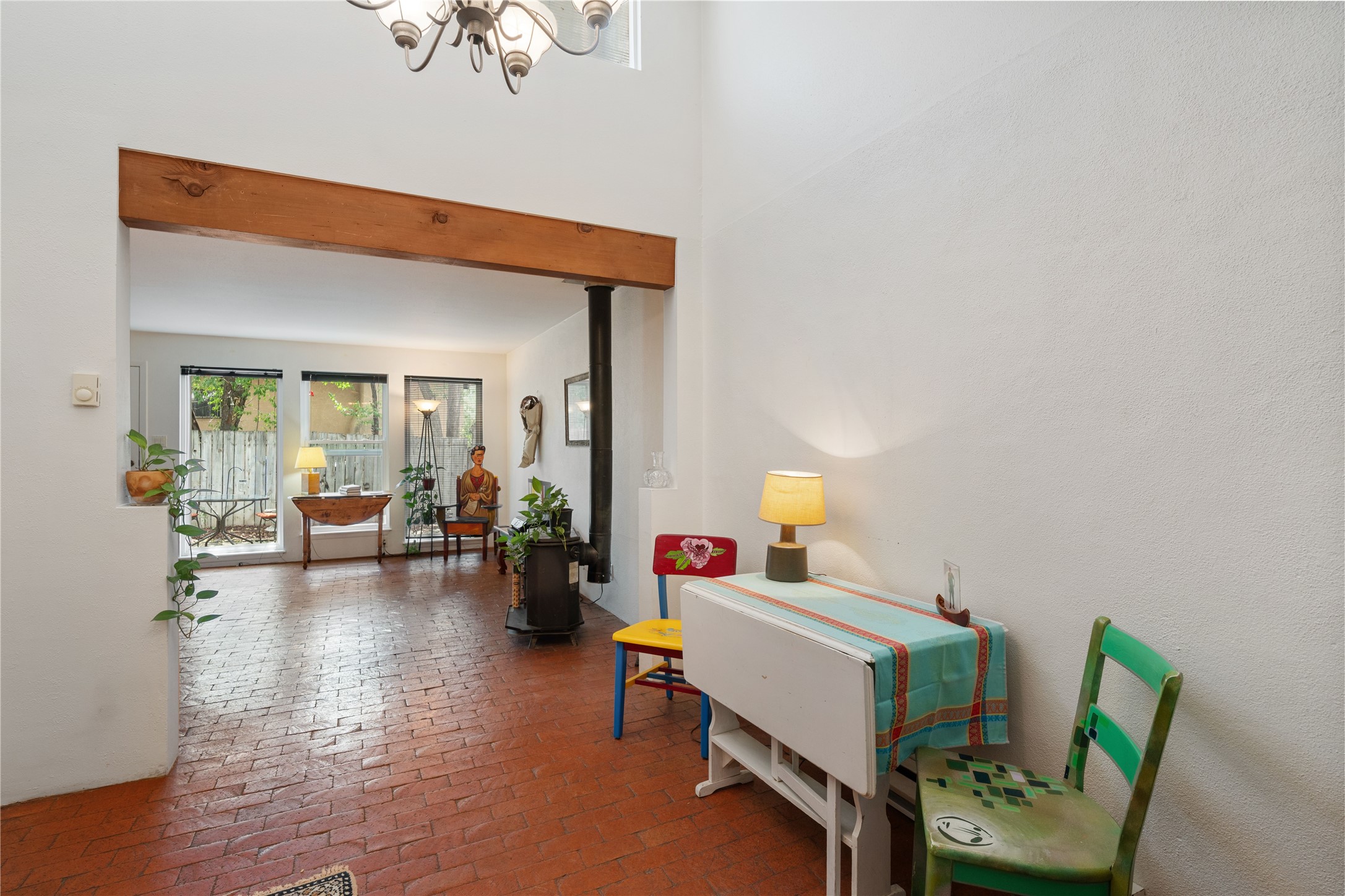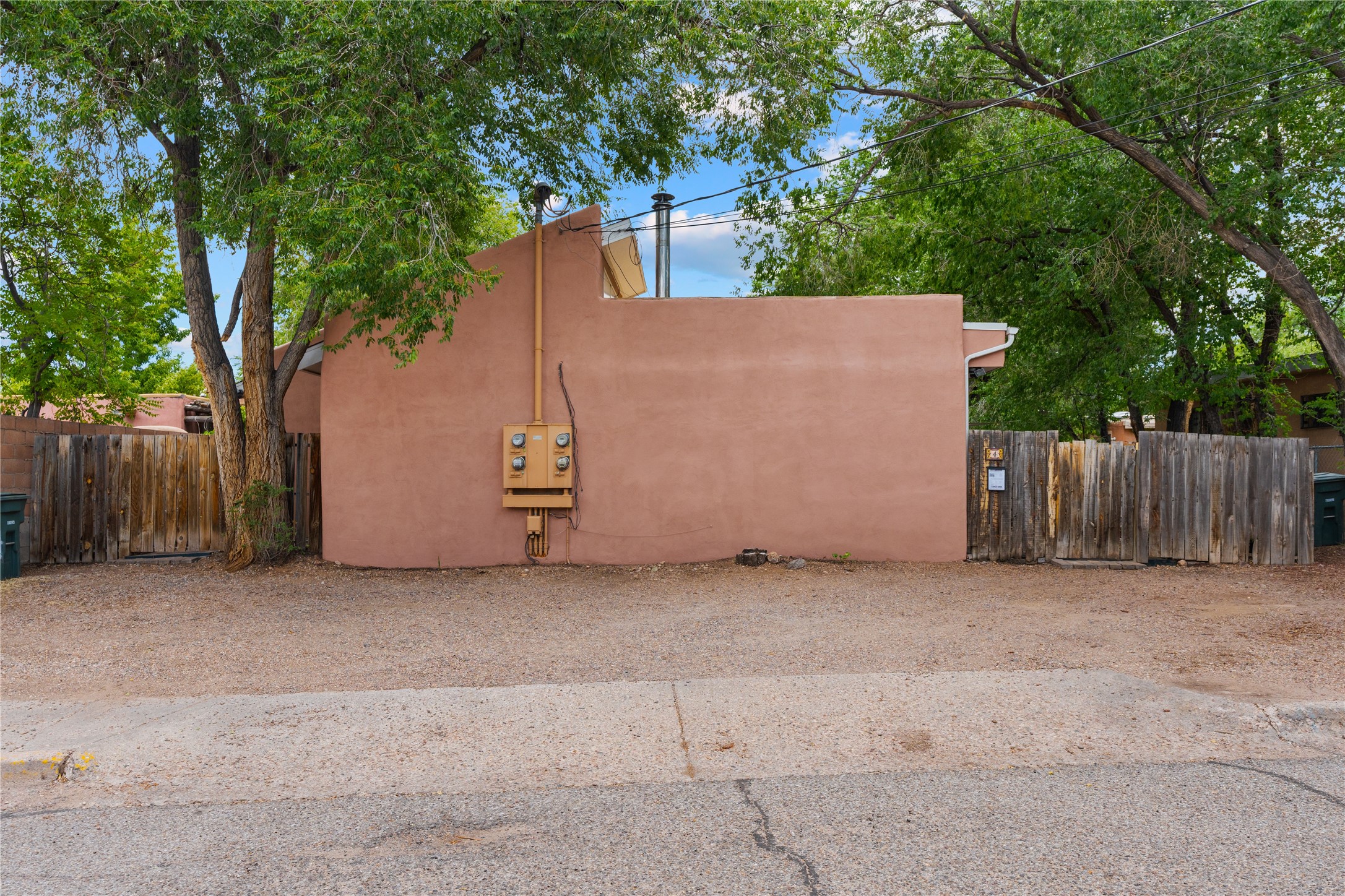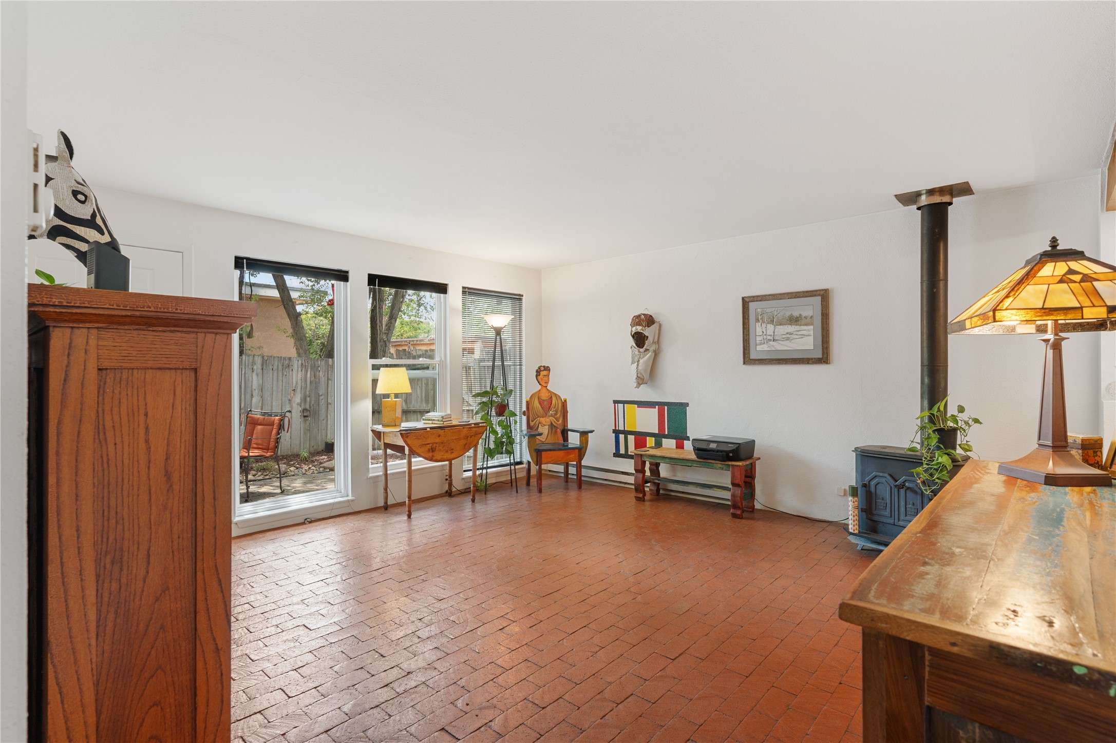 Tucked away on a quiet, tree-lined street, this two-bedroom, one-bath condo offers the perfect blend of privacy and convenience. Located just a short stroll from the vibrant downtown plaza, farmer's market, local galleries, restaurants, and boutique shopping, you'll enjoy the best of in-town living in a serene setting. One of only four units in a peaceful complex, this home features low HOA fees that include insurance and refuse service. Step inside to a warm, open concept living space with brick floors, passive solar design, and a cozy woodburning stove. The new double-pane windows provide natural light while ensuring year-round comfort. Recent upgrades include a new water heater, walk-in shower with safety bars, and a Eurepean-style washer/dryer combo. No steps. Two private patios shaded by mature trees offer ideal outdoor spaces for relaxing or entertaining. Additional perks include two dedicated off-street parking spots. Note: Enter the condo on Ambrosio Street and look for the Sotheby's sign. Please park on the street.