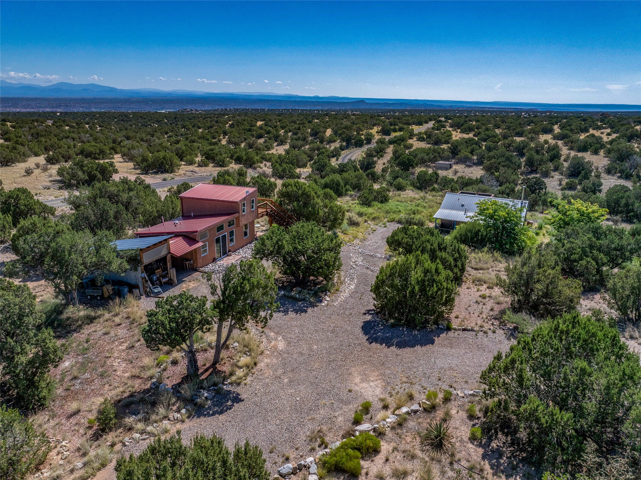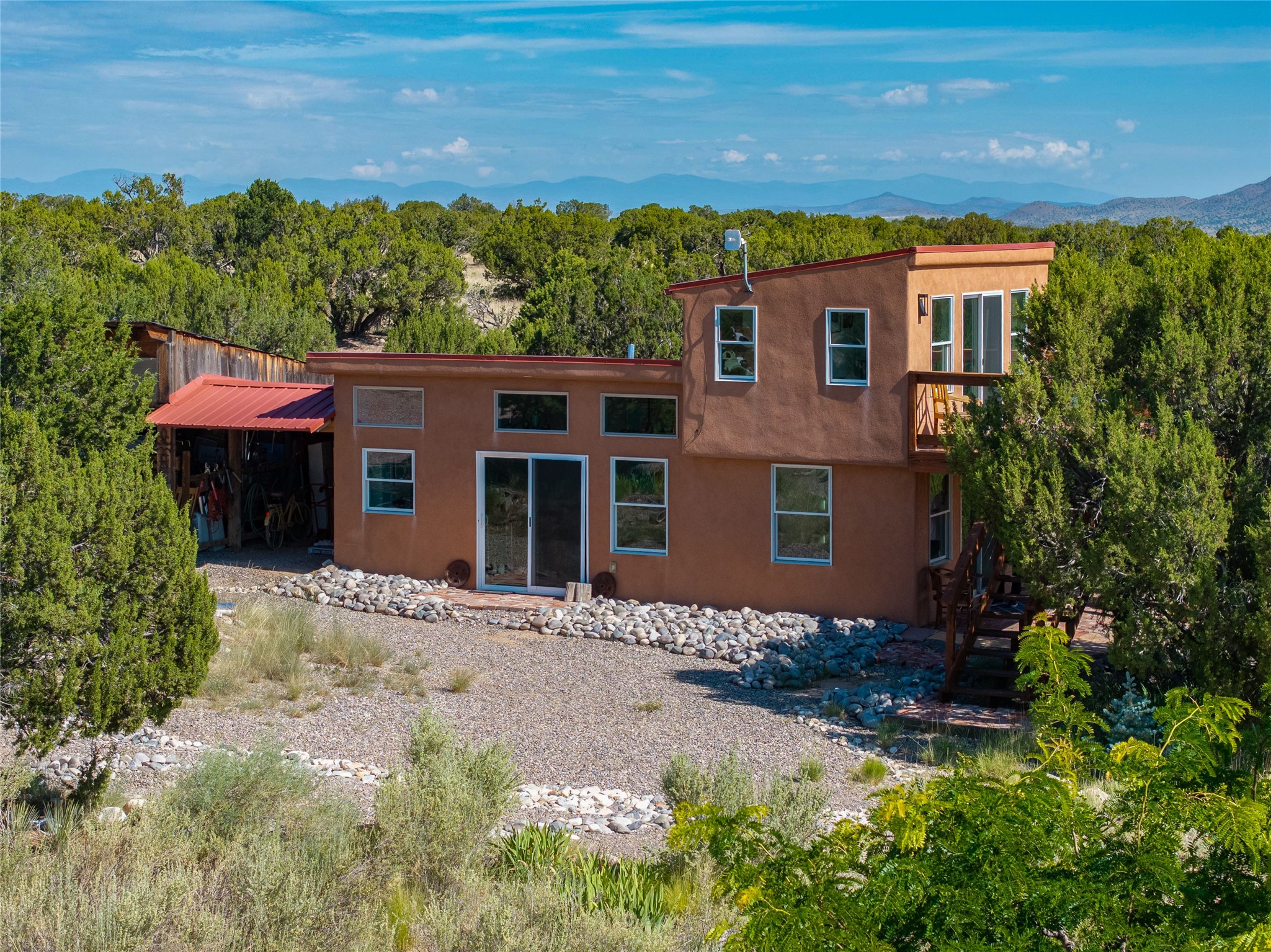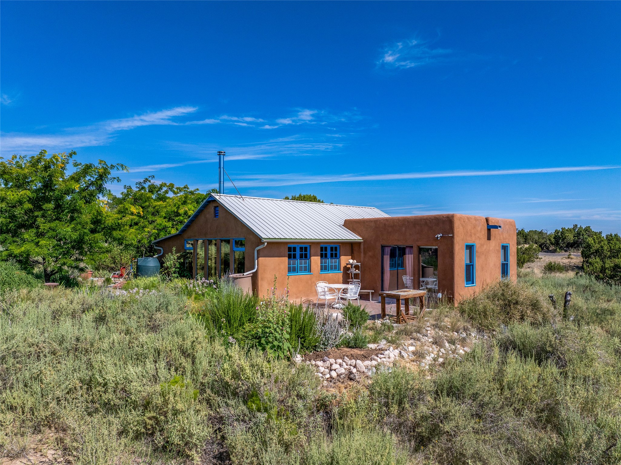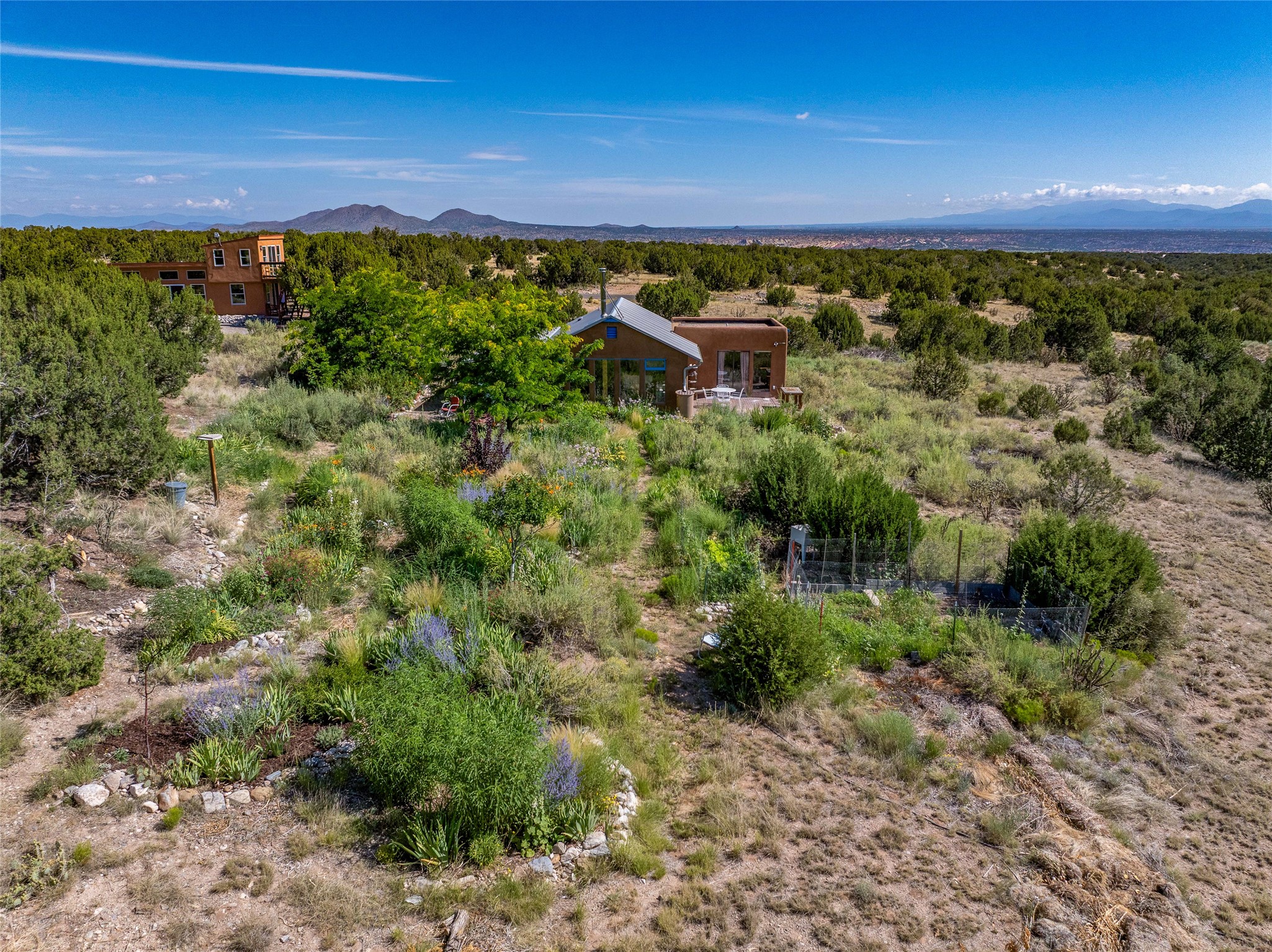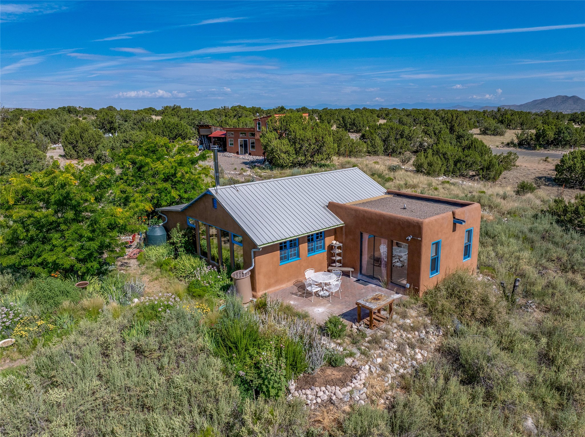 So much to offer! One bed, one bath home plus one bed, one bath detached studio on nearly 10 acres. This versatile property could function as a multi-generational home, produce rental income, or offer an excellent space for working artists, with end of the road privacy, excellent outdoor spaces, and mature gardens. This home has a private well and a grid-tied solar array and has extremely low utility builds. Lovingly cared for and updated, with Santa Fe style combined with modern touches, and significant recent work, including newly remodeled bathrooms and newer metal roofs. An upstairs deck off of the studio takes in impressive views, while the primary home is anchored in lush gardens.