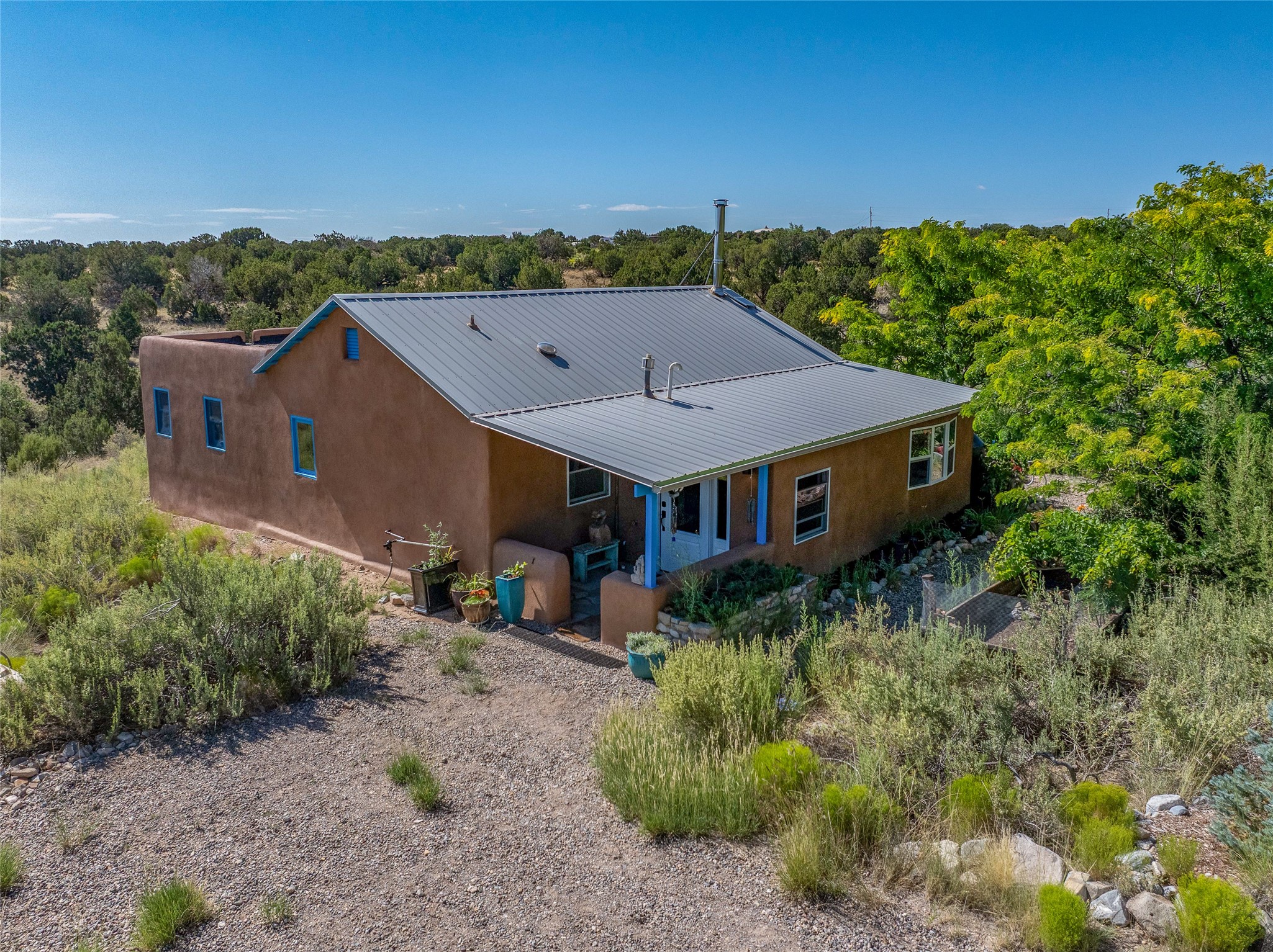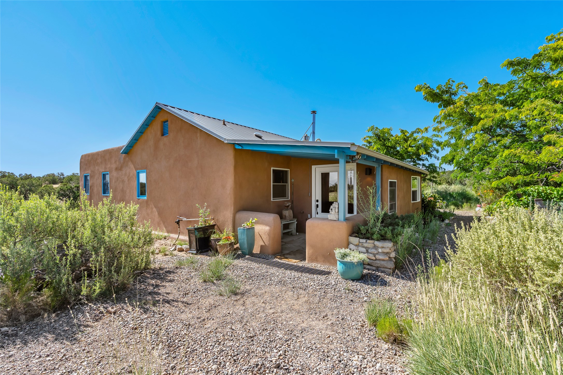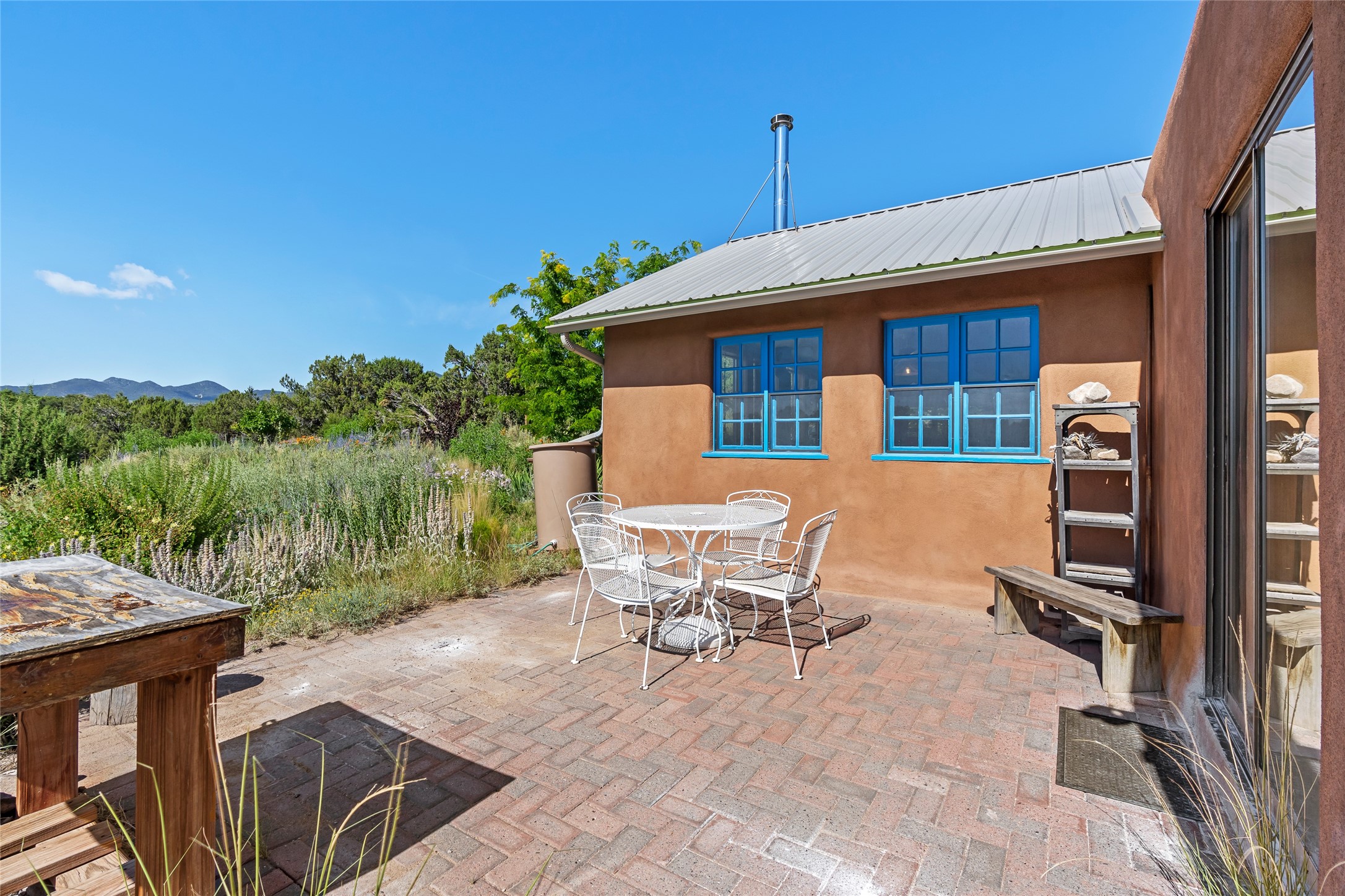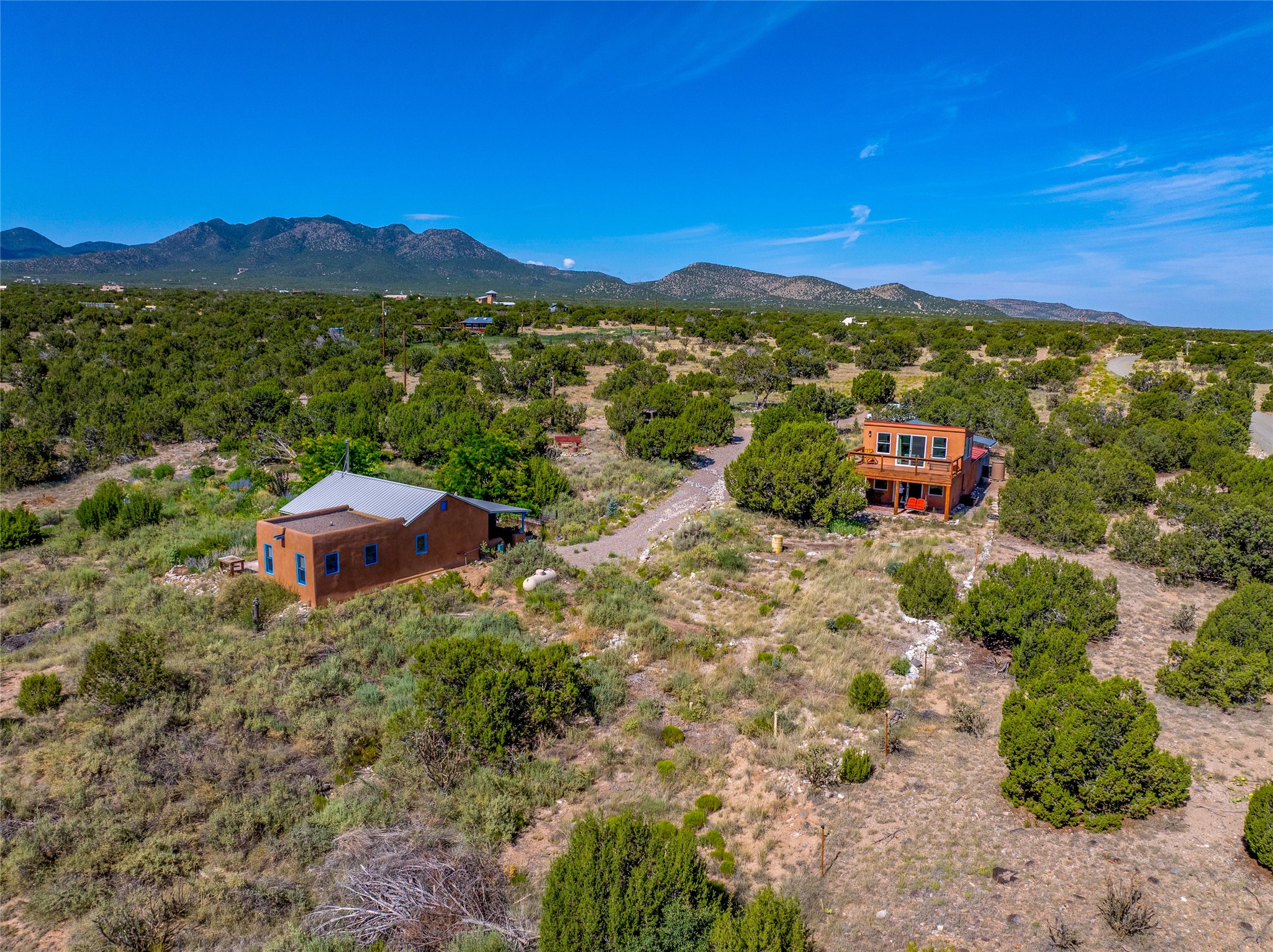 So much to offer! One bed, one bath home plus one bed, one bath detached studio on nearly 10 acres. This versatile property could function as a multi-generational home, produce rental income, or offer an excellent space for working artists, with end of the road privacy, excellent outdoor spaces, and mature gardens. This home has a private well and a grid-tied solar array and has extremely low utility builds. Lovingly cared for and updated, with Santa Fe style combined with modern touches, and significant recent work, including newly remodeled bathrooms and newer metal roofs. An upstairs deck off of the studio takes in impressive views, while the primary home is anchored in lush gardens.