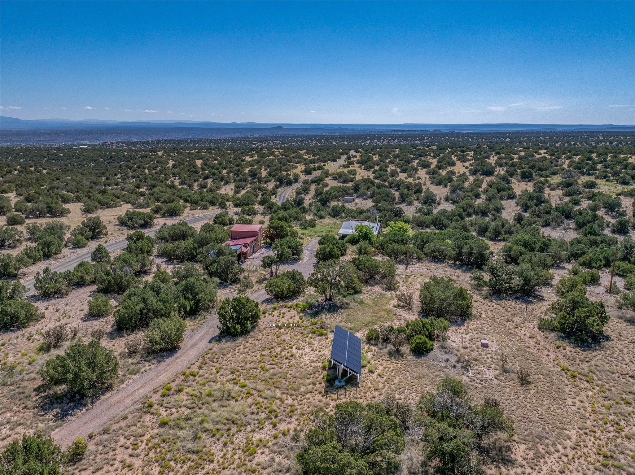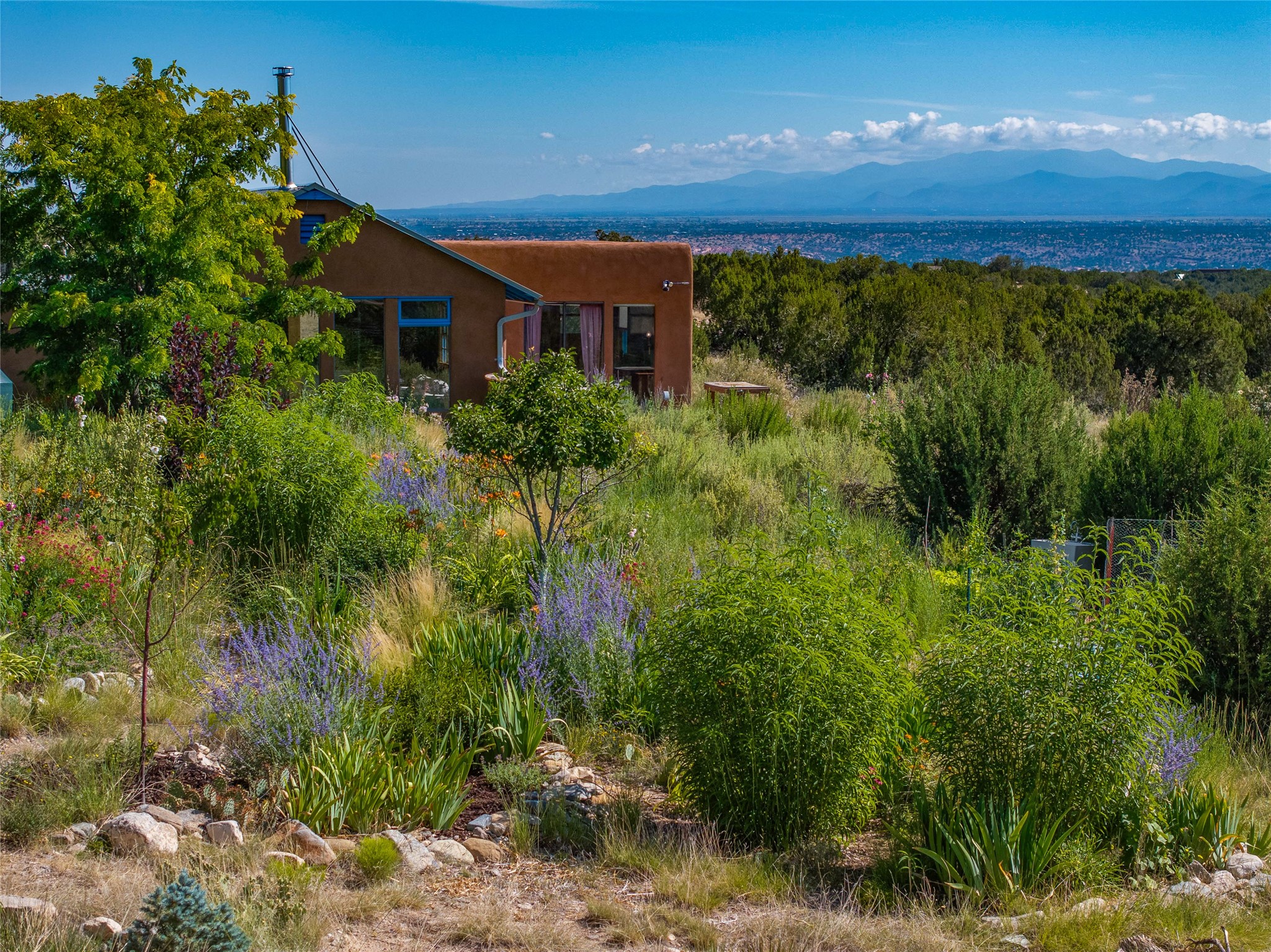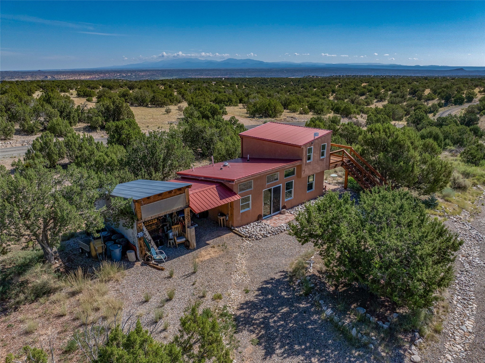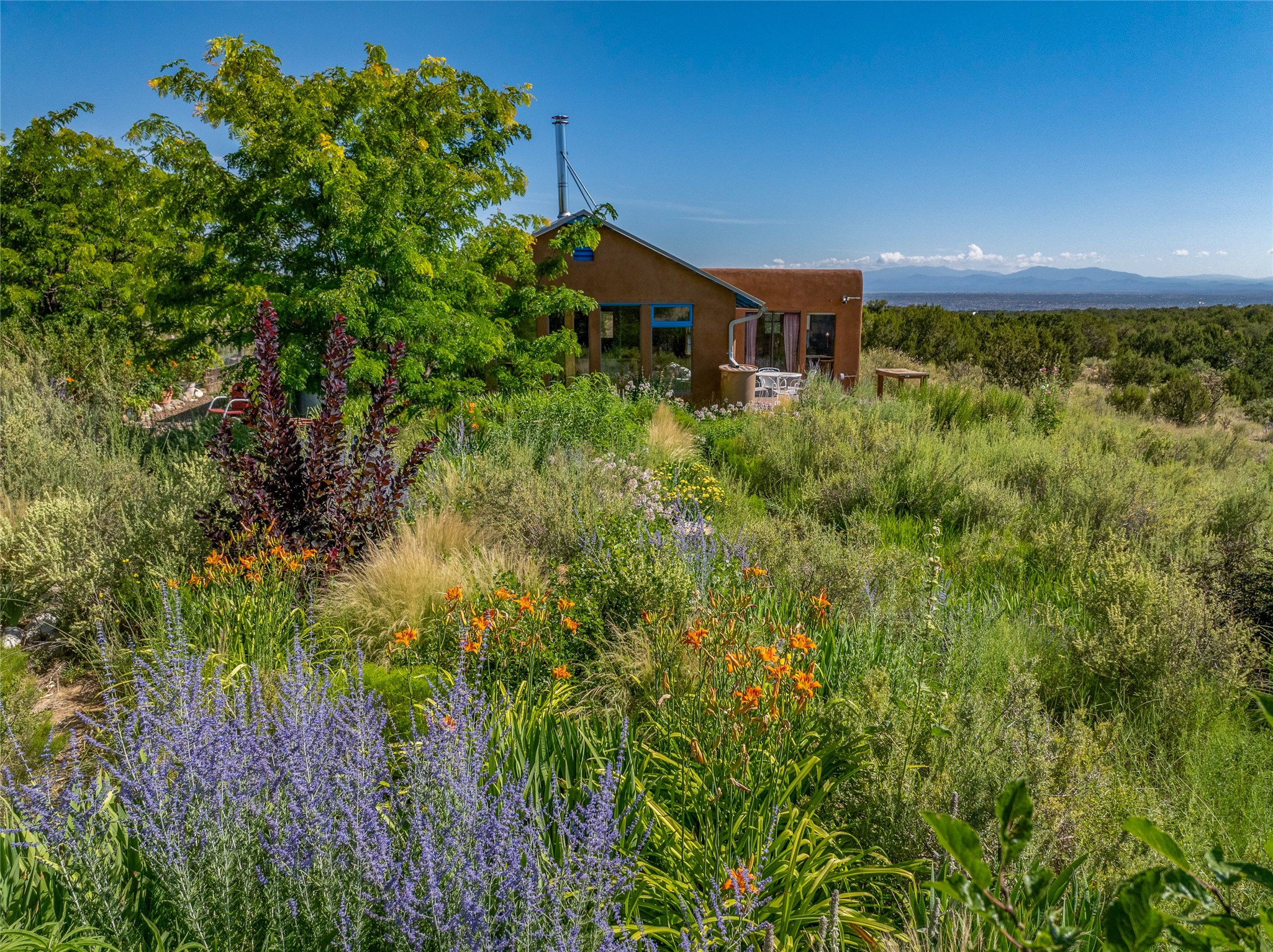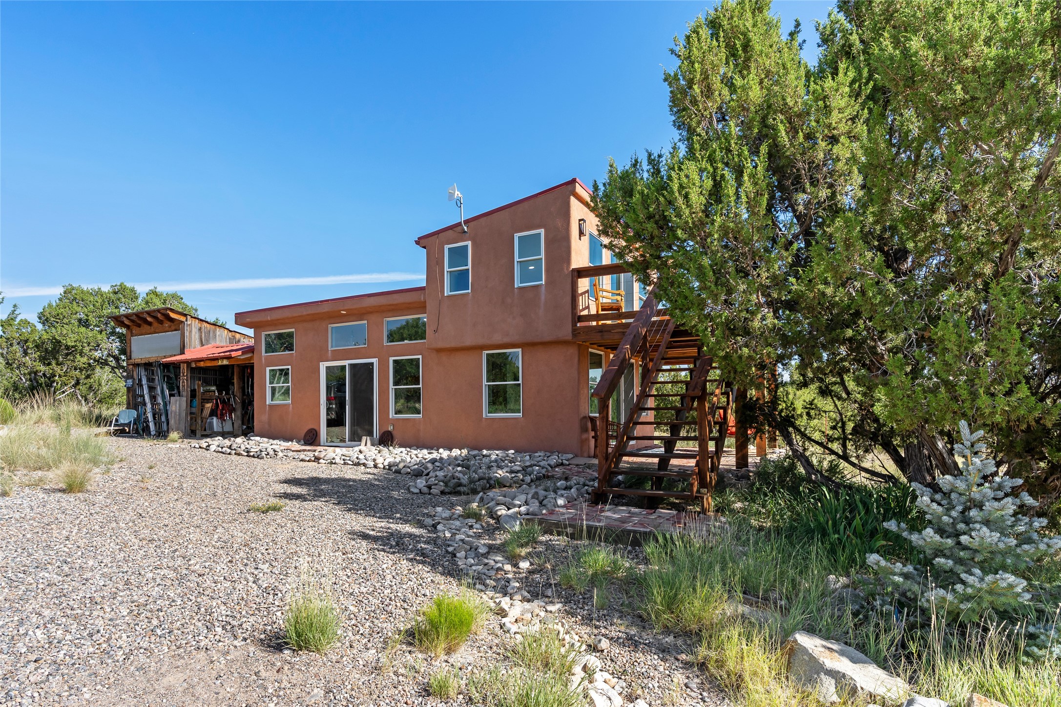 So much to offer! One bed, one bath home plus one bed, one bath detached studio on nearly 10 acres. This versatile property could function as a multi-generational home, produce rental income, or offer an excellent space for working artists, with end of the road privacy, excellent outdoor spaces, and mature gardens. This home has a private well and a grid-tied solar array and has extremely low utility builds. Lovingly cared for and updated, with Santa Fe style combined with modern touches, and significant recent work, including newly remodeled bathrooms and newer metal roofs. An upstairs deck off of the studio takes in impressive views, while the primary home is anchored in lush gardens.