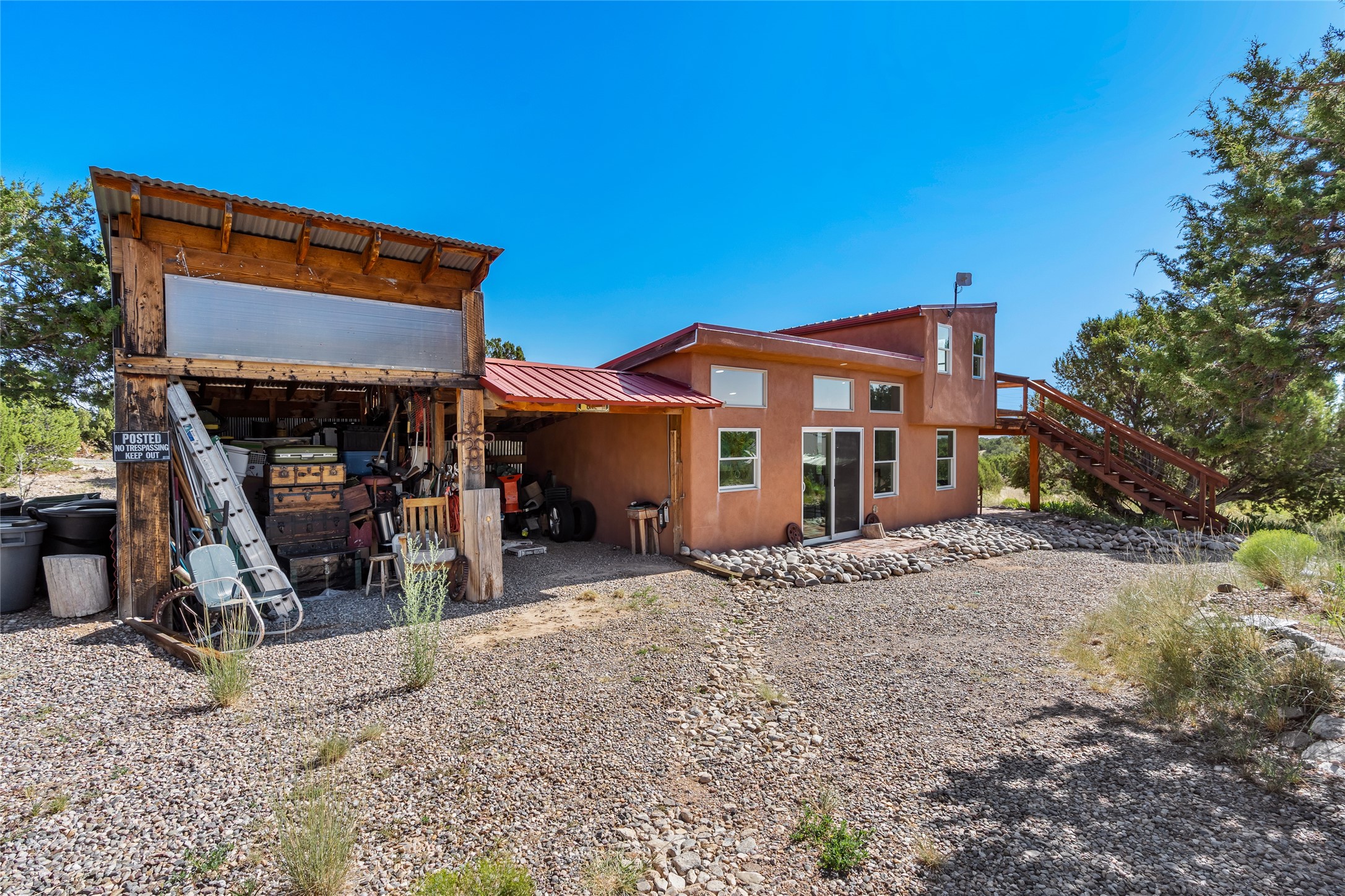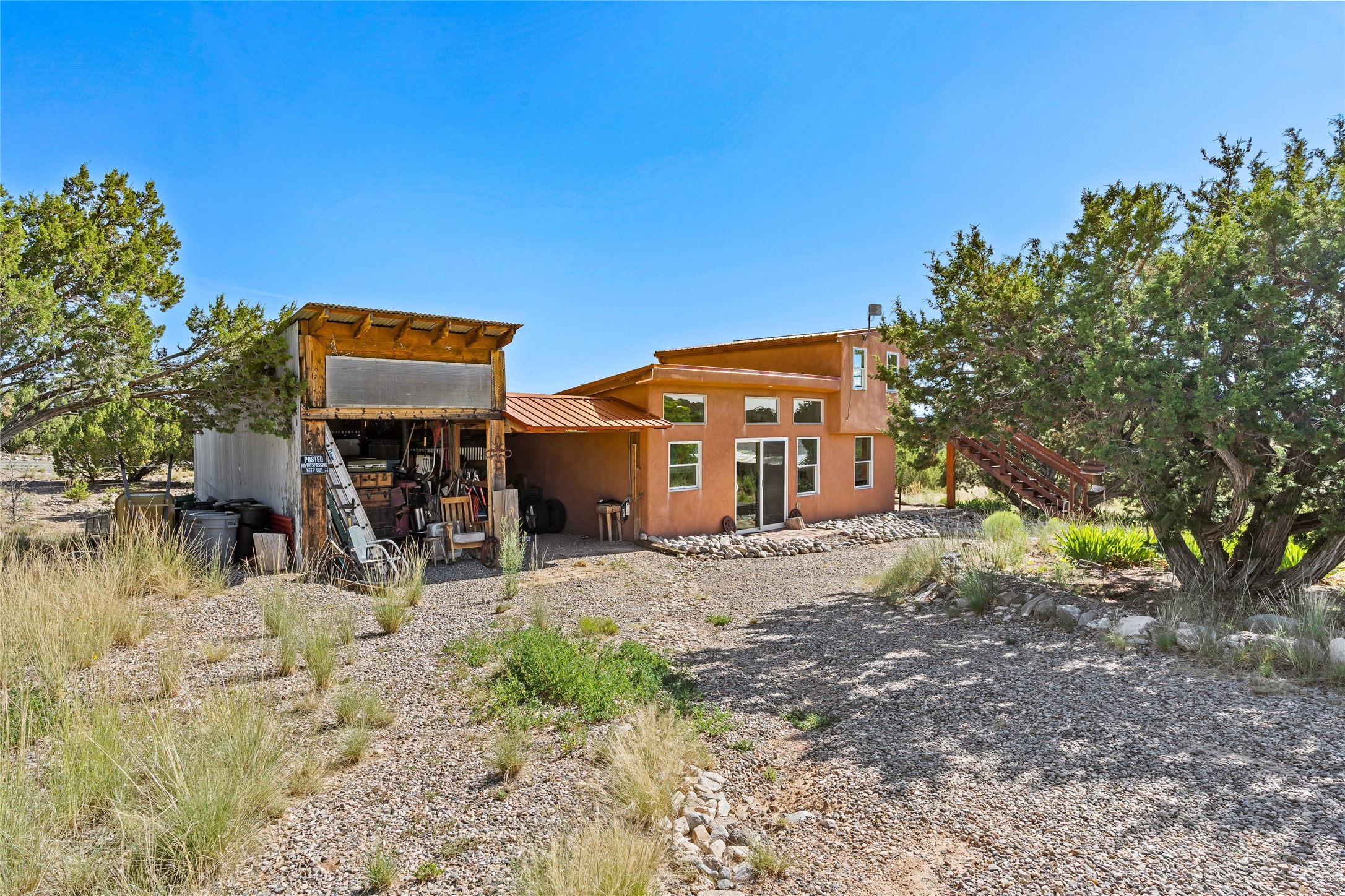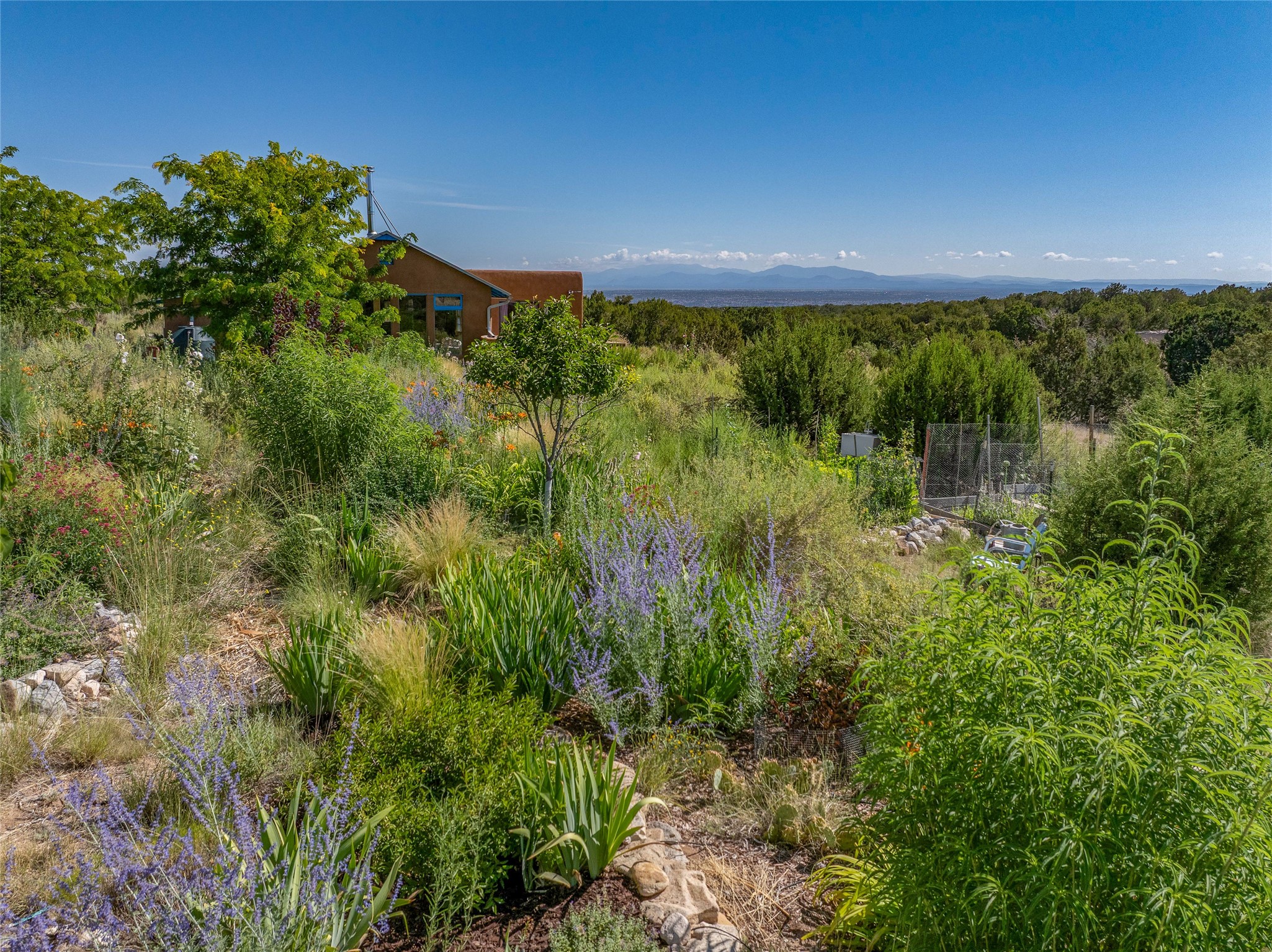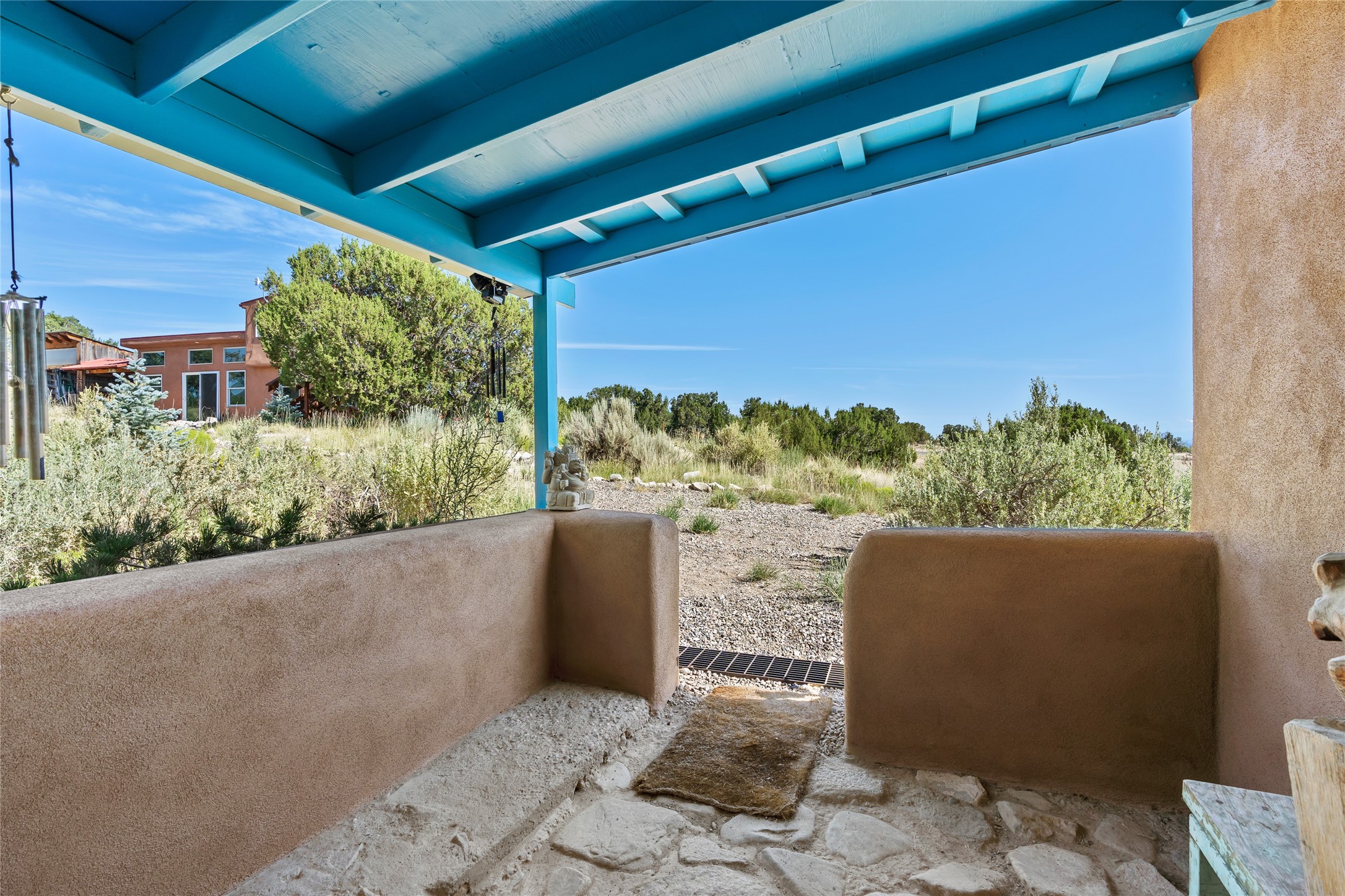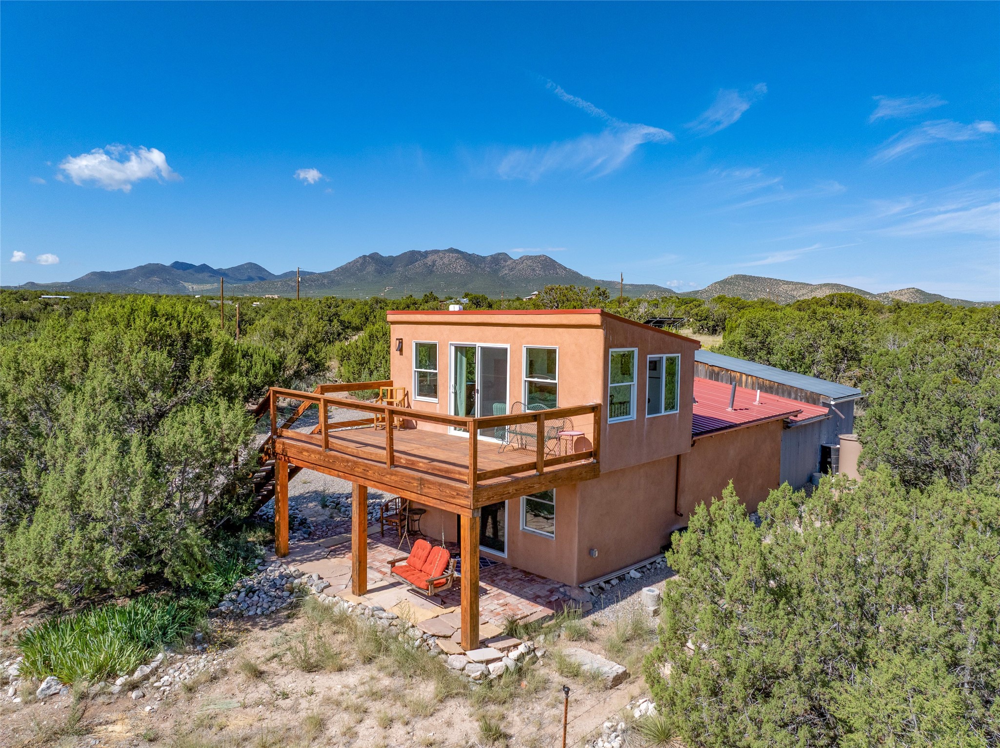 So much to offer! One bed, one bath home plus one bed, one bath detached studio on nearly 10 acres. This versatile property could function as a multi-generational home, produce rental income, or offer an excellent space for working artists, with end of the road privacy, excellent outdoor spaces, and mature gardens. This home has a private well and a grid-tied solar array and has extremely low utility builds. Lovingly cared for and updated, with Santa Fe style combined with modern touches, and significant recent work, including newly remodeled bathrooms and newer metal roofs. An upstairs deck off of the studio takes in impressive views, while the primary home is anchored in lush gardens.