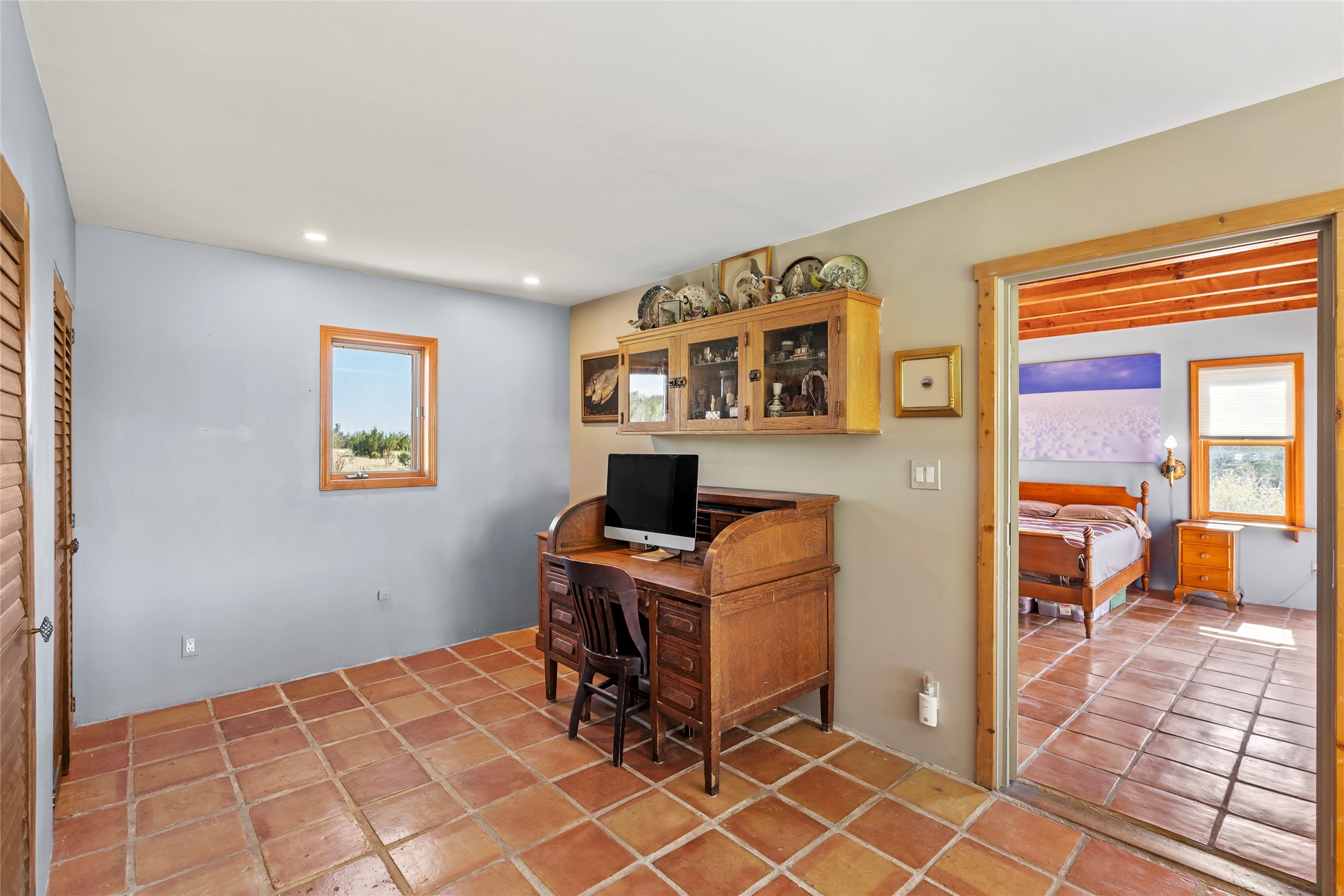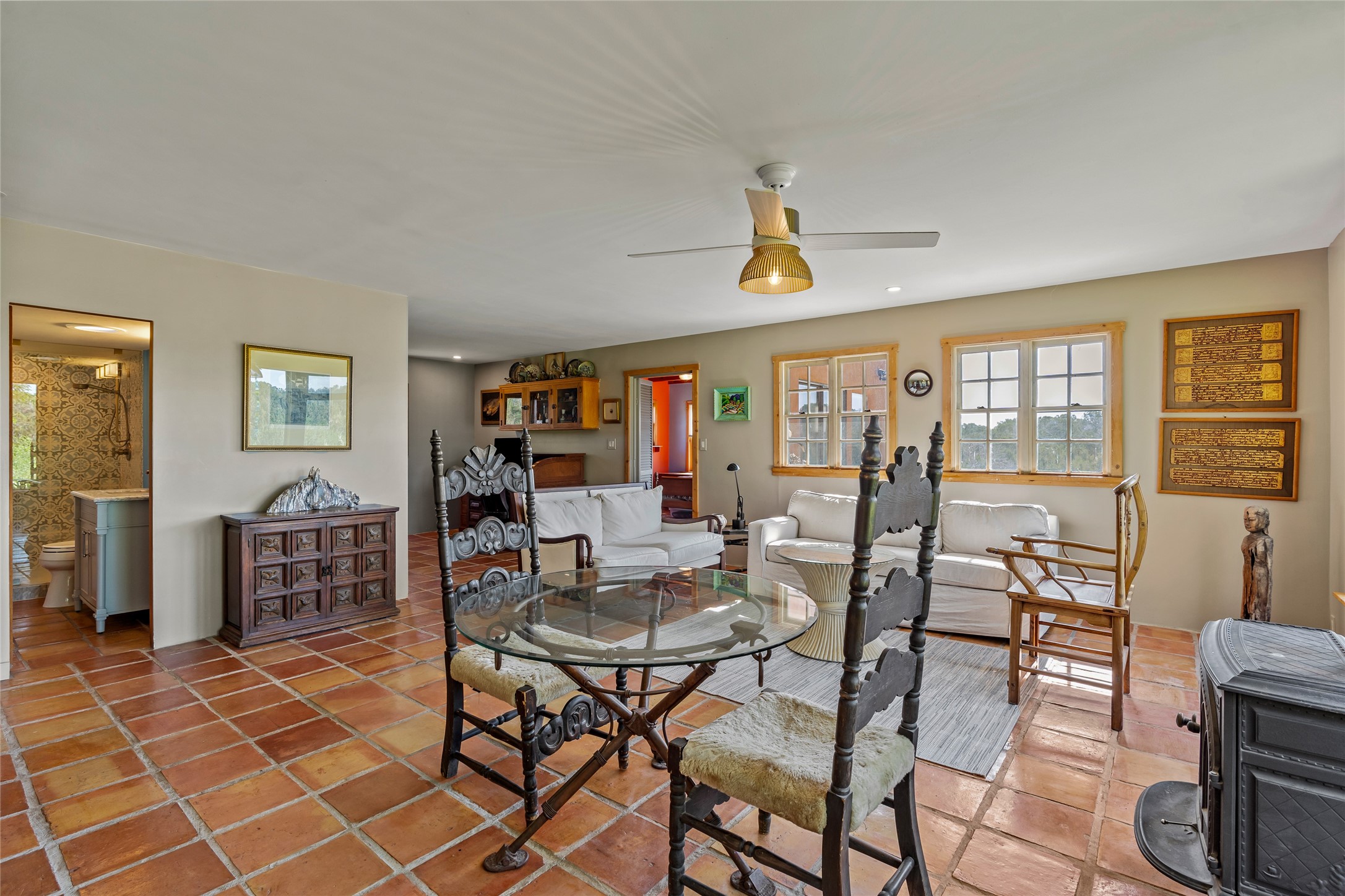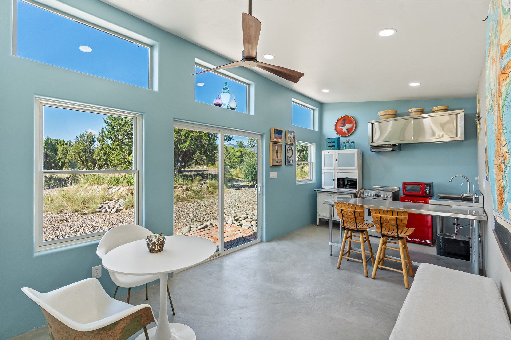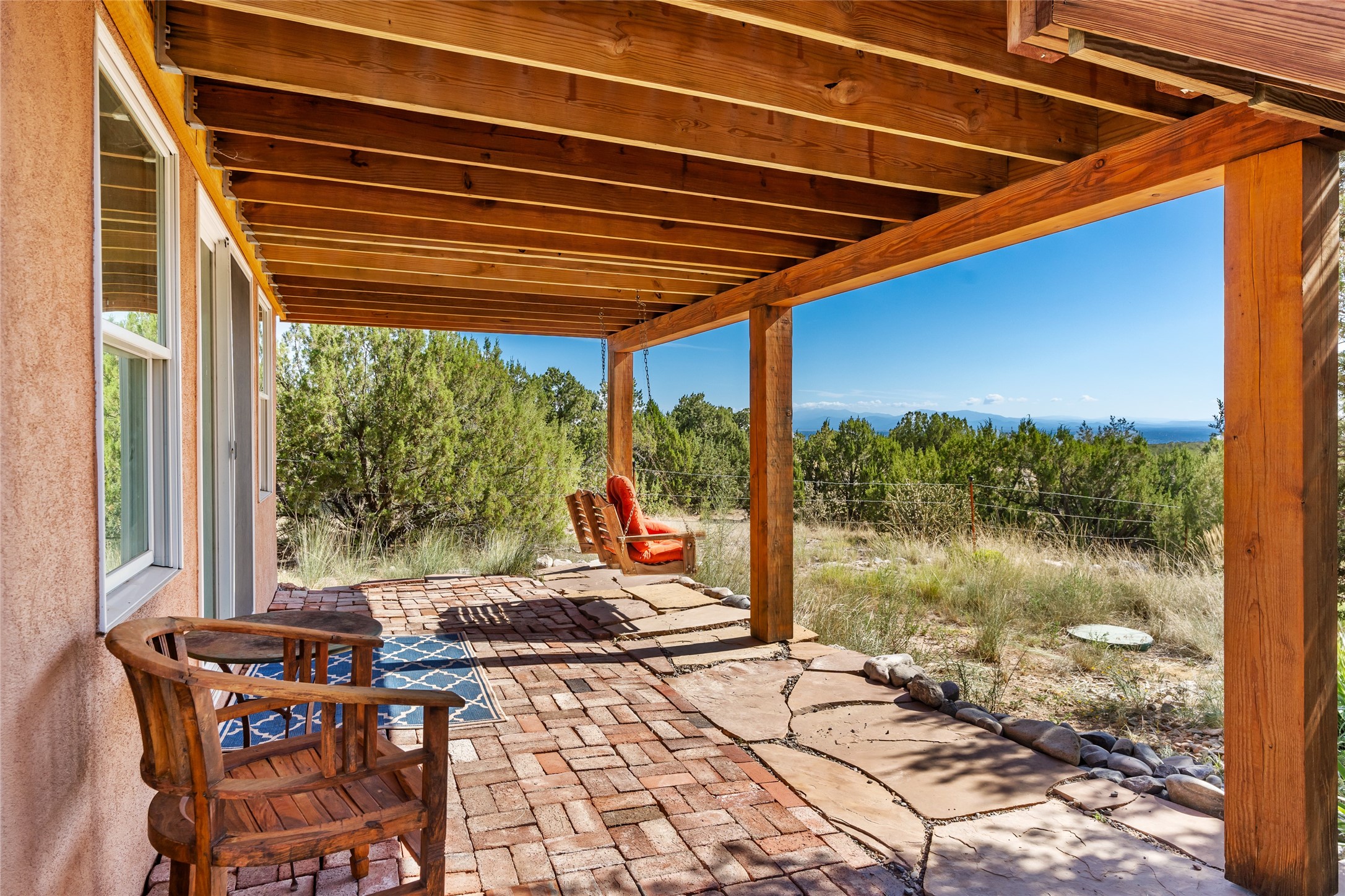 So much to offer! One bed, one bath home plus one bed, one bath detached studio on nearly 10 acres. This versatile property could function as a multi-generational home, produce rental income, or offer an excellent space for working artists, with end of the road privacy, excellent outdoor spaces, and mature gardens. This home has a private well and a grid-tied solar array and has extremely low utility builds. Lovingly cared for and updated, with Santa Fe style combined with modern touches, and significant recent work, including newly remodeled bathrooms and newer metal roofs. An upstairs deck off of the studio takes in impressive views, while the primary home is anchored in lush gardens.