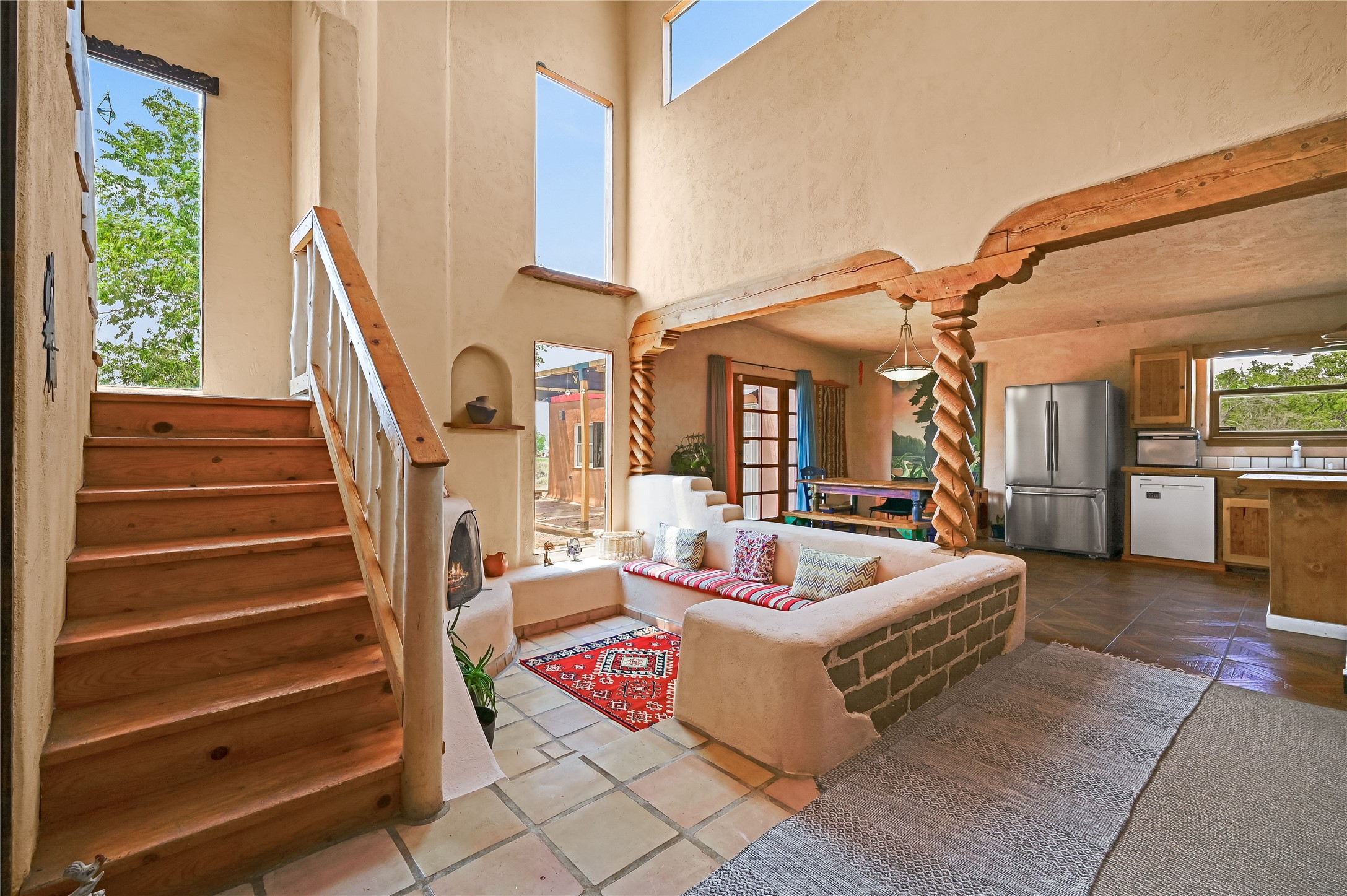 Discover a Unique Taos Living and Investment Opportunity! Nestled in Ranchos de Taos, just outside town limits, this exceptional property offers a serene lifestyle combined with a positive, steady rental income. You'll be living in a peaceful neighborhood, yet just 4 miles from Taos Plaza, a half-mile from Holy Cross Hospital, and moments from the Weimer Foothills trails. This unique offering includes four total units. The owner-occupied main home features an open living, dining, and kitchen area with clerestory windows and a loft. The cozy kiva fireplace, a two-story chimney before a sunken living area, was crafted by renowned artisan Carmen Velarde and inspired by the iconic Taos Inn. Enjoy abundant natural light and an upstairs loft/studio with a large second-story viewing deck offering breathtaking mountain views, including Taos Mountain, and stretching all the way to Colorado - perfect for watching spectacular sunsets and stargazing. The main home was beautifully remodeled in 2018 , with upgraded bathroom, kitchen flooring, and cabinets, and the outdoor area was enhanced in 2023. Beyond the main residence, you'll find an extended owner's suite that has been partitioned as a studio rental, a separate 1-bedroom, 1 bath-room guest house, and a truly special adobe studio/chapel. This studio, a replica of a church chancel, was originally built for artist Fr. William Hart McNichols by master adobe builder Trini Velarde. Constructed with traditional adobes, mud floors, and vigas painted with natural plant dyes, this studio remains cool in summer and remarkably warm in winter. This is more than just a home; it's an incredible investment opportunity to own a piece of Taos's rich artistic and building heritage with established rental income.