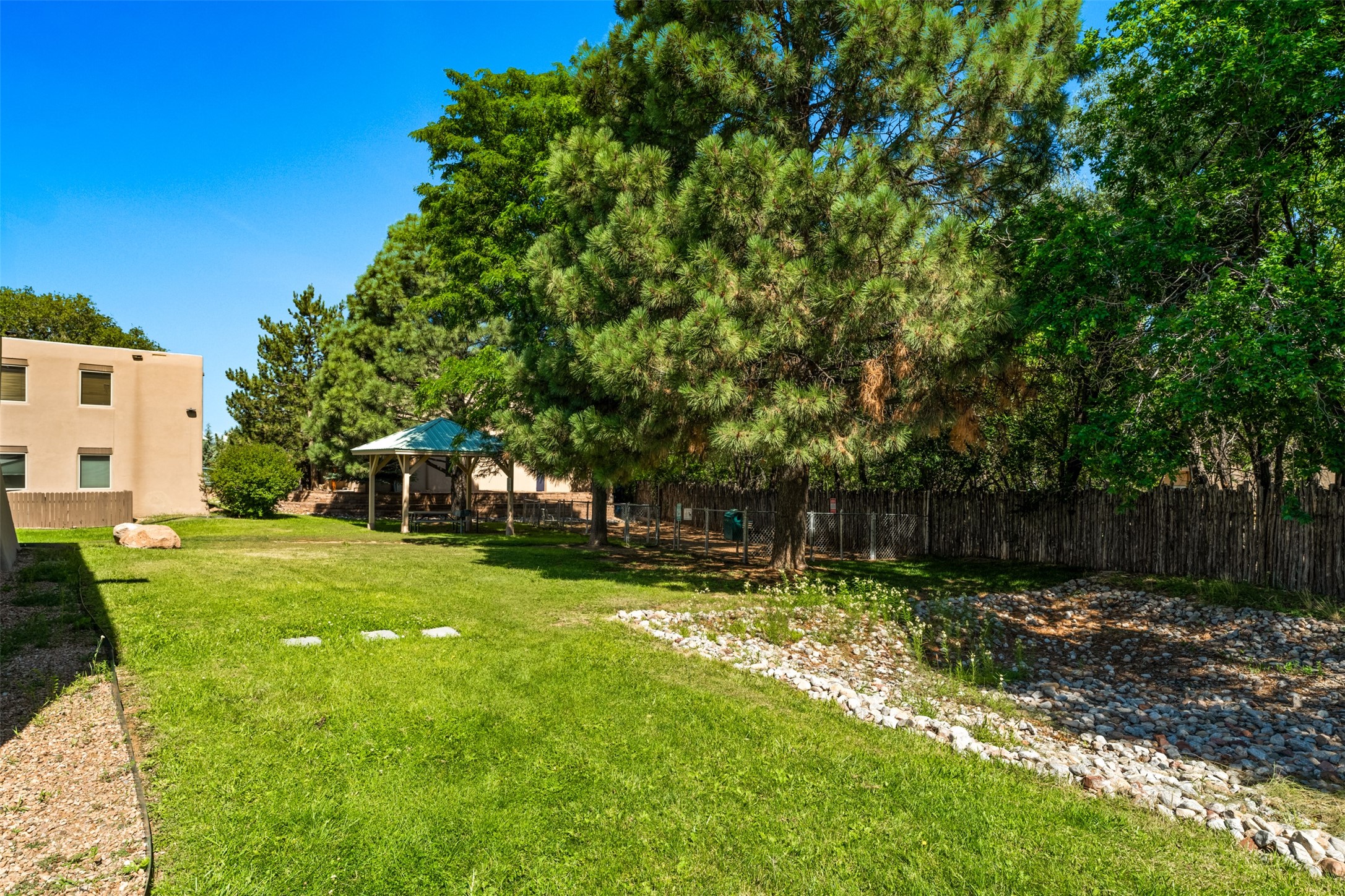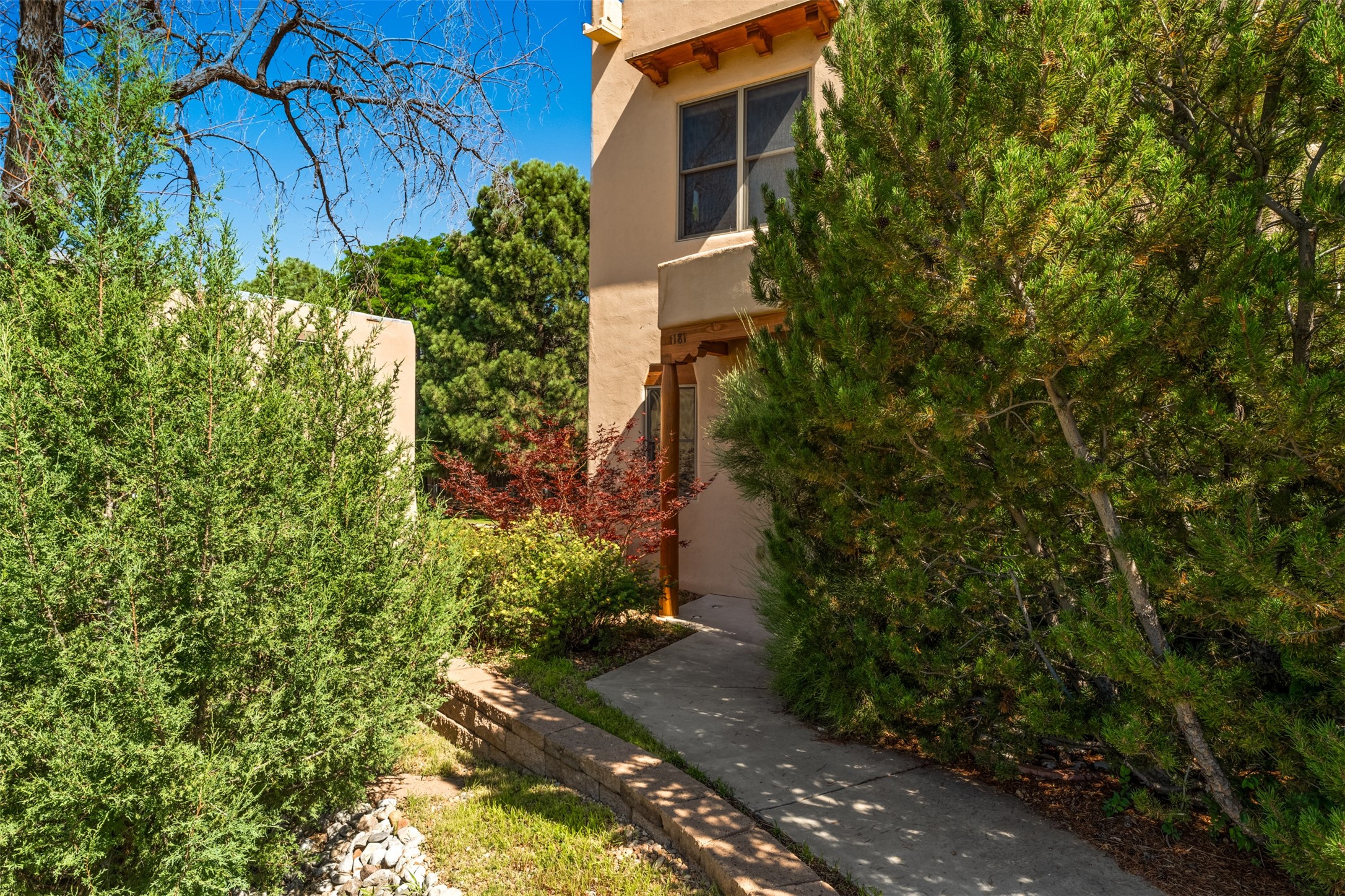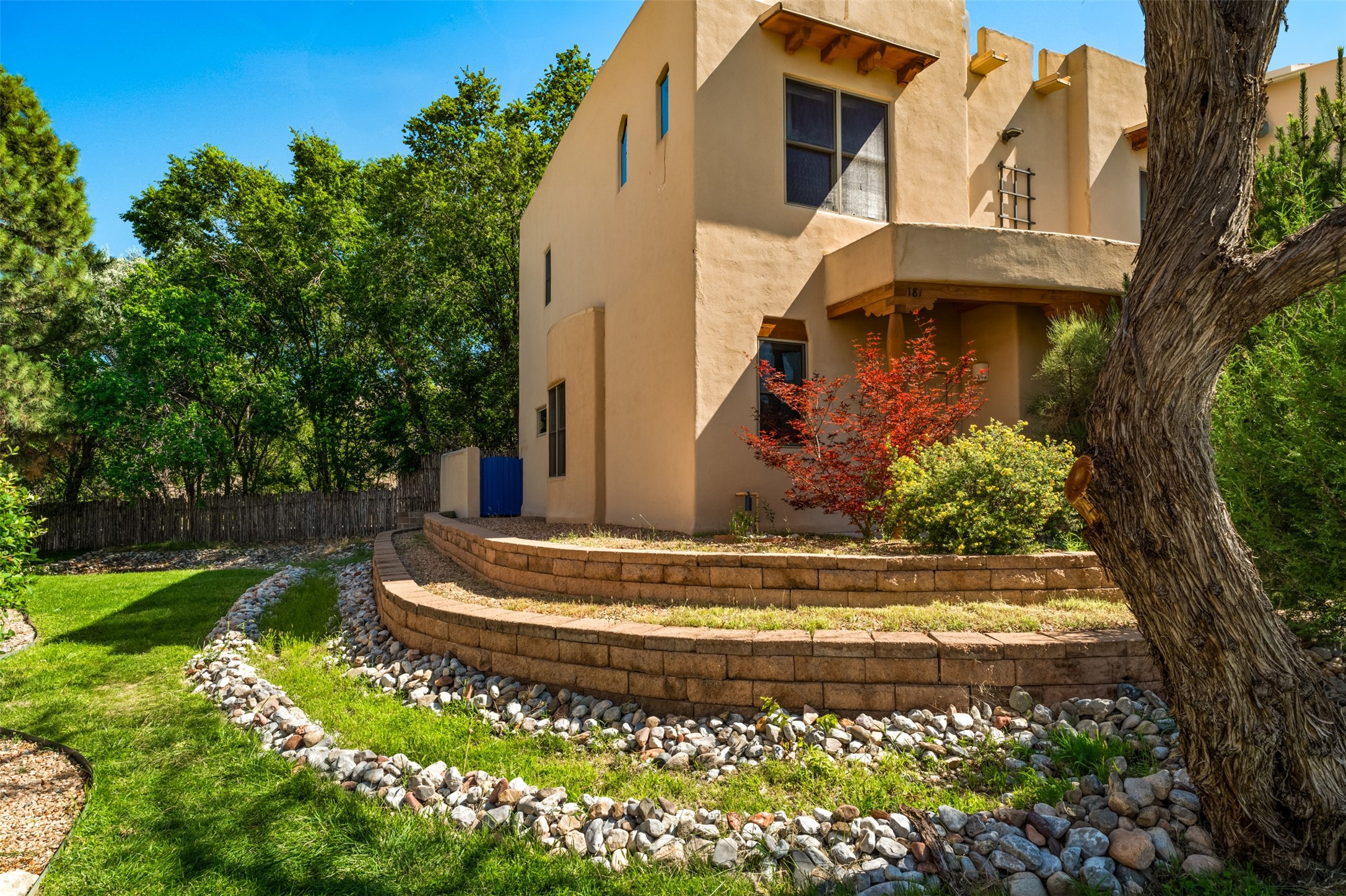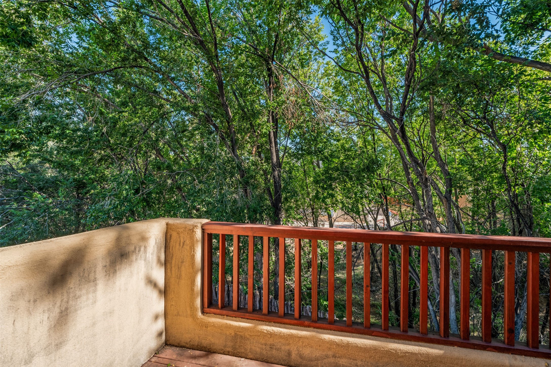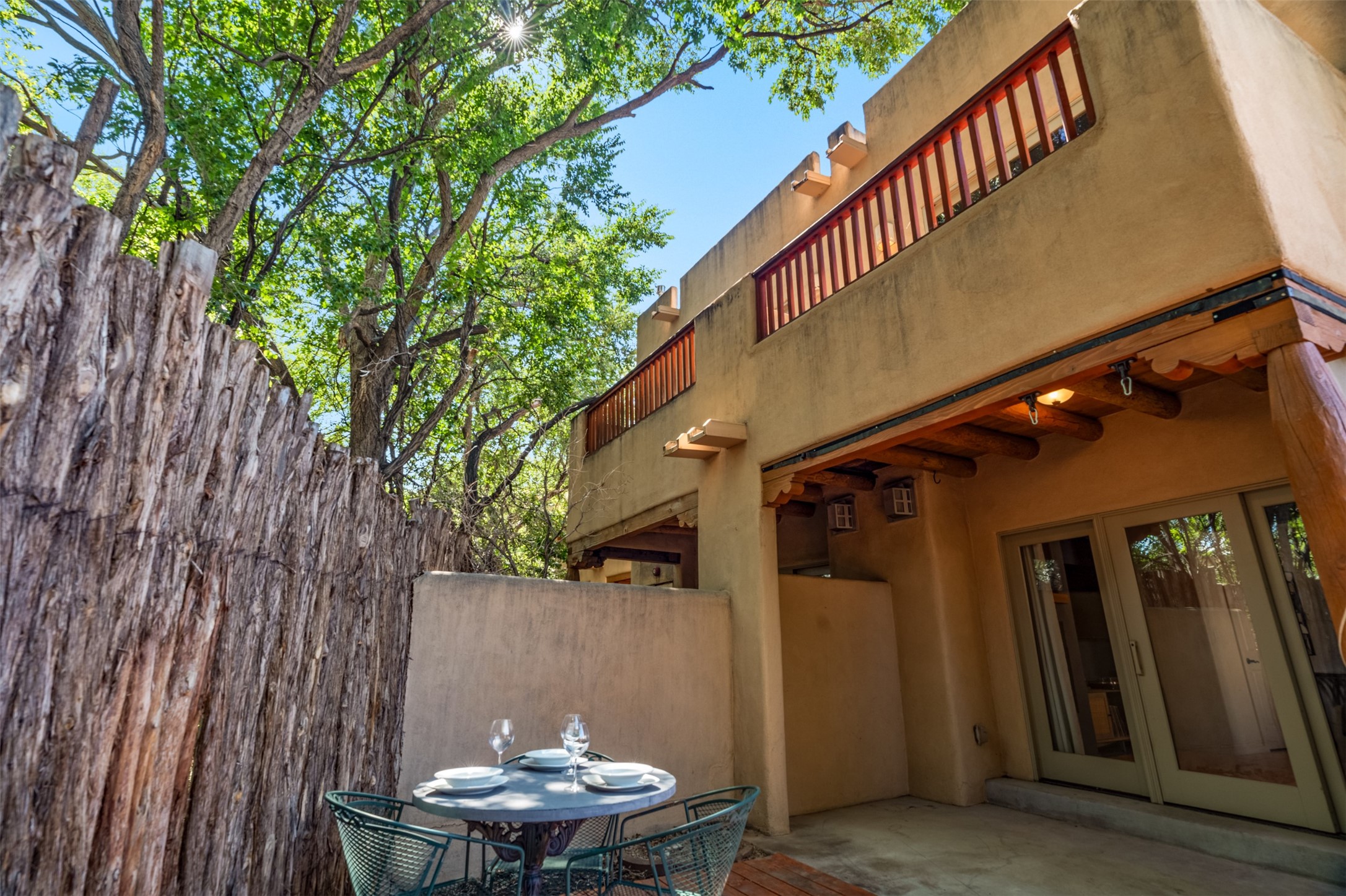 Enjoy the ease of Santa Fe living in this well-situated, bright two-story corner unit at the San Mateo de Santa Fe Condo Community--a gated, centrally located enclave just minutes from downtown, Trader Joe's, and the Lena Street arts and dining district. This 2-bed, 2.5-bath residence offers privacy, convenience, and access to premium amenities.Tucked along the quiet outer edge of the community, the home backs up to a tree-lined arroyo, offering a sense of privacy and a tranquil ambiance. Dedicated parking is directly outside the front door.Inside, the main level features tiled floors, vigas, a gas fireplace, and natural light throughout. The kitchen offers stone countertops, plentiful cabinet space, and a bright, efficient layout. A pass-through window opens to the dining area, bringing in additional light and maintaining connection between the living and cooking spaces. Just off the main living area is a convenient powder room for guests.Step outside to a spacious enclosed back patio, complete with a covered portal and wood decking. With a sense of privacy rarely found in a condo setting, this outdoor space is ideal for relaxing, dining, or letting pets roam safely.Upstairs, the primary suite includes a walk-in closet, full ensuite bath, and a private balcony overlooking the greenbelt--an ideal spot to enjoy your morning coffee or watch the seasons change. The second bedroom also features a walk-in closet and a full ensuite bath. A laundry room is located in the hallway between the bedrooms, offering added convenience.Residents of the San Mateo de Santa Fe Community enjoy access to a seasonal swimming pool, well-equipped fitness studio, and ample guest parking. This professionally managed, pet-friendly community offers a carefree lifestyle with close proximity to shopping, healthcare, and restaurants--ideal for full-time residents or part-time Santa Fe dwellers seeking a lock-and-leave option.