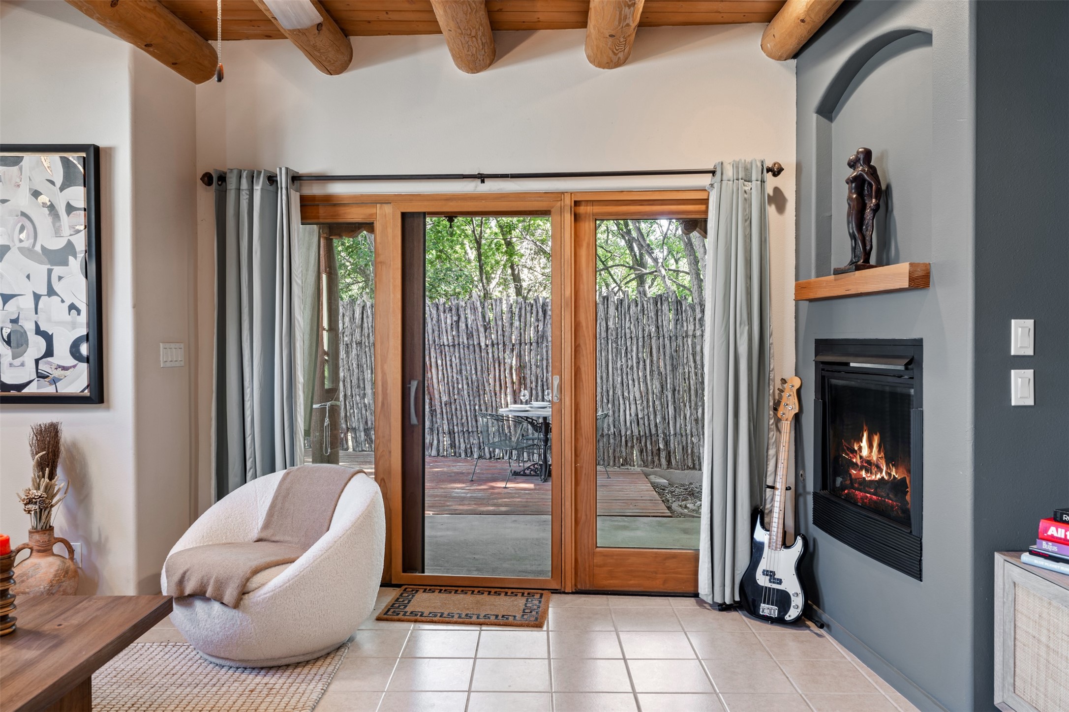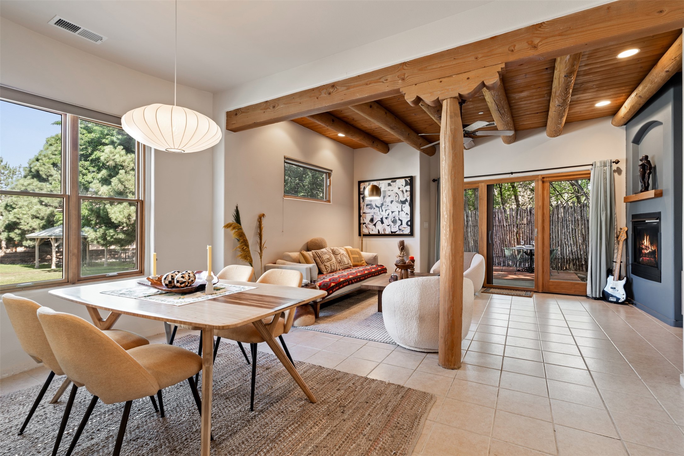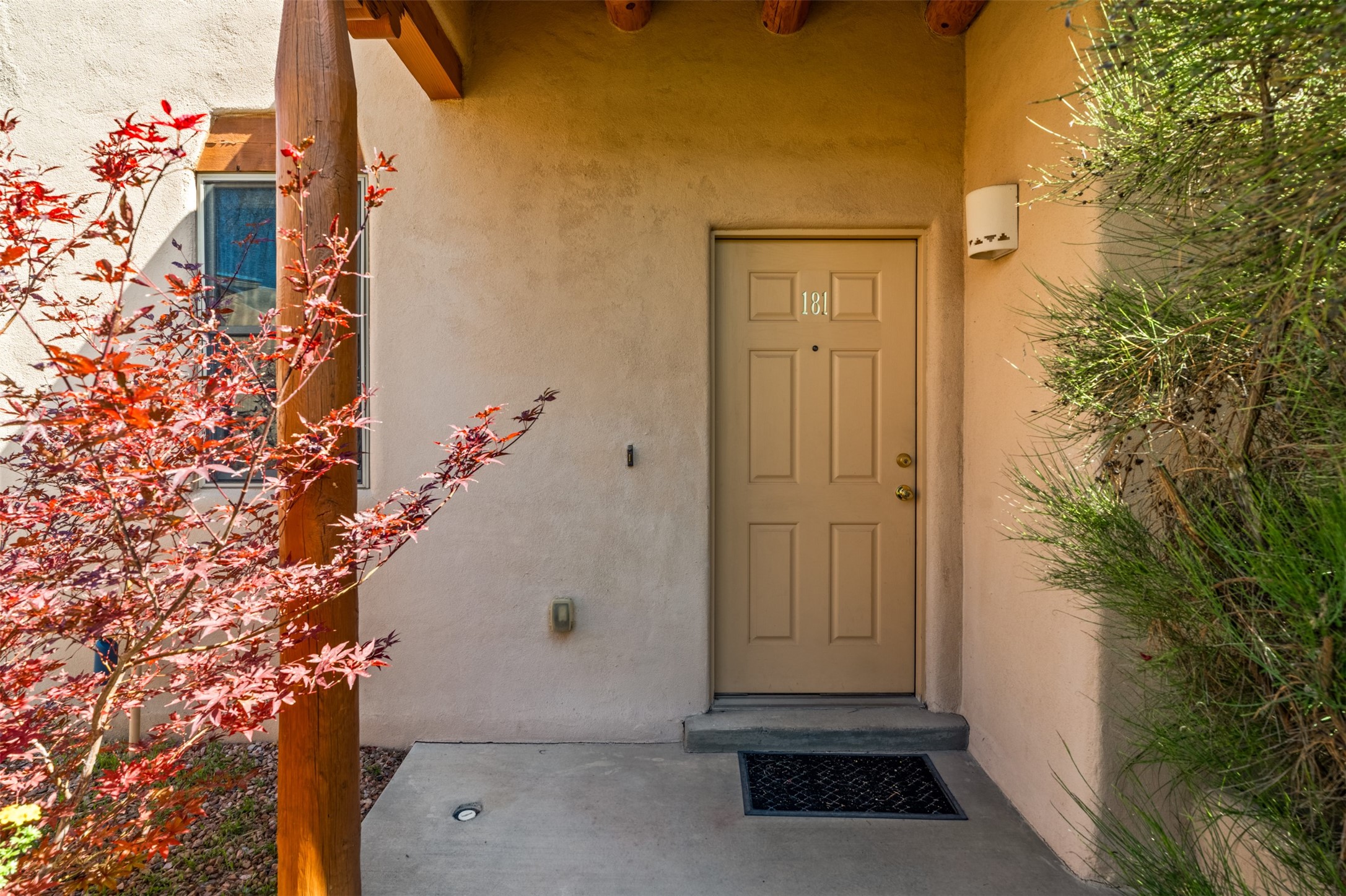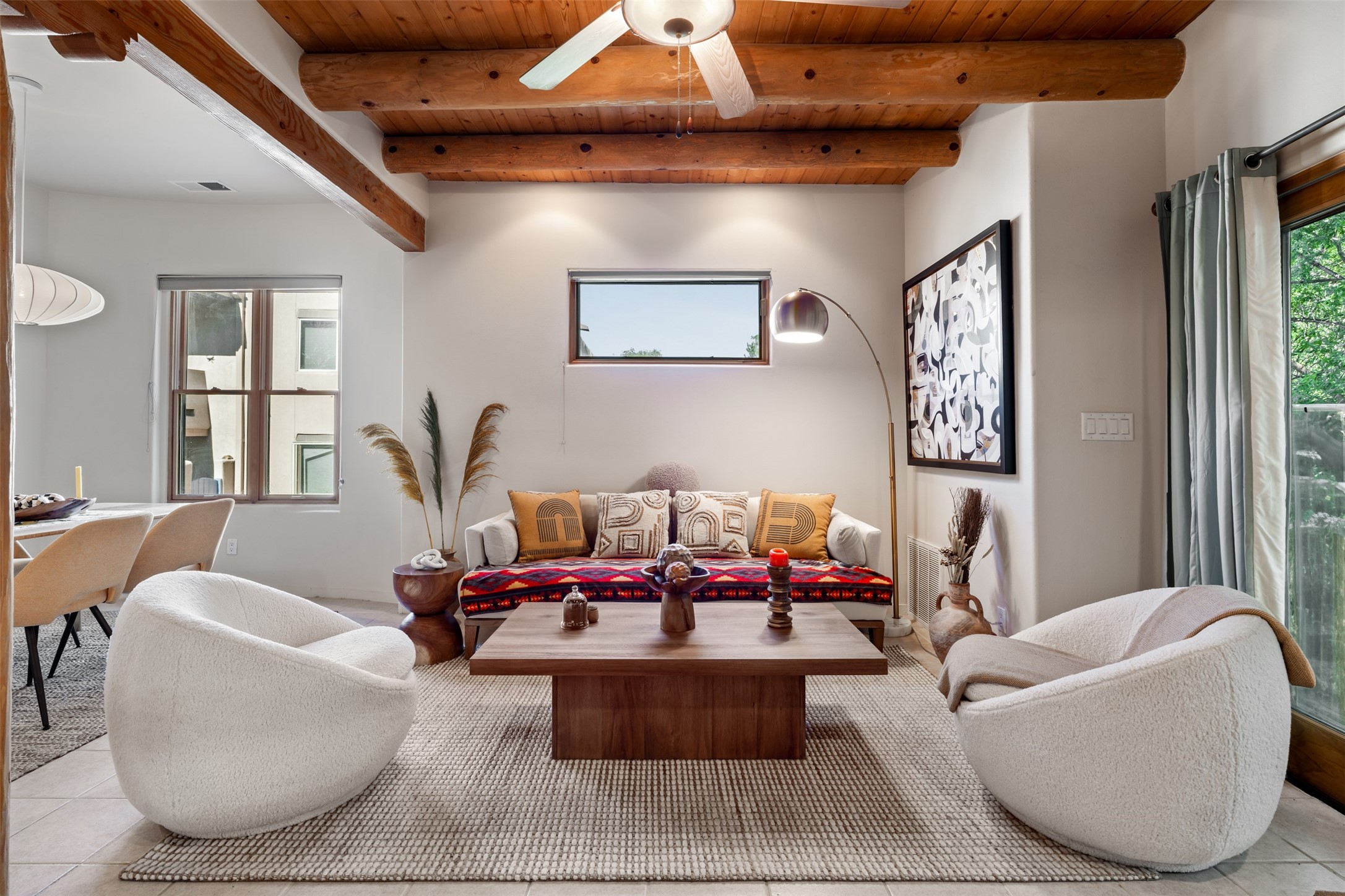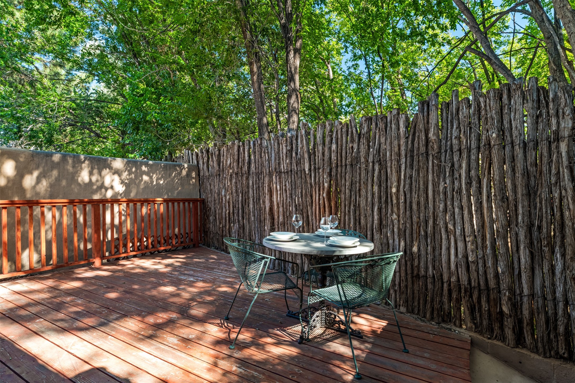 Enjoy the ease of Santa Fe living in this well-situated, bright two-story corner unit at the San Mateo de Santa Fe Condo Community--a gated, centrally located enclave just minutes from downtown, Trader Joe's, and the Lena Street arts and dining district. This 2-bed, 2.5-bath residence offers privacy, convenience, and access to premium amenities.Tucked along the quiet outer edge of the community, the home backs up to a tree-lined arroyo, offering a sense of privacy and a tranquil ambiance. Dedicated parking is directly outside the front door.Inside, the main level features tiled floors, vigas, a gas fireplace, and natural light throughout. The kitchen offers stone countertops, plentiful cabinet space, and a bright, efficient layout. A pass-through window opens to the dining area, bringing in additional light and maintaining connection between the living and cooking spaces. Just off the main living area is a convenient powder room for guests.Step outside to a spacious enclosed back patio, complete with a covered portal and wood decking. With a sense of privacy rarely found in a condo setting, this outdoor space is ideal for relaxing, dining, or letting pets roam safely.Upstairs, the primary suite includes a walk-in closet, full ensuite bath, and a private balcony overlooking the greenbelt--an ideal spot to enjoy your morning coffee or watch the seasons change. The second bedroom also features a walk-in closet and a full ensuite bath. A laundry room is located in the hallway between the bedrooms, offering added convenience.Residents of the San Mateo de Santa Fe Community enjoy access to a seasonal swimming pool, well-equipped fitness studio, and ample guest parking. This professionally managed, pet-friendly community offers a carefree lifestyle with close proximity to shopping, healthcare, and restaurants--ideal for full-time residents or part-time Santa Fe dwellers seeking a lock-and-leave option.