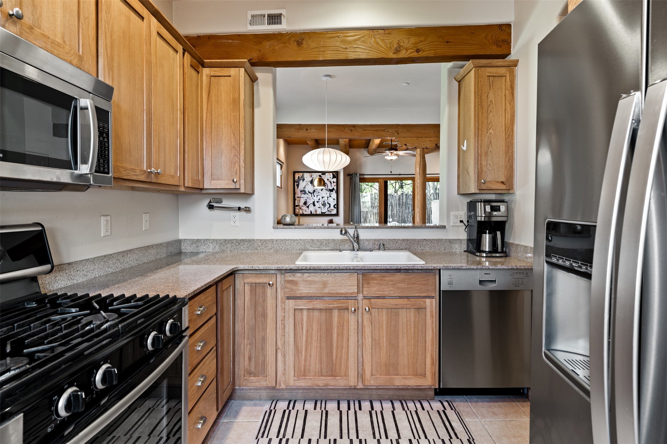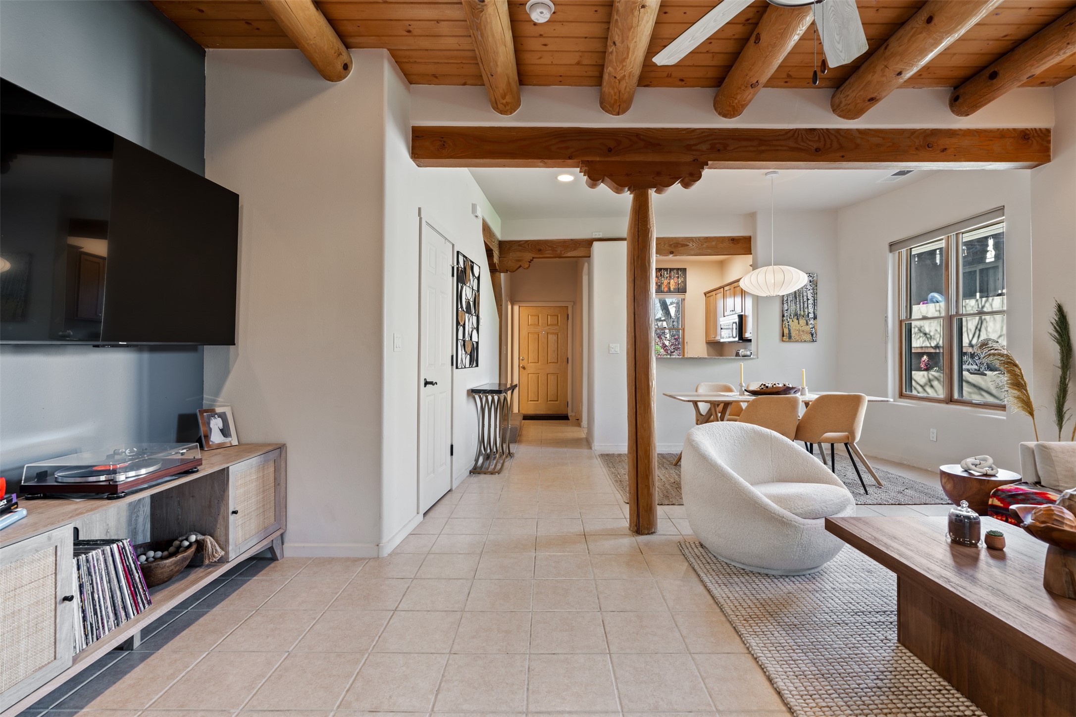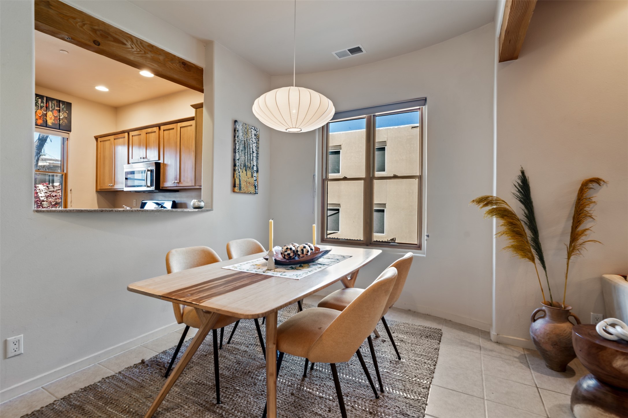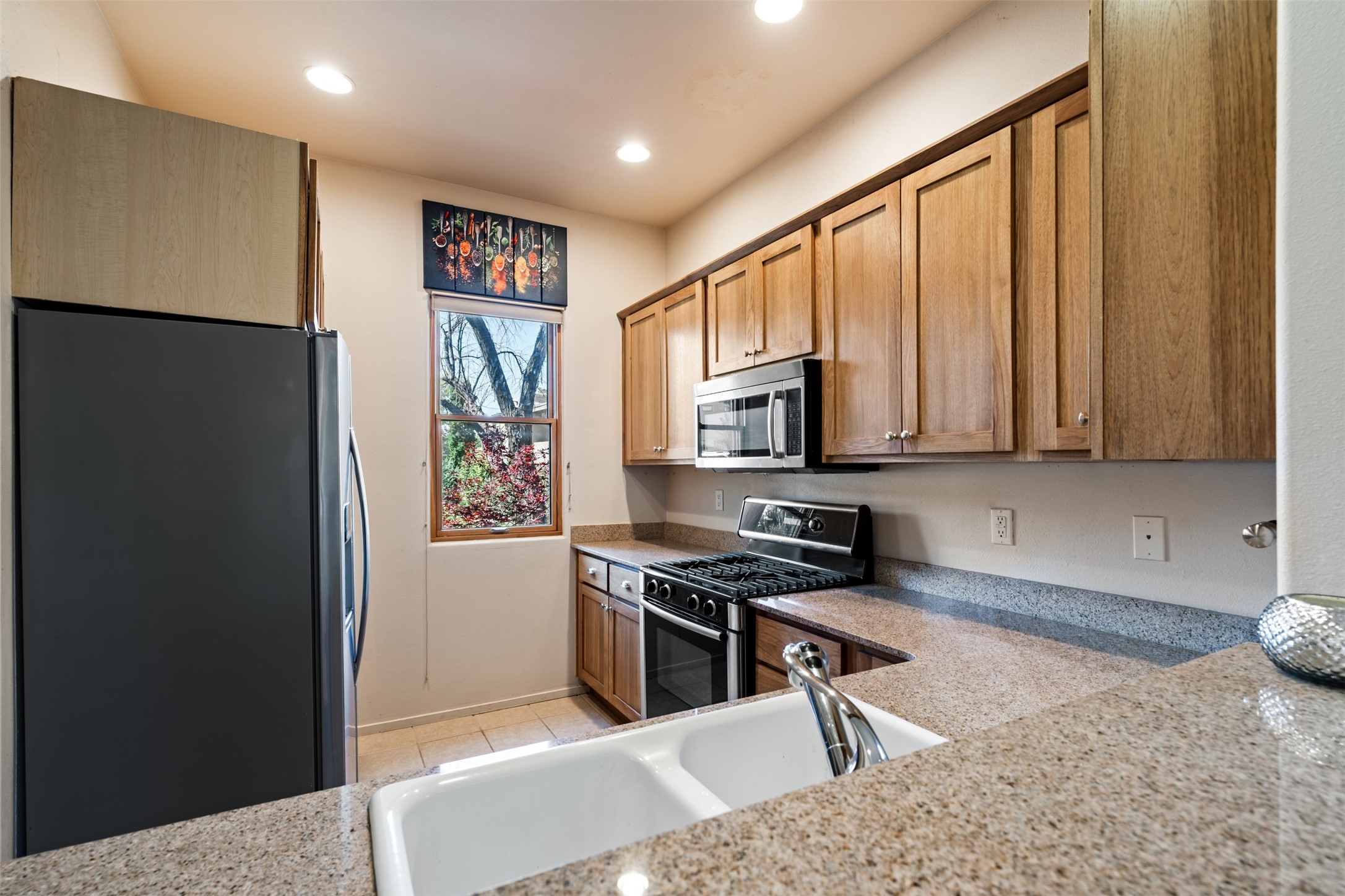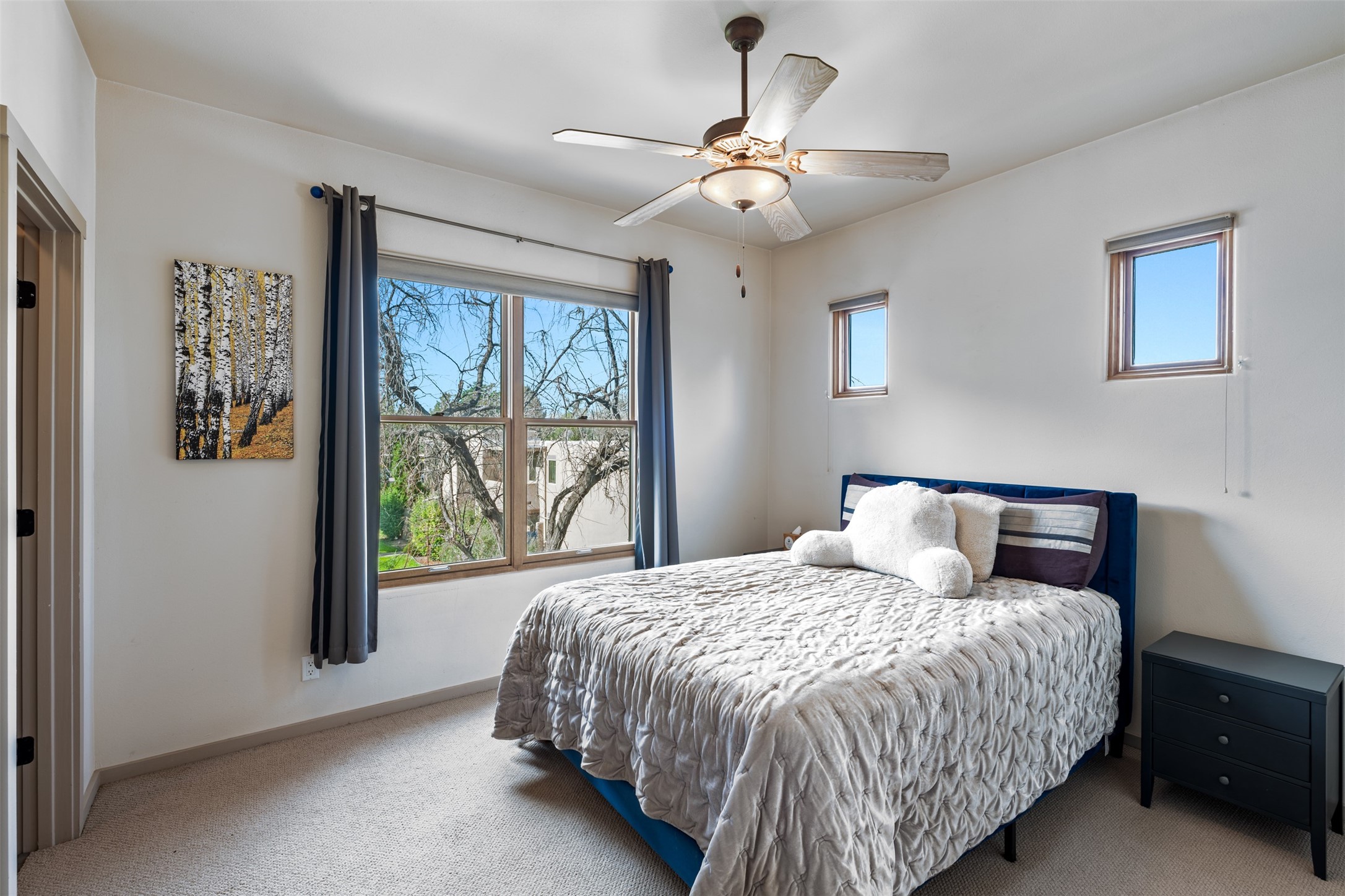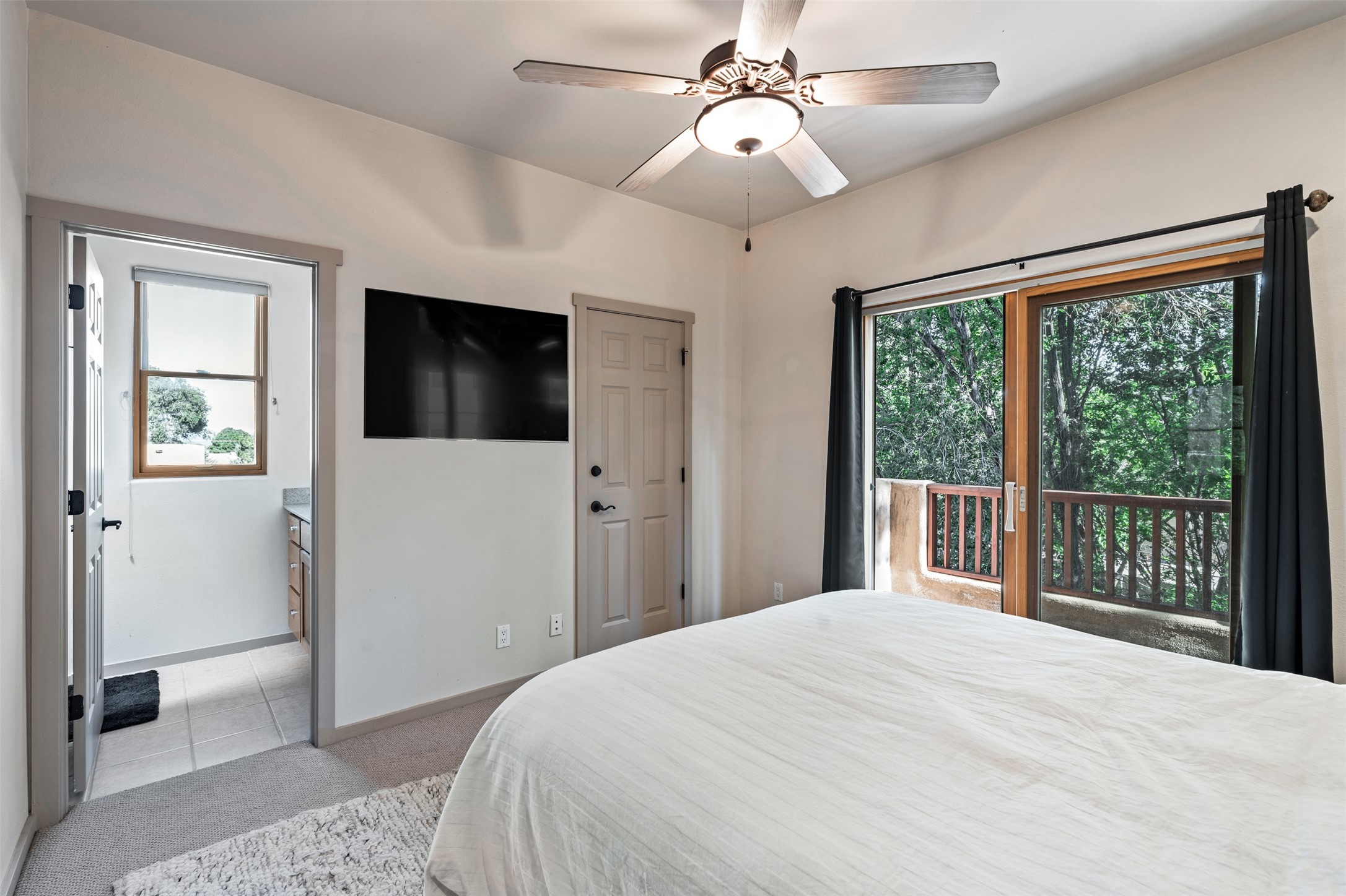 Enjoy the ease of Santa Fe living in this well-situated, bright two-story corner unit at the San Mateo de Santa Fe Condo Community--a gated, centrally located enclave just minutes from downtown, Trader Joe's, and the Lena Street arts and dining district. This 2-bed, 2.5-bath residence offers privacy, convenience, and access to premium amenities.Tucked along the quiet outer edge of the community, the home backs up to a tree-lined arroyo, offering a sense of privacy and a tranquil ambiance. Dedicated parking is directly outside the front door.Inside, the main level features tiled floors, vigas, a gas fireplace, and natural light throughout. The kitchen offers stone countertops, plentiful cabinet space, and a bright, efficient layout. A pass-through window opens to the dining area, bringing in additional light and maintaining connection between the living and cooking spaces. Just off the main living area is a convenient powder room for guests.Step outside to a spacious enclosed back patio, complete with a covered portal and wood decking. With a sense of privacy rarely found in a condo setting, this outdoor space is ideal for relaxing, dining, or letting pets roam safely.Upstairs, the primary suite includes a walk-in closet, full ensuite bath, and a private balcony overlooking the greenbelt--an ideal spot to enjoy your morning coffee or watch the seasons change. The second bedroom also features a walk-in closet and a full ensuite bath. A laundry room is located in the hallway between the bedrooms, offering added convenience.Residents of the San Mateo de Santa Fe Community enjoy access to a seasonal swimming pool, well-equipped fitness studio, and ample guest parking. This professionally managed, pet-friendly community offers a carefree lifestyle with close proximity to shopping, healthcare, and restaurants--ideal for full-time residents or part-time Santa Fe dwellers seeking a lock-and-leave option.