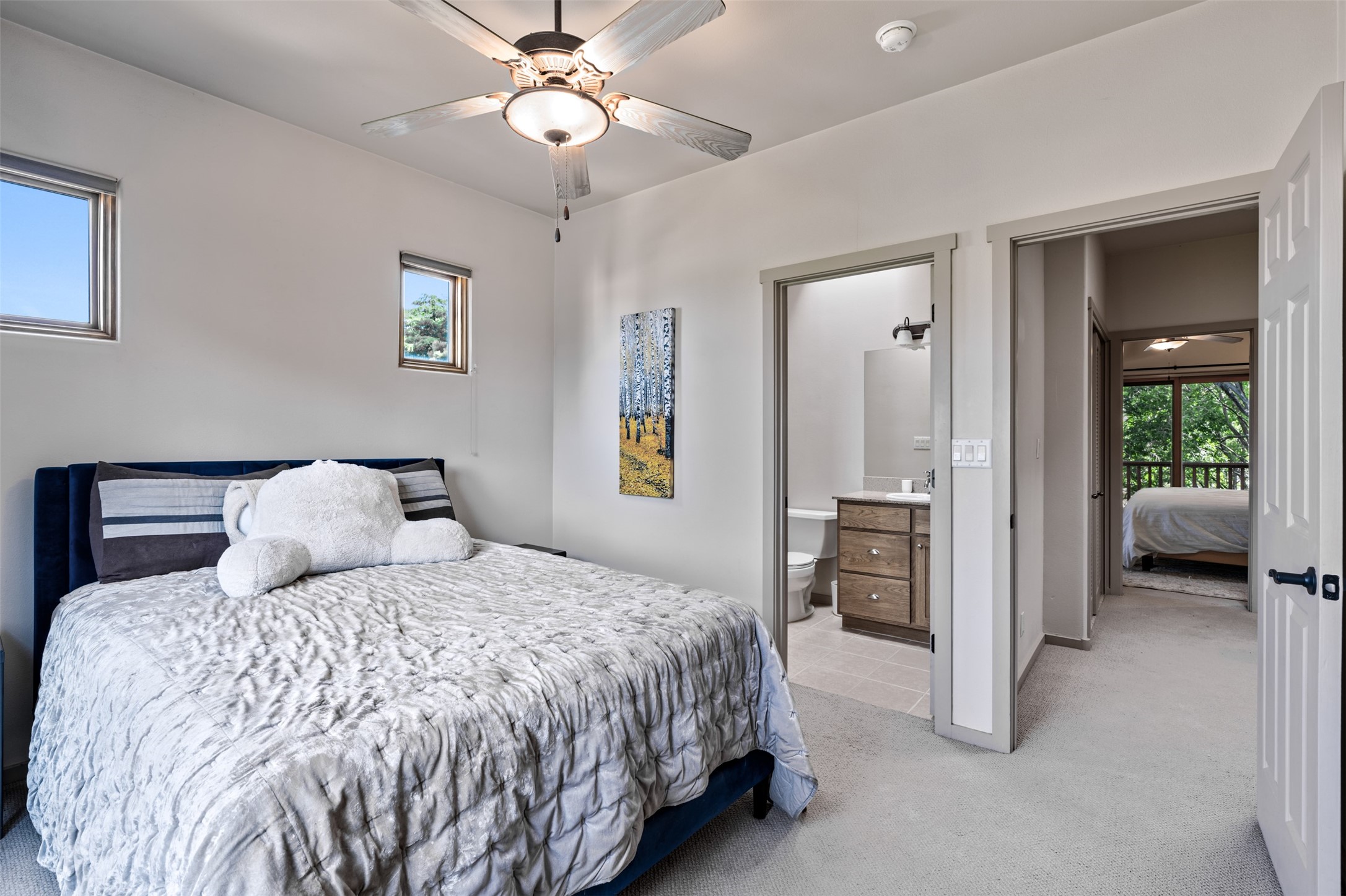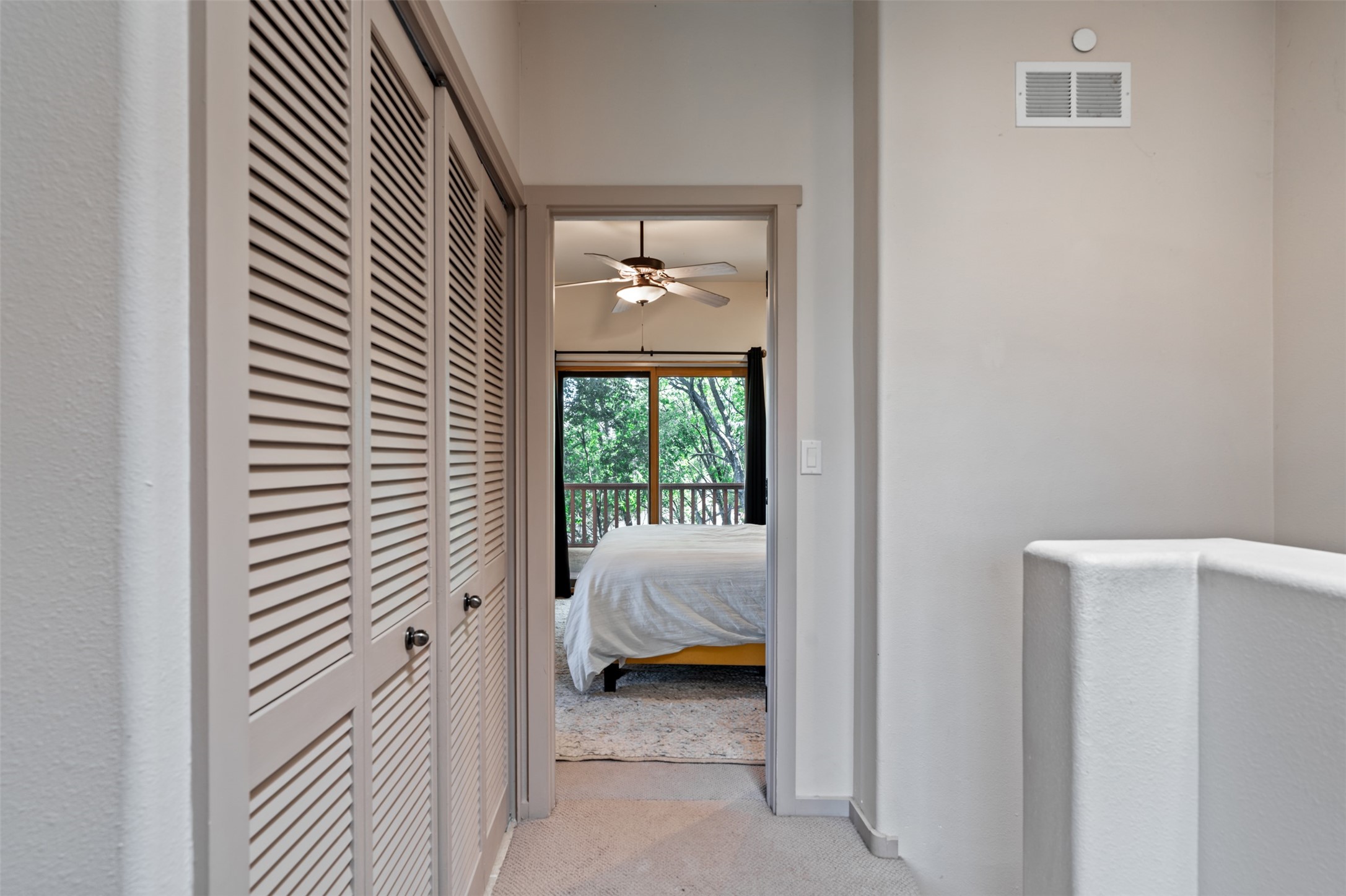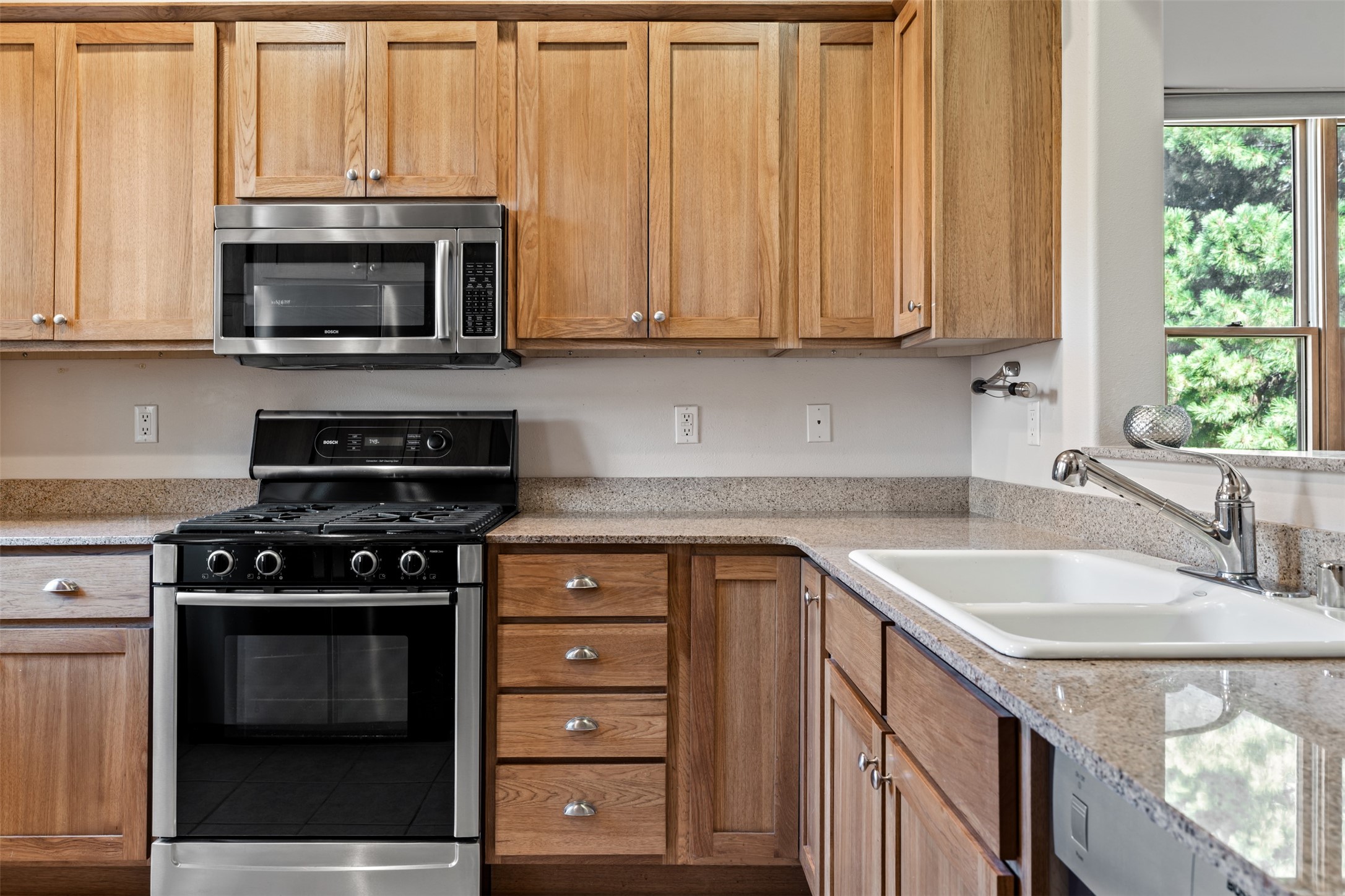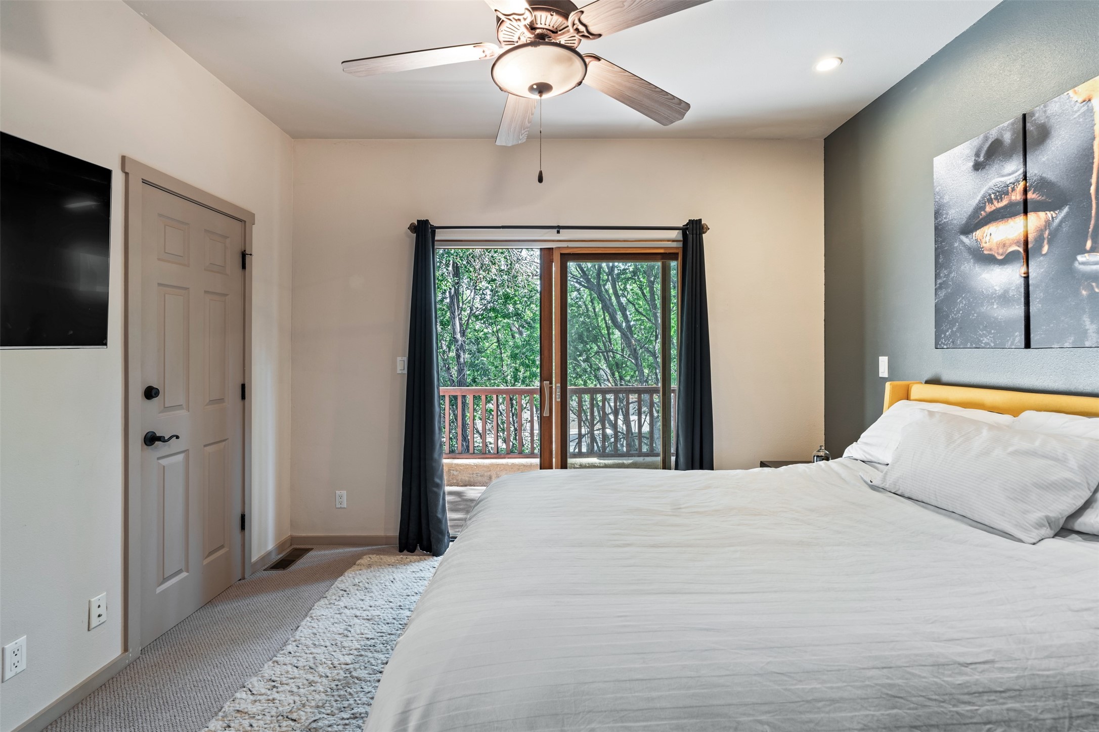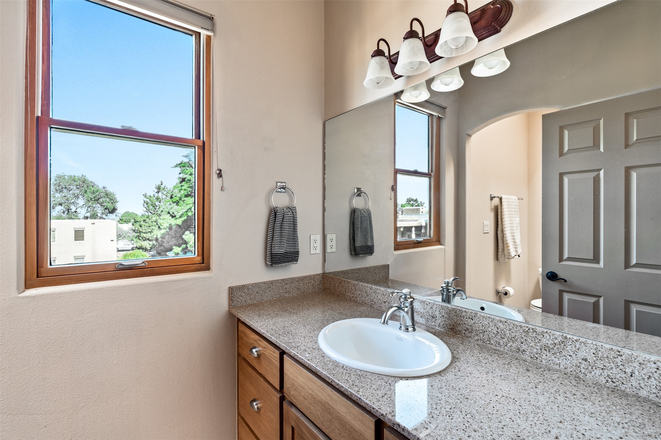 Enjoy the ease of Santa Fe living in this well-situated, bright two-story corner unit at the San Mateo de Santa Fe Condo Community--a gated, centrally located enclave just minutes from downtown, Trader Joe's, and the Lena Street arts and dining district. This 2-bed, 2.5-bath residence offers privacy, convenience, and access to premium amenities.Tucked along the quiet outer edge of the community, the home backs up to a tree-lined arroyo, offering a sense of privacy and a tranquil ambiance. Dedicated parking is directly outside the front door.Inside, the main level features tiled floors, vigas, a gas fireplace, and natural light throughout. The kitchen offers stone countertops, plentiful cabinet space, and a bright, efficient layout. A pass-through window opens to the dining area, bringing in additional light and maintaining connection between the living and cooking spaces. Just off the main living area is a convenient powder room for guests.Step outside to a spacious enclosed back patio, complete with a covered portal and wood decking. With a sense of privacy rarely found in a condo setting, this outdoor space is ideal for relaxing, dining, or letting pets roam safely.Upstairs, the primary suite includes a walk-in closet, full ensuite bath, and a private balcony overlooking the greenbelt--an ideal spot to enjoy your morning coffee or watch the seasons change. The second bedroom also features a walk-in closet and a full ensuite bath. A laundry room is located in the hallway between the bedrooms, offering added convenience.Residents of the San Mateo de Santa Fe Community enjoy access to a seasonal swimming pool, well-equipped fitness studio, and ample guest parking. This professionally managed, pet-friendly community offers a carefree lifestyle with close proximity to shopping, healthcare, and restaurants--ideal for full-time residents or part-time Santa Fe dwellers seeking a lock-and-leave option.
