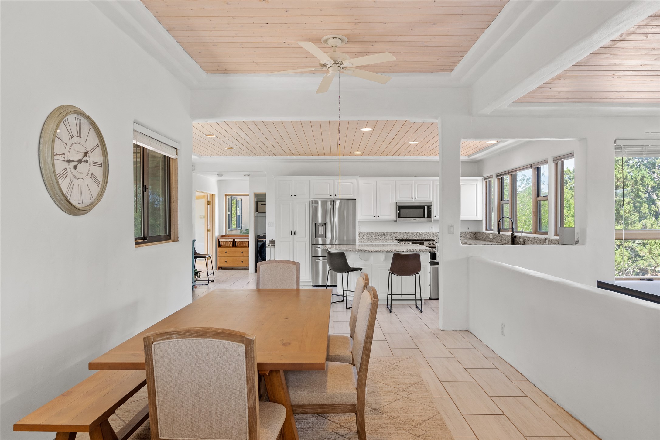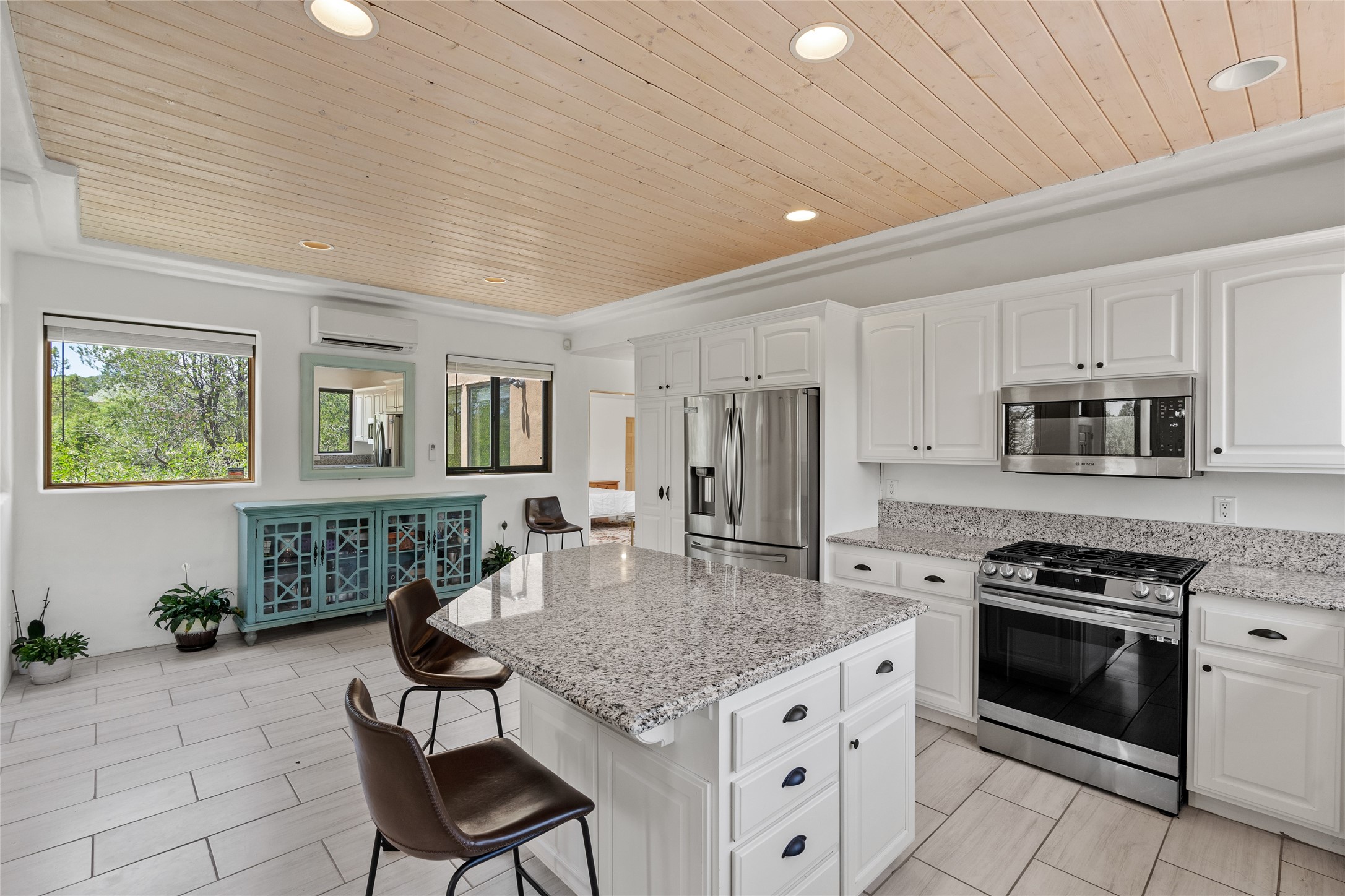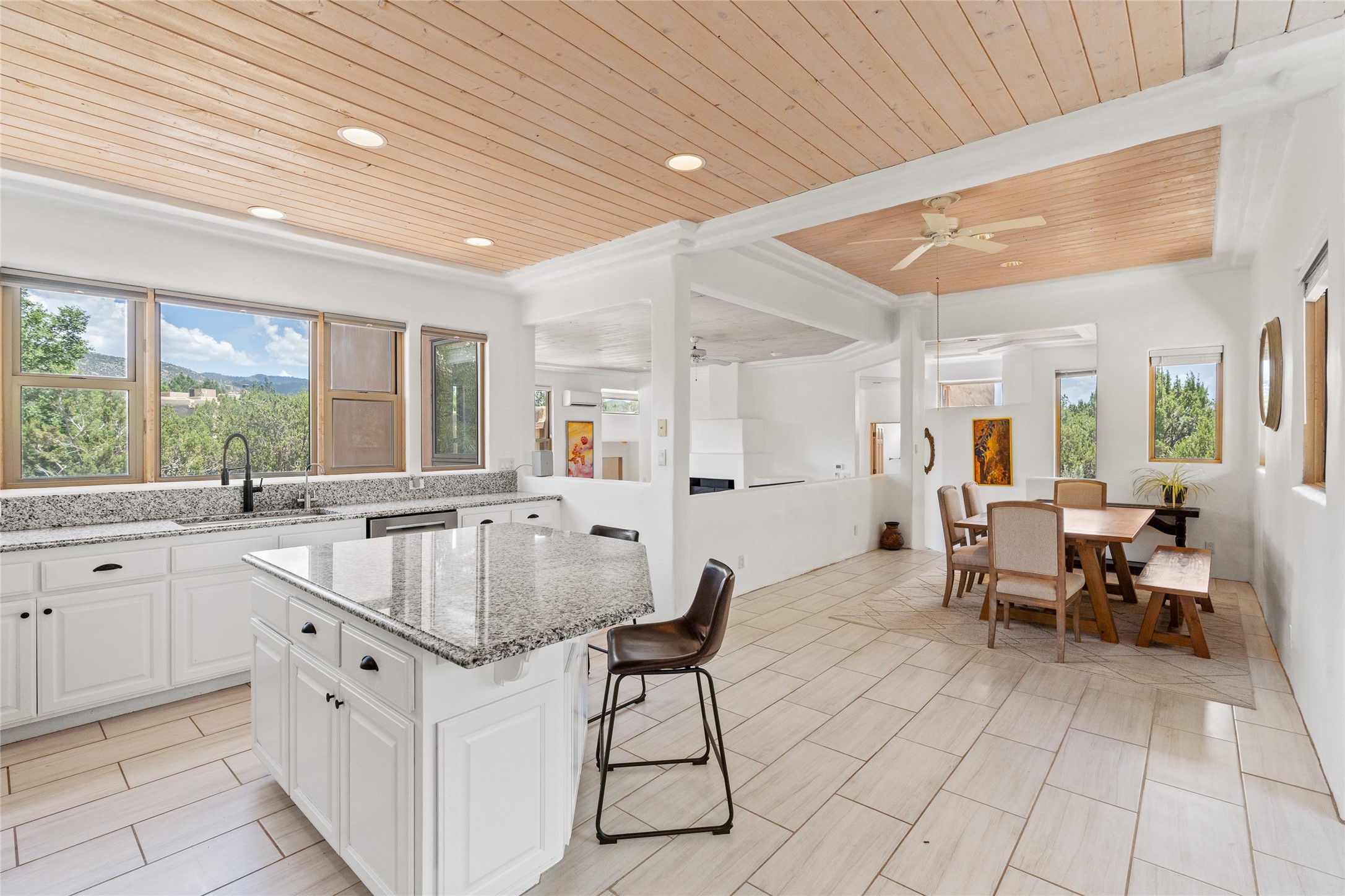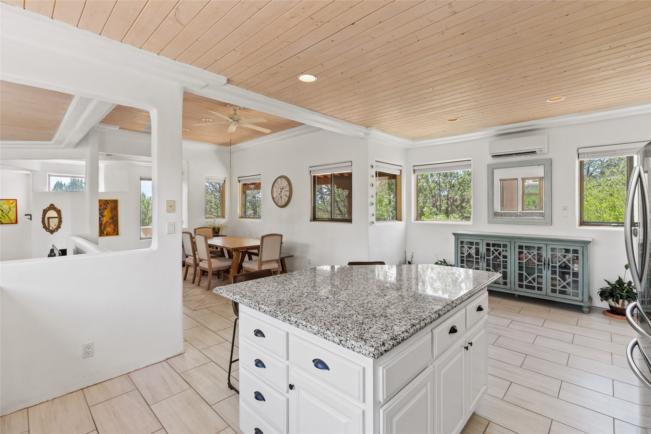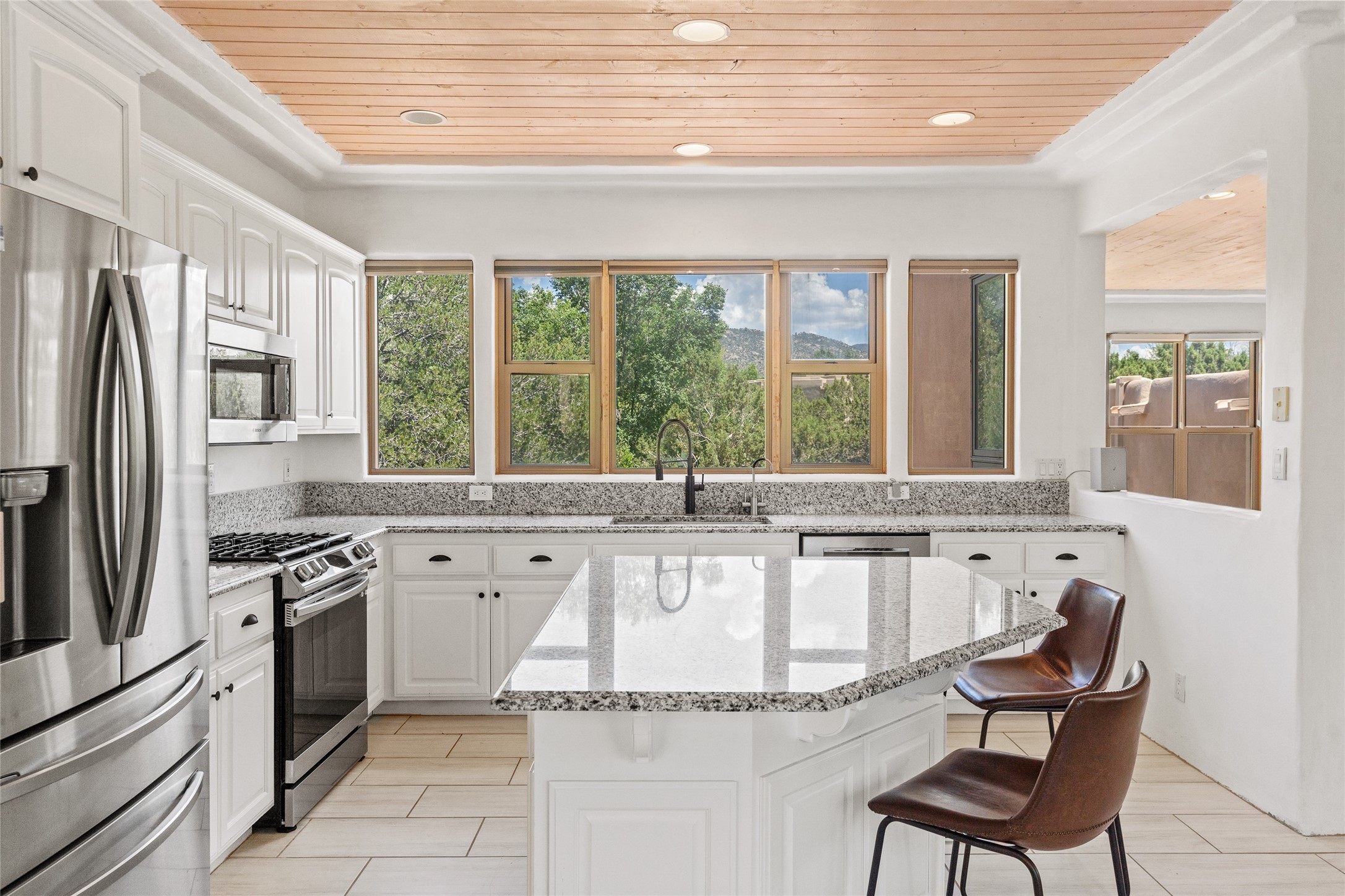 Located on over an acre with unbeatable access to all that Santa Fe has to offer, this beautifully updated home offers views of Sun andMoon Mountains and an open, flexible layout ideal for modern living. Tongue-and-groove ceilings with recessed lighting run throughout themain living areas, complementing the abundant natural light that pours in through large windows. The updated kitchen features new granitecountertops, newer Bosch and Samsung appliances, plus a RO filtration in the kitchen. The kitchen flows seamlessly into the open-conceptliving and dining spaces. This move-in ready home features two cozy fireplaces that create warmth and ambiance, while radiant heating and mini splits provide efficient heatingand cooling year-round. With three spacious bedrooms--including two that function well as primary suites. A standout feature is theattached studio with its own entrance, carport, skylights, and plentiful windows--perfect for an art space, home office, or guest retreat.Outside, the expansive lot offers endless possibilities for gardening, recreation, or expansion. Just a 5-minute walk from Christus St Vincent Regional Medical Center and only 10 minutes to the historic Santa Fe Plaza, this home combines peaceful privacy with centralconvenience. Don't miss this rare opportunity to own a flexible, light-filled property in one of Santa Fe's most desirable locations with NO HOA! The seller is also offering a home warranty for additional peace of mind.