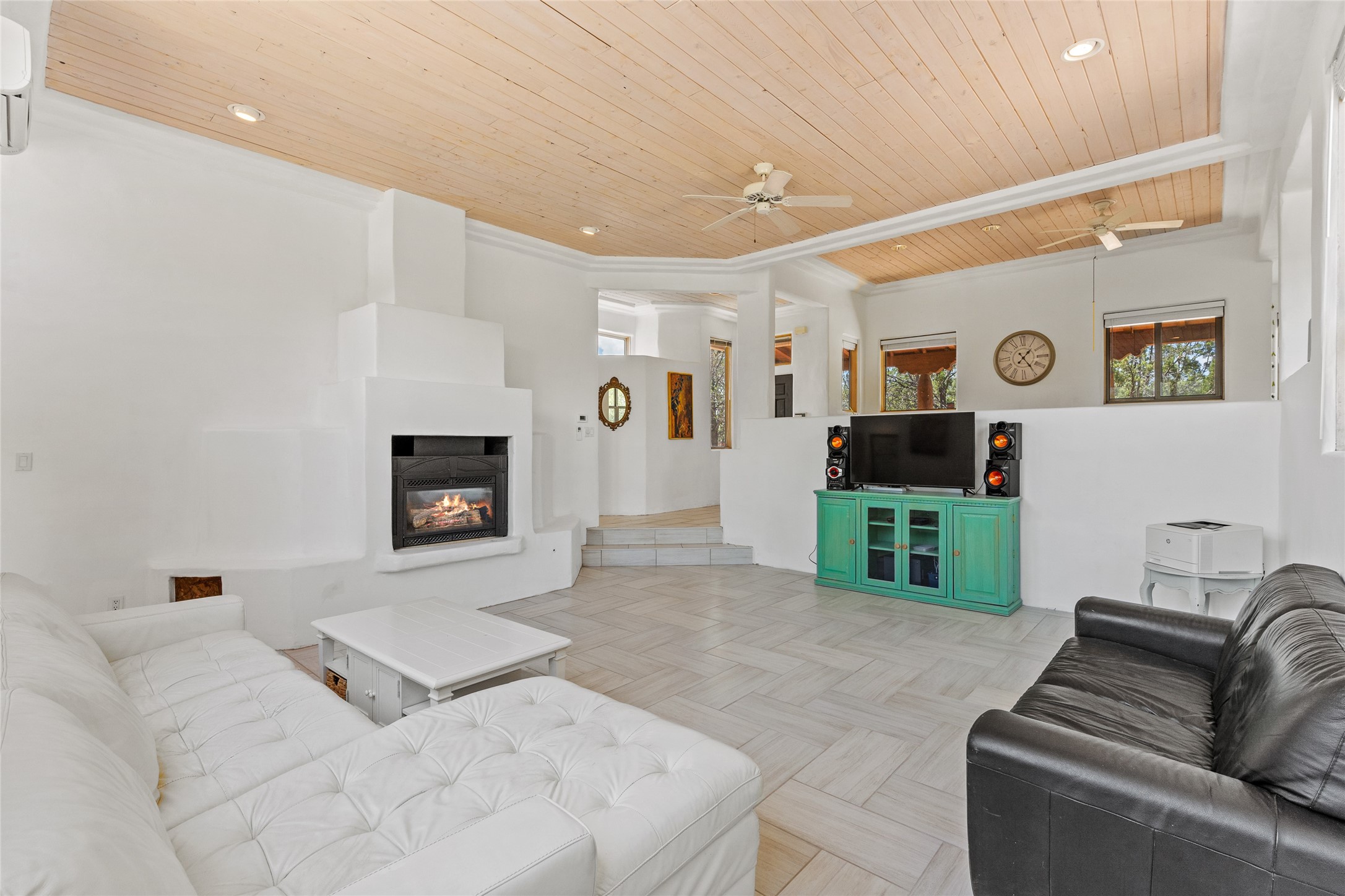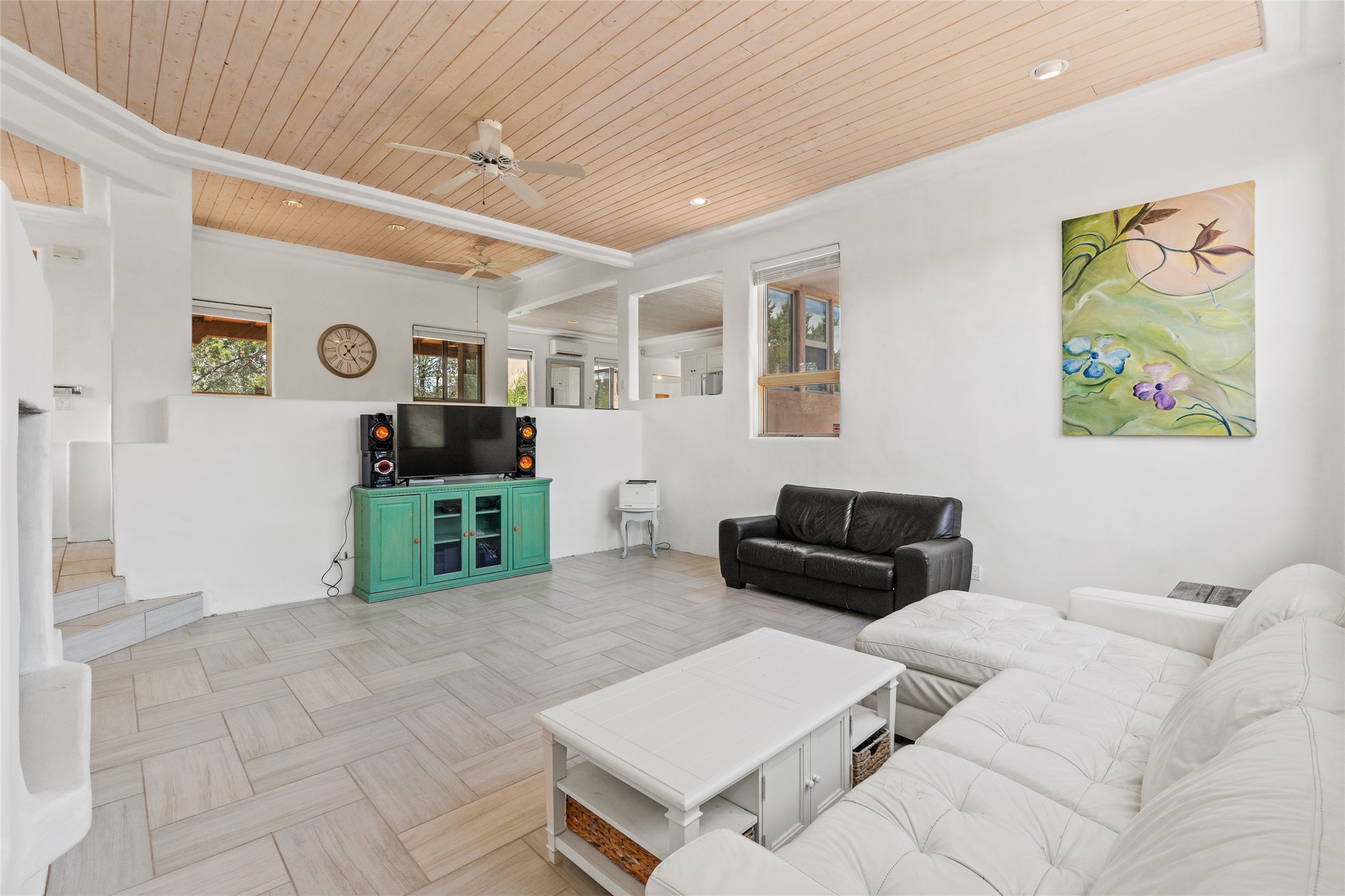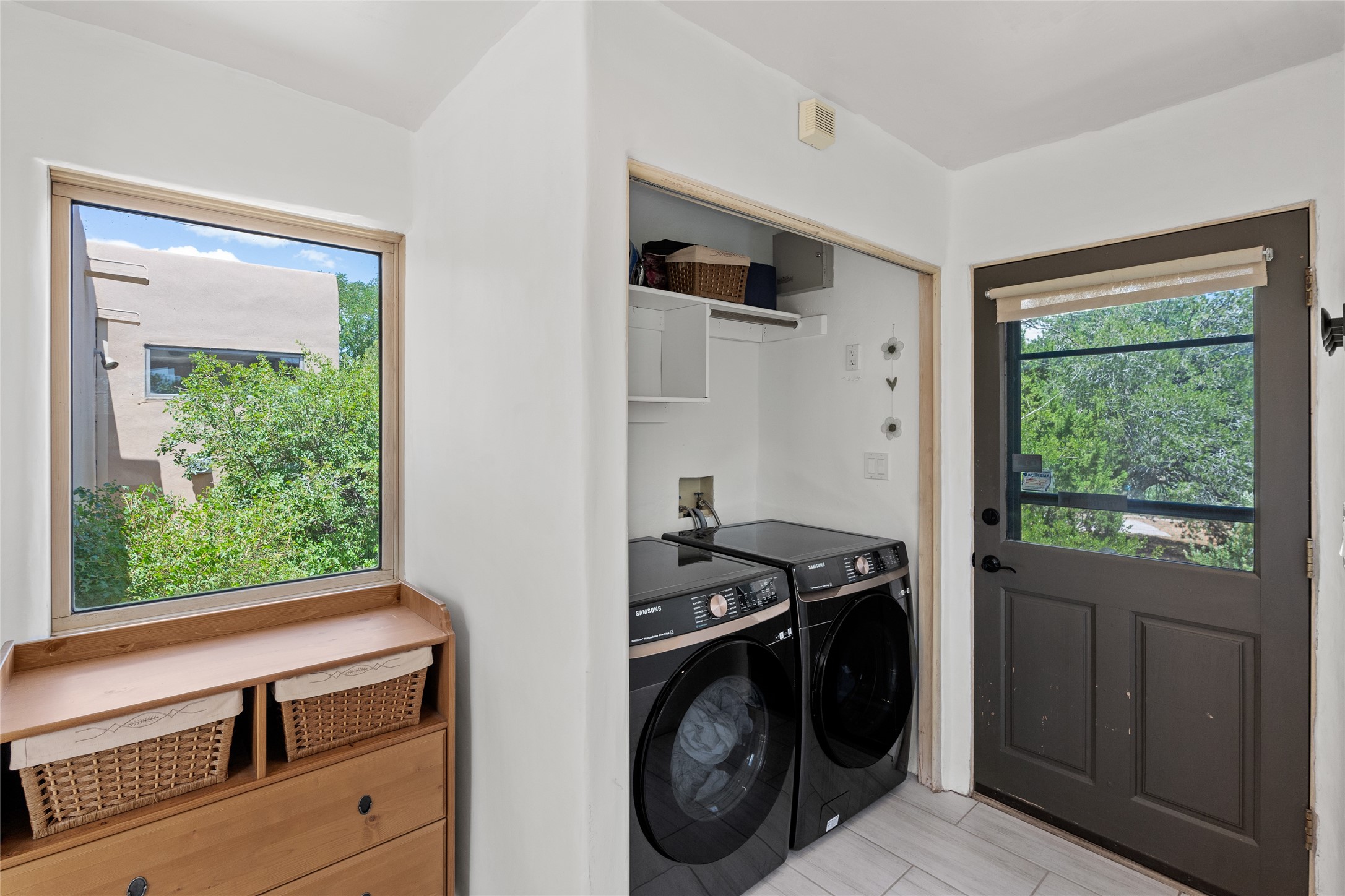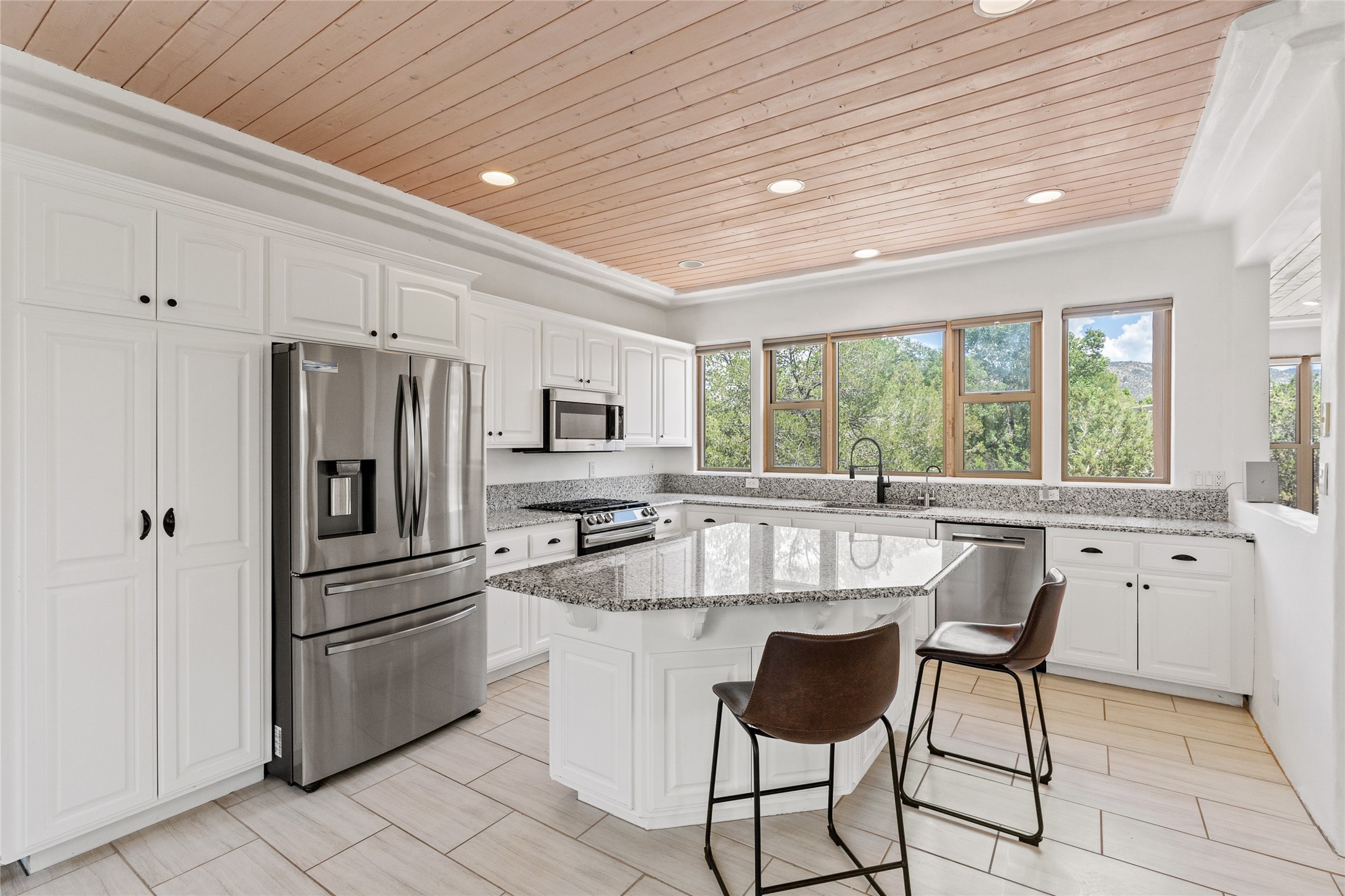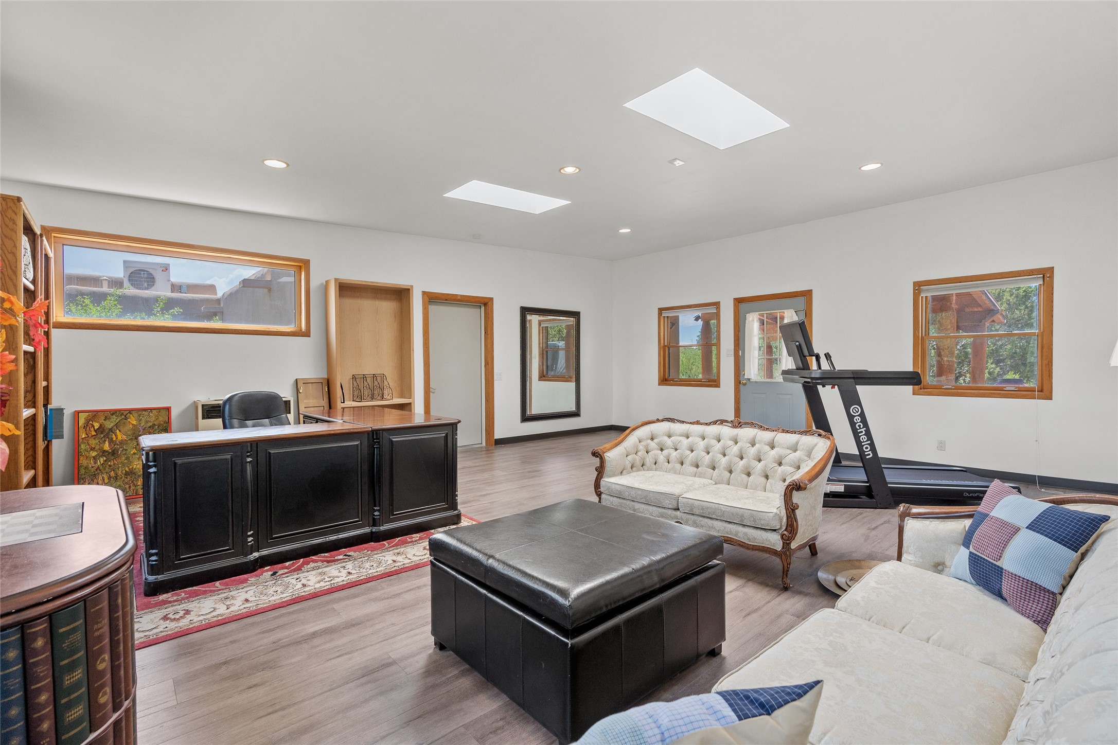 Located on over an acre with unbeatable access to all that Santa Fe has to offer, this beautifully updated home offers views of Sun andMoon Mountains and an open, flexible layout ideal for modern living. Tongue-and-groove ceilings with recessed lighting run throughout themain living areas, complementing the abundant natural light that pours in through large windows. The updated kitchen features new granitecountertops, newer Bosch and Samsung appliances, plus a RO filtration in the kitchen. The kitchen flows seamlessly into the open-conceptliving and dining spaces. This move-in ready home features two cozy fireplaces that create warmth and ambiance, while radiant heating and mini splits provide efficient heatingand cooling year-round. With three spacious bedrooms--including two that function well as primary suites. A standout feature is theattached studio with its own entrance, carport, skylights, and plentiful windows--perfect for an art space, home office, or guest retreat.Outside, the expansive lot offers endless possibilities for gardening, recreation, or expansion. Just a 5-minute walk from Christus St Vincent Regional Medical Center and only 10 minutes to the historic Santa Fe Plaza, this home combines peaceful privacy with centralconvenience. Don't miss this rare opportunity to own a flexible, light-filled property in one of Santa Fe's most desirable locations with NO HOA! The seller is also offering a home warranty for additional peace of mind.