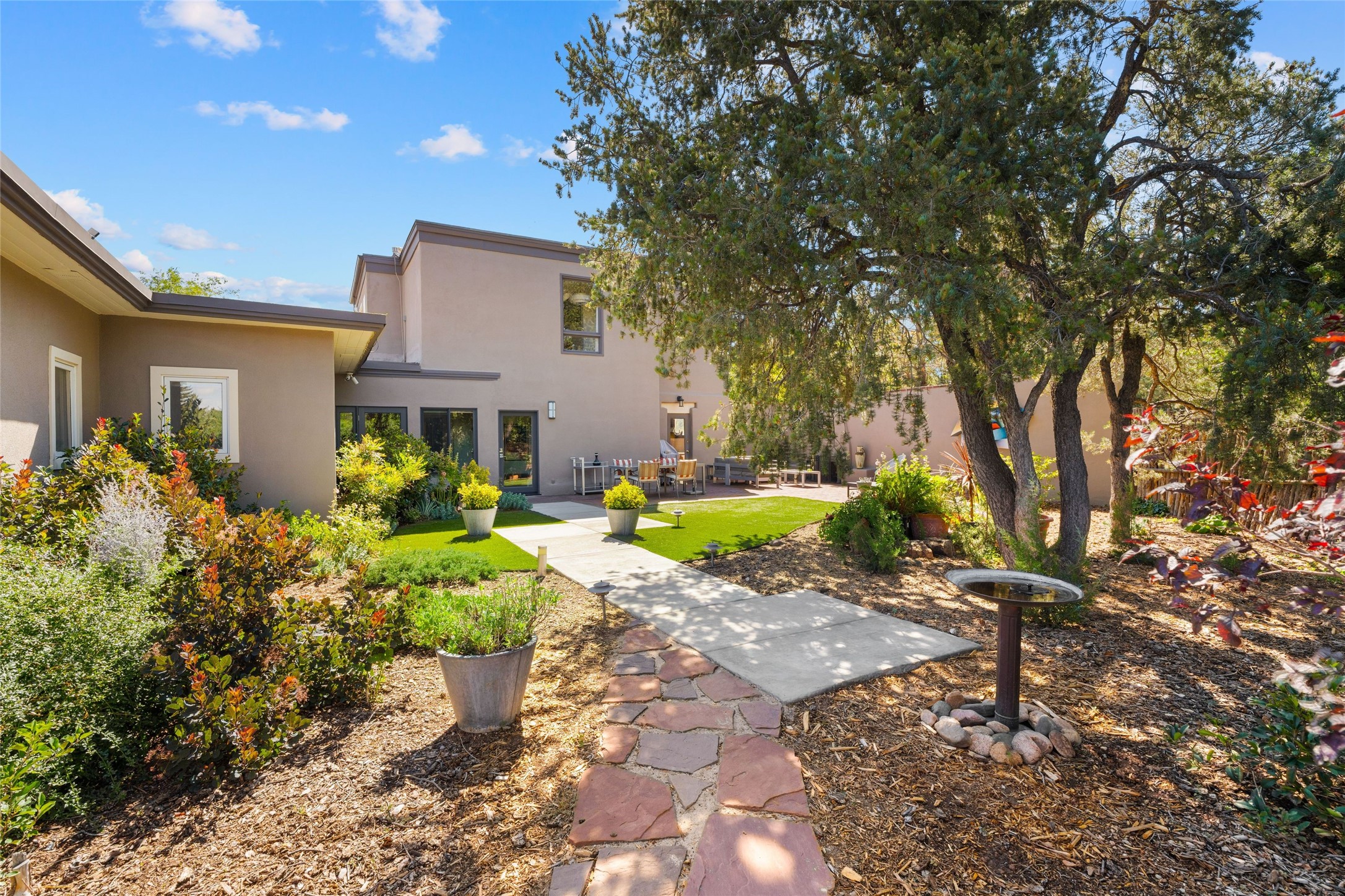 A truly inspired mid-century home like this cannot be found anywhere but Santa Fe and is ideally located where South Capitol meets Museum Hill. Designed & built in 1955, with a dramatic expansion in 1975, this home has evolved into unique & stunning! The mid-century conversation pit, large rooms & soaring ceilings are invigorated with elements of Santa Fe style: an iconic Kiva fireplace, double arrow carved details, customized latilla ceilings, nichos & vigas. Bespoke in so many ways by teams of craftsmen, you will appreciate hand plastered walls, narrow oak flooring that harks back to the 50s but looks brand new, other floors are brick, flagstone, & tile. The full acre property offers 3 distinctive outdoor areas: one is shady, tree-filled and comes alive at dusk with cool vintage lights. Off the studio is a sunny fenced yard with pear tree. Third & largest is a grand gathering space for parties, sit-down dinners, fireplace chats - surrounded by lush gardens. Sprawling across the main floor you will find entertainment-ready public spaces like a lofted great room, sitting, media, dining rooms plus eat-in kitchen. The bedroom wing is set apart with the primary bedroom en-suite plus 2 large bedrooms that share the main bath. The public 1/2 bath & laundry are part of the large media room area. The bonus is upstairs: an attached guest suite with private entrance, OR, second en-suite primary bedroom. Unexpected highlights: a 17' tall glass-walled art studio/gym, a "treasure room" or library, heated 2 car garage wired for 240 + separate workshop OR storage room. This property is flush with flexibility: if you seek a home office retreat there are many options. You will love the practicalty of this "Santa Fe Central" location where the 2 closest grocery stores are Trader Joe's & Whole Foods, the 2 closest restaurants are Museum Hill & Clafoutis. This is a rare opportunity to experience "design magazine modern" with Santa Fe spirit! Virtual tour + Video Link online