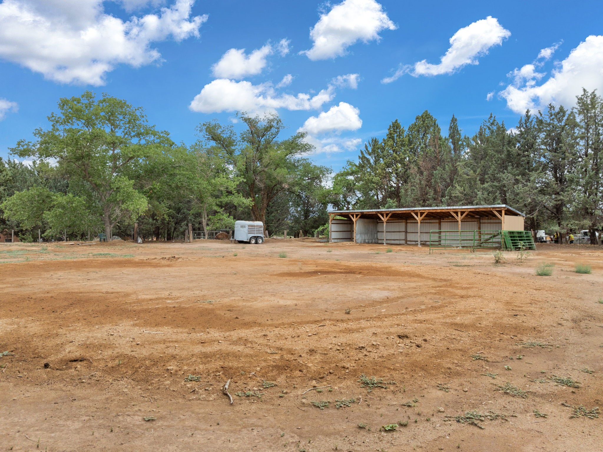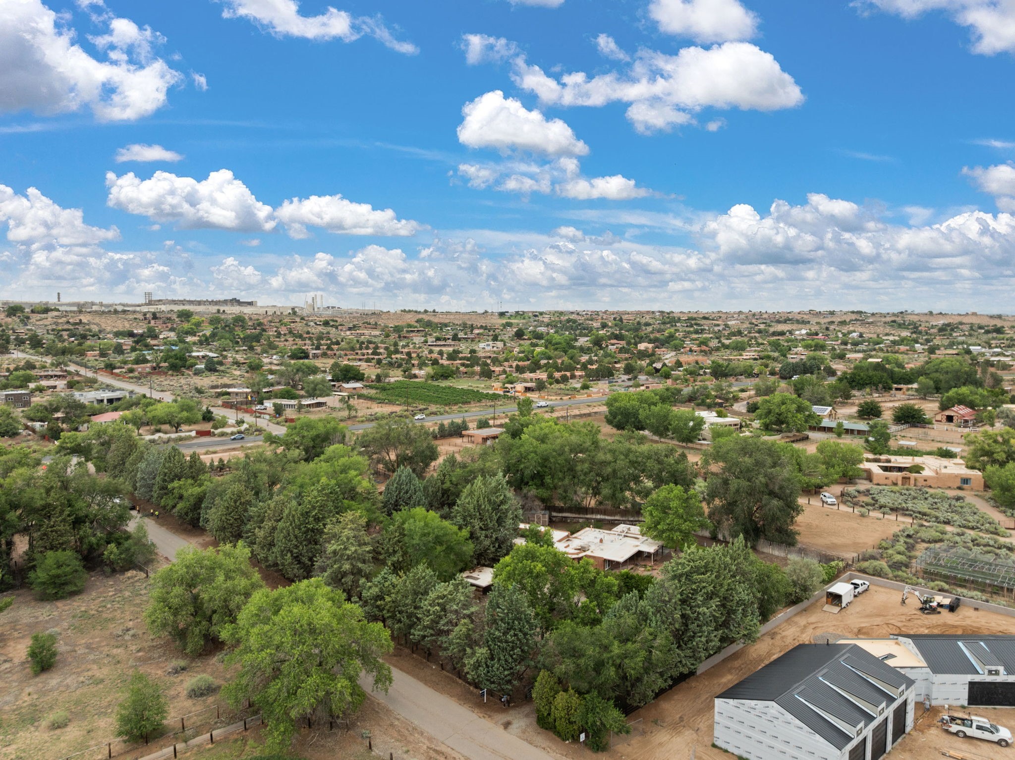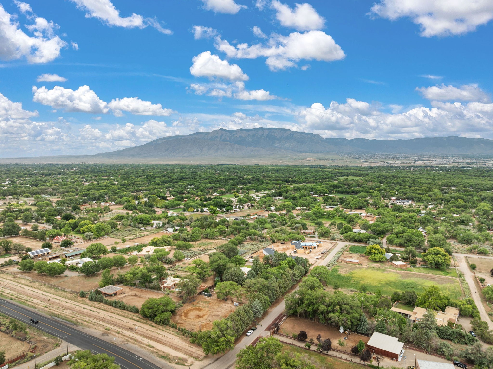 Enveloped by trees in a private 2 acre setting is this unique Corrales adobe style home. Over 3600 sf of living, featuring courtyard entry, living room with kiva fireplace, spacious kitchen with bar, granite and plenty of counter space. Informal and formal dining, a separate primary suite w/ large walk in closet, garden bath, and lounging room that access the east portal. Beams, brick, wood floors, doors, create the flavor of timeless living. A separate wing features 3 generous bedrooms plus an office as well as a full bath and a storage room. Separate wing was added after 1981, as well as many updates in the last years. The acreage is fabulous, perfect for the equestrian or farmer. Convenient location for shopping, riding, biking, trails, local restaurants and pubs.