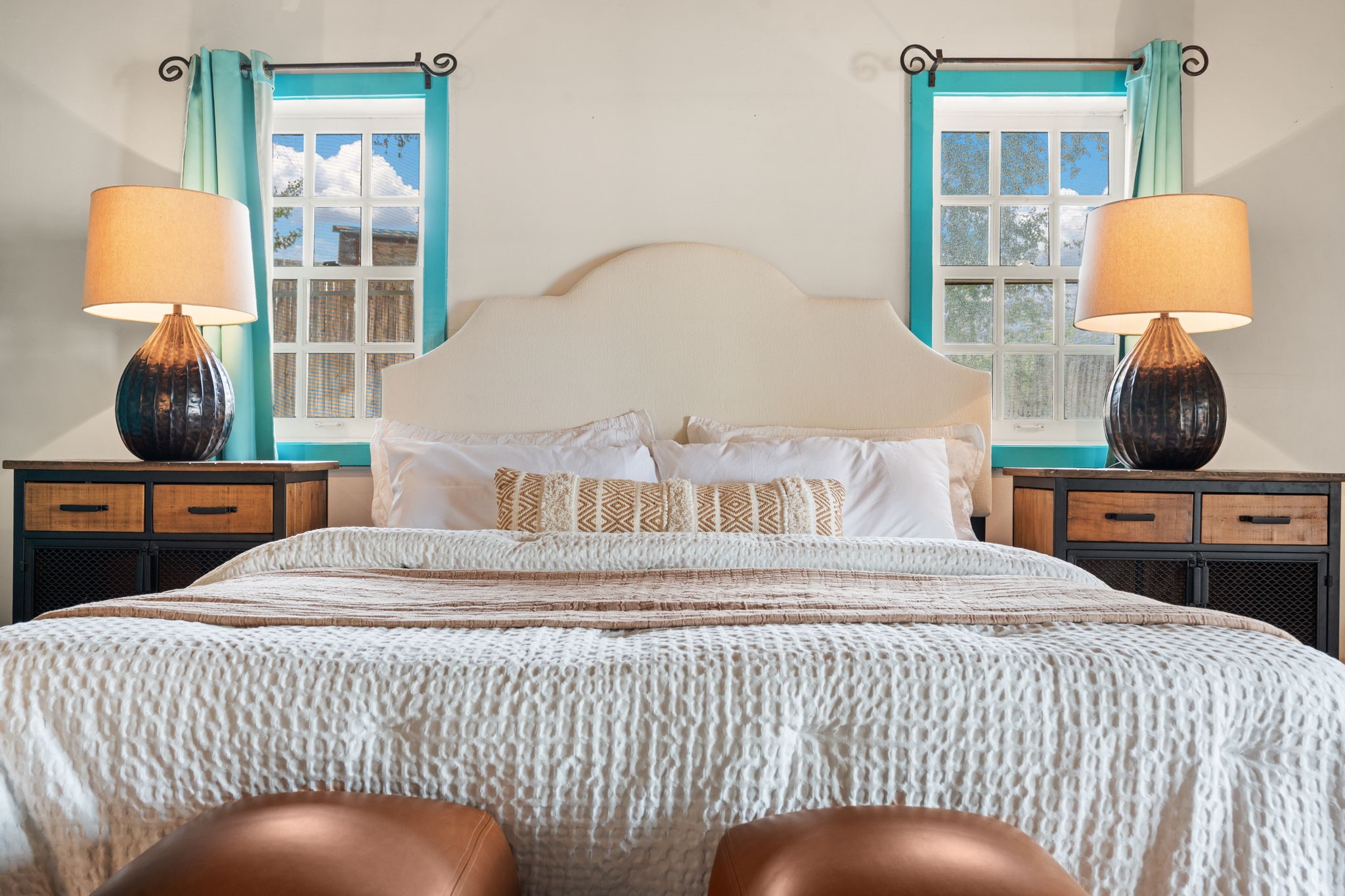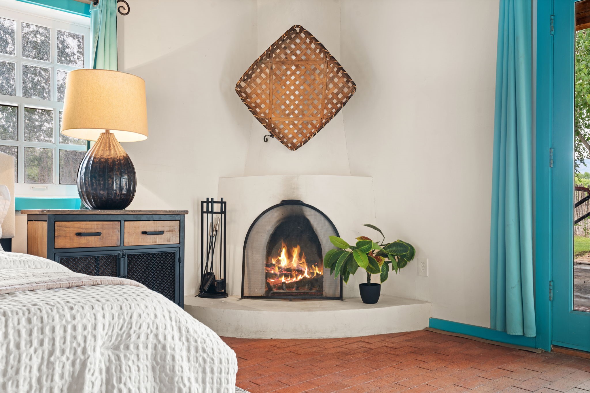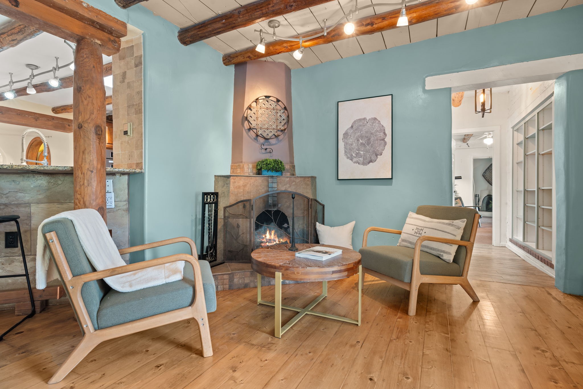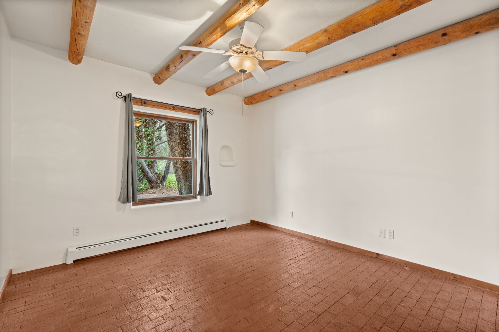 Enveloped by trees in a private 2 acre setting is this unique Corrales adobe style home. Over 3600 sf of living, featuring courtyard entry, living room with kiva fireplace, spacious kitchen with bar, granite and plenty of counter space. Informal and formal dining, a separate primary suite w/ large walk in closet, garden bath, and lounging room that access the east portal. Beams, brick, wood floors, doors, create the flavor of timeless living. A separate wing features 3 generous bedrooms plus an office as well as a full bath and a storage room. Separate wing was added after 1981, as well as many updates in the last years. The acreage is fabulous, perfect for the equestrian or farmer. Convenient location for shopping, riding, biking, trails, local restaurants and pubs.