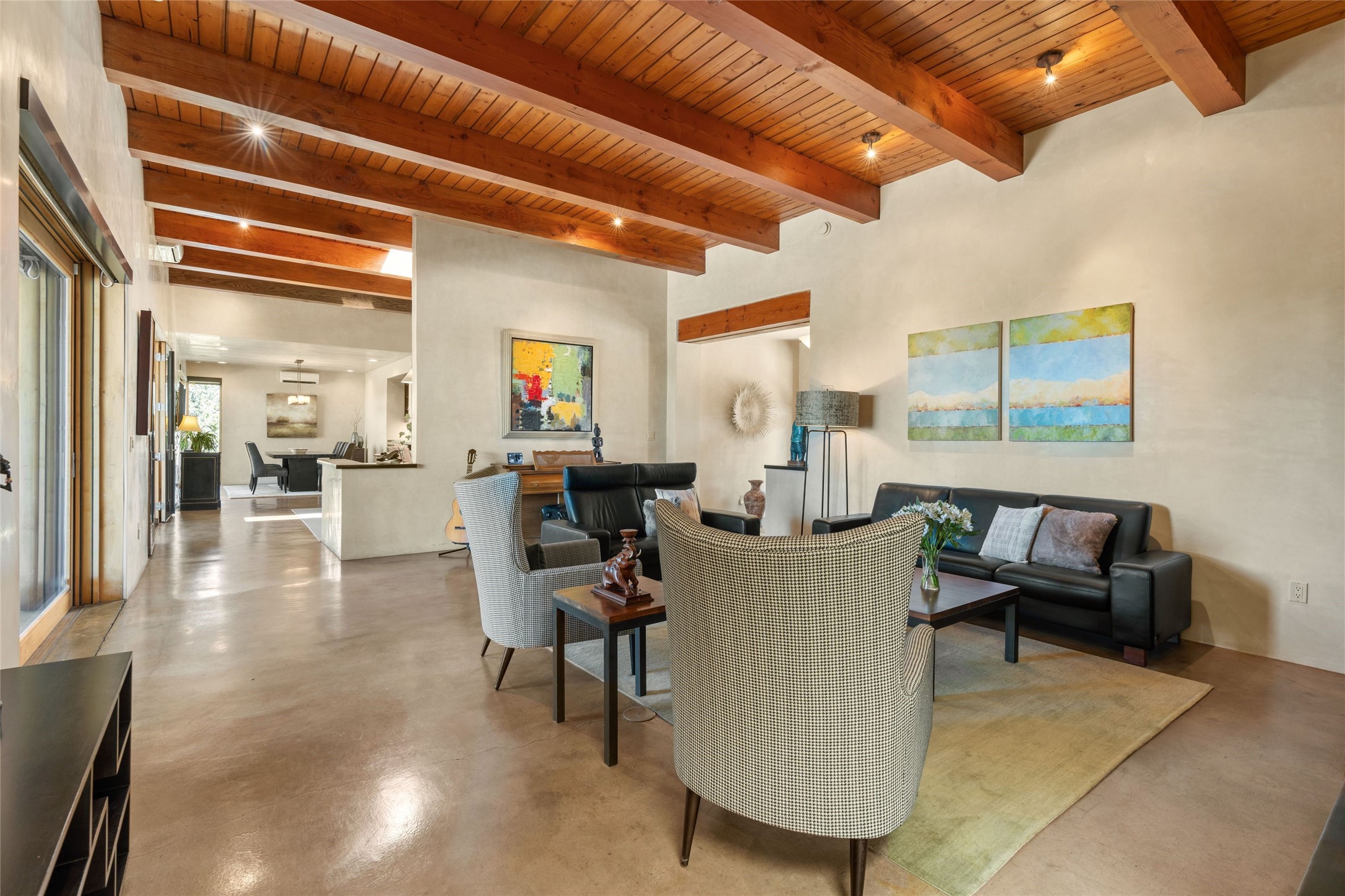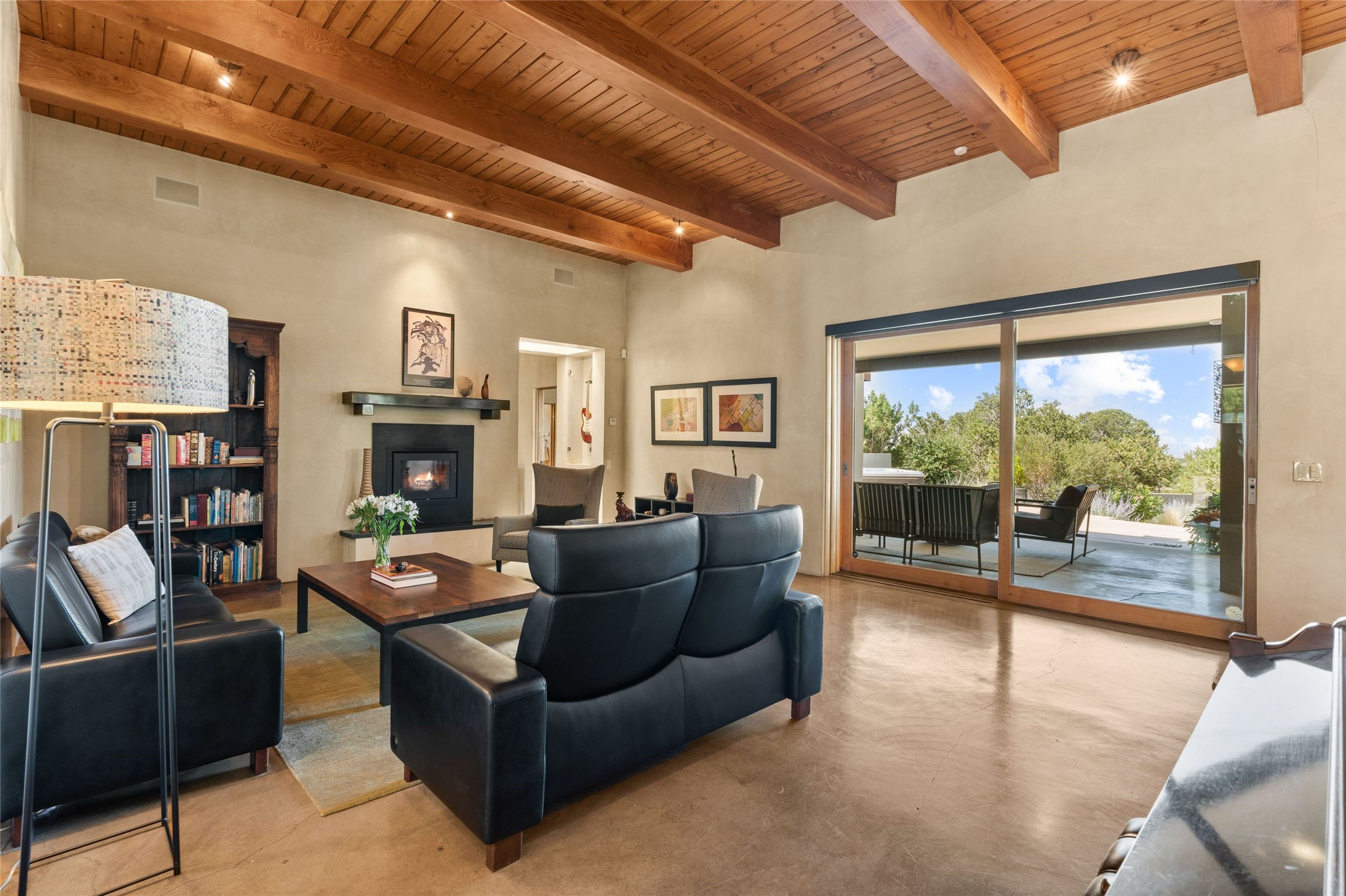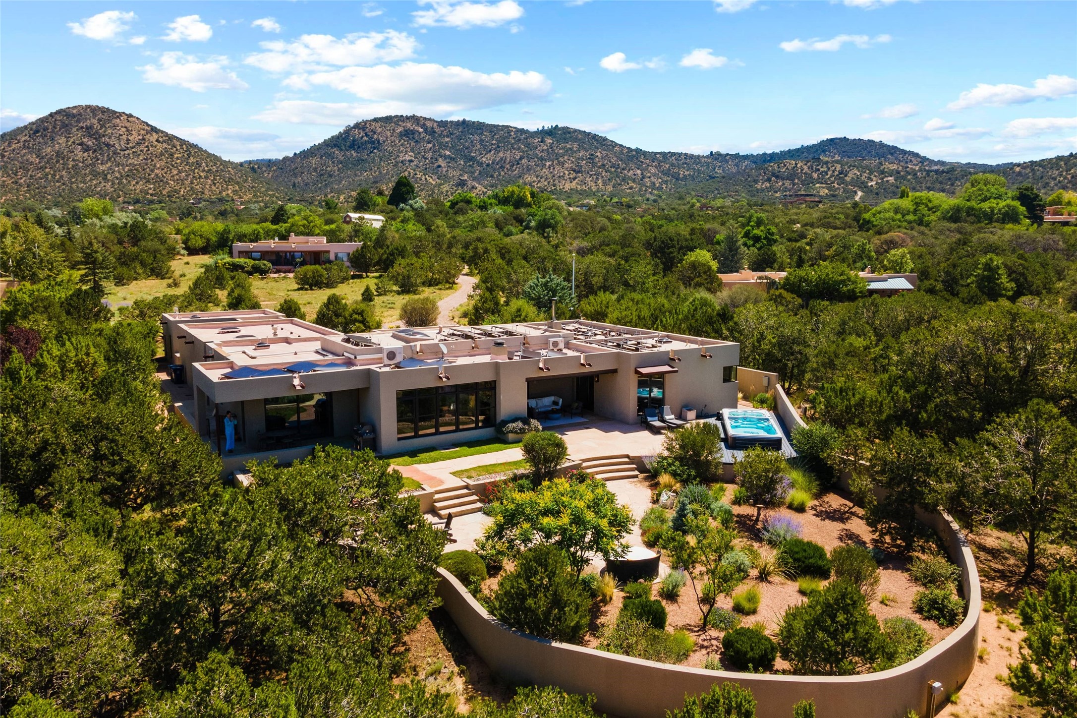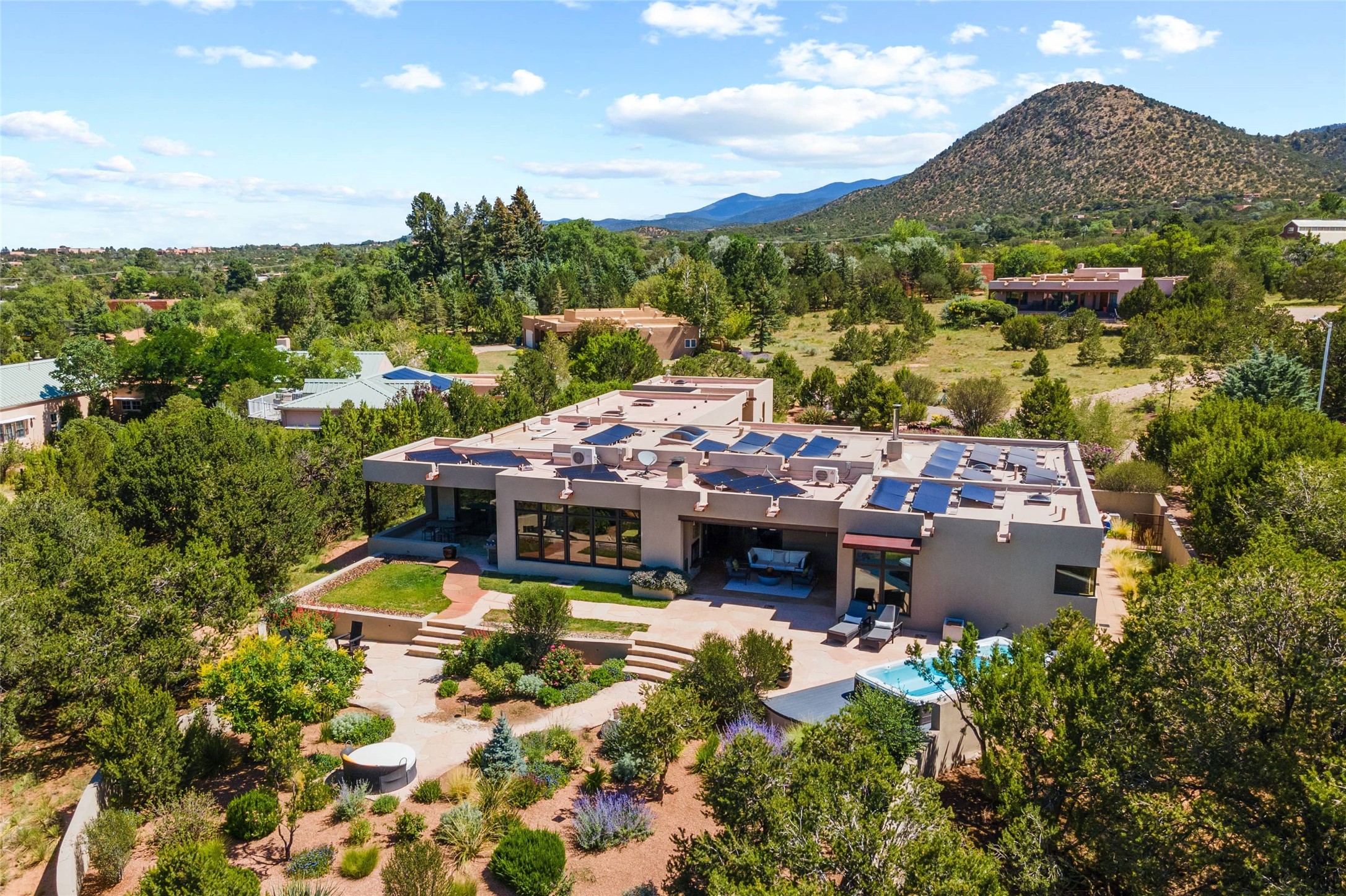 Rooted in natural materials and sustainable design, this serene Santa Fe residence offers a rare combination of tranquility, flexibility, and energy efficiency. Built using ICF (Insulated Concrete Forms) construction, the home maintains comfortable indoor temperatures year-round with radiant in-floor heating, mini-split systems, and solar power that keeps electric bills around $12 per month. Concrete floors add an earthy elegance throughout the main home, complemented by cork overlays in key living areas for warmth and comfort.The layout supports both daily ease and extended hosting, with multiple indoor living spaces, a dedicated office/utility room, and a bonus den ideal for hobbies or guest overflow. The separate casita provides a private retreat for visitors or live-in support, with its own kitchenette, spacious bathroom, and independent heating.Step outside to enjoy multiple landscaped patios that invite quiet mornings or lively evenings, enhanced by a gas fire pit, a swim spa and hot tub -- perfect for stargazing or unwinding after a day on the trails. From the main portal, take in inspiring views of Sun and Moon Mountain to the southeast and the distant Jemez range to the west, offering a shifting backdrop of natural beauty in every season.Located on a peaceful .82-acre lot, this home is just minutes from Santa Fe's Plaza, Museum Hill, the city's top medical centers, grocery stores, and shopping. Whether you're seeking a restful base for exploring town, a retreat for entertaining, or a long-term residence focused on well-being and sustainability, this property balances privacy and convenience in one thoughtfully designed package.