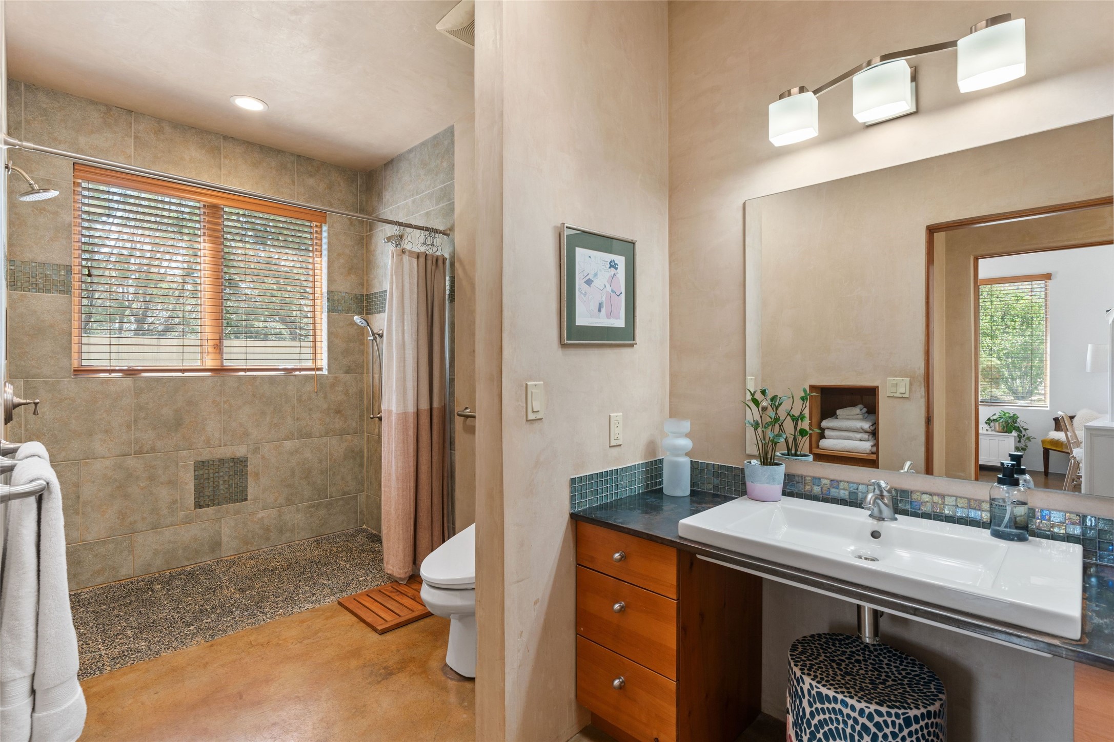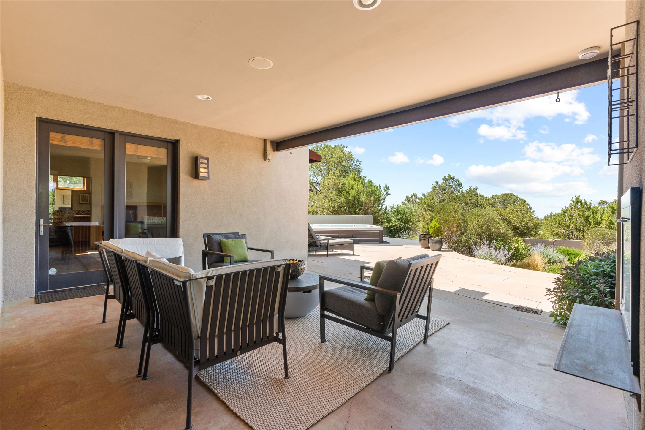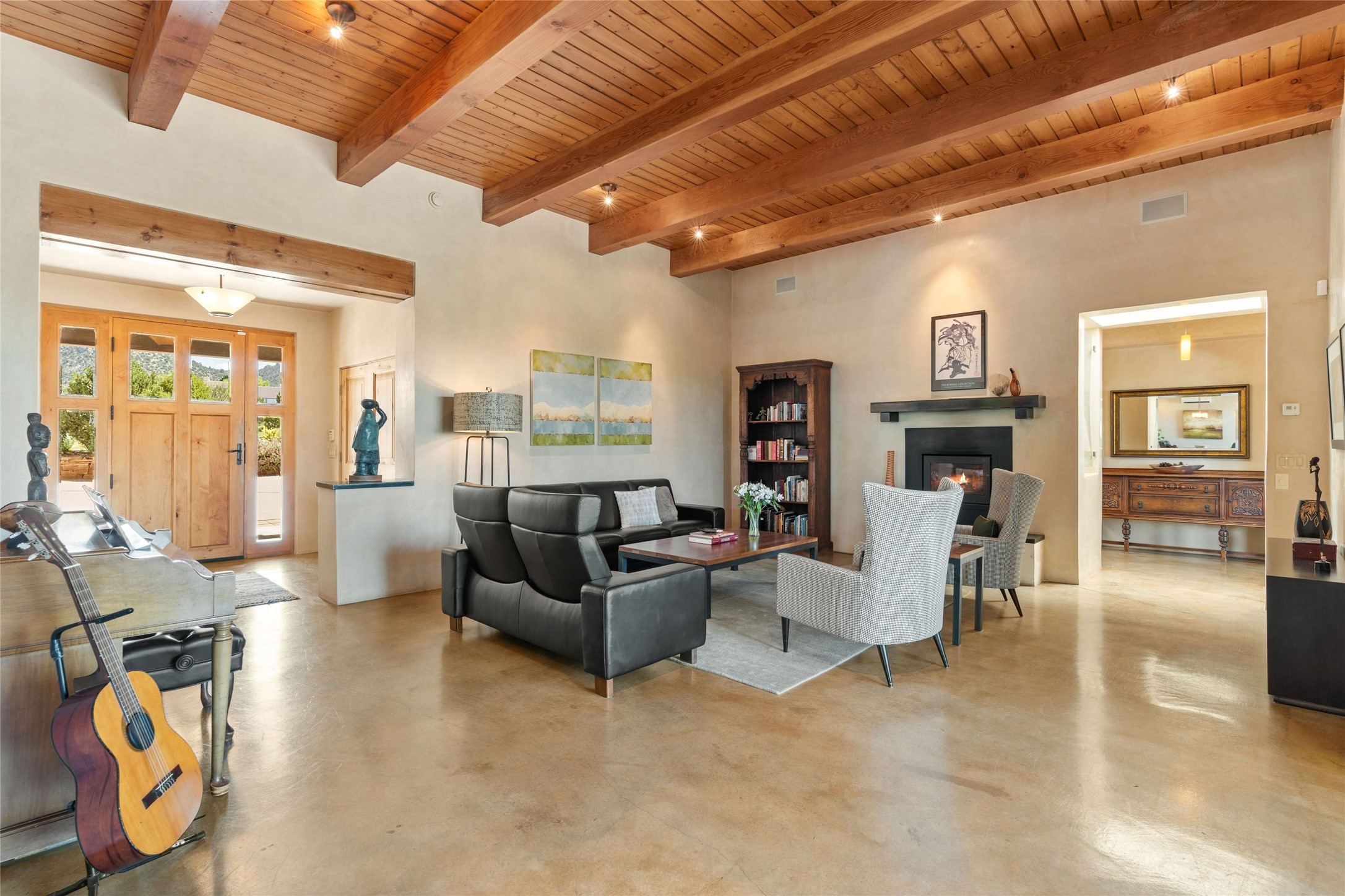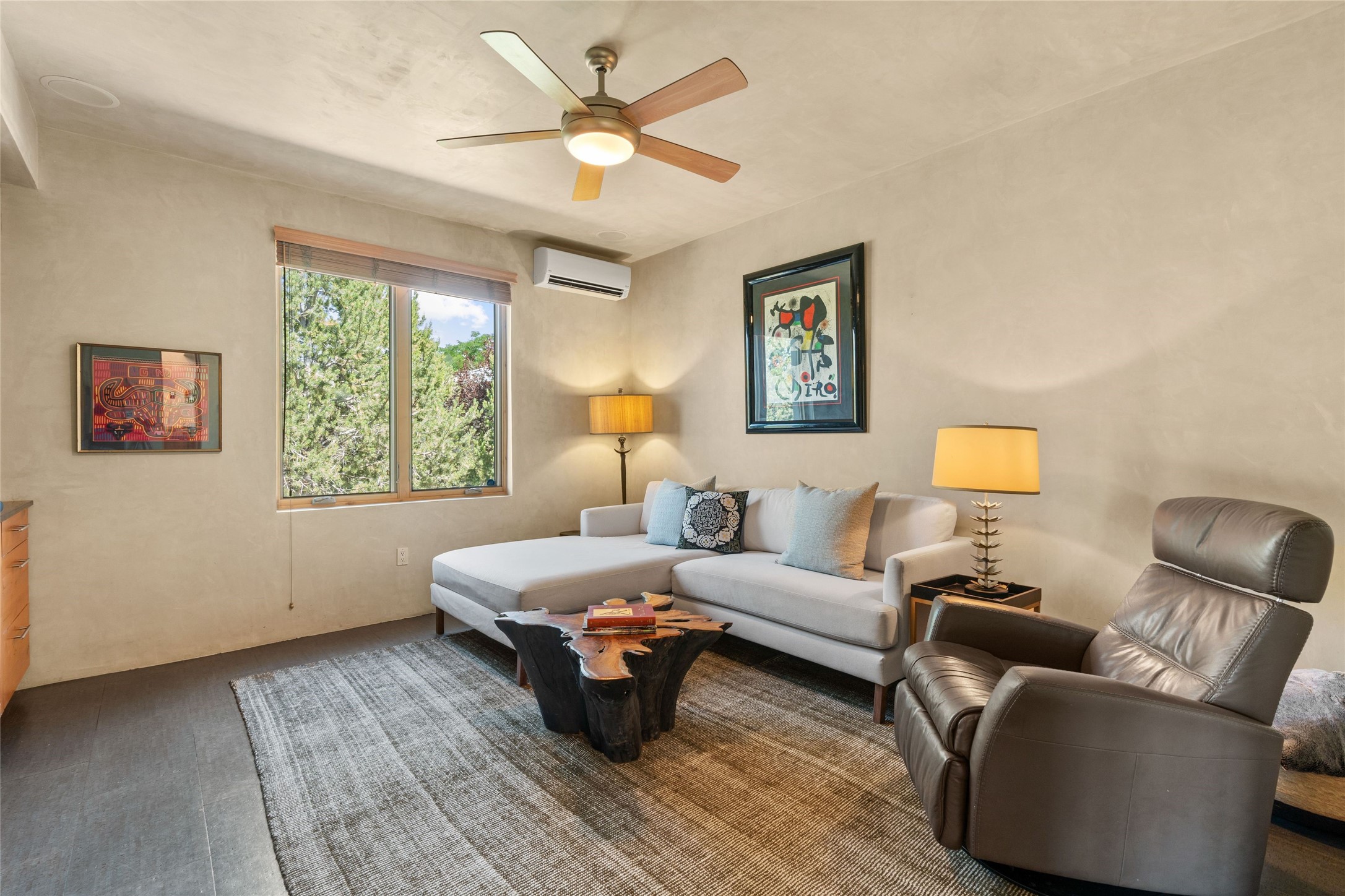 Rooted in natural materials and sustainable design, this serene Santa Fe residence offers a rare combination of tranquility, flexibility, and energy efficiency. Built using ICF (Insulated Concrete Forms) construction, the home maintains comfortable indoor temperatures year-round with radiant in-floor heating, mini-split systems, and solar power that keeps electric bills around $12 per month. Concrete floors add an earthy elegance throughout the main home, complemented by cork overlays in key living areas for warmth and comfort.The layout supports both daily ease and extended hosting, with multiple indoor living spaces, a dedicated office/utility room, and a bonus den ideal for hobbies or guest overflow. The separate casita provides a private retreat for visitors or live-in support, with its own kitchenette, spacious bathroom, and independent heating.Step outside to enjoy multiple landscaped patios that invite quiet mornings or lively evenings, enhanced by a gas fire pit, a swim spa and hot tub -- perfect for stargazing or unwinding after a day on the trails. From the main portal, take in inspiring views of Sun and Moon Mountain to the southeast and the distant Jemez range to the west, offering a shifting backdrop of natural beauty in every season.Located on a peaceful .82-acre lot, this home is just minutes from Santa Fe's Plaza, Museum Hill, the city's top medical centers, grocery stores, and shopping. Whether you're seeking a restful base for exploring town, a retreat for entertaining, or a long-term residence focused on well-being and sustainability, this property balances privacy and convenience in one thoughtfully designed package.