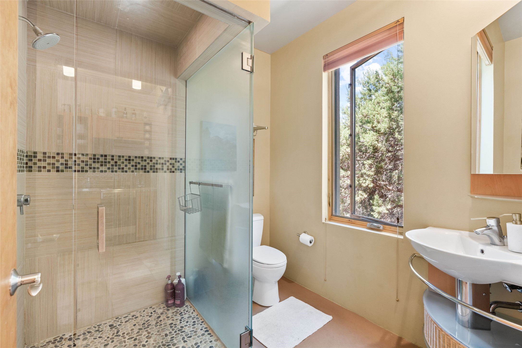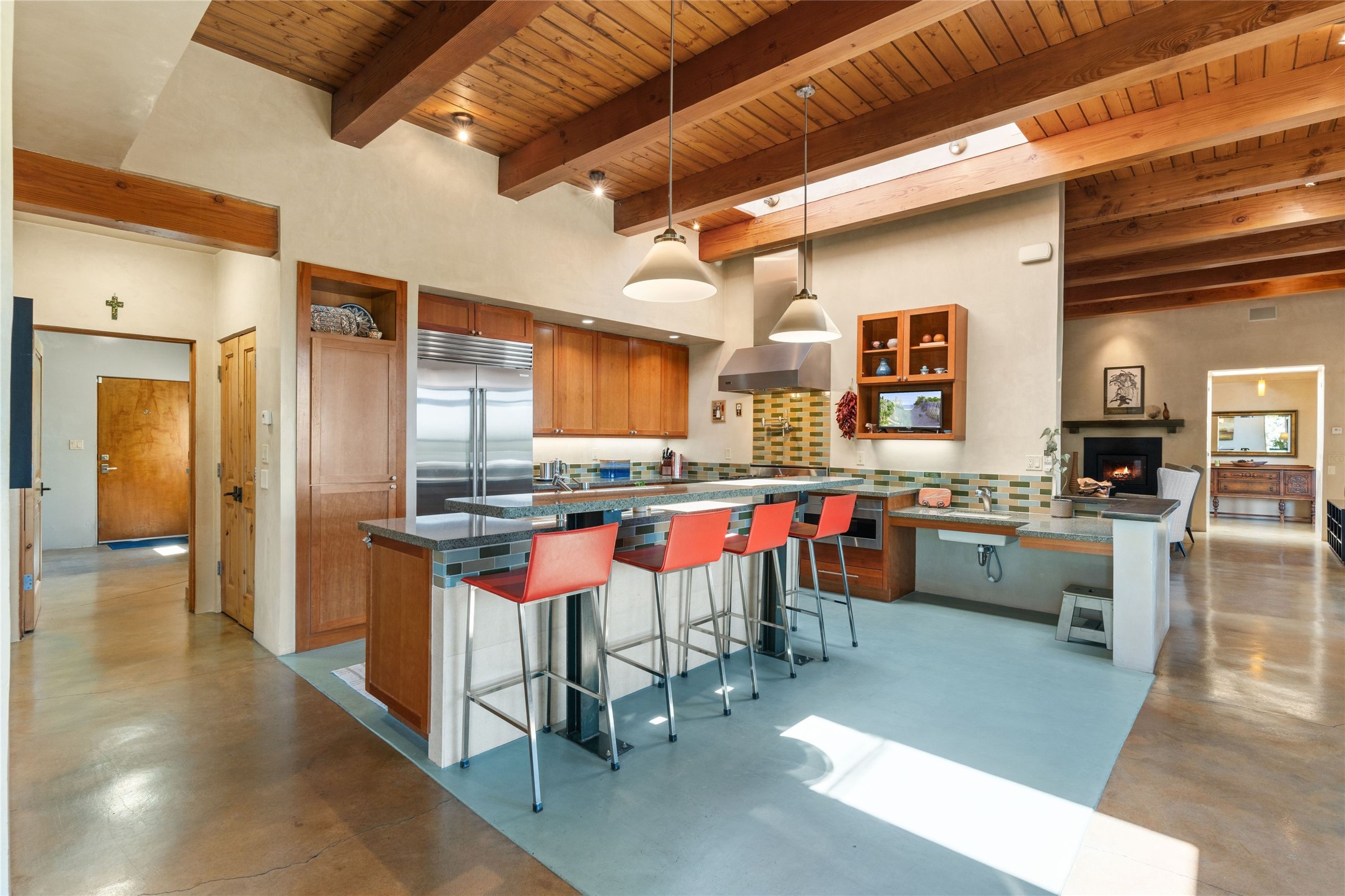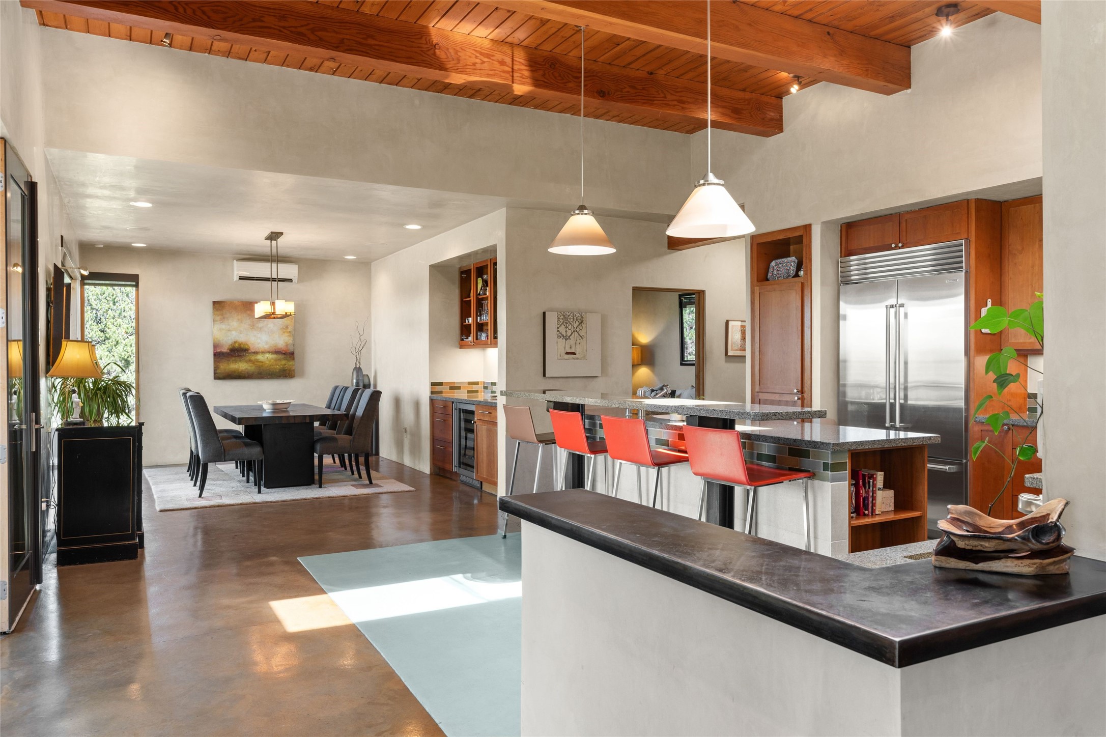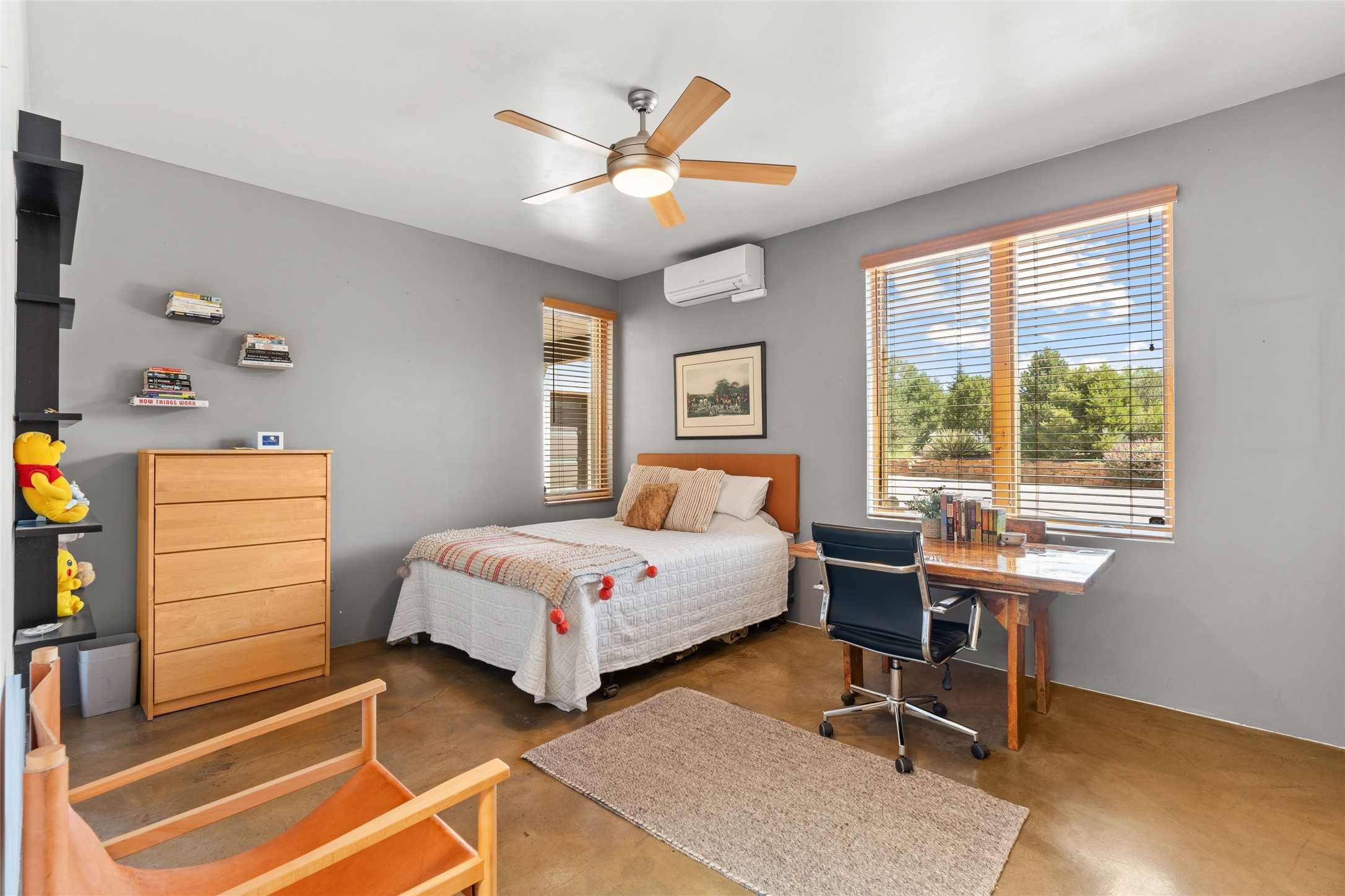 Rooted in natural materials and sustainable design, this serene Santa Fe residence offers a rare combination of tranquility, flexibility, and energy efficiency. Built using ICF (Insulated Concrete Forms) construction, the home maintains comfortable indoor temperatures year-round with radiant in-floor heating, mini-split systems, and solar power that keeps electric bills around $12 per month. Concrete floors add an earthy elegance throughout the main home, complemented by cork overlays in key living areas for warmth and comfort.The layout supports both daily ease and extended hosting, with multiple indoor living spaces, a dedicated office/utility room, and a bonus den ideal for hobbies or guest overflow. The separate casita provides a private retreat for visitors or live-in support, with its own kitchenette, spacious bathroom, and independent heating.Step outside to enjoy multiple landscaped patios that invite quiet mornings or lively evenings, enhanced by a gas fire pit, a swim spa and hot tub -- perfect for stargazing or unwinding after a day on the trails. From the main portal, take in inspiring views of Sun and Moon Mountain to the southeast and the distant Jemez range to the west, offering a shifting backdrop of natural beauty in every season.Located on a peaceful .82-acre lot, this home is just minutes from Santa Fe's Plaza, Museum Hill, the city's top medical centers, grocery stores, and shopping. Whether you're seeking a restful base for exploring town, a retreat for entertaining, or a long-term residence focused on well-being and sustainability, this property balances privacy and convenience in one thoughtfully designed package.