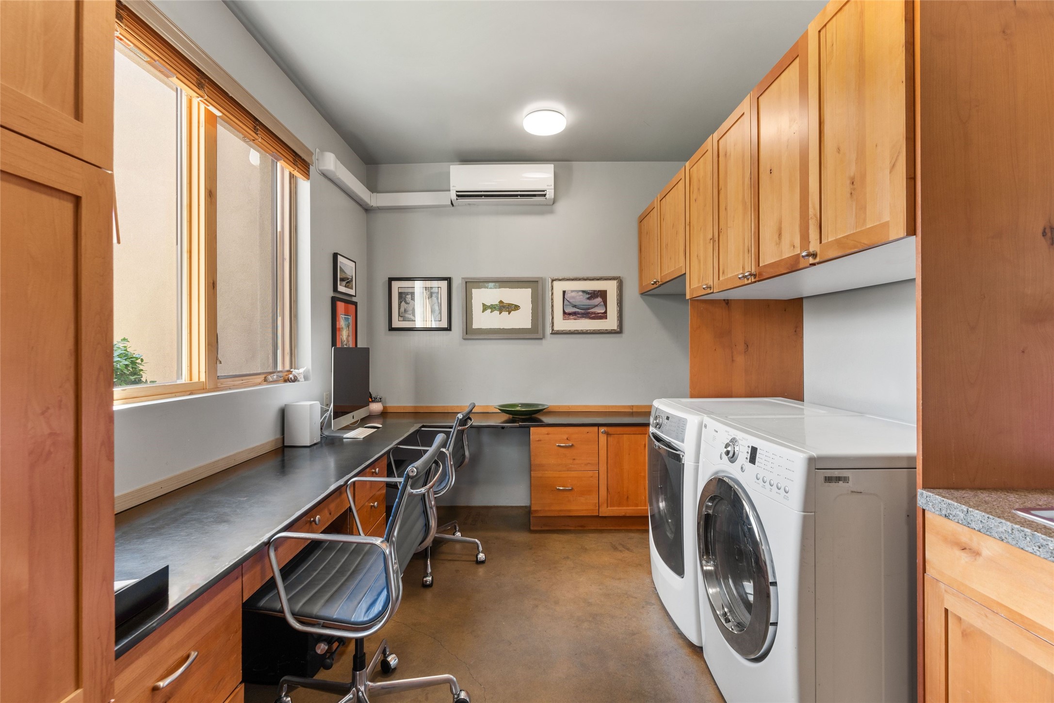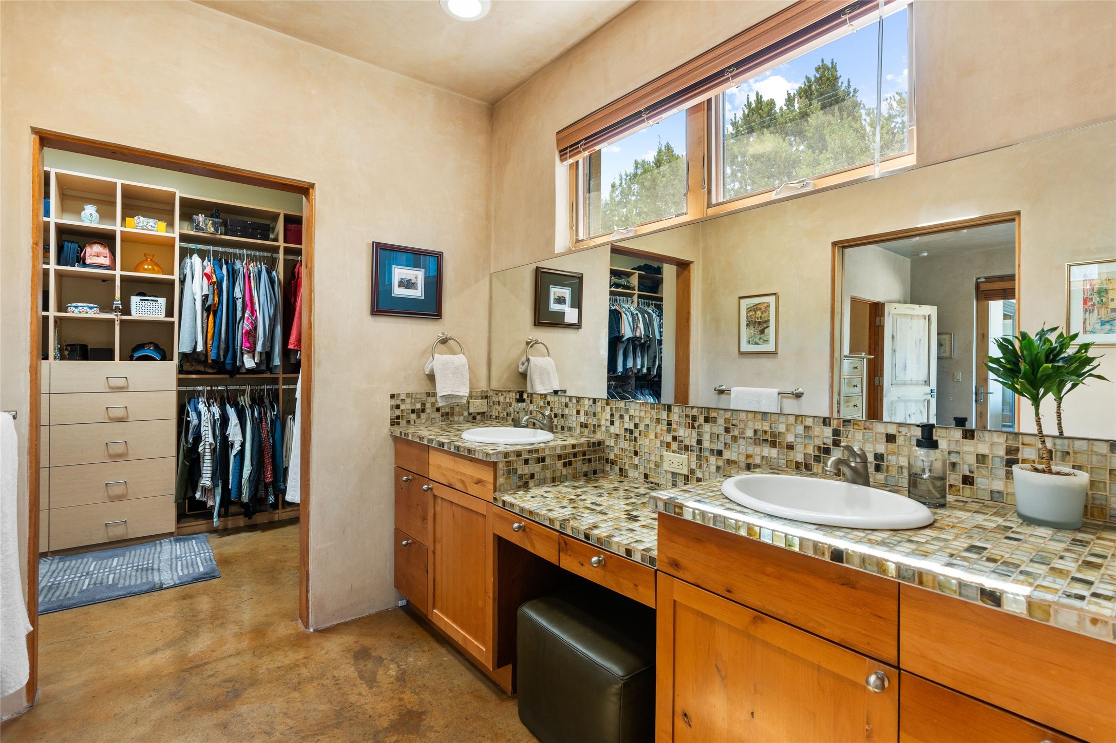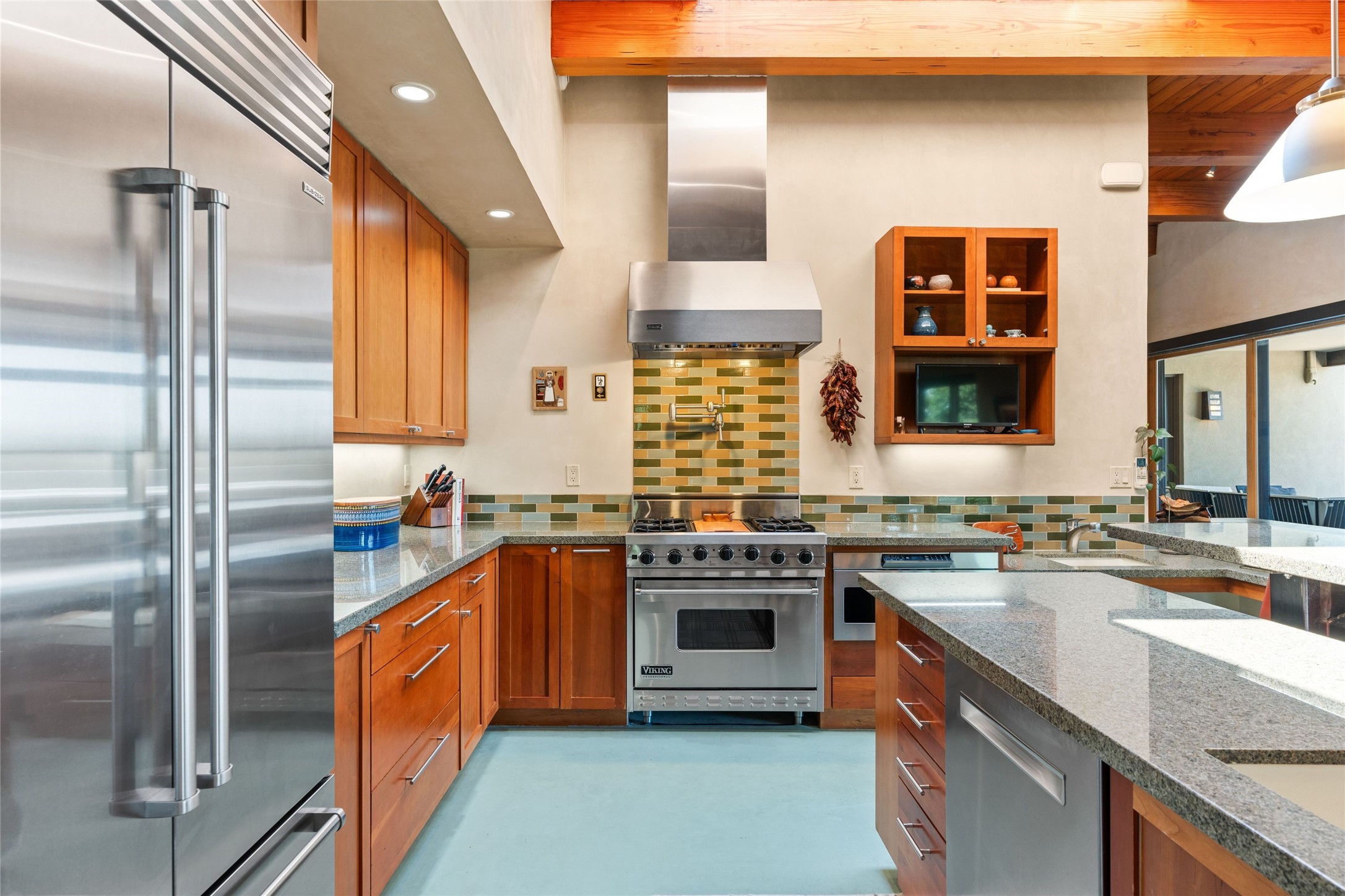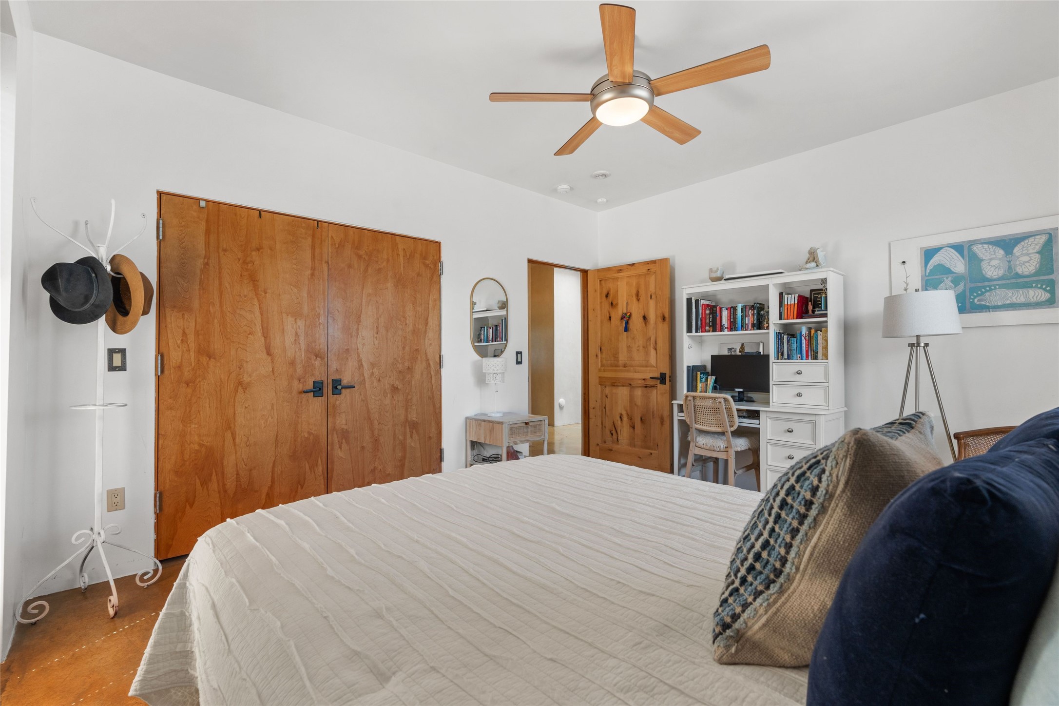 Rooted in natural materials and sustainable design, this serene Santa Fe residence offers a rare combination of tranquility, flexibility, and energy efficiency. Built using ICF (Insulated Concrete Forms) construction, the home maintains comfortable indoor temperatures year-round with radiant in-floor heating, mini-split systems, and solar power that keeps electric bills around $12 per month. Concrete floors add an earthy elegance throughout the main home, complemented by cork overlays in key living areas for warmth and comfort.The layout supports both daily ease and extended hosting, with multiple indoor living spaces, a dedicated office/utility room, and a bonus den ideal for hobbies or guest overflow. The separate casita provides a private retreat for visitors or live-in support, with its own kitchenette, spacious bathroom, and independent heating.Step outside to enjoy multiple landscaped patios that invite quiet mornings or lively evenings, enhanced by a gas fire pit, a swim spa and hot tub -- perfect for stargazing or unwinding after a day on the trails. From the main portal, take in inspiring views of Sun and Moon Mountain to the southeast and the distant Jemez range to the west, offering a shifting backdrop of natural beauty in every season.Located on a peaceful .82-acre lot, this home is just minutes from Santa Fe's Plaza, Museum Hill, the city's top medical centers, grocery stores, and shopping. Whether you're seeking a restful base for exploring town, a retreat for entertaining, or a long-term residence focused on well-being and sustainability, this property balances privacy and convenience in one thoughtfully designed package.