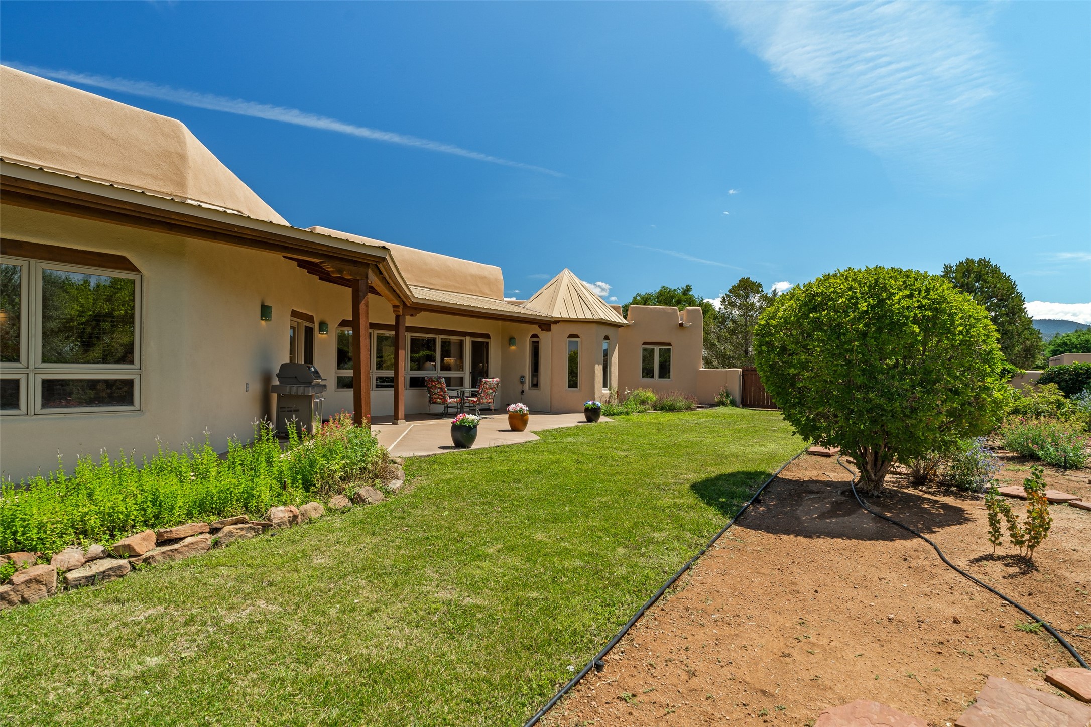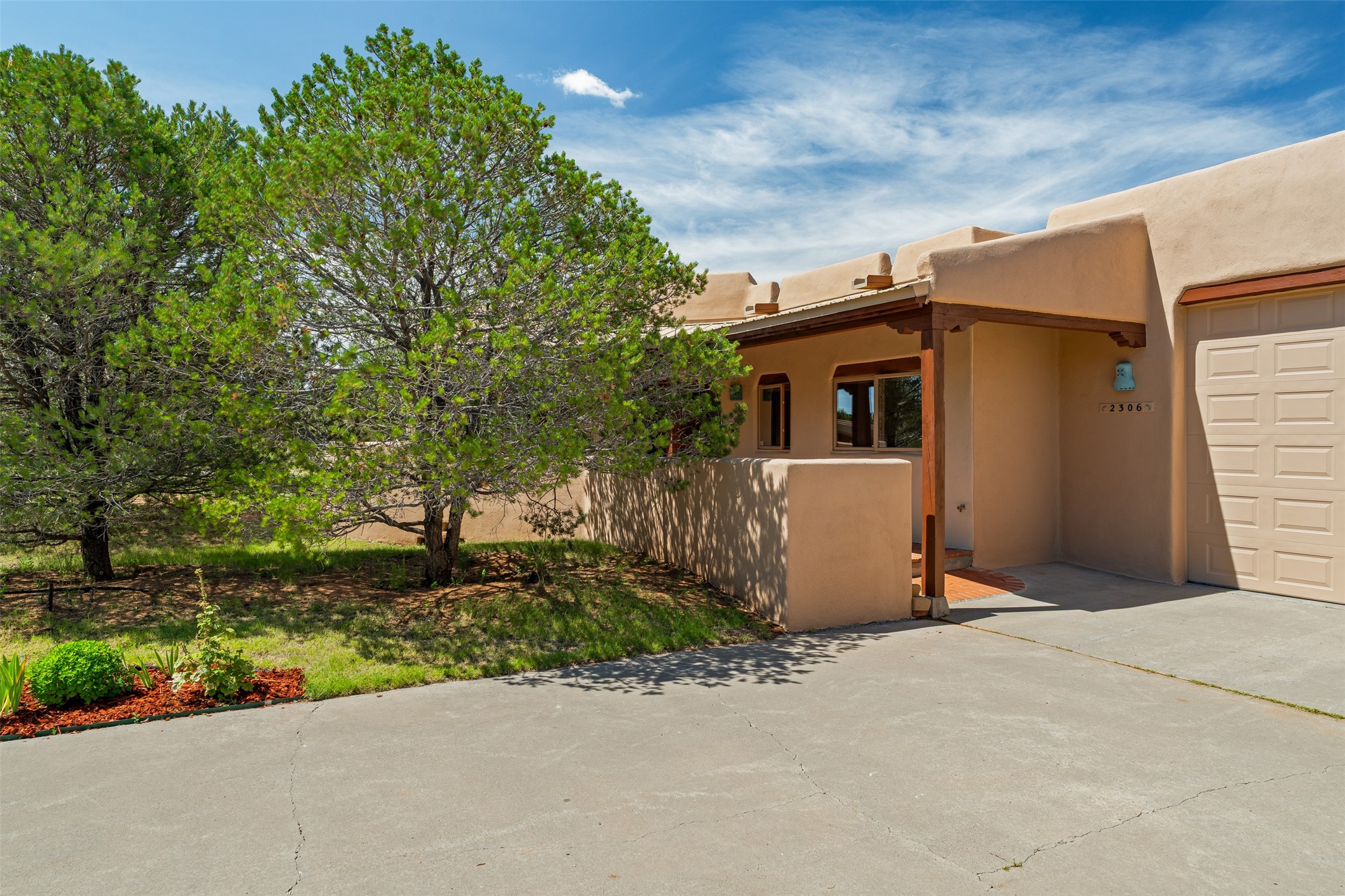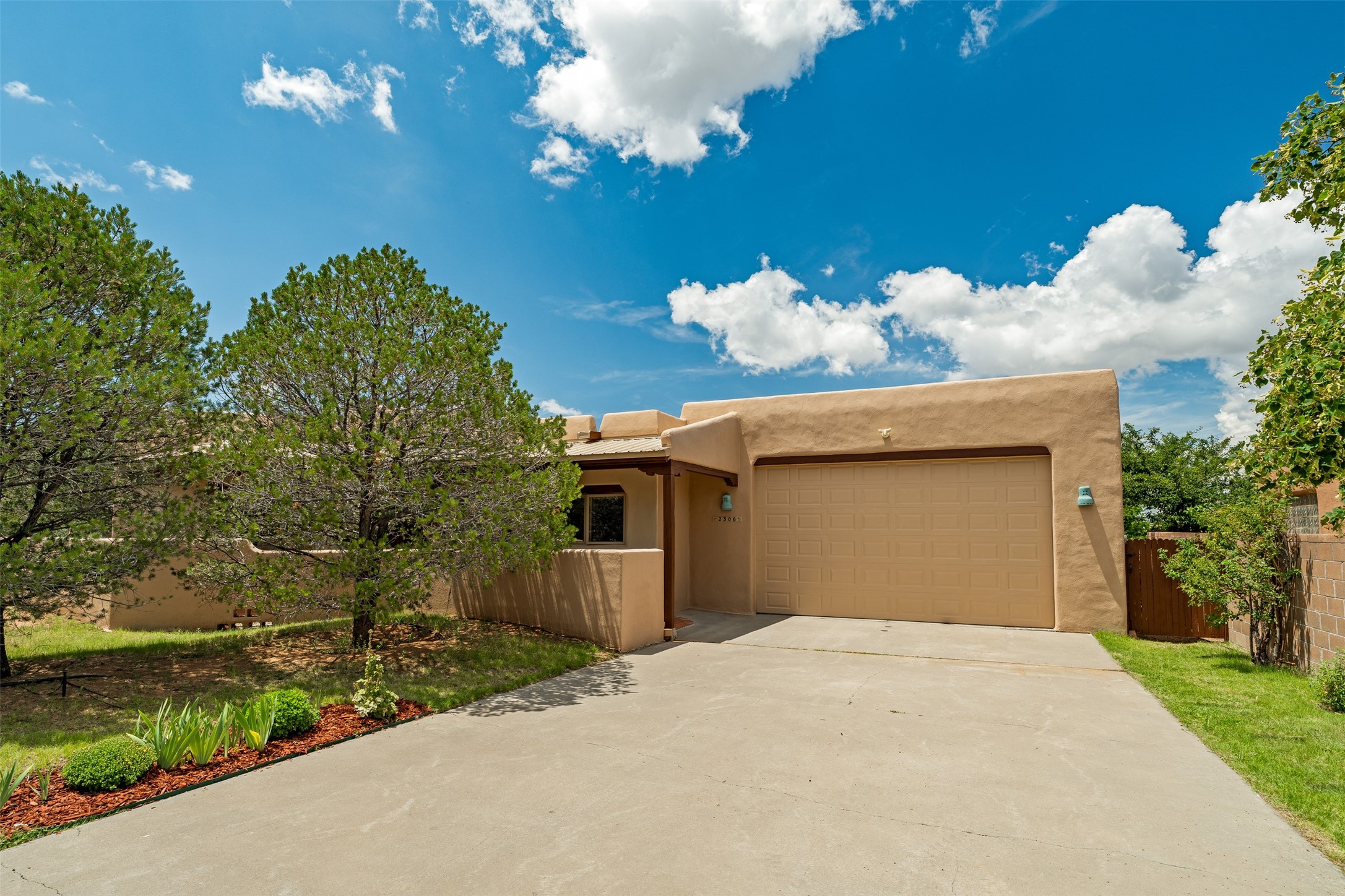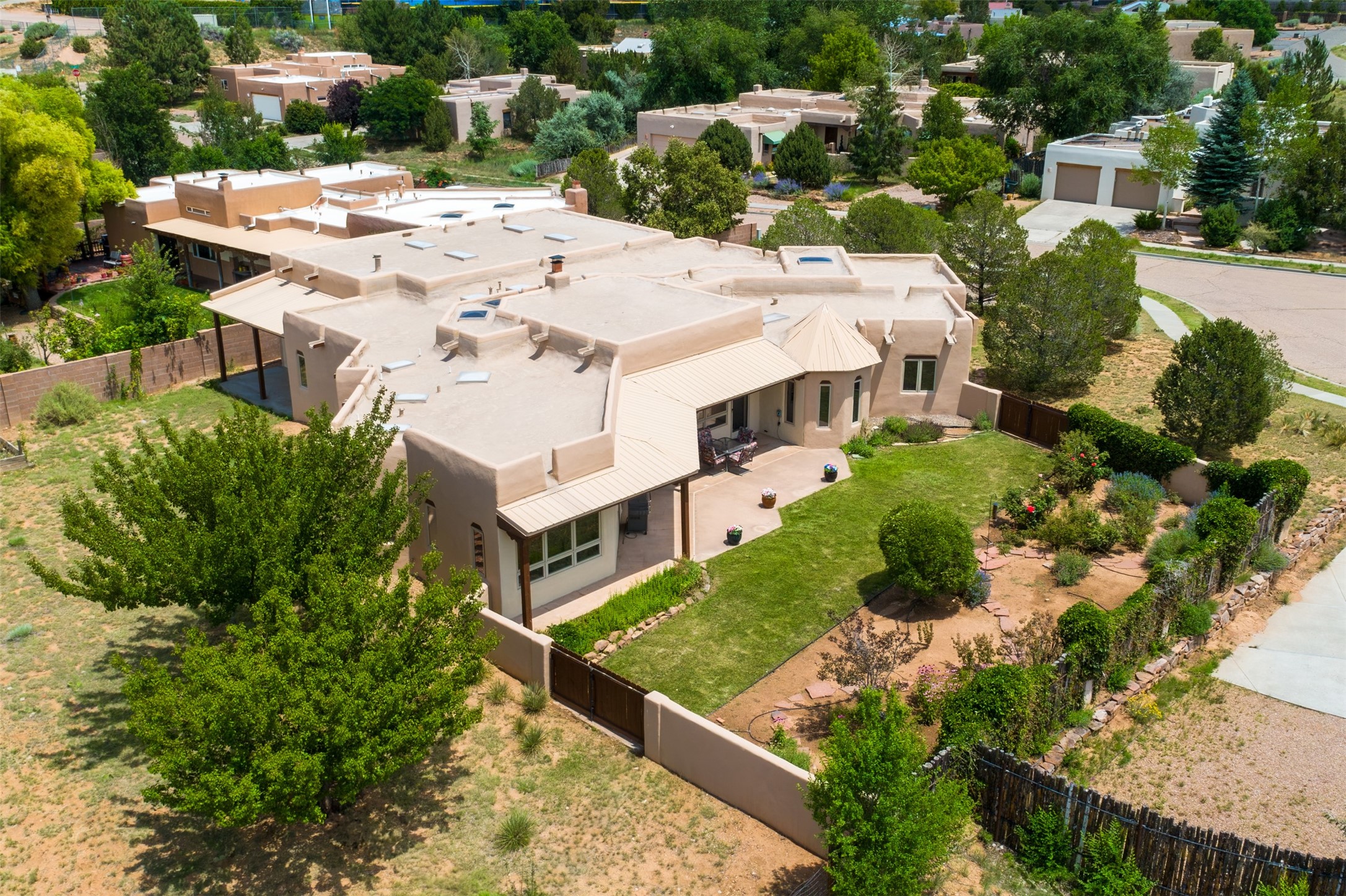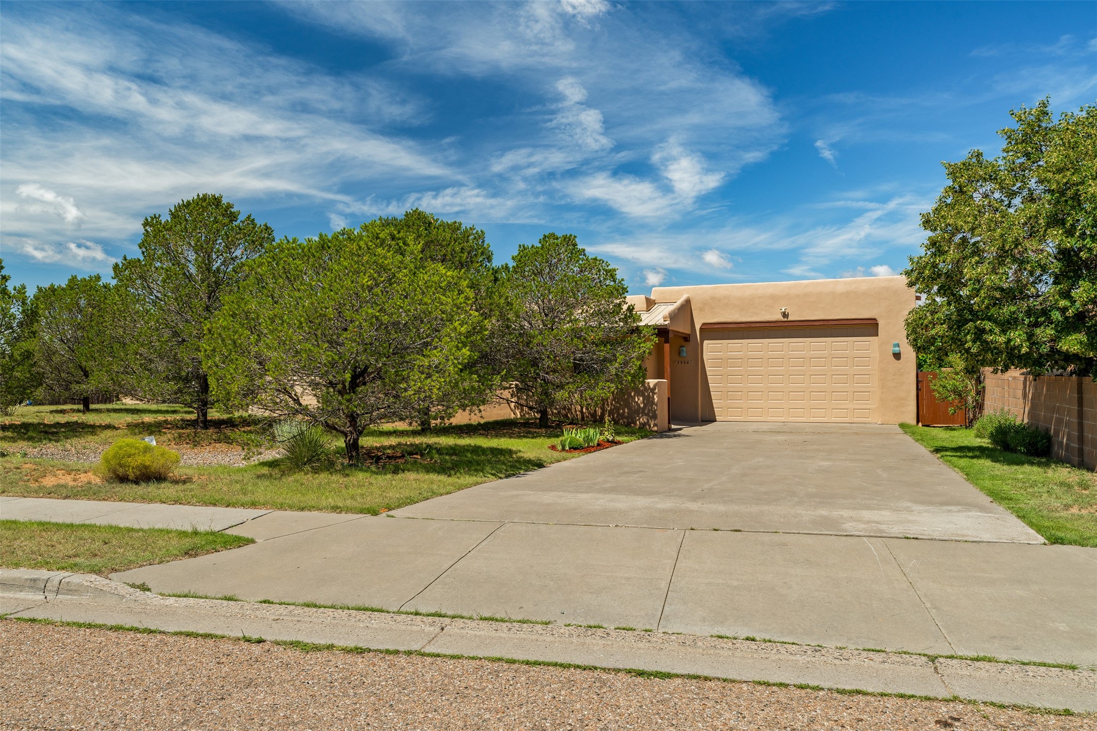 This one owner well maintained home is nestled on a quiet cul de sac street in an established neighborhood and offers an oasis of tranquility. It offers unparalleled charm and every detail has been thoughtfully crafted for luxurious living. From the moment you step into the spacious entry, you'll be captivated by the high ceilings throughout and the unique architectural elements. Enjoy the timeless Santa Fe charm vigas bring and especially when they are topped with split cedar as the grand hallway has been. Gather around the beautifully designed wood fireplace in the cozy living room, or enjoy morning coffee in the circular breakfast area with its enchanting wood-coned ceiling. The heart of the home, an updated kitchen with an island flows seamlessly into a formal dining area, perfect for entertaining. Retreat to the roomy primary bedroom or one of two spacious secondary bedrooms, each boasting an en-suite bathroom and generous closets. Outside, discover a private haven with established, irrigated front and back landscaping with a beautiful rose garden, and an enclosed backyard. Practical amenities such as an extra-long driveway, an oversized 1100 square foot 2-car garage with a 10-foot high double door. The garage is finished and has high ceilings and can accommodate many uses and greatly adds to the home's appeal. Bask in abundant natural light and enjoy the peace of mind that comes with living in an elegantly crafted home.