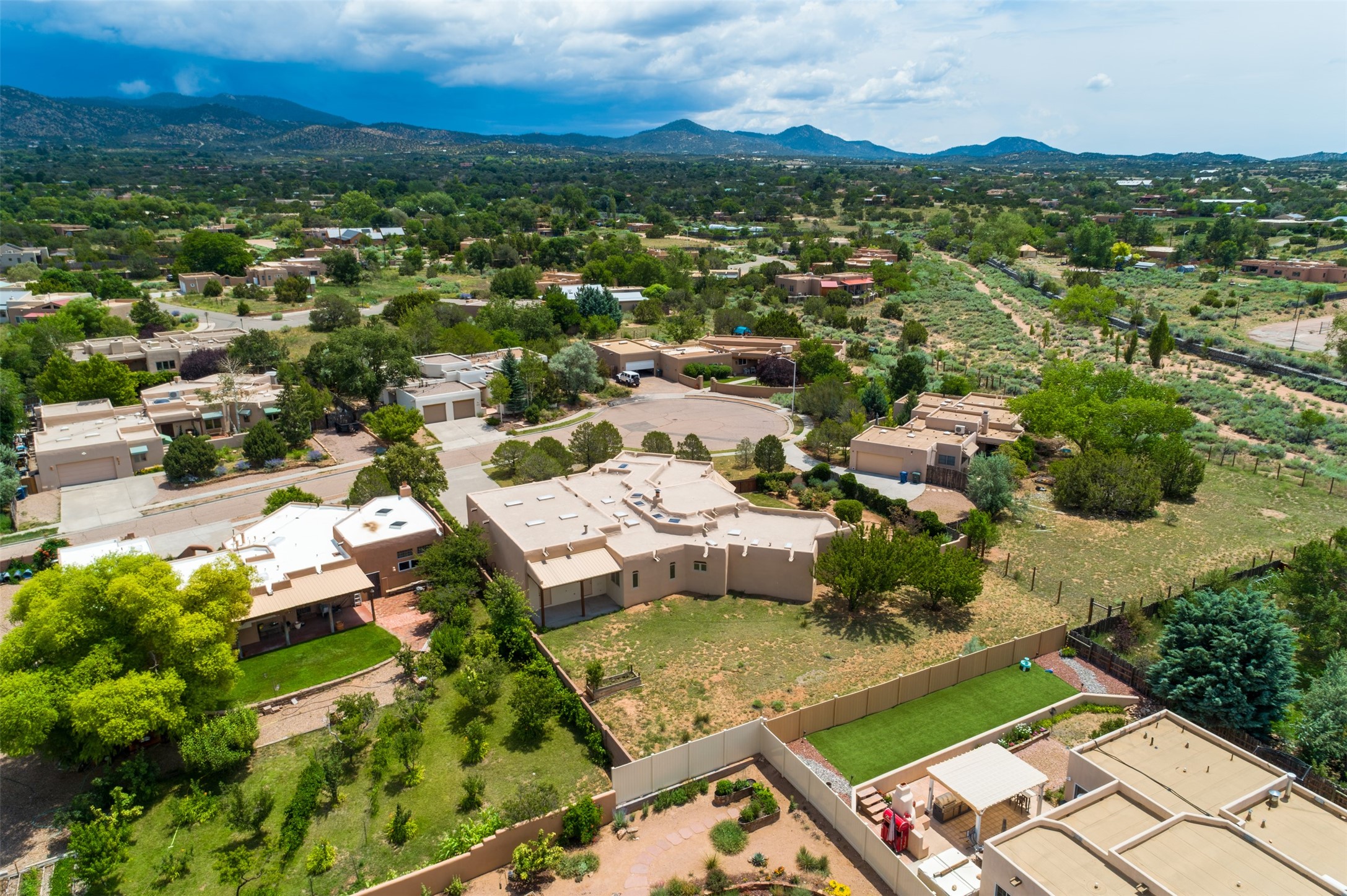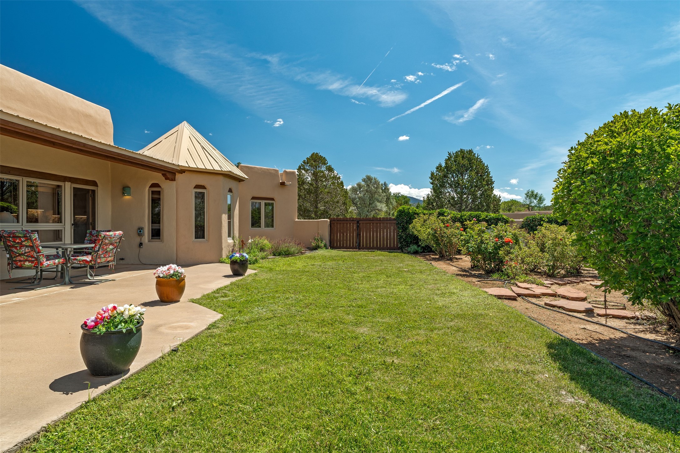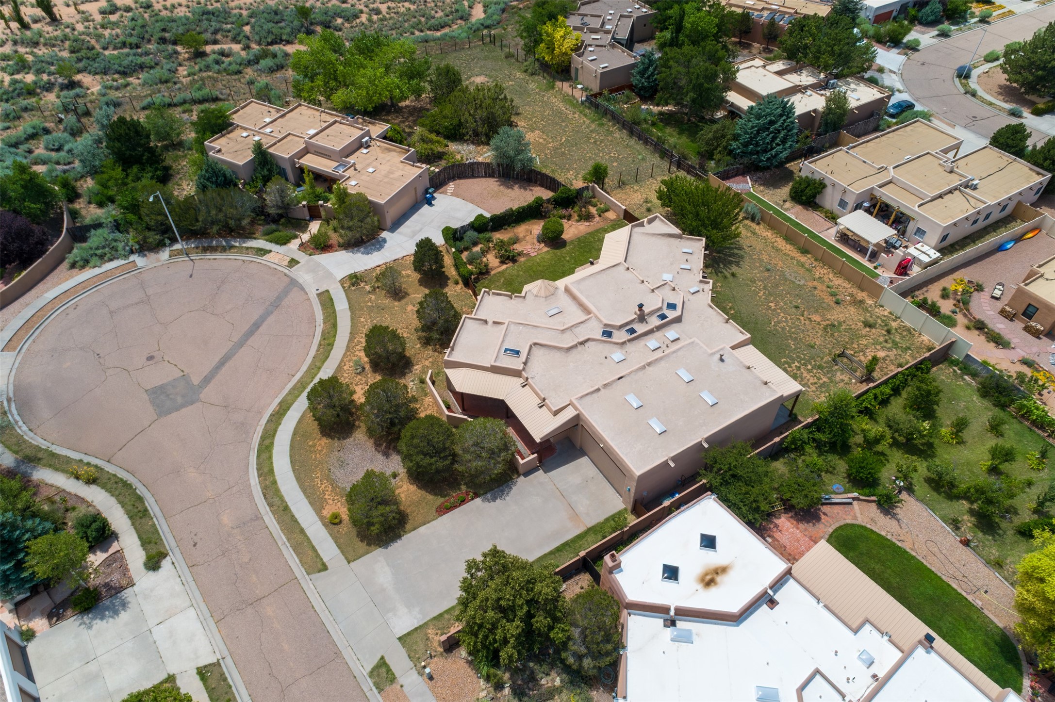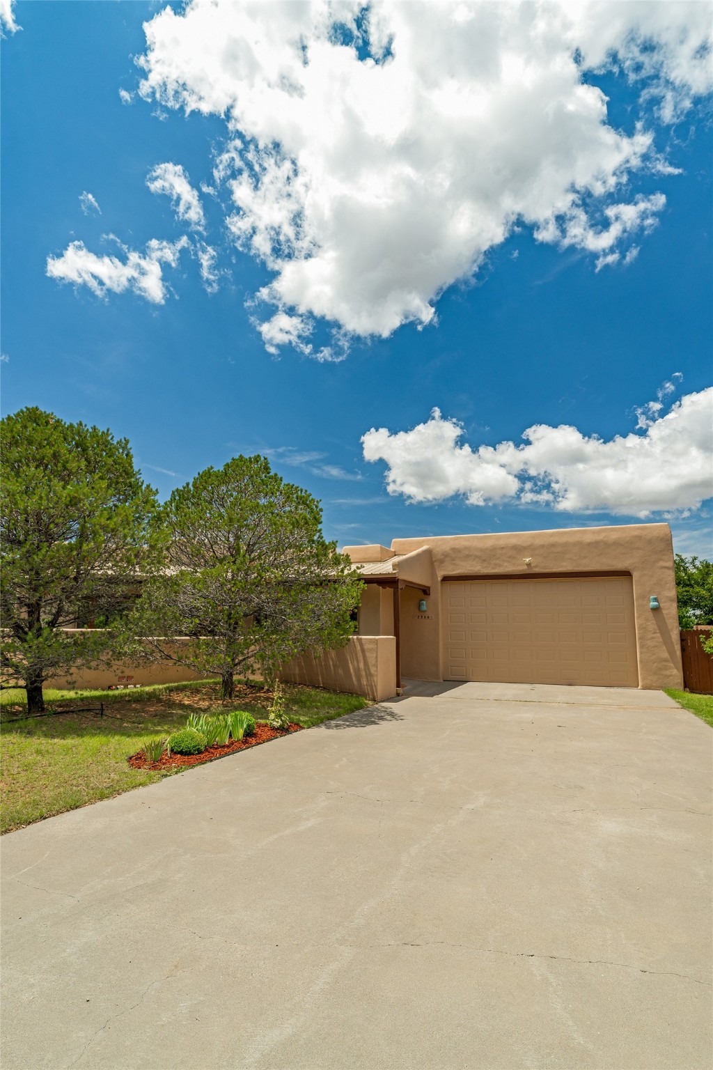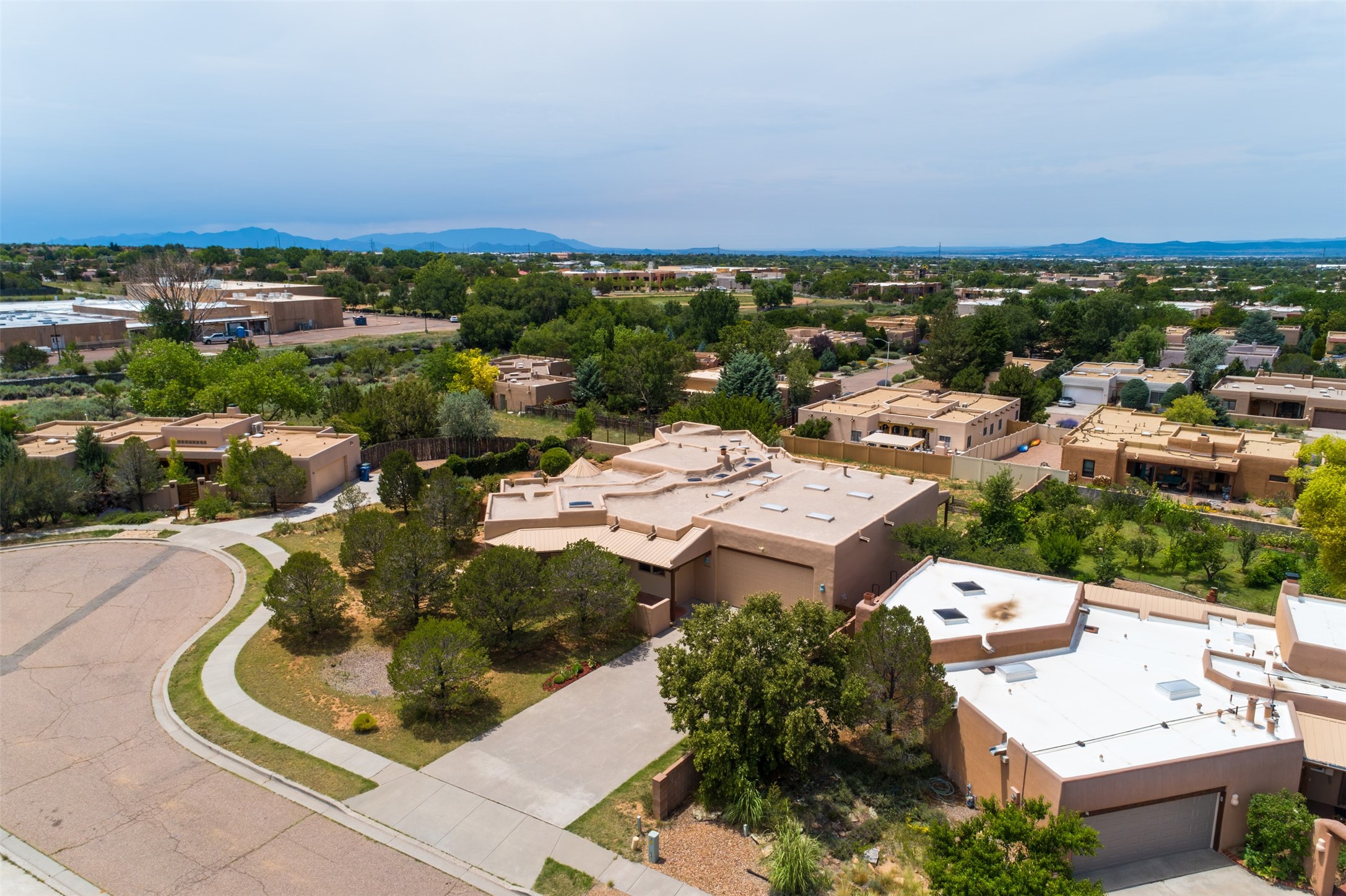 This one owner well maintained home is nestled on a quiet cul de sac street in an established neighborhood and offers an oasis of tranquility. It offers unparalleled charm and every detail has been thoughtfully crafted for luxurious living. From the moment you step into the spacious entry, you'll be captivated by the high ceilings throughout and the unique architectural elements. Enjoy the timeless Santa Fe charm vigas bring and especially when they are topped with split cedar as the grand hallway has been. Gather around the beautifully designed wood fireplace in the cozy living room, or enjoy morning coffee in the circular breakfast area with its enchanting wood-coned ceiling. The heart of the home, an updated kitchen with an island flows seamlessly into a formal dining area, perfect for entertaining. Retreat to the roomy primary bedroom or one of two spacious secondary bedrooms, each boasting an en-suite bathroom and generous closets. Outside, discover a private haven with established, irrigated front and back landscaping with a beautiful rose garden, and an enclosed backyard. Practical amenities such as an extra-long driveway, an oversized 1100 square foot 2-car garage with a 10-foot high double door. The garage is finished and has high ceilings and can accommodate many uses and greatly adds to the home's appeal. Bask in abundant natural light and enjoy the peace of mind that comes with living in an elegantly crafted home.