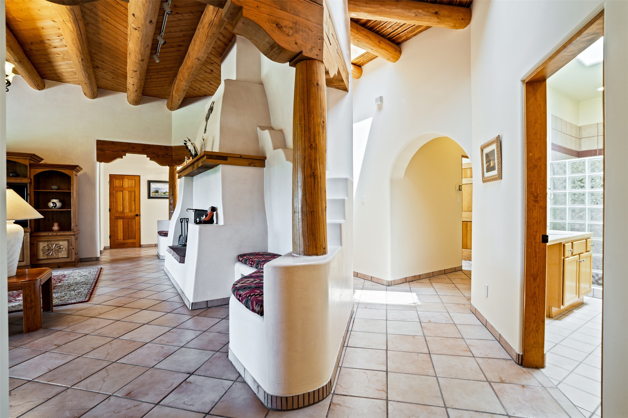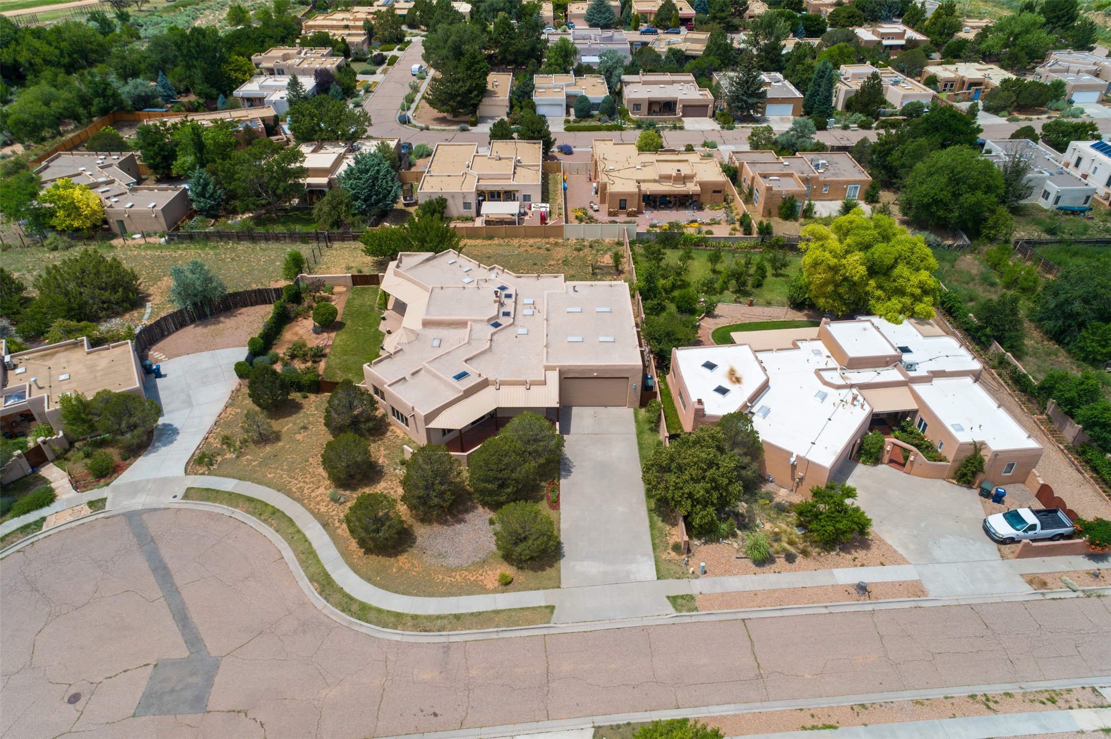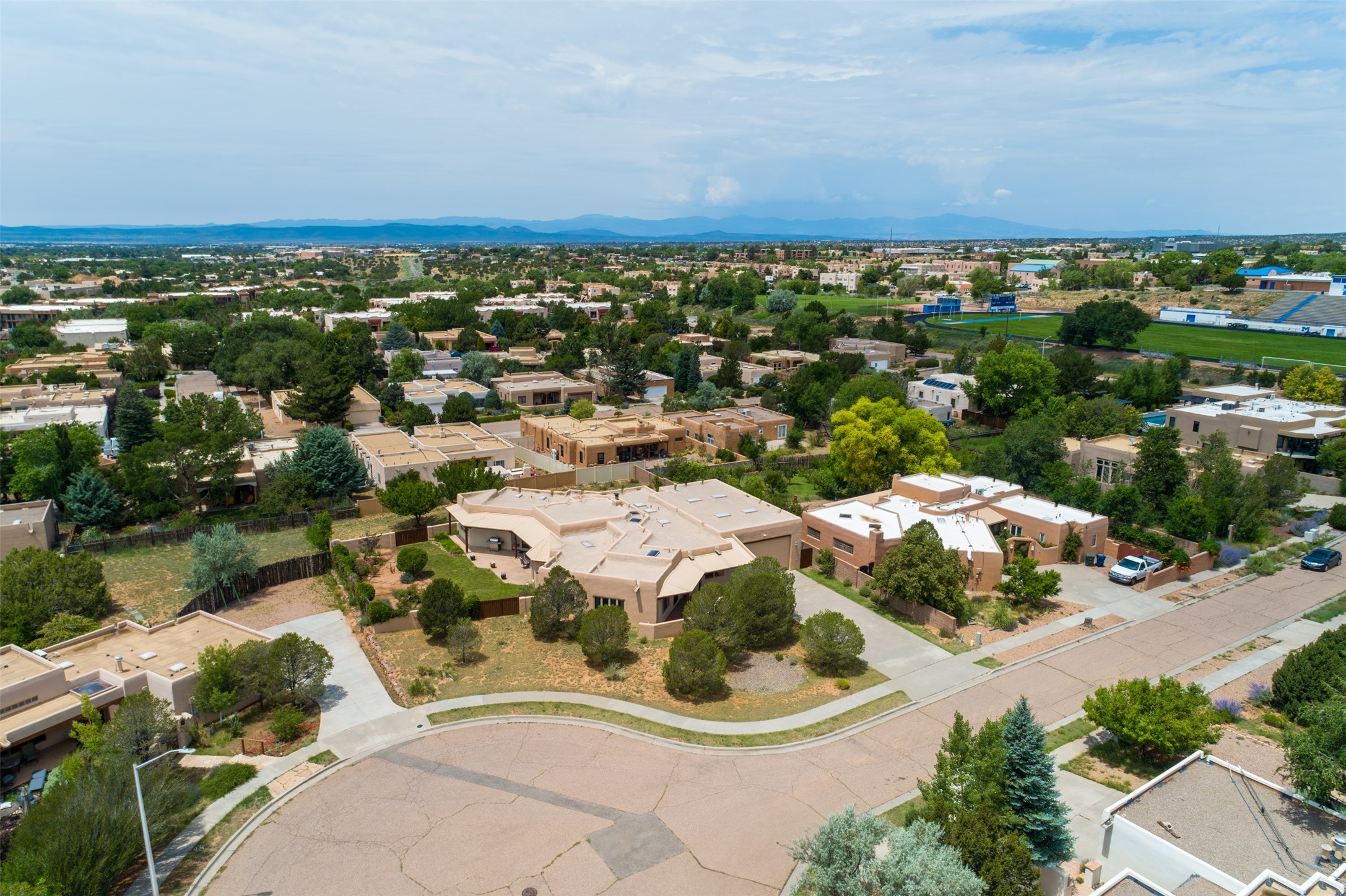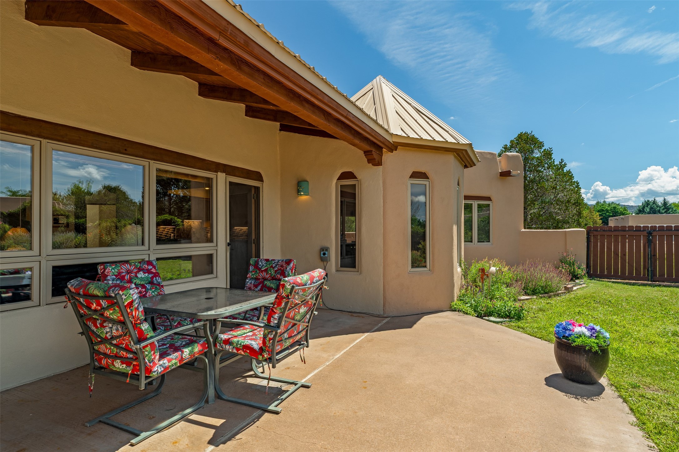 This one owner well maintained home is nestled on a quiet cul de sac street in an established neighborhood and offers an oasis of tranquility. It offers unparalleled charm and every detail has been thoughtfully crafted for luxurious living. From the moment you step into the spacious entry, you'll be captivated by the high ceilings throughout and the unique architectural elements. Enjoy the timeless Santa Fe charm vigas bring and especially when they are topped with split cedar as the grand hallway has been. Gather around the beautifully designed wood fireplace in the cozy living room, or enjoy morning coffee in the circular breakfast area with its enchanting wood-coned ceiling. The heart of the home, an updated kitchen with an island flows seamlessly into a formal dining area, perfect for entertaining. Retreat to the roomy primary bedroom or one of two spacious secondary bedrooms, each boasting an en-suite bathroom and generous closets. Outside, discover a private haven with established, irrigated front and back landscaping with a beautiful rose garden, and an enclosed backyard. Practical amenities such as an extra-long driveway, an oversized 1100 square foot 2-car garage with a 10-foot high double door. The garage is finished and has high ceilings and can accommodate many uses and greatly adds to the home's appeal. Bask in abundant natural light and enjoy the peace of mind that comes with living in an elegantly crafted home.
