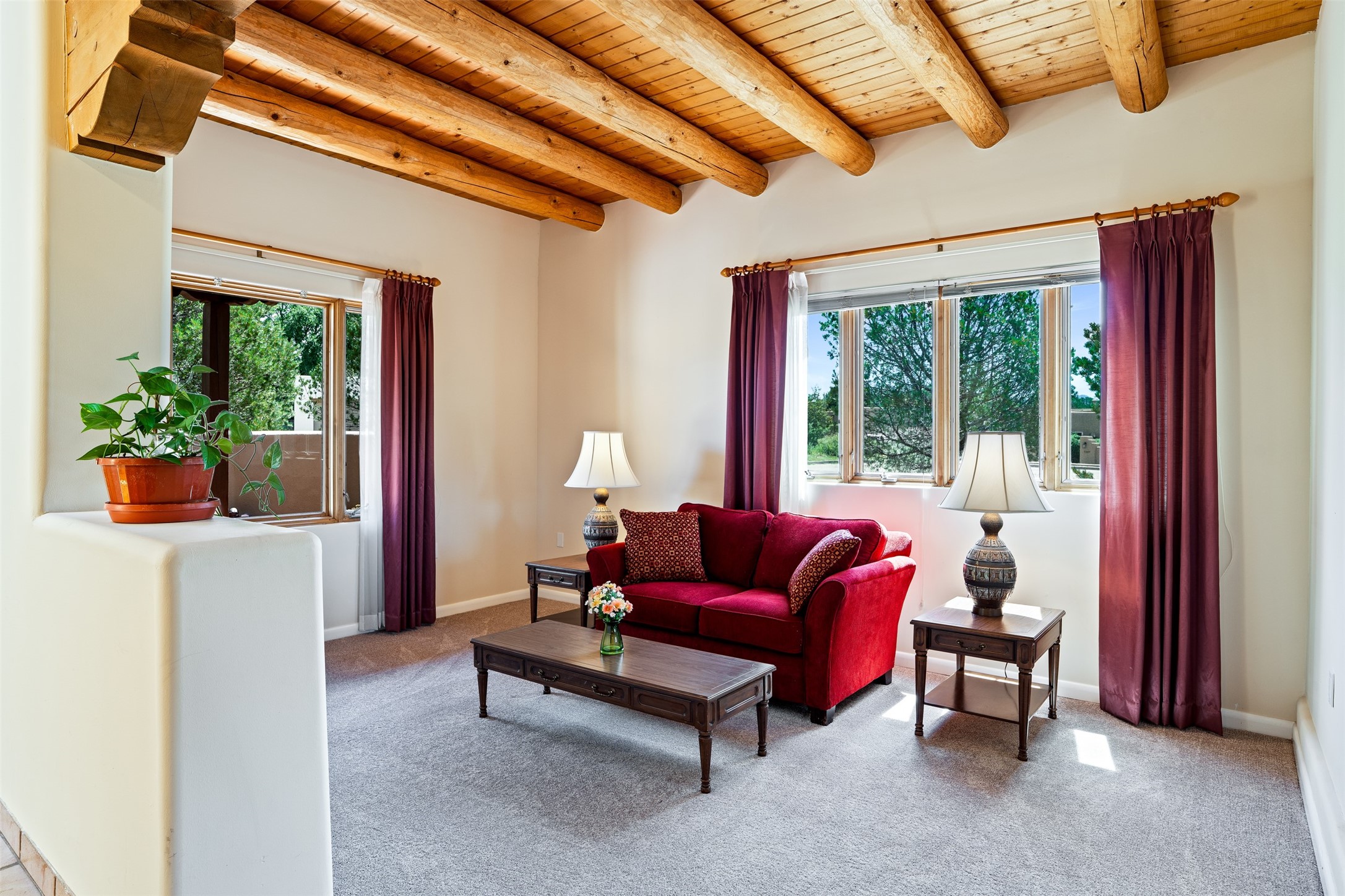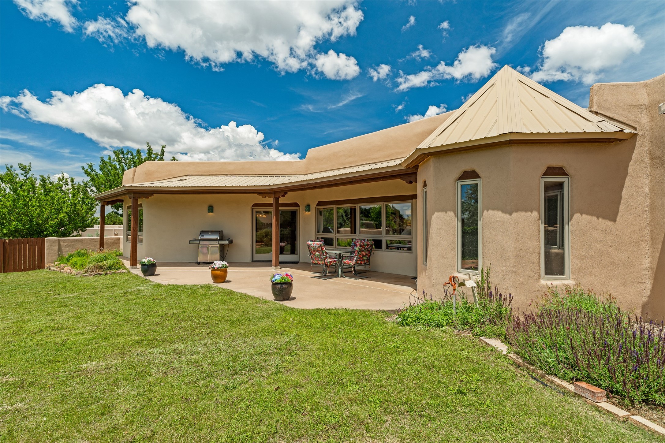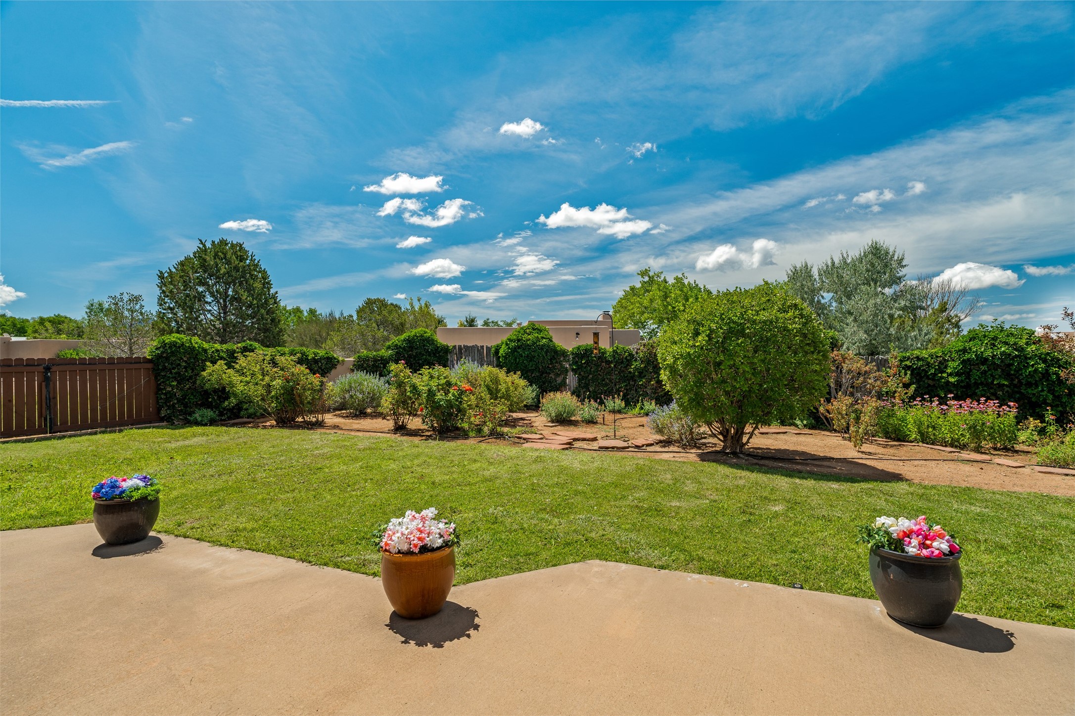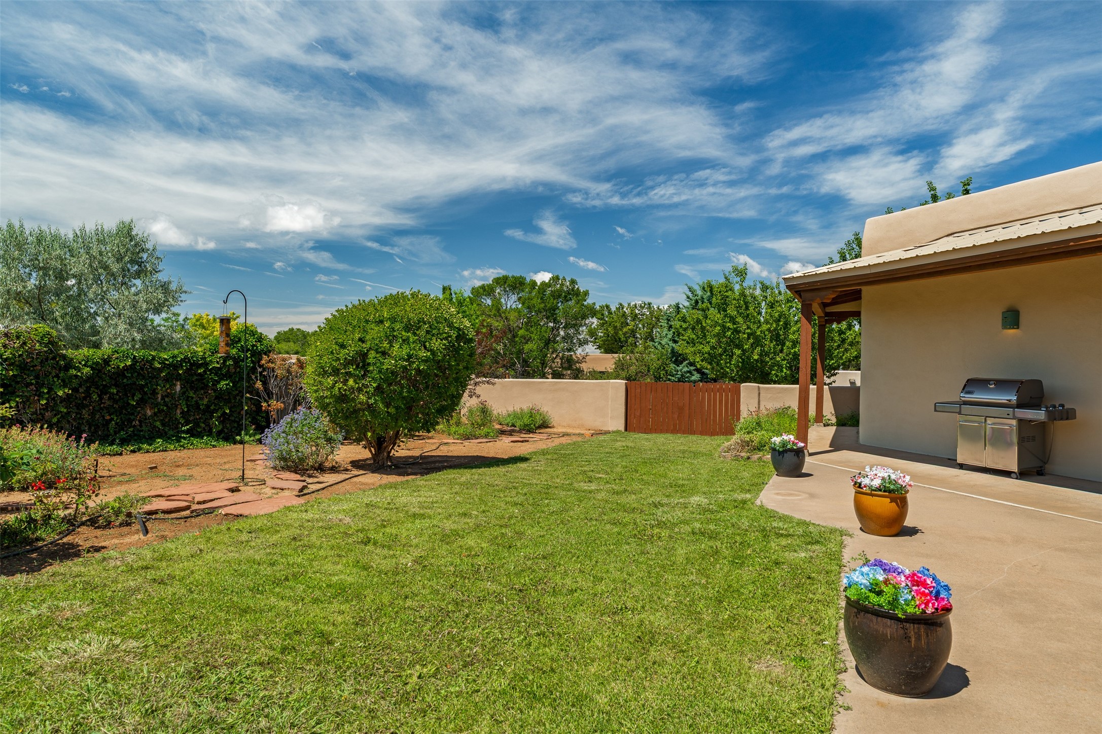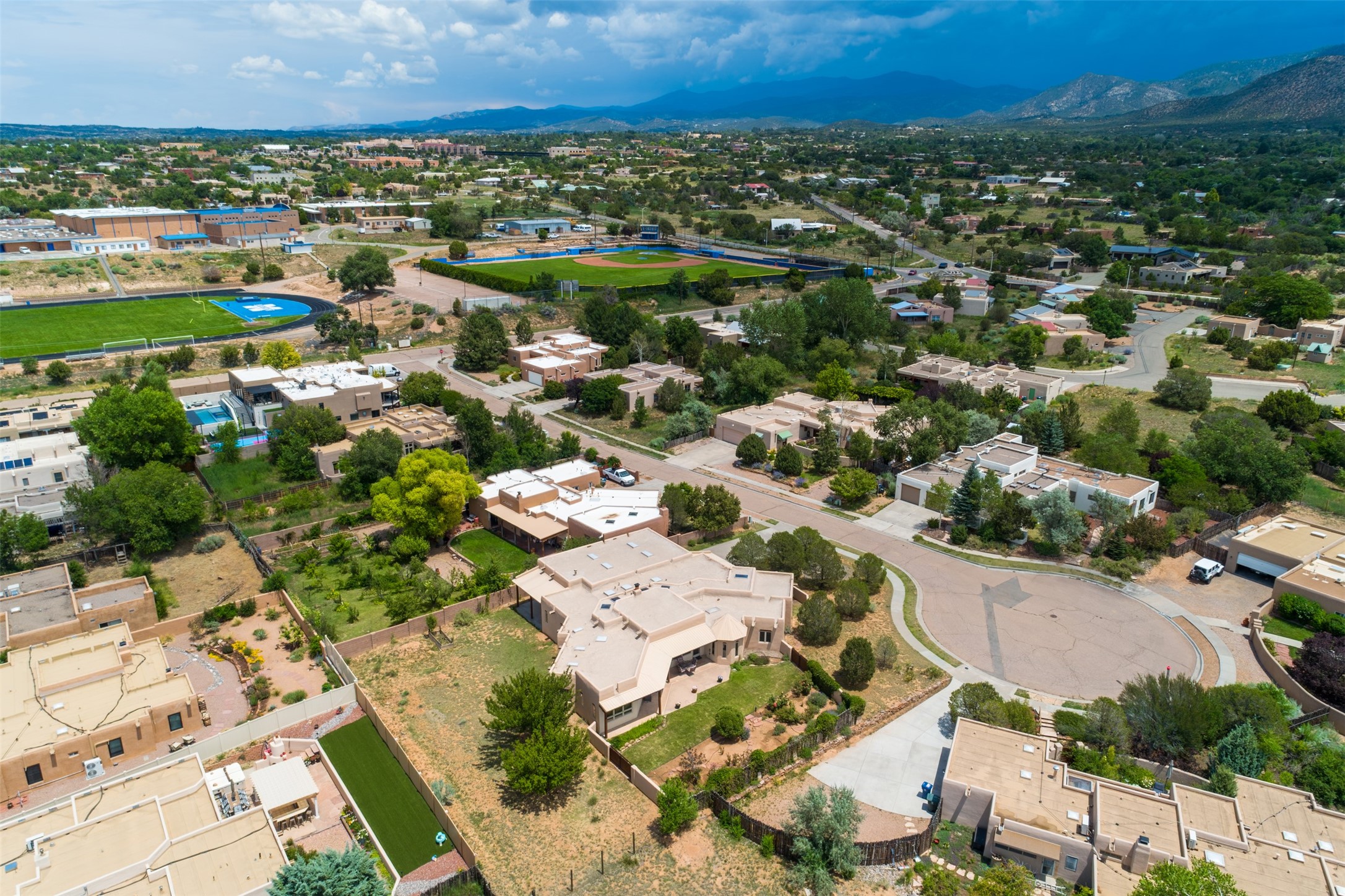 This one owner well maintained home is nestled on a quiet cul de sac street in an established neighborhood and offers an oasis of tranquility. It offers unparalleled charm and every detail has been thoughtfully crafted for luxurious living. From the moment you step into the spacious entry, you'll be captivated by the high ceilings throughout and the unique architectural elements. Enjoy the timeless Santa Fe charm vigas bring and especially when they are topped with split cedar as the grand hallway has been. Gather around the beautifully designed wood fireplace in the cozy living room, or enjoy morning coffee in the circular breakfast area with its enchanting wood-coned ceiling. The heart of the home, an updated kitchen with an island flows seamlessly into a formal dining area, perfect for entertaining. Retreat to the roomy primary bedroom or one of two spacious secondary bedrooms, each boasting an en-suite bathroom and generous closets. Outside, discover a private haven with established, irrigated front and back landscaping with a beautiful rose garden, and an enclosed backyard. Practical amenities such as an extra-long driveway, an oversized 1100 square foot 2-car garage with a 10-foot high double door. The garage is finished and has high ceilings and can accommodate many uses and greatly adds to the home's appeal. Bask in abundant natural light and enjoy the peace of mind that comes with living in an elegantly crafted home.