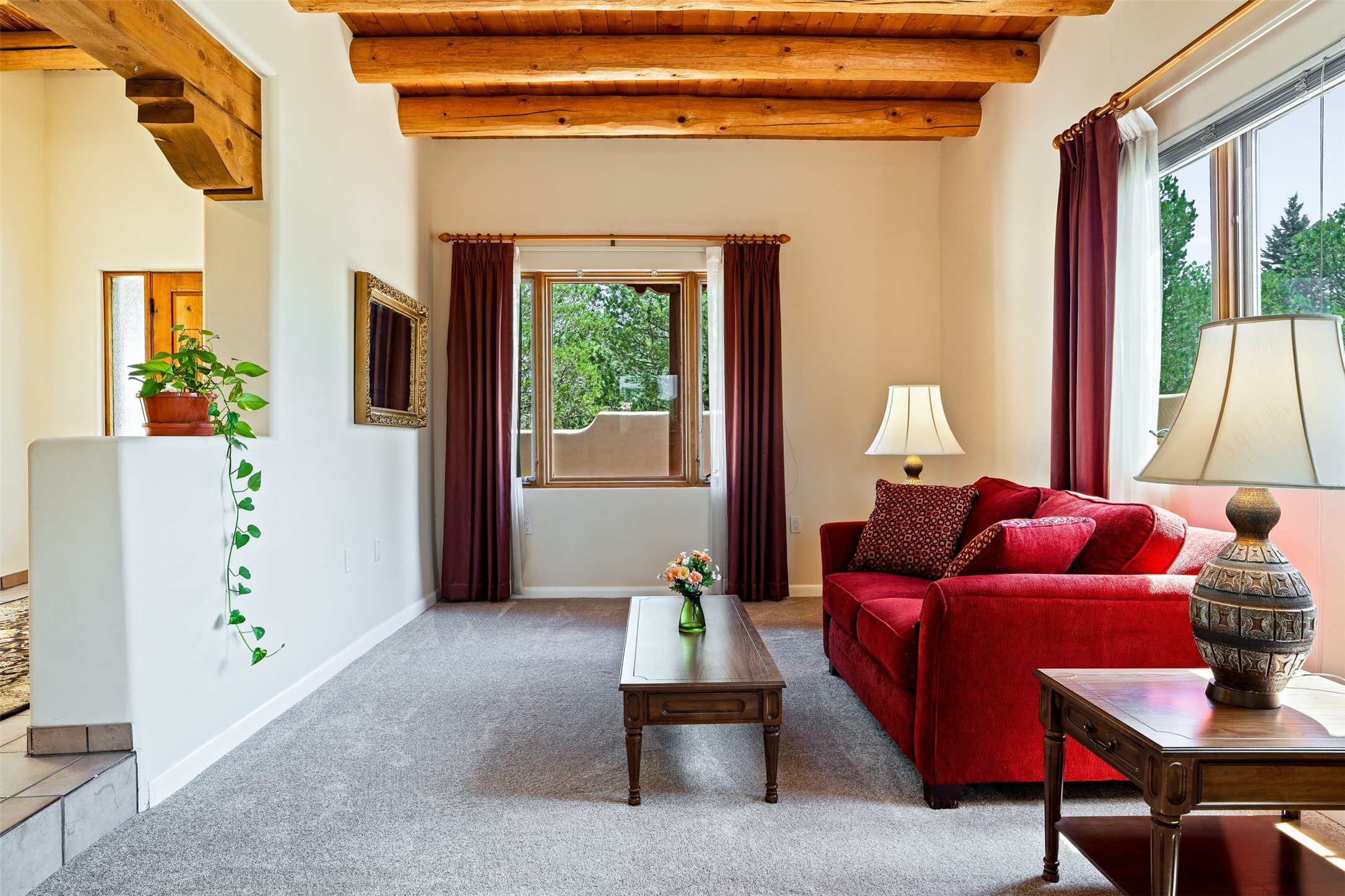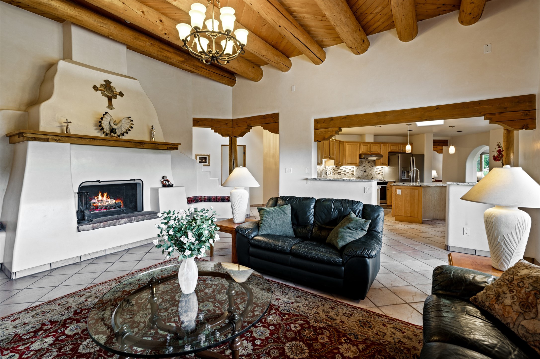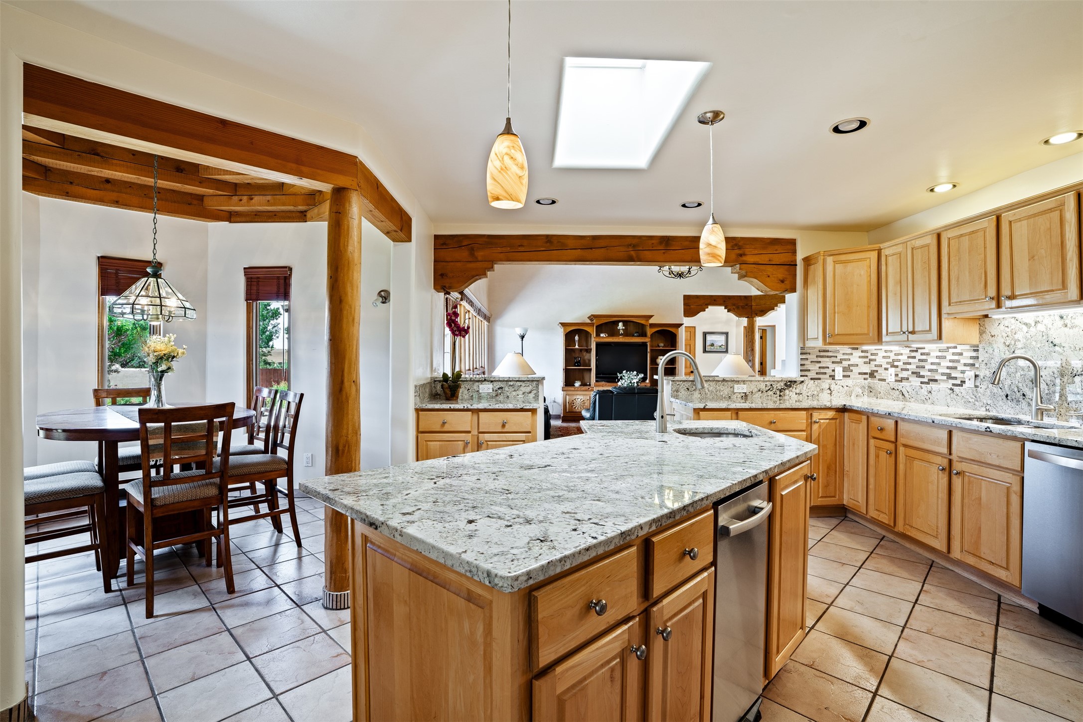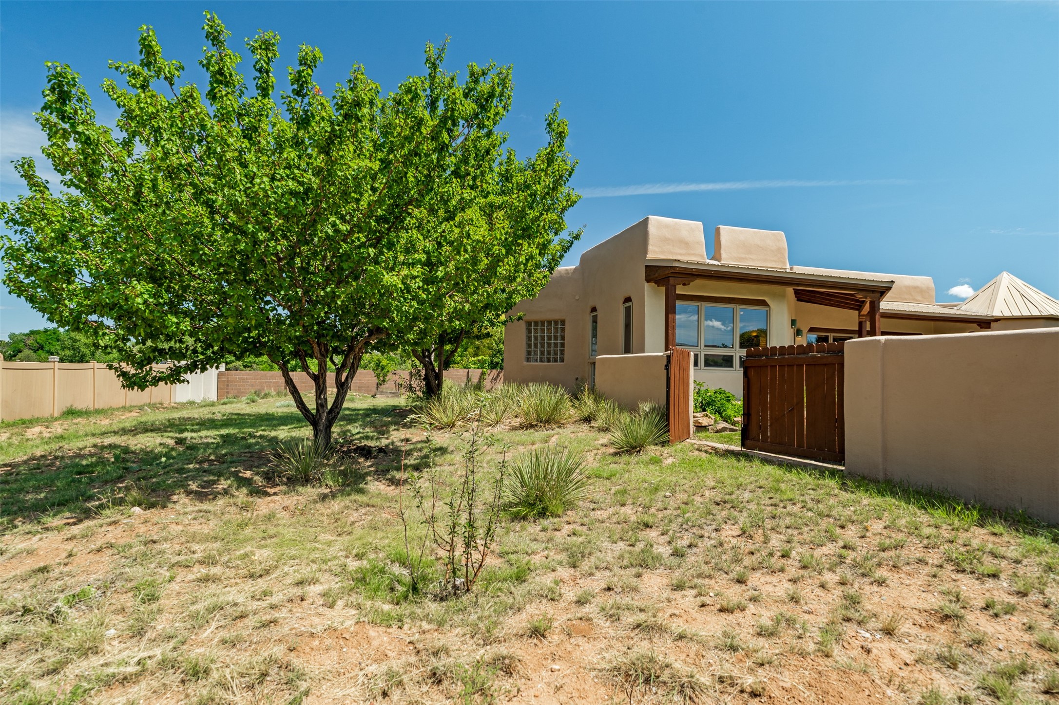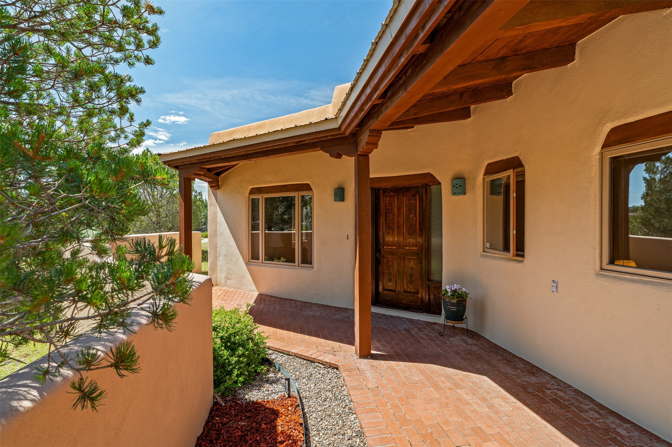 This one owner well maintained home is nestled on a quiet cul de sac street in an established neighborhood and offers an oasis of tranquility. It offers unparalleled charm and every detail has been thoughtfully crafted for luxurious living. From the moment you step into the spacious entry, you'll be captivated by the high ceilings throughout and the unique architectural elements. Enjoy the timeless Santa Fe charm vigas bring and especially when they are topped with split cedar as the grand hallway has been. Gather around the beautifully designed wood fireplace in the cozy living room, or enjoy morning coffee in the circular breakfast area with its enchanting wood-coned ceiling. The heart of the home, an updated kitchen with an island flows seamlessly into a formal dining area, perfect for entertaining. Retreat to the roomy primary bedroom or one of two spacious secondary bedrooms, each boasting an en-suite bathroom and generous closets. Outside, discover a private haven with established, irrigated front and back landscaping with a beautiful rose garden, and an enclosed backyard. Practical amenities such as an extra-long driveway, an oversized 1100 square foot 2-car garage with a 10-foot high double door. The garage is finished and has high ceilings and can accommodate many uses and greatly adds to the home's appeal. Bask in abundant natural light and enjoy the peace of mind that comes with living in an elegantly crafted home.