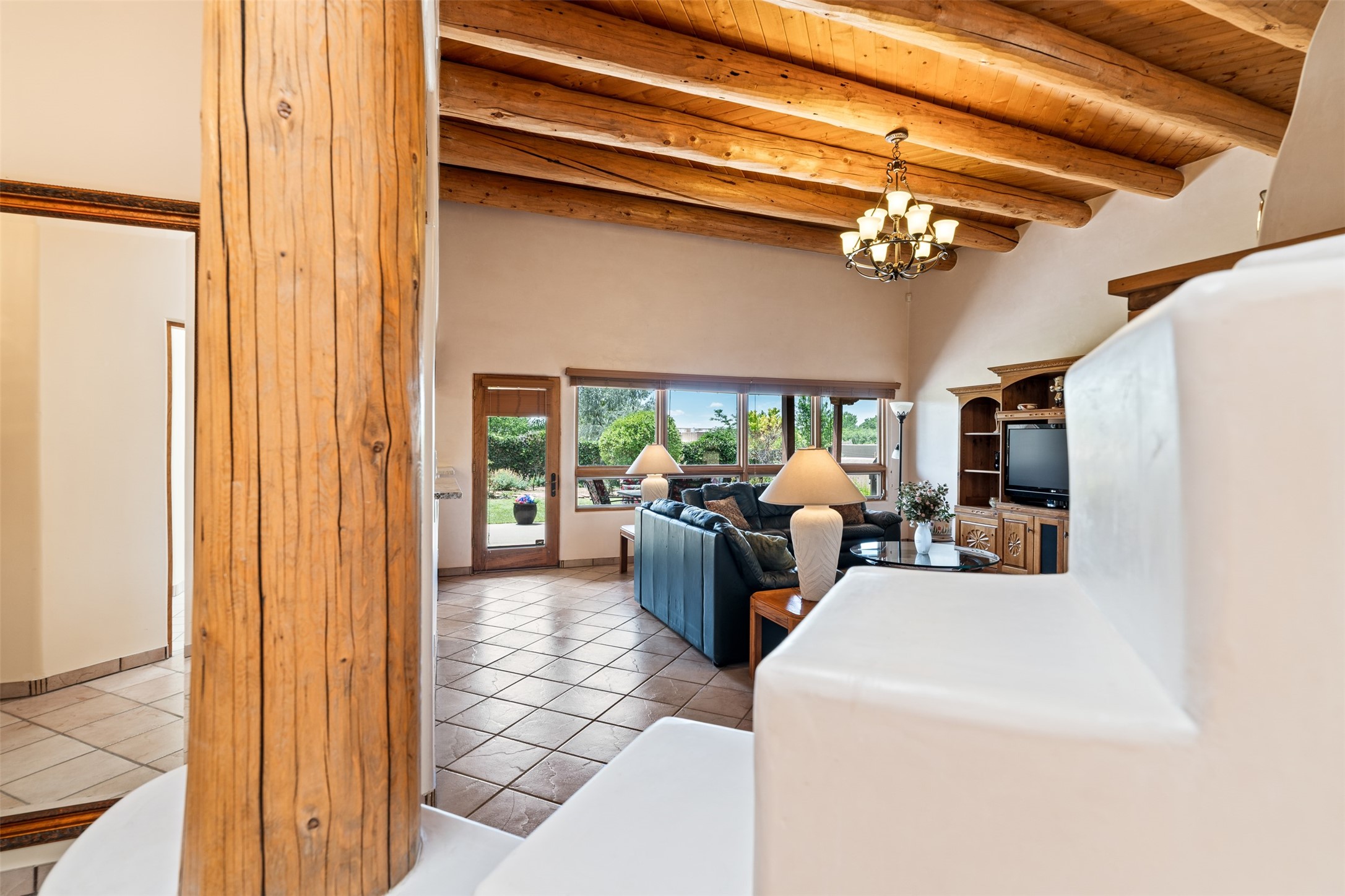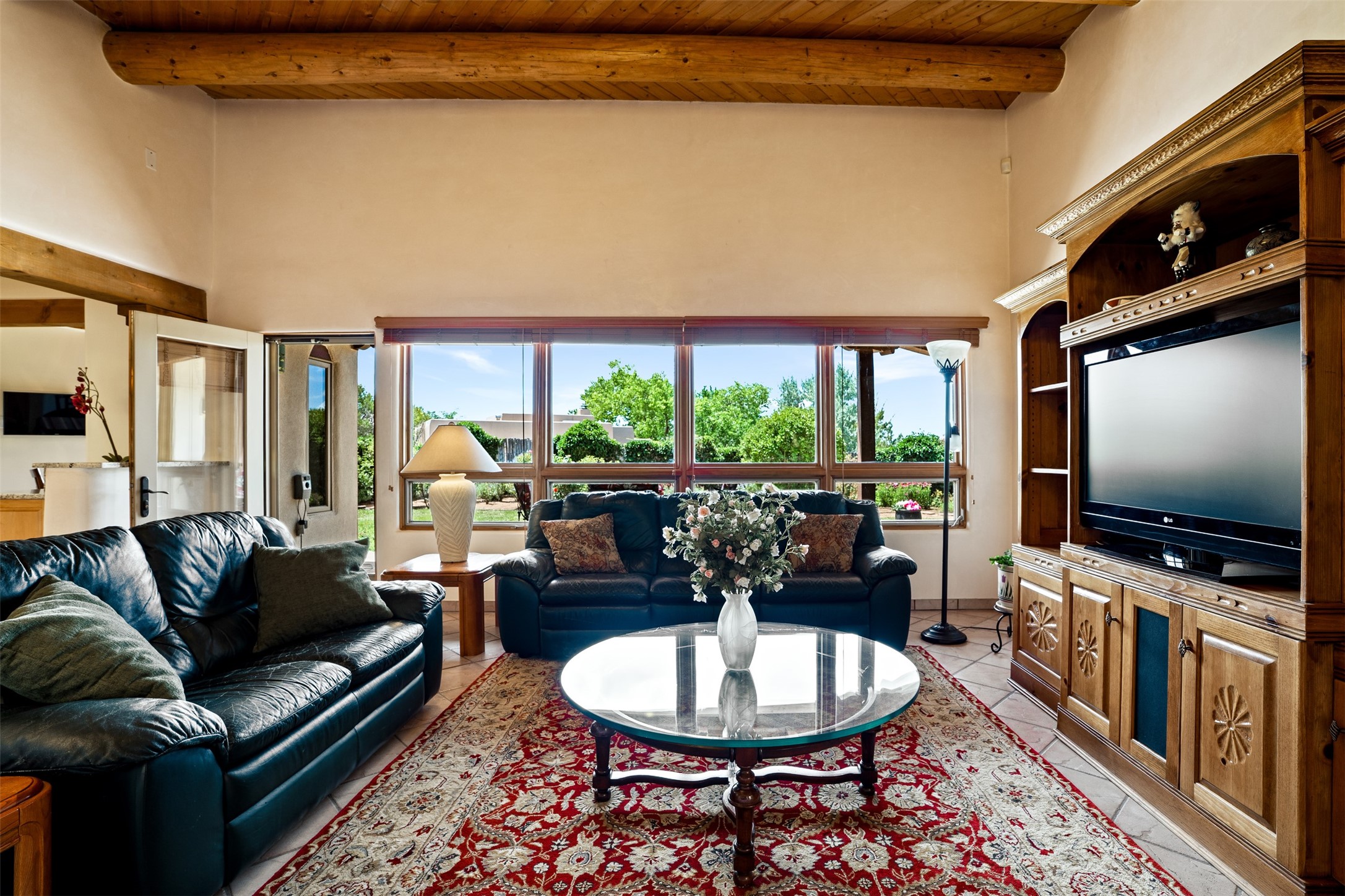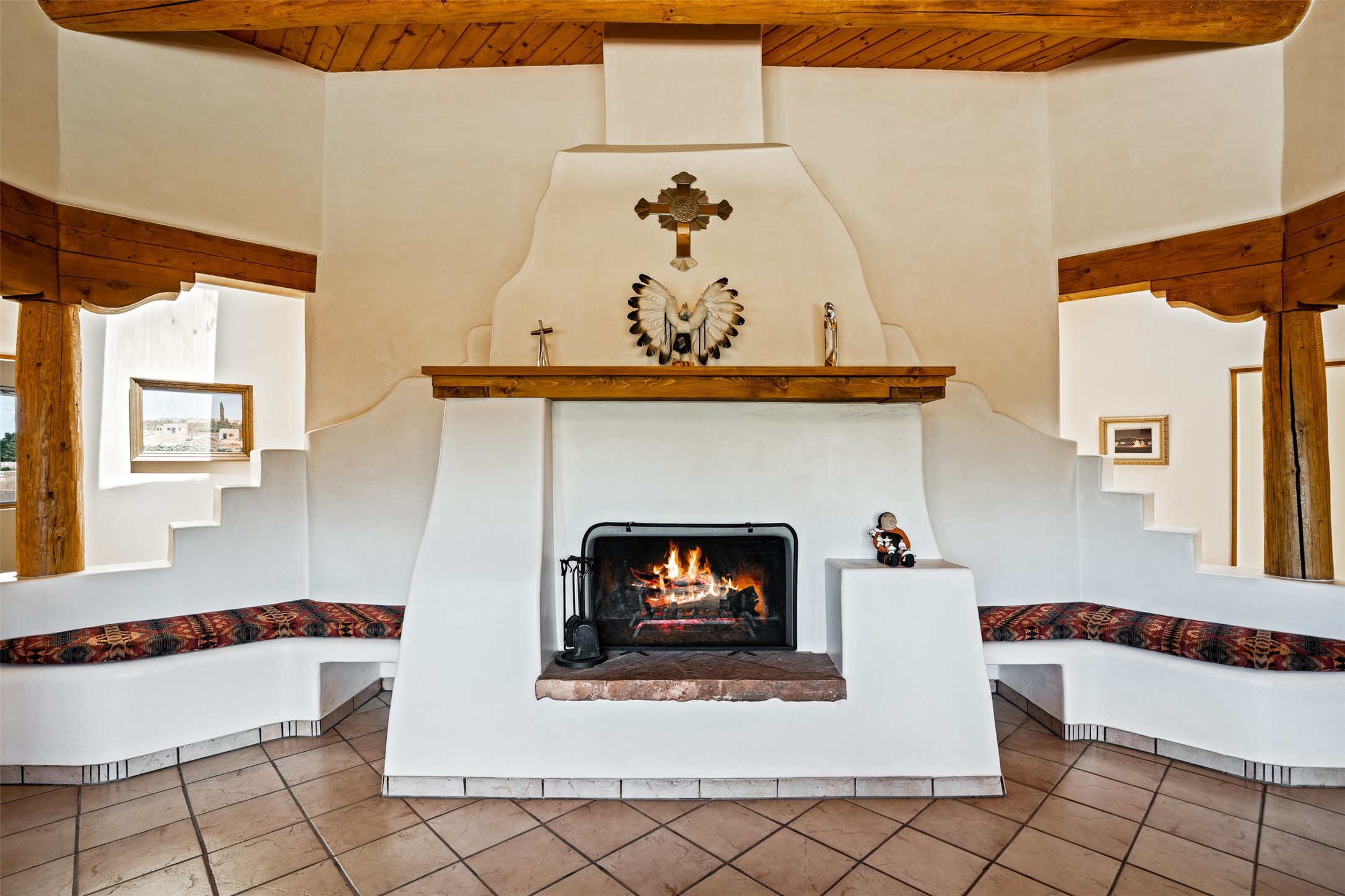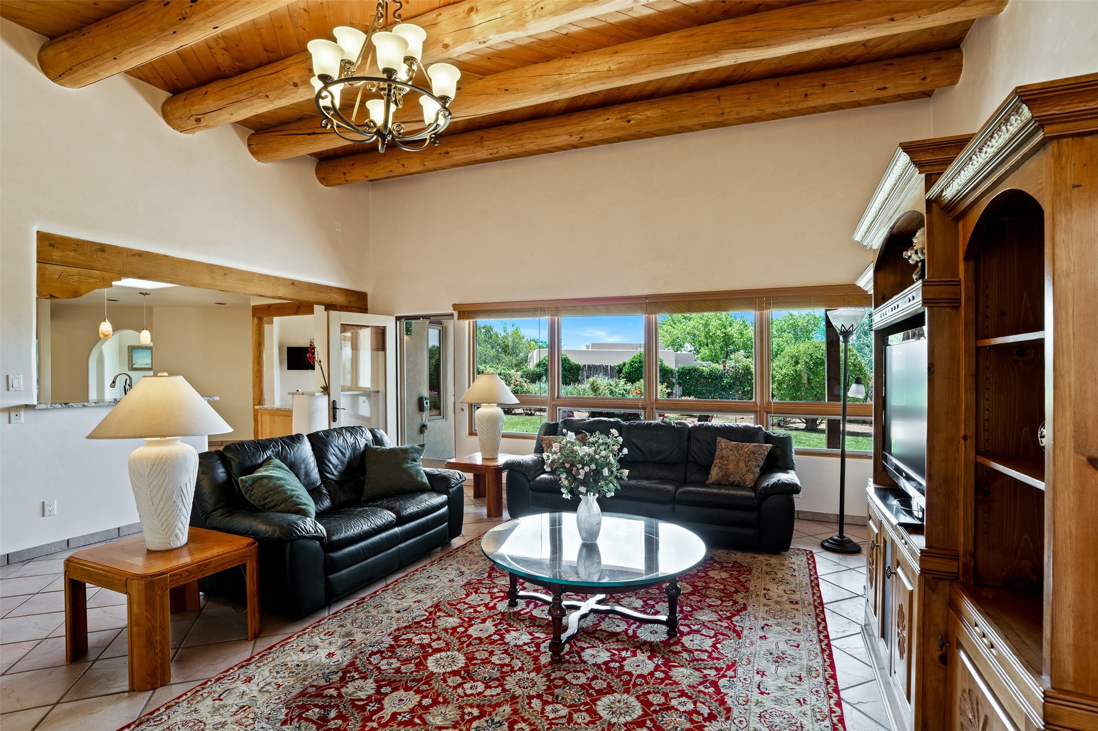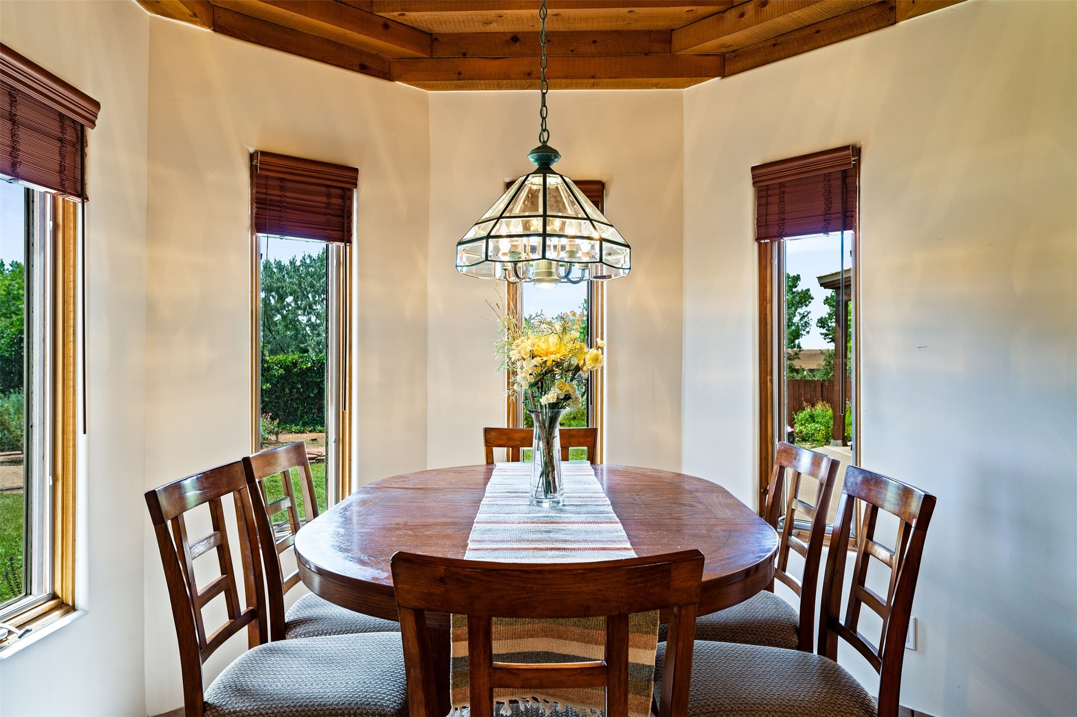 This one owner well maintained home is nestled on a quiet cul de sac street in an established neighborhood and offers an oasis of tranquility. It offers unparalleled charm and every detail has been thoughtfully crafted for luxurious living. From the moment you step into the spacious entry, you'll be captivated by the high ceilings throughout and the unique architectural elements. Enjoy the timeless Santa Fe charm vigas bring and especially when they are topped with split cedar as the grand hallway has been. Gather around the beautifully designed wood fireplace in the cozy living room, or enjoy morning coffee in the circular breakfast area with its enchanting wood-coned ceiling. The heart of the home, an updated kitchen with an island flows seamlessly into a formal dining area, perfect for entertaining. Retreat to the roomy primary bedroom or one of two spacious secondary bedrooms, each boasting an en-suite bathroom and generous closets. Outside, discover a private haven with established, irrigated front and back landscaping with a beautiful rose garden, and an enclosed backyard. Practical amenities such as an extra-long driveway, an oversized 1100 square foot 2-car garage with a 10-foot high double door. The garage is finished and has high ceilings and can accommodate many uses and greatly adds to the home's appeal. Bask in abundant natural light and enjoy the peace of mind that comes with living in an elegantly crafted home.