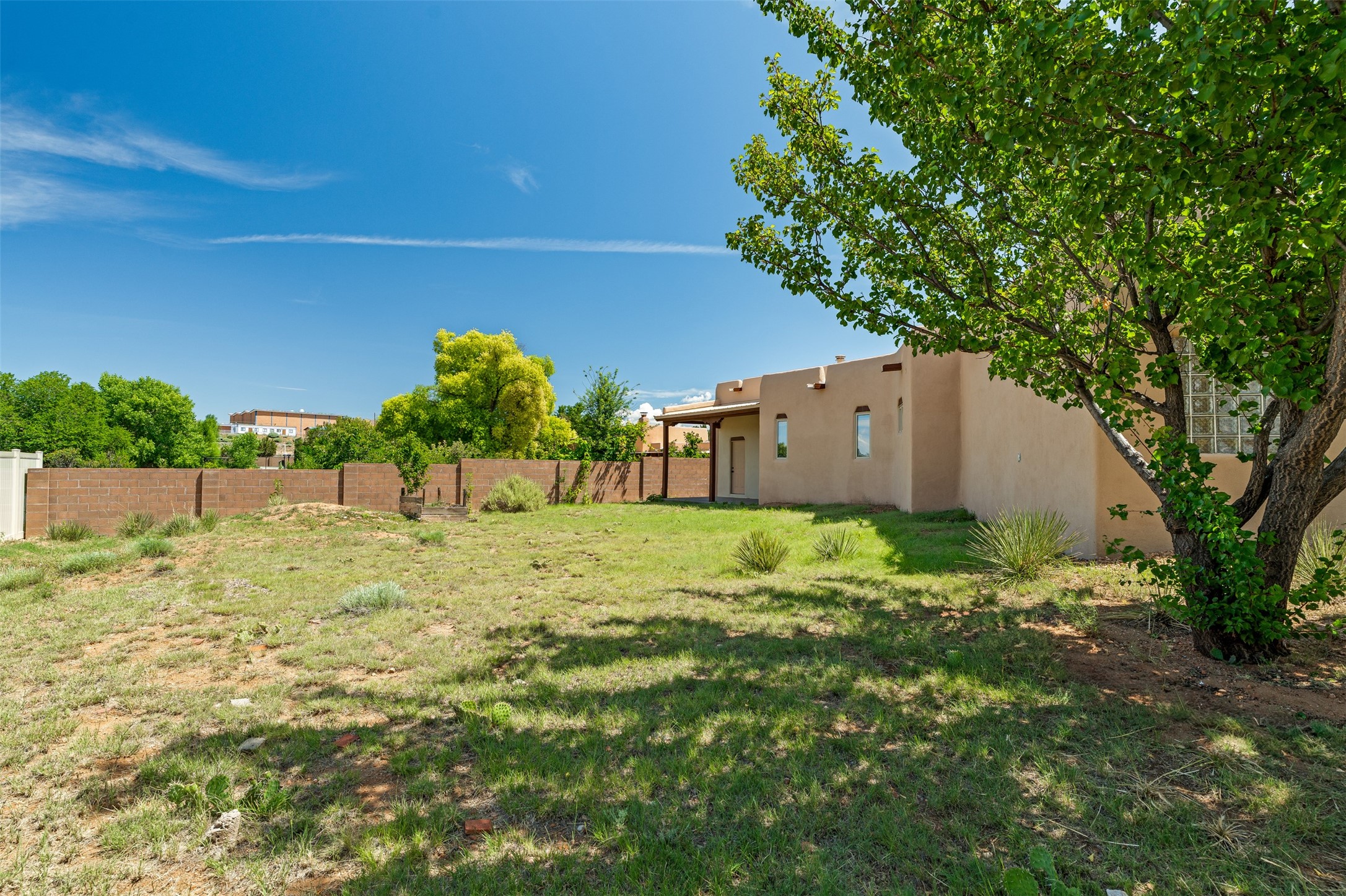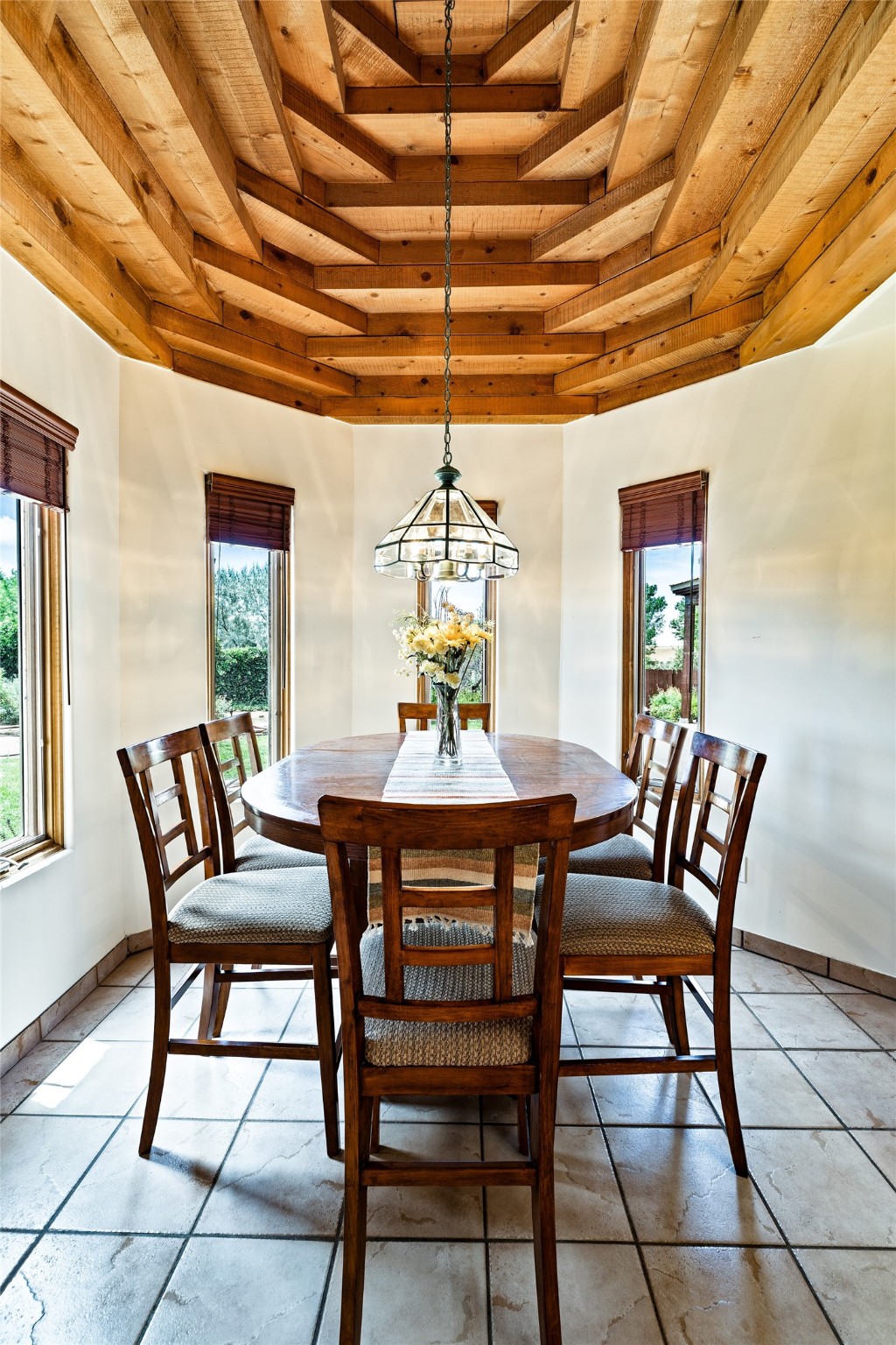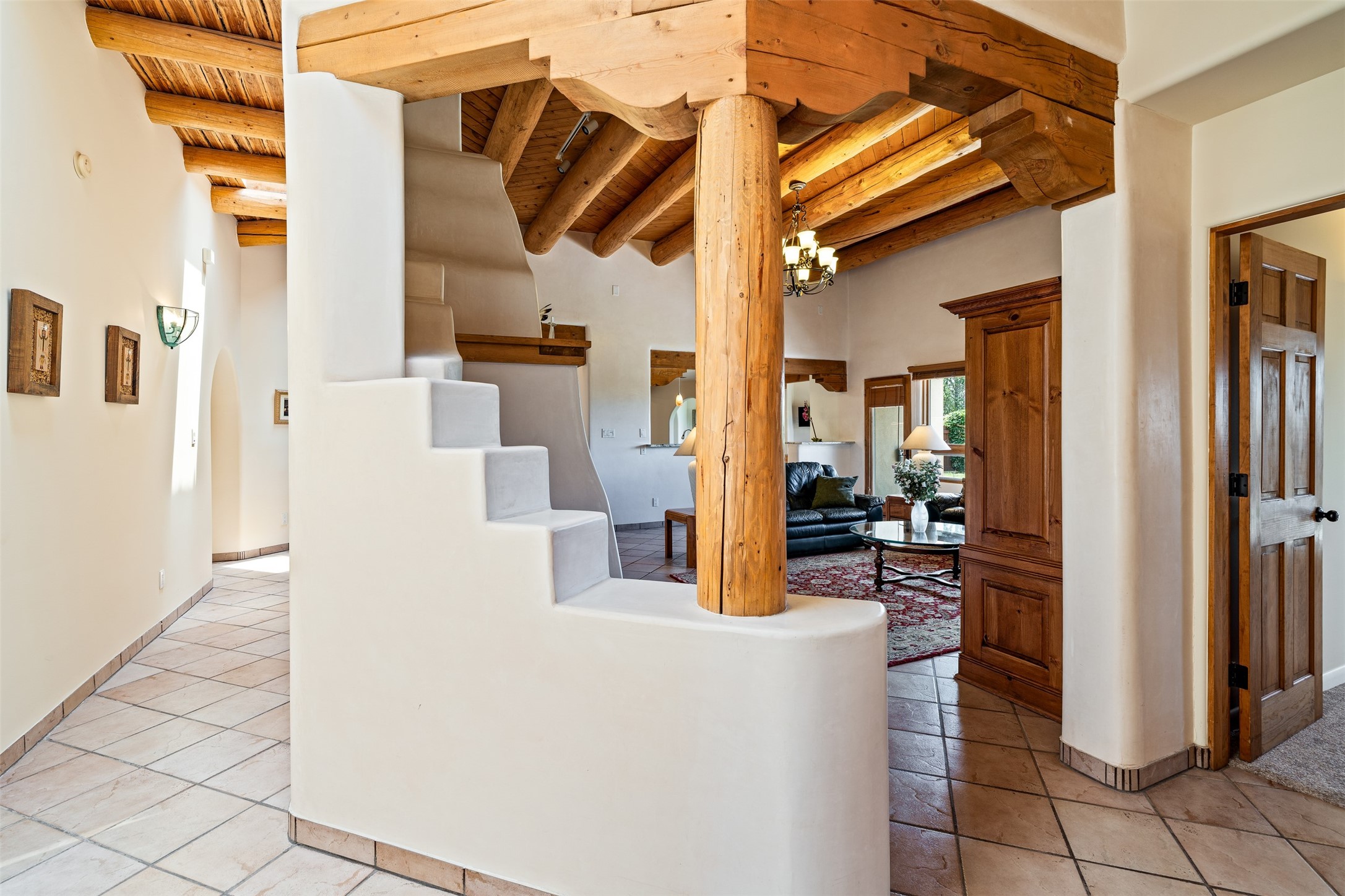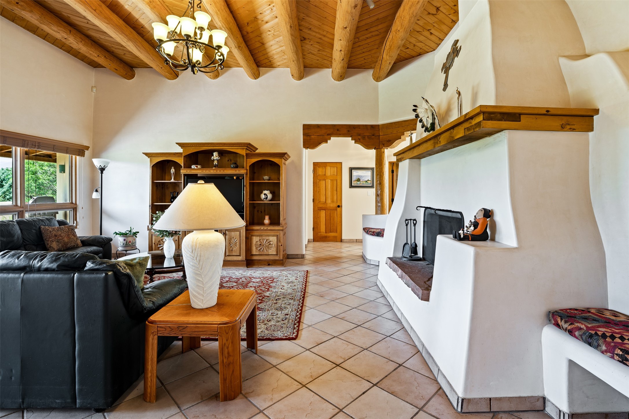 This one owner well maintained home is nestled on a quiet cul de sac street in an established neighborhood and offers an oasis of tranquility. It offers unparalleled charm and every detail has been thoughtfully crafted for luxurious living. From the moment you step into the spacious entry, you'll be captivated by the high ceilings throughout and the unique architectural elements. Enjoy the timeless Santa Fe charm vigas bring and especially when they are topped with split cedar as the grand hallway has been. Gather around the beautifully designed wood fireplace in the cozy living room, or enjoy morning coffee in the circular breakfast area with its enchanting wood-coned ceiling. The heart of the home, an updated kitchen with an island flows seamlessly into a formal dining area, perfect for entertaining. Retreat to the roomy primary bedroom or one of two spacious secondary bedrooms, each boasting an en-suite bathroom and generous closets. Outside, discover a private haven with established, irrigated front and back landscaping with a beautiful rose garden, and an enclosed backyard. Practical amenities such as an extra-long driveway, an oversized 1100 square foot 2-car garage with a 10-foot high double door. The garage is finished and has high ceilings and can accommodate many uses and greatly adds to the home's appeal. Bask in abundant natural light and enjoy the peace of mind that comes with living in an elegantly crafted home.