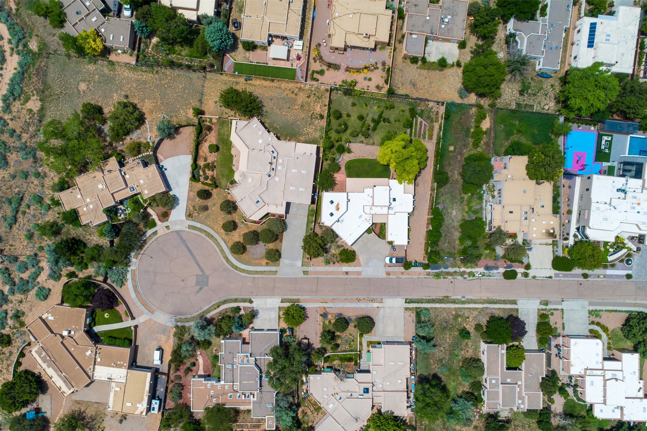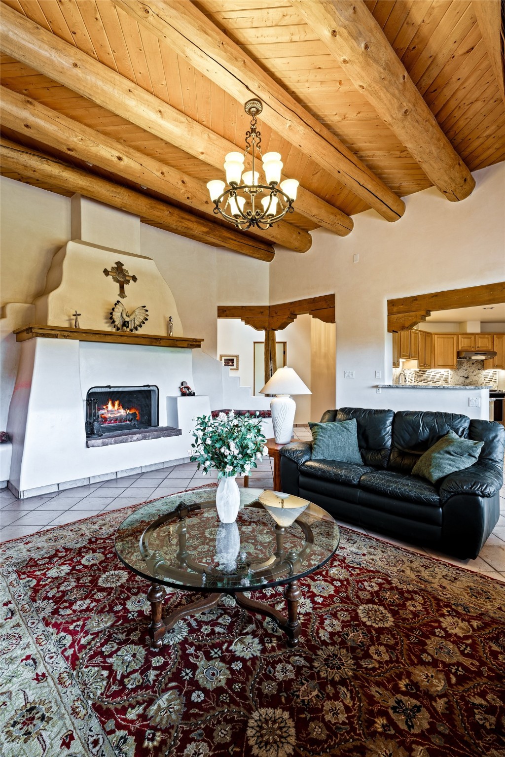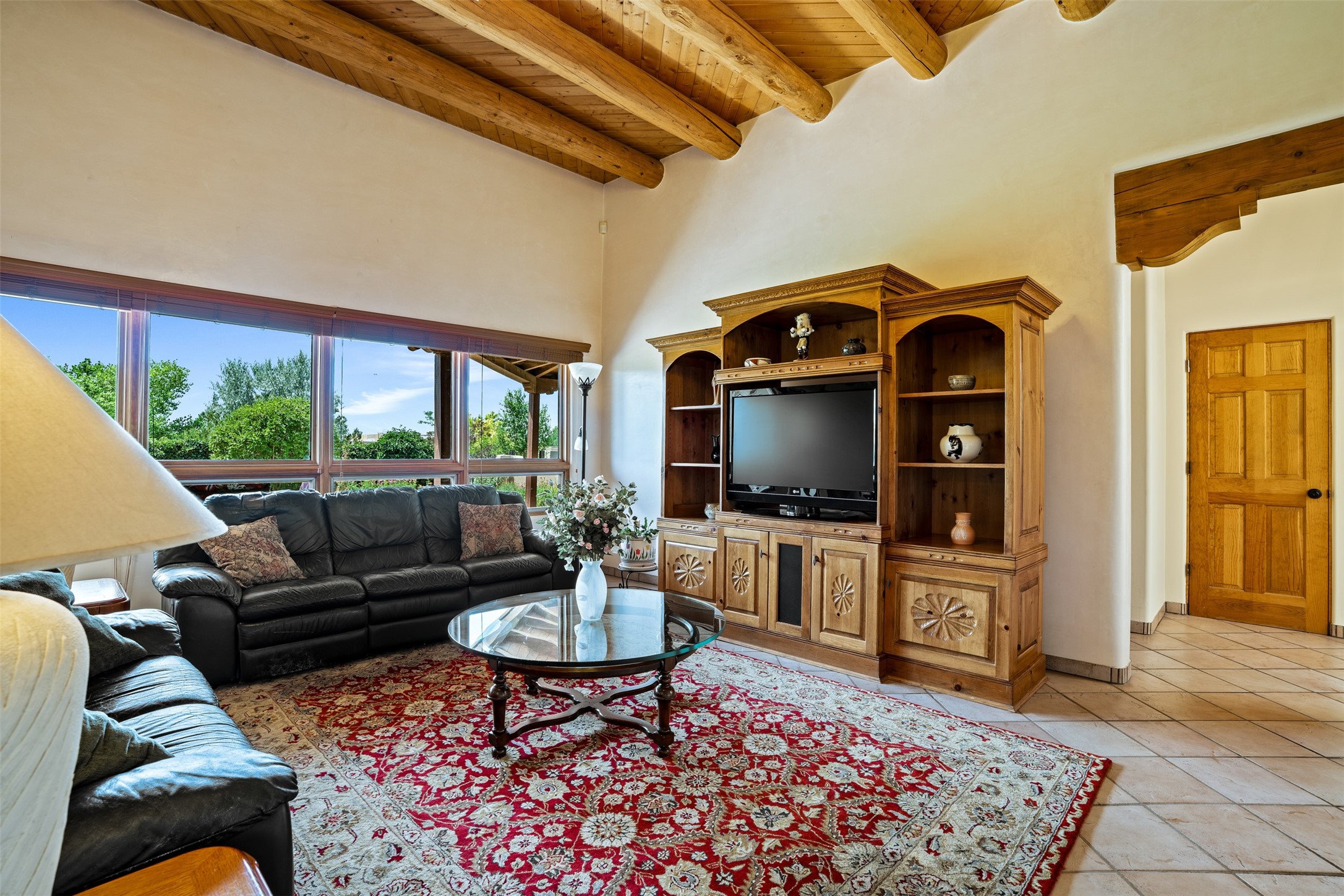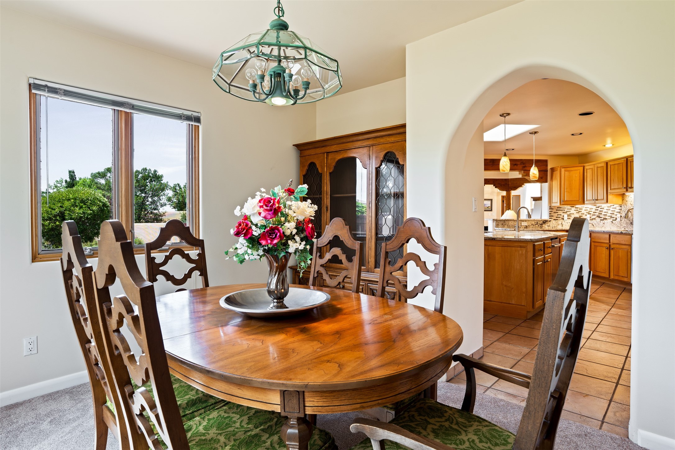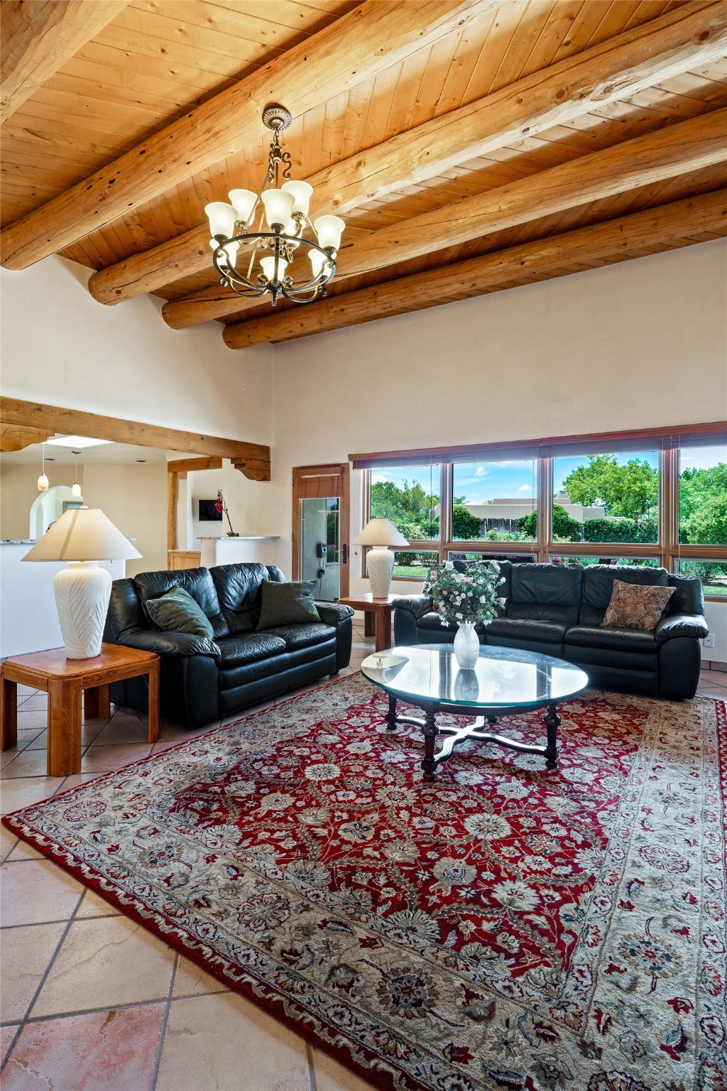 This one owner well maintained home is nestled on a quiet cul de sac street in an established neighborhood and offers an oasis of tranquility. It offers unparalleled charm and every detail has been thoughtfully crafted for luxurious living. From the moment you step into the spacious entry, you'll be captivated by the high ceilings throughout and the unique architectural elements. Enjoy the timeless Santa Fe charm vigas bring and especially when they are topped with split cedar as the grand hallway has been. Gather around the beautifully designed wood fireplace in the cozy living room, or enjoy morning coffee in the circular breakfast area with its enchanting wood-coned ceiling. The heart of the home, an updated kitchen with an island flows seamlessly into a formal dining area, perfect for entertaining. Retreat to the roomy primary bedroom or one of two spacious secondary bedrooms, each boasting an en-suite bathroom and generous closets. Outside, discover a private haven with established, irrigated front and back landscaping with a beautiful rose garden, and an enclosed backyard. Practical amenities such as an extra-long driveway, an oversized 1100 square foot 2-car garage with a 10-foot high double door. The garage is finished and has high ceilings and can accommodate many uses and greatly adds to the home's appeal. Bask in abundant natural light and enjoy the peace of mind that comes with living in an elegantly crafted home.