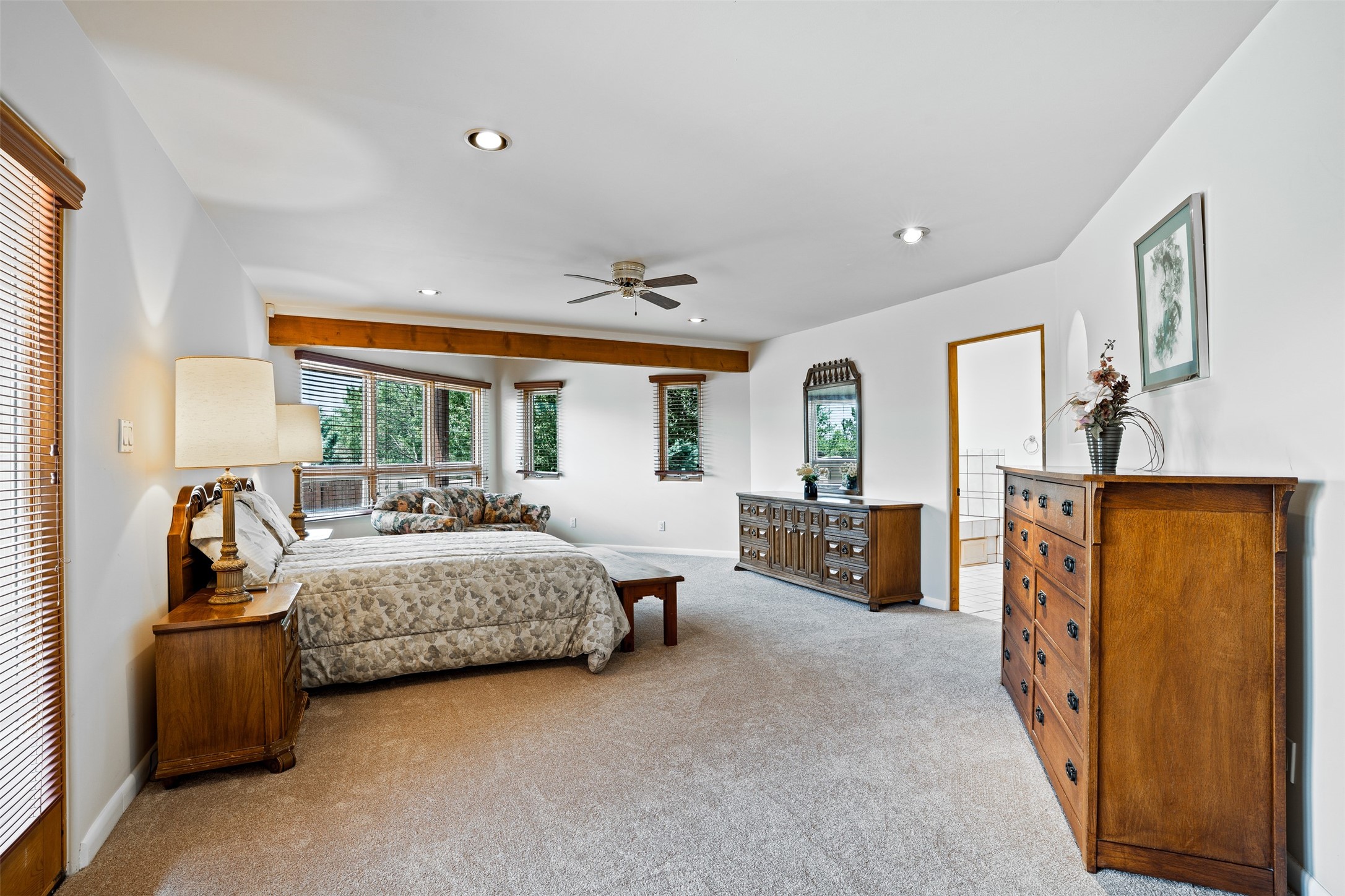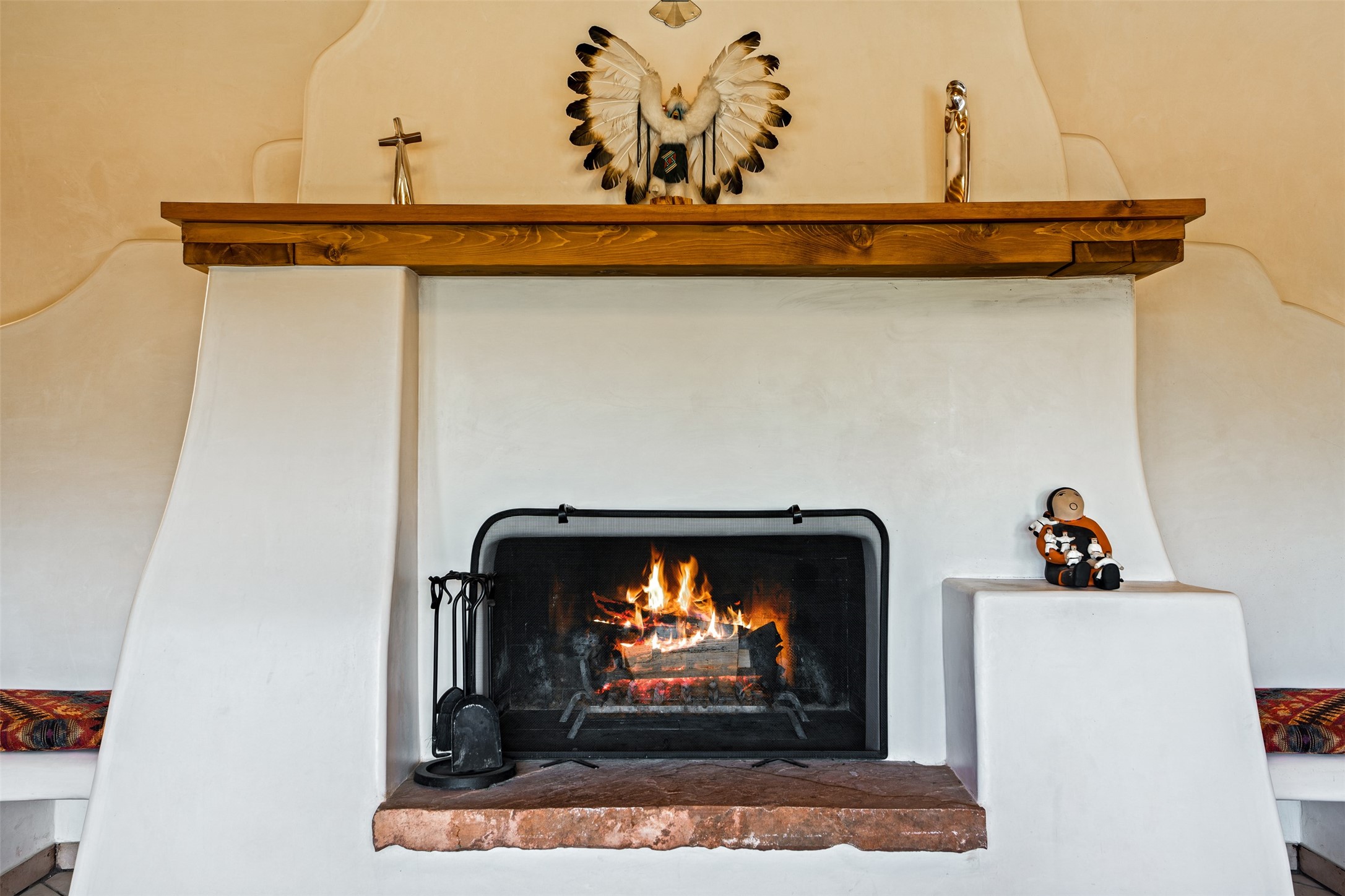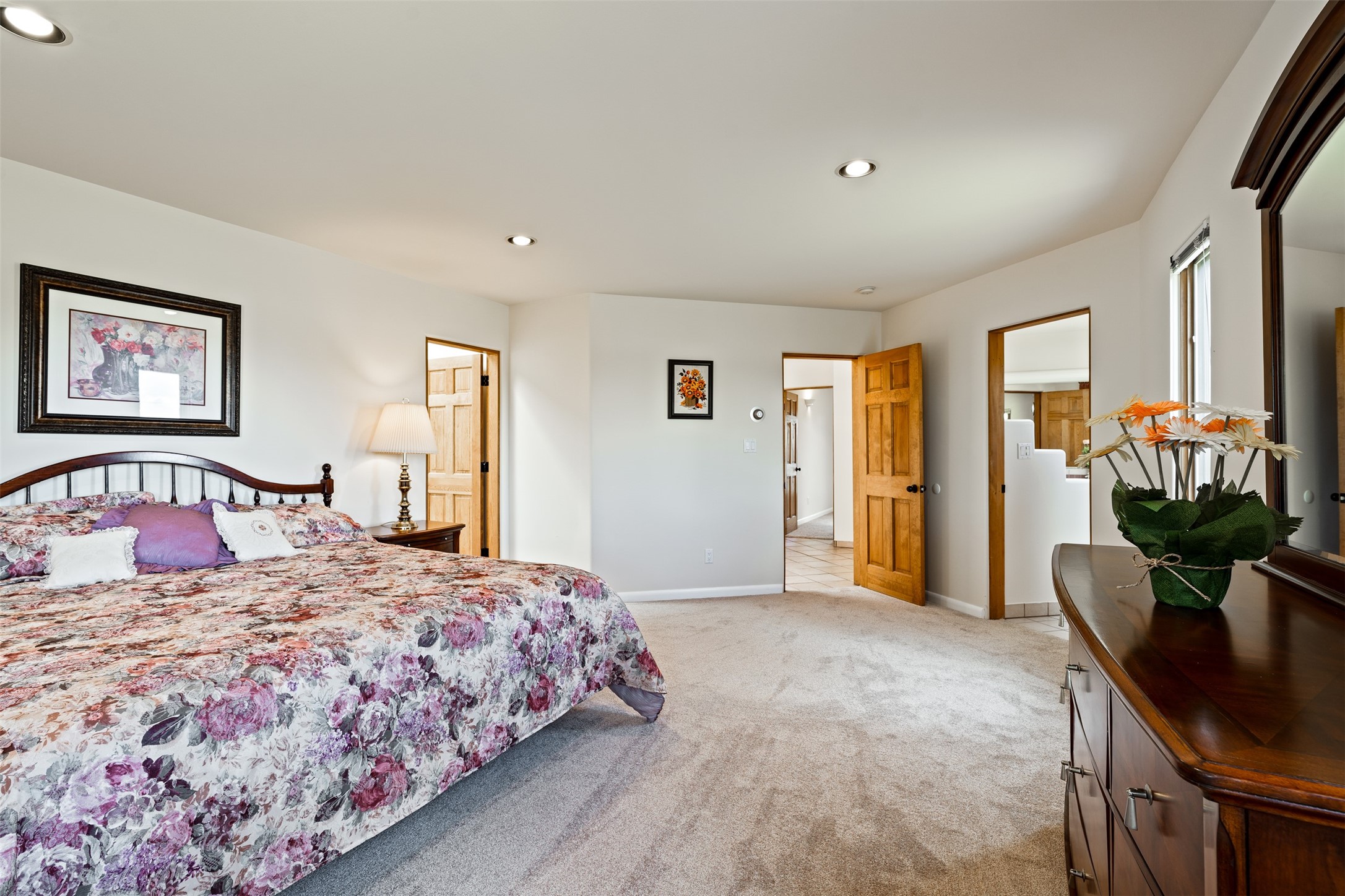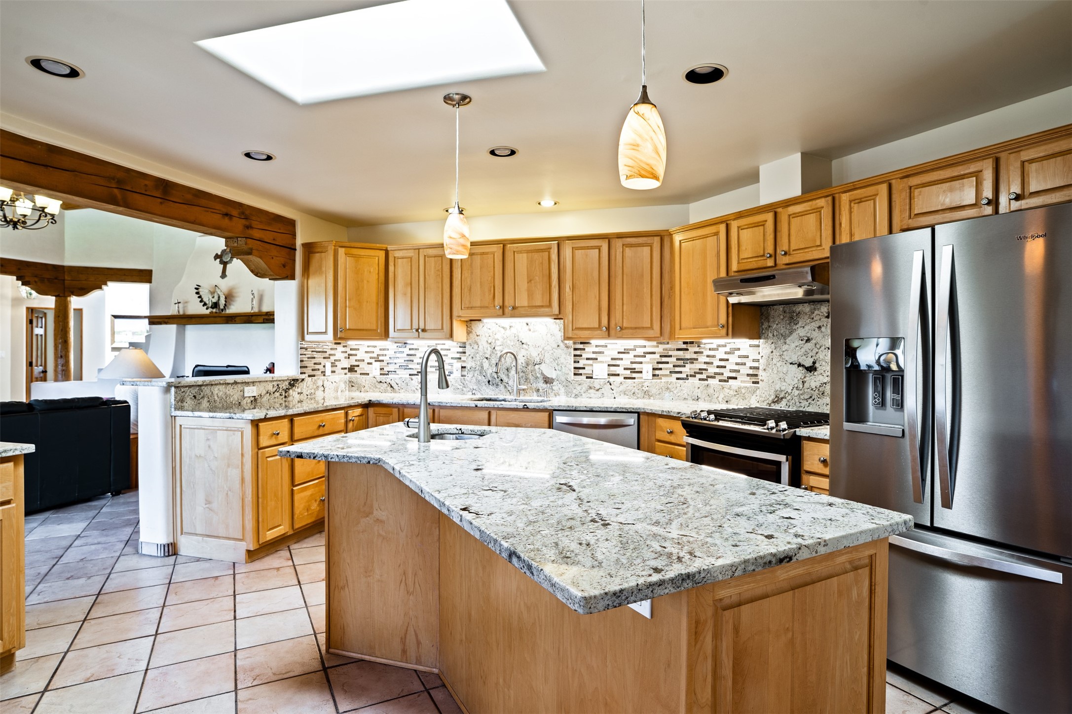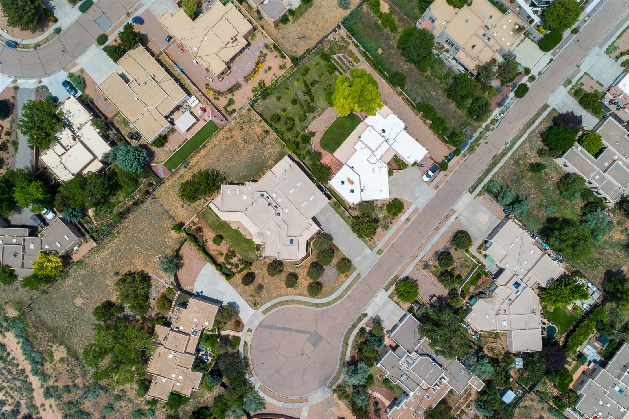 This one owner well maintained home is nestled on a quiet cul de sac street in an established neighborhood and offers an oasis of tranquility. It offers unparalleled charm and every detail has been thoughtfully crafted for luxurious living. From the moment you step into the spacious entry, you'll be captivated by the high ceilings throughout and the unique architectural elements. Enjoy the timeless Santa Fe charm vigas bring and especially when they are topped with split cedar as the grand hallway has been. Gather around the beautifully designed wood fireplace in the cozy living room, or enjoy morning coffee in the circular breakfast area with its enchanting wood-coned ceiling. The heart of the home, an updated kitchen with an island flows seamlessly into a formal dining area, perfect for entertaining. Retreat to the roomy primary bedroom or one of two spacious secondary bedrooms, each boasting an en-suite bathroom and generous closets. Outside, discover a private haven with established, irrigated front and back landscaping with a beautiful rose garden, and an enclosed backyard. Practical amenities such as an extra-long driveway, an oversized 1100 square foot 2-car garage with a 10-foot high double door. The garage is finished and has high ceilings and can accommodate many uses and greatly adds to the home's appeal. Bask in abundant natural light and enjoy the peace of mind that comes with living in an elegantly crafted home.
