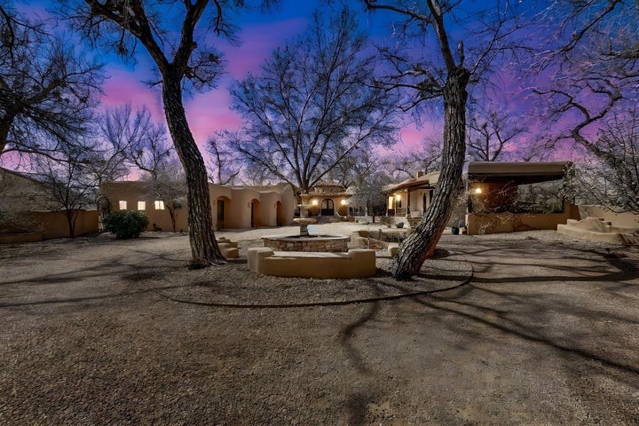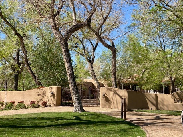If you've been searching for a luxurious retreat or a forever home rich in detail and charm, this rare Bosque Encantado estate offers an unmatched blend of natural beauty, artisan craftsmanship, and modern comfort. This enchanting estate offers a unique lifestyle to live amongst the trees in serene privacy. Set on a lovely landscaped 1.36 acre lot the home is a tranquil retreat featuring VIEWS, intimate portals & luxurious outdoor living spaces. Inside you'll find exceptional stone flooring, hand-hewn beams & custom ceiling and wall treatments. Curated antique details will captivate the most discerning buyers. The gourmet kitchen has a smart layout ideal for entertaining. Spacious owners suite offers the ultimate relaxation w beautiful fireplaces, elegant ceilings & french doors leading to the portal and lush grounds. Private attached casita adds more value & charm. The casita features a cozy kiva fireplace, beamed ceilings and a full ensuite bathroom-perfect for guests, in-laws, or a secluded studio space. The additional 2 large bedrooms also have ensuite bathrooms-each with unique design features! Every room in this home reflects meticulous design and timeless charm. Whether you're seeking a luxurious escape or a peaceful forever home, this Rio Grande River haven is not to be missed. Experience refined Southwestern living in this stunning gated estate with Rio Grande River access and lush seasonal landscaping. Nestled among cottonwoods on a 1.36-acre lot, this property offers park-like views, privacy, and unforgettable outdoor living. Enjoy expansive front and rear covered portals, a backyard fireplace, built-in grill & mature trees! A private irrigation well and zoned watering system keep the grounds beautifully green year-round. Two walking paths within the subdivision provide direct access to the Rio Grande. Every inch of this home has been thoughtfully designed and impeccably maintained, with charming architectural details and modern luxuries throughout.