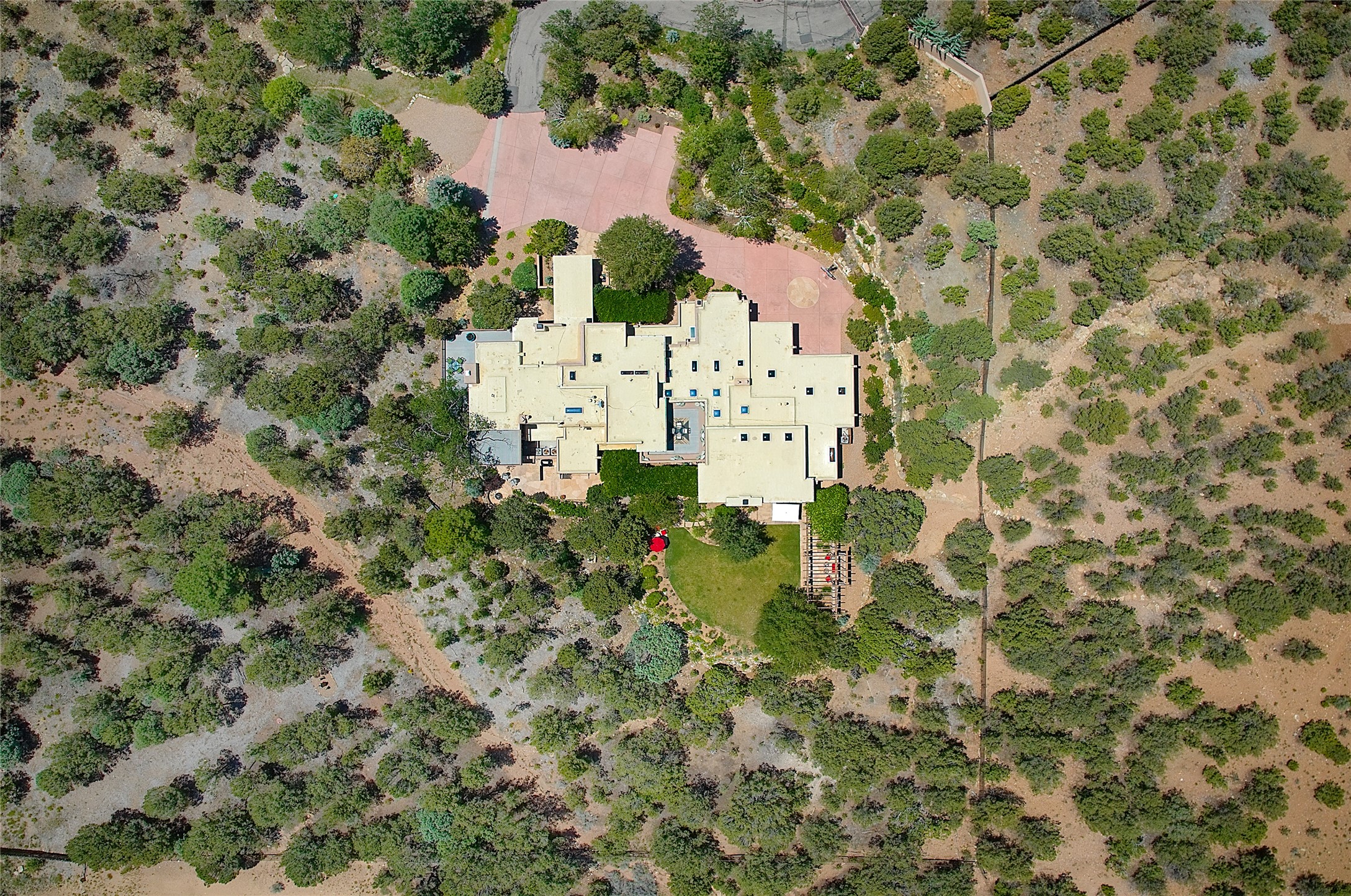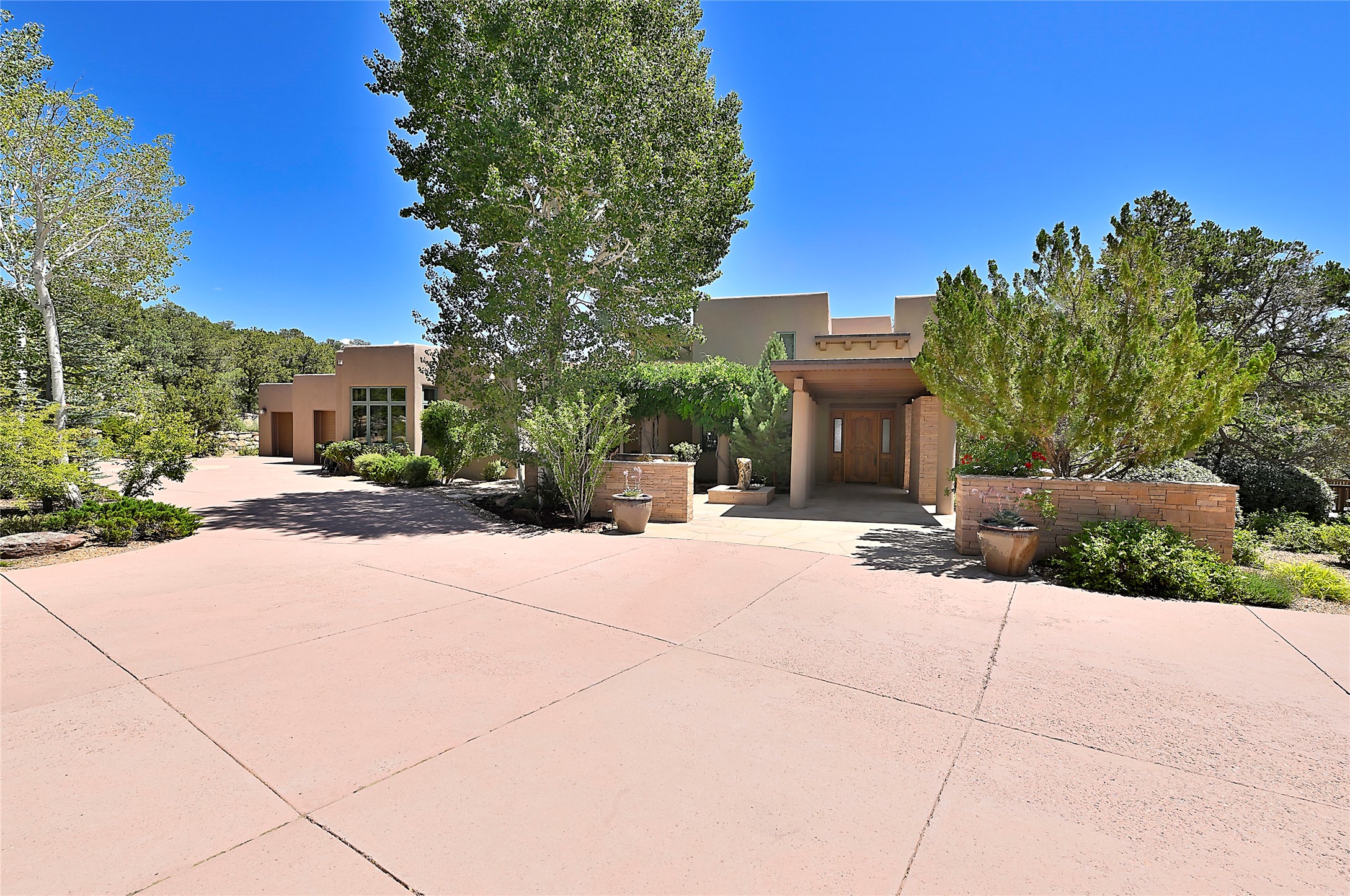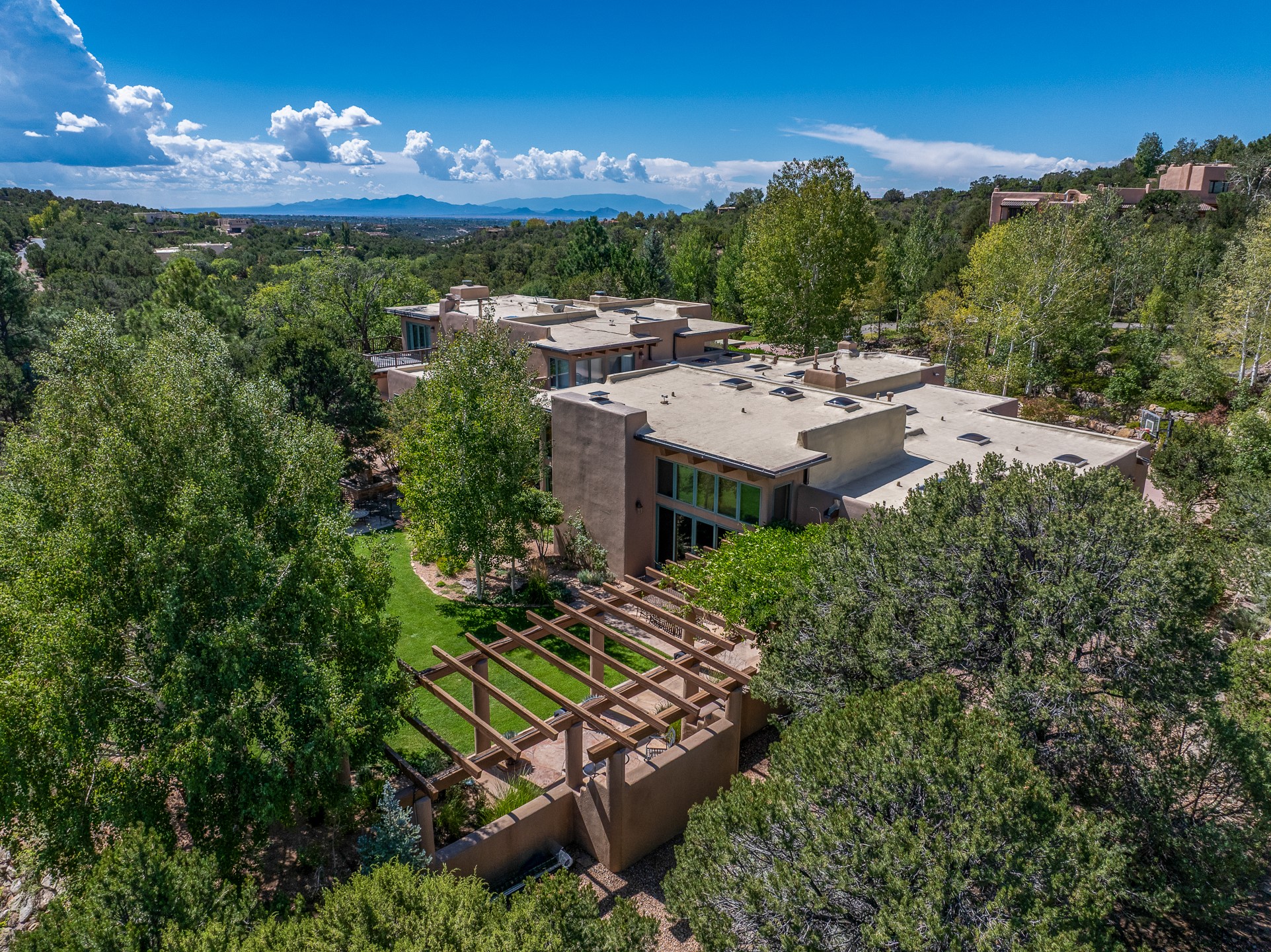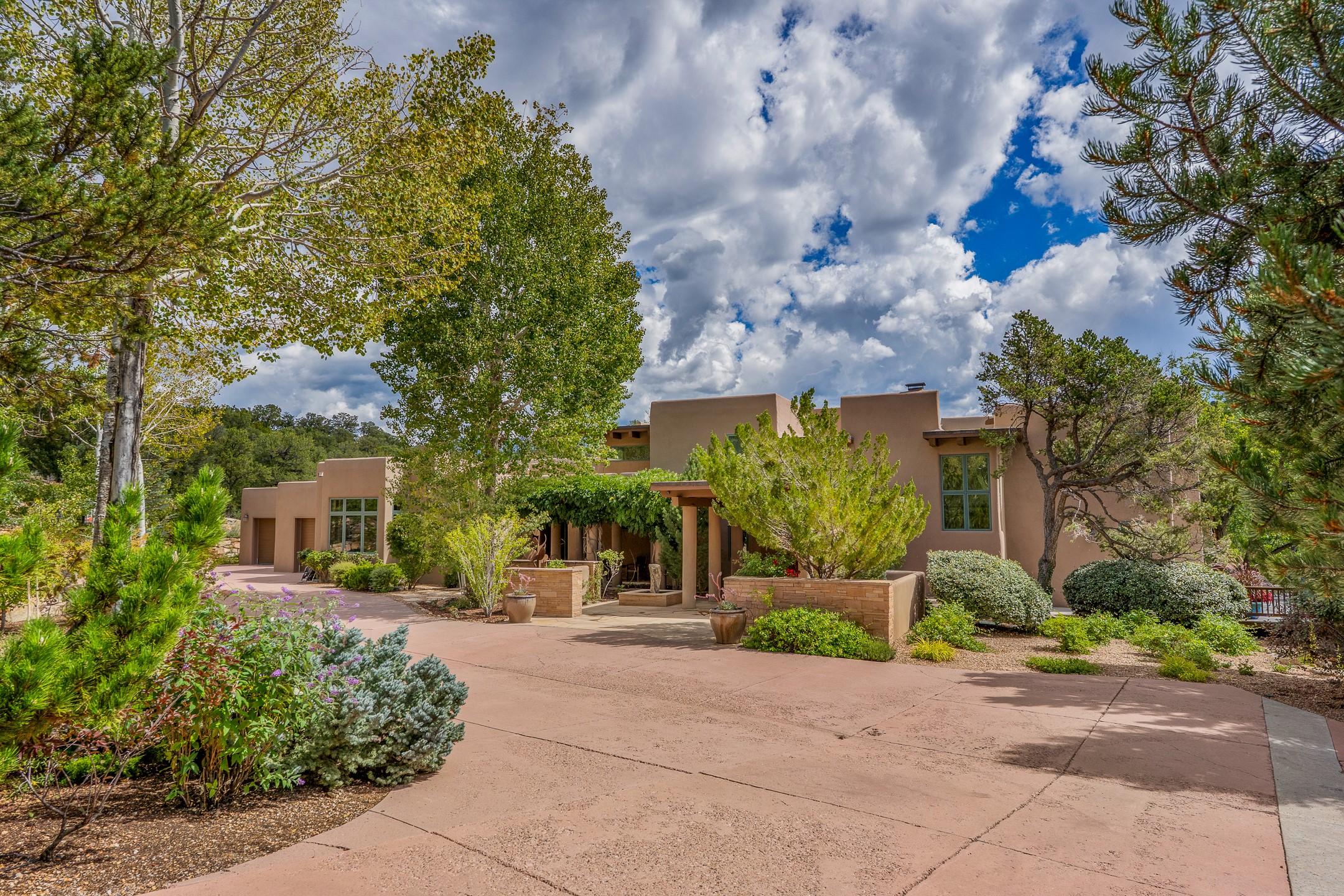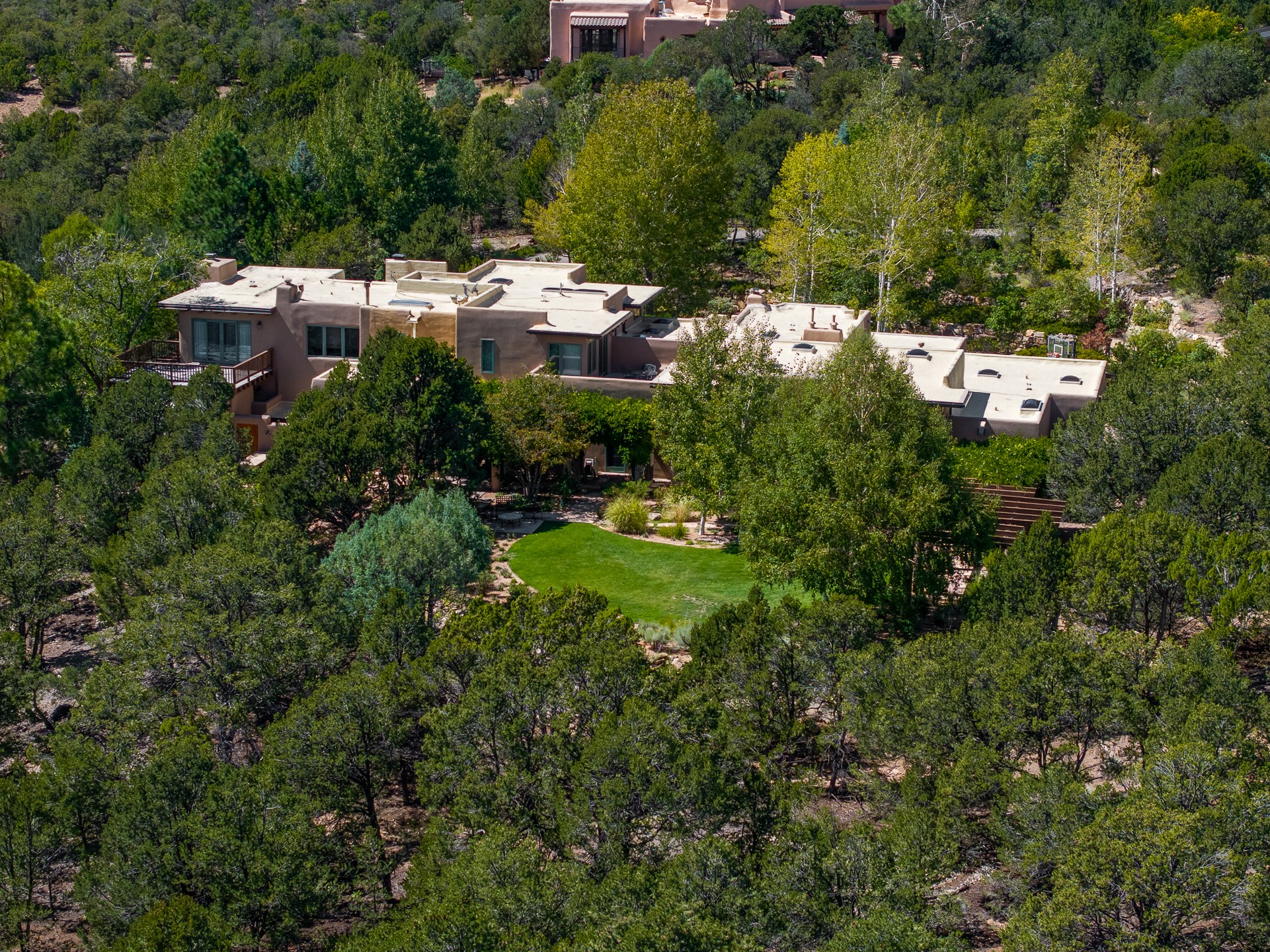 Perched on over 3 lush acres in one of Santa Fe's most coveted enclaves, this exceptional estate offers a rare synthesis of space, serenity, and natural beauty. It is less than 10 minutes from the plaza and the city's extensive mountain hiking trails are only a short walk away. Designed with both privacy and flexibility in mind, the residence unfolds across two thoughtfully connected wings, encompassing five bedrooms and a range of inviting communal and intimate spaces. It is ideally suited for multigenerational living, entertaining, or even a creative retreat.The main level is tailored for effortless single-level living, featuring expansive formal and informal gathering areas, two nicely equipped kitchens, three bedrooms (one of which is a grand suite with a private entrance), a game room and 2 car garage. A sauna and steamroom are situated in the guest bath on the main level. Seamless indoor-outdoor living is made possible through multiple portals, decks, and lawn spaces, framed by towering Aspens, Ponderosa Pines and Pinons, with manicured lawn and gardens, tranquil water features, and sweeping mountain views.Upstairs, two spacious en-suite bedrooms each open to their own private view decks, offering peaceful havens for rest, reading, or quiet contemplation. The home is connected to city utilities, has central air conditioning and heat and has been meticulously maintained, ensuring comfort, durability, and modern ease.Properties of this caliber, combining architectural versatility, natural grace, and premier location, are seldom available. Additional contiguous parcels totaling over 11 acres with commanding hilltop views may be acquired separately, offering a rare opportunity to expand and create an even more secluded private compound.