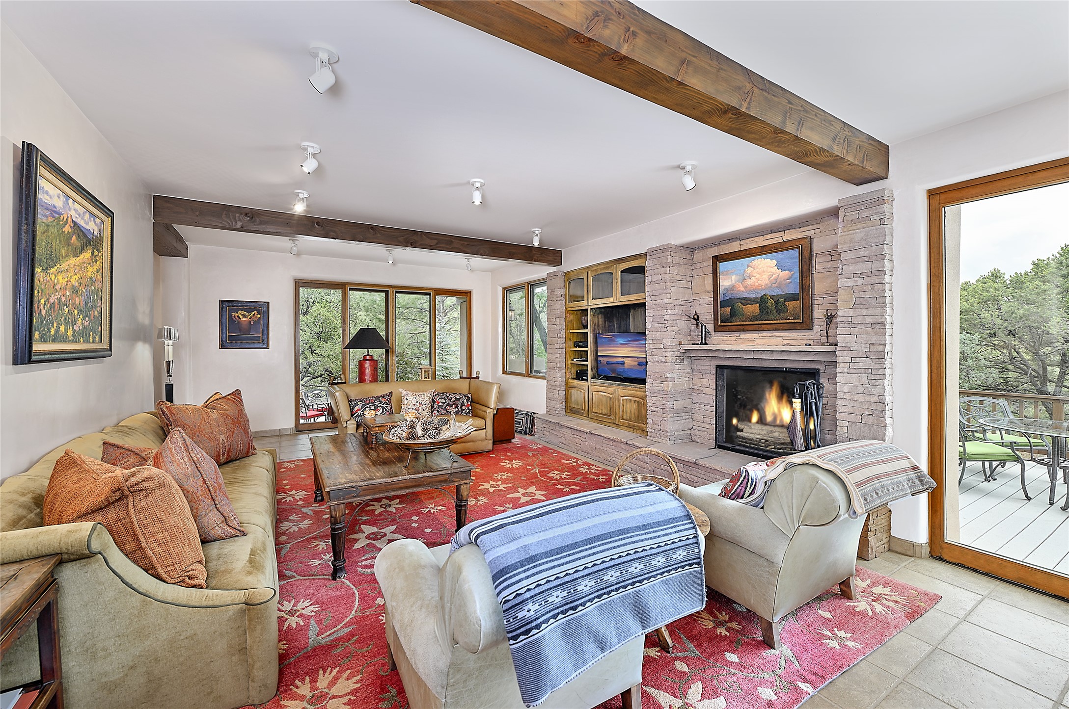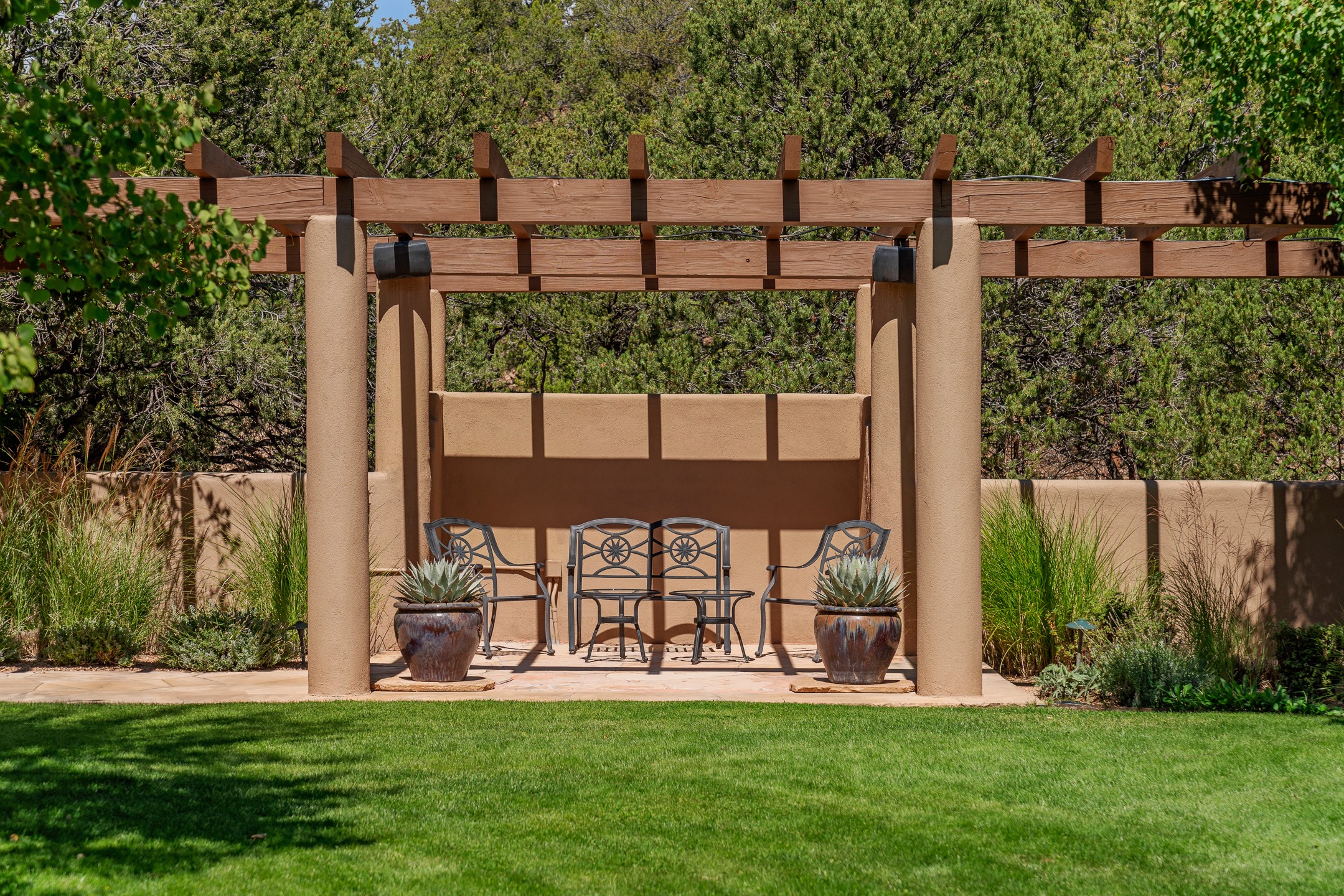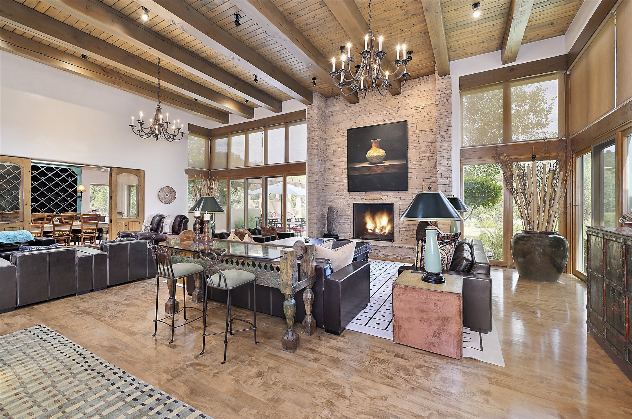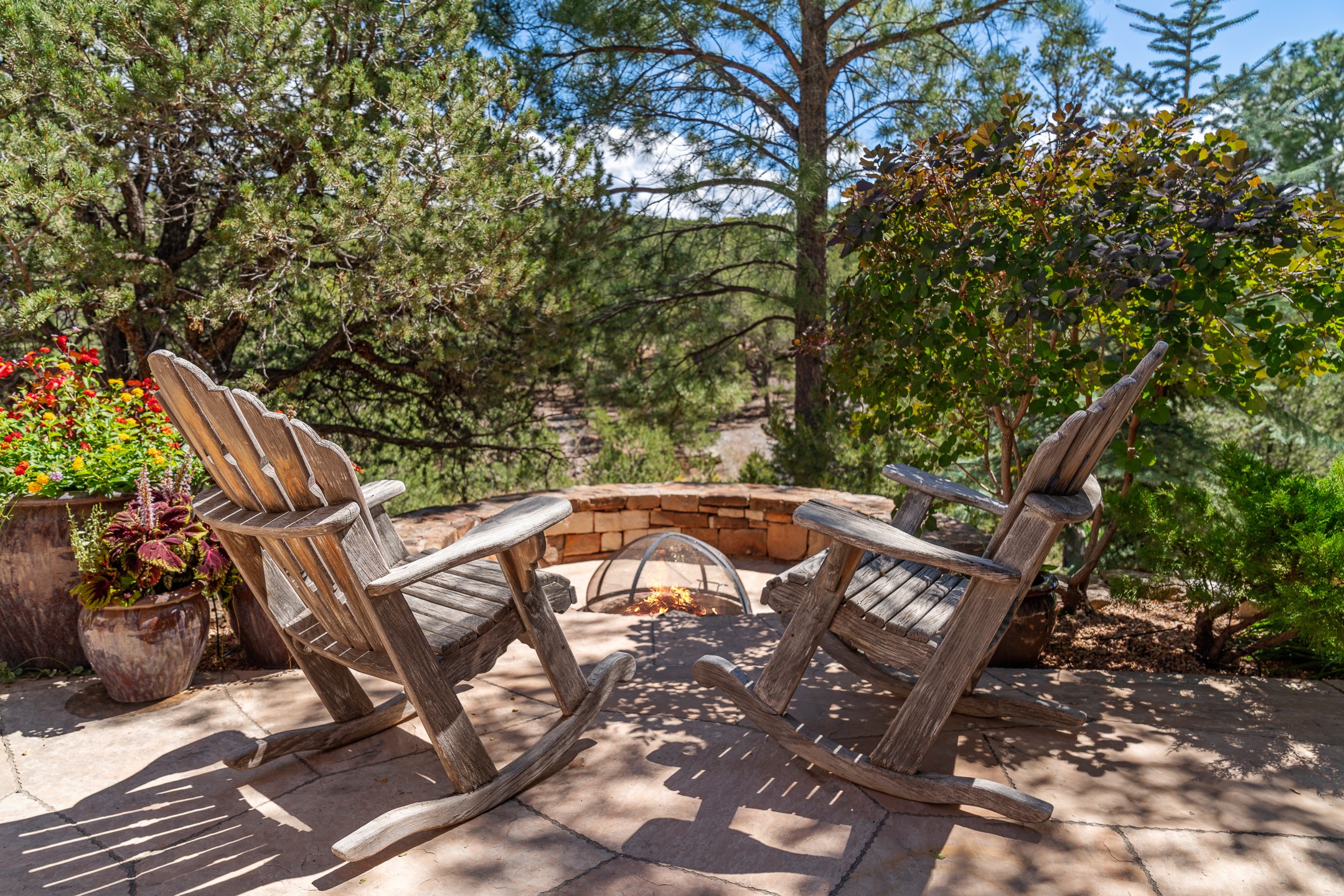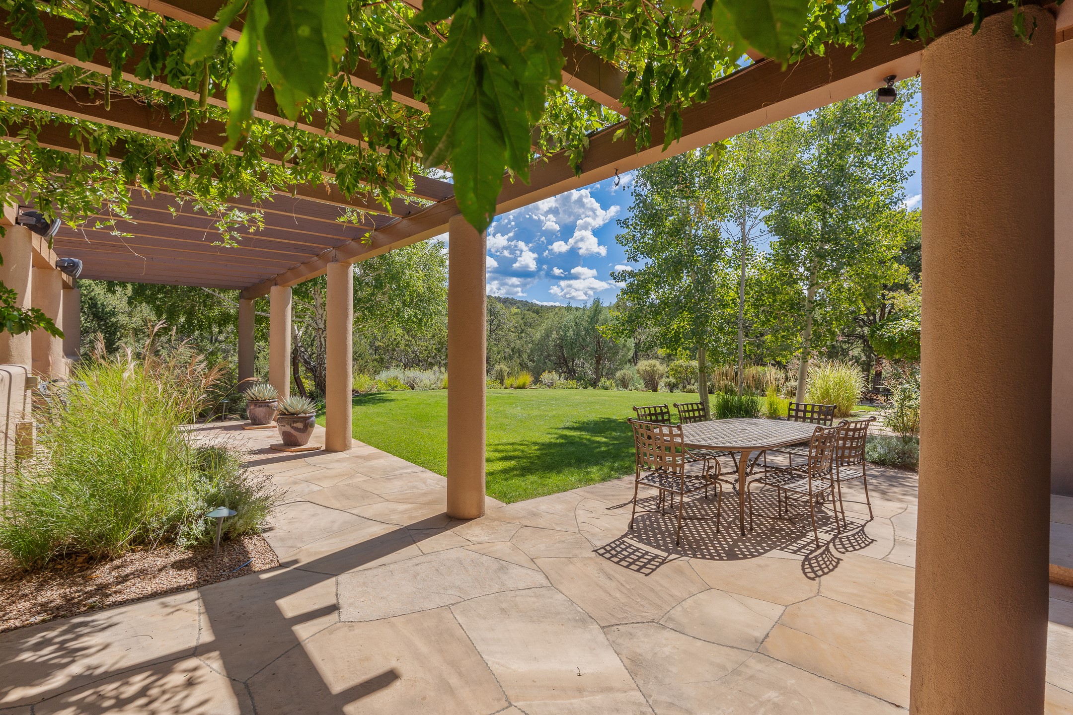 Perched on over 3 lush acres in one of Santa Fe's most coveted enclaves, this exceptional estate offers a rare synthesis of space, serenity, and natural beauty. It is less than 10 minutes from the plaza and the city's extensive mountain hiking trails are only a short walk away. Designed with both privacy and flexibility in mind, the residence unfolds across two thoughtfully connected wings, encompassing five bedrooms and a range of inviting communal and intimate spaces. It is ideally suited for multigenerational living, entertaining, or even a creative retreat.The main level is tailored for effortless single-level living, featuring expansive formal and informal gathering areas, two nicely equipped kitchens, three bedrooms (one of which is a grand suite with a private entrance), a game room and 2 car garage. A sauna and steamroom are situated in the guest bath on the main level. Seamless indoor-outdoor living is made possible through multiple portals, decks, and lawn spaces, framed by towering Aspens, Ponderosa Pines and Pinons, with manicured lawn and gardens, tranquil water features, and sweeping mountain views.Upstairs, two spacious en-suite bedrooms each open to their own private view decks, offering peaceful havens for rest, reading, or quiet contemplation. The home is connected to city utilities, has central air conditioning and heat and has been meticulously maintained, ensuring comfort, durability, and modern ease.Properties of this caliber, combining architectural versatility, natural grace, and premier location, are seldom available. Additional contiguous parcels totaling over 11 acres with commanding hilltop views may be acquired separately, offering a rare opportunity to expand and create an even more secluded private compound.