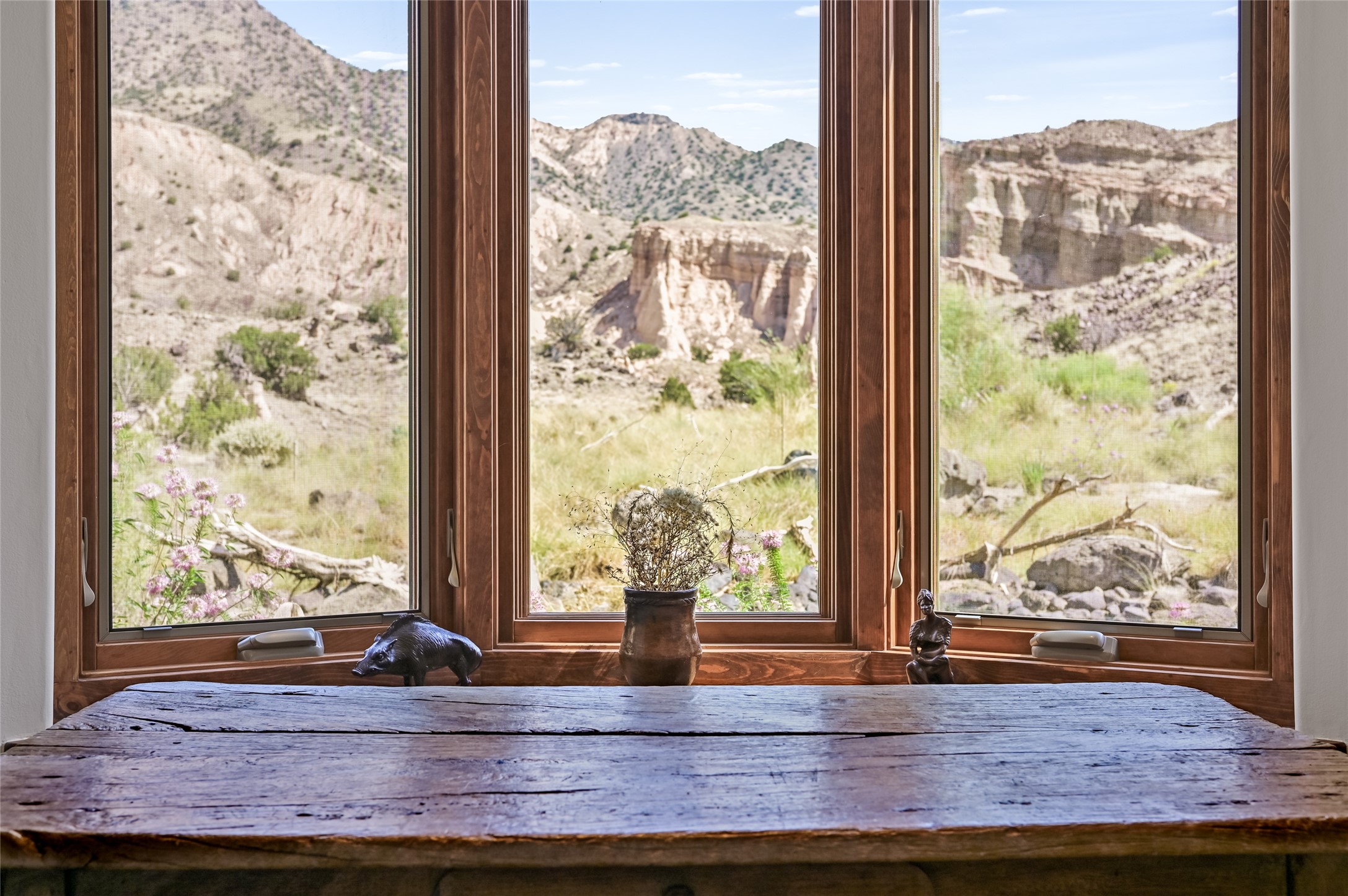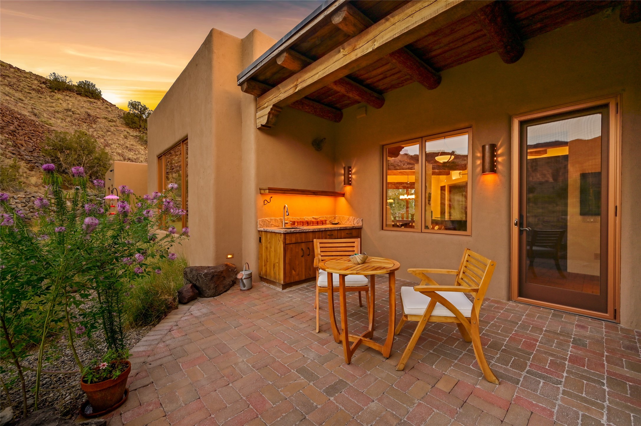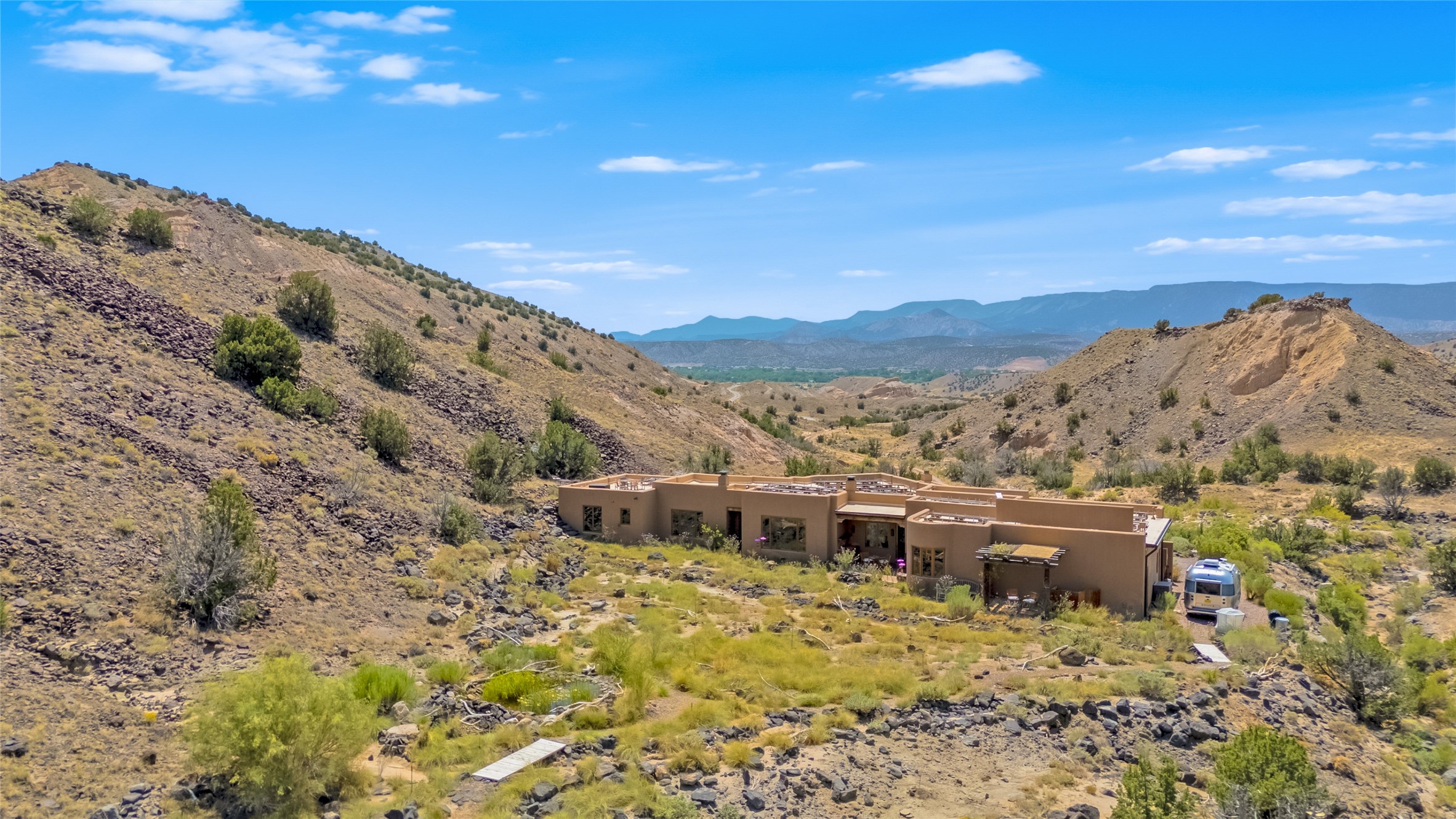A rare opportunity to own a private wilderness sanctuary, on the market for the first time. This 39-acre self-sustaining refuge, lovingly named Rincn Escondido, "Hidden Corner," is tucked away in the foothills of Sierra Negra and borders Carson National Forest, offering unparalleled privacy just one hour from Santa Fe. Panoramic views of Cerro Pedernal, Sierra Negra, and the Jmez Mountains stretch across rewilded meadows, pollinator gardens, and a tranquil pond with a cascading waterfall.The 4,032 sq ft property combines a 3,059 sq ft residence with a heated garage and storage room, offering an additional 973 sq ft of versatile space. The home blends timeless Southwestern architecture with refined modern finishes, including hand-carved wood doors, artisan detailing, and locally sourced Namb brick floors that flow throughout. Each room is designed to maximize natural light and frame dramatic vistas. A chef's kitchen features a Sub-Zero fridge/freezer, Wolf oven, induction cooktop, and custom craftsmanship, while the spa-inspired primary suite offers a deep soaking tub and walk-in shower.Built for environmental stewardship, the home is fully powered by a grid-tied 20.16 kW photovoltaic system with four Tesla Powerwall 3 batteries and solar-thermal hot water. Passive solar design, radiant in-floor heating and cooling, and high-efficiency systems ensure year-round comfort.Whether a spiritual retreat, sustainable homestead, or luxury escape, this private refuge is more than a home--it is a living sanctuary.Video Link: https://youtu.be/VyCAPihgIhU