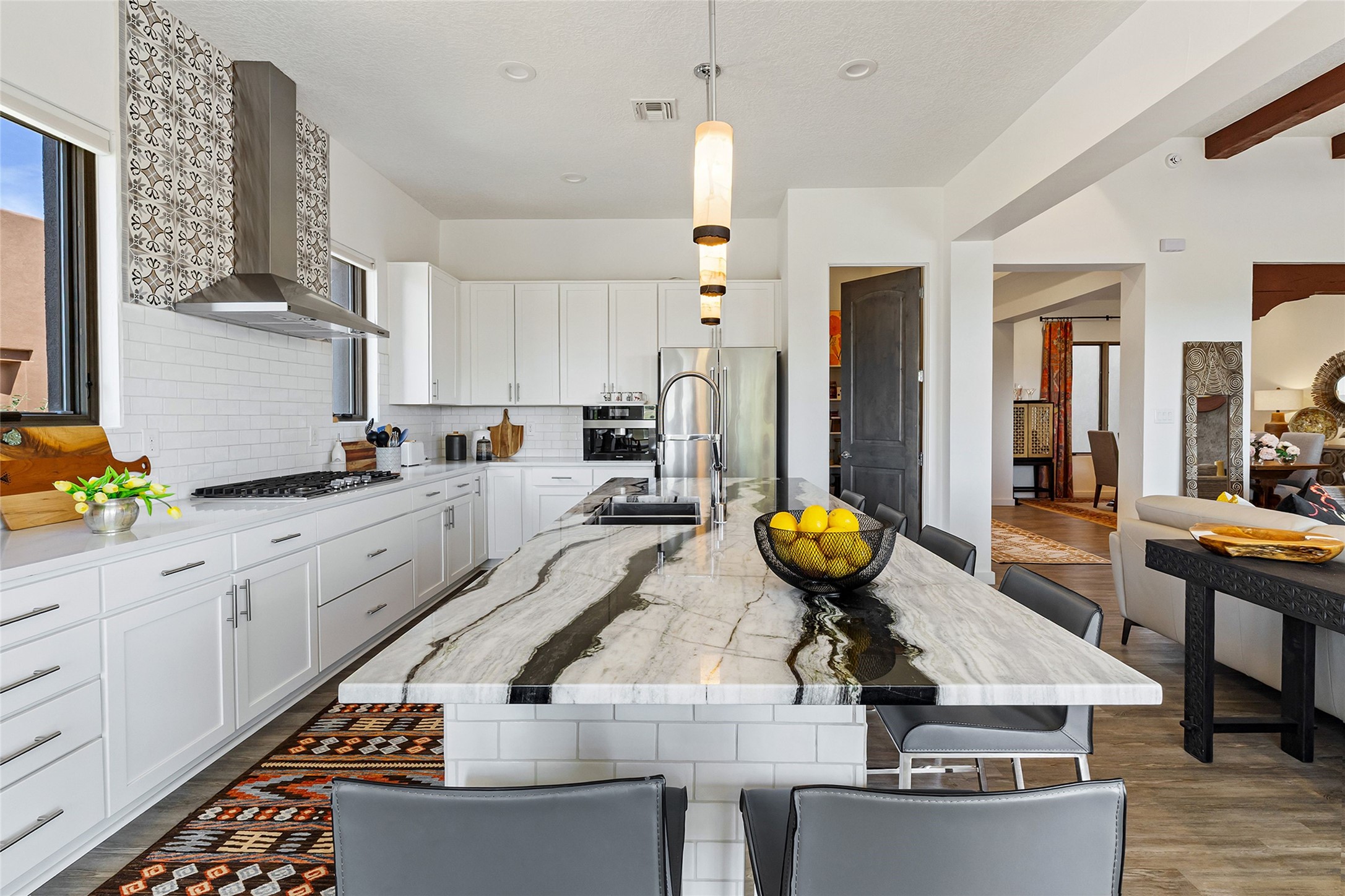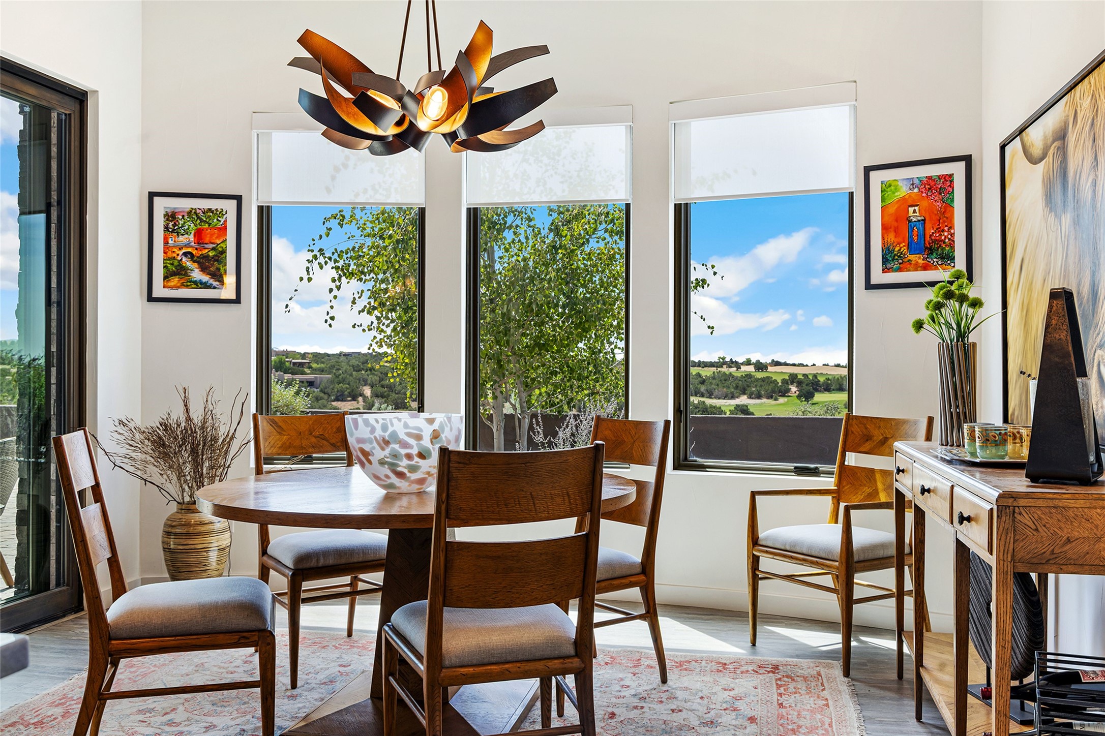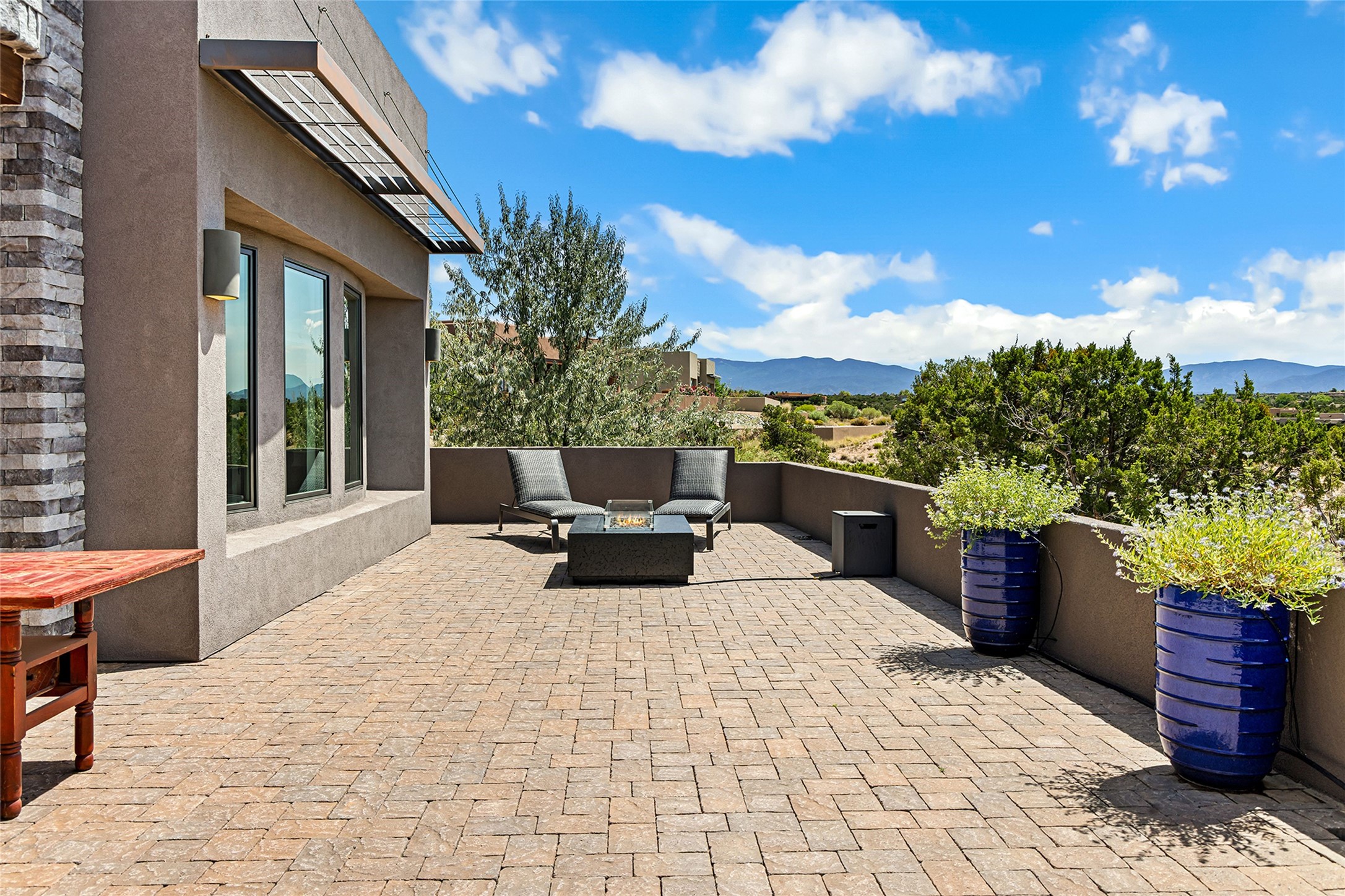 Experience the ultimate Las Campanas lifestyle with stunning golf course views and just a short walk to The Club at Las Campanas! Elevated above it all, this beautifully upgraded and custom-designed Santa Fe retreat offers four bedrooms and four bathrooms in a turnkey package, including all furnishings and artwork. Boasting exceptional golf course and sunset views, this exciting home seamlessly combines contemporary architecture with Santa Fe warmth. Sited on an elevated view lot, the residence welcomes you through a private, gated front courtyard featuring a tranquil fountain. Inside, the spacious, open-concept great room showcases breathtaking golf course views, a gas fireplace with stone accents, and a generous dining area. The newly updated chef's kitchen is a culinary dream, with natural stone countertops, an expansive island, a walk-in pantry, top-of-the-line appliances, and a casual dining space.The luxurious owner's suite offers a curved wall of windows framing the stunning views, along with a renovated en-suite bath featuring dual vanities, a soaking tub, walk-in shower, and a spacious walk-in closet. The separate guest wing provides three additional bedrooms for complete privacy from the main living areas.Step outside to an exceptional outdoor living space, one of the finest in Las Campanas, overlooking dual golf fairways and the newly opened Jemez Putting Course. Entertain effortlessly with a newly installed pizza oven, built-in BBQ grill, covered portal, and enclosed courtyard--perfect for pets and privacy.This defines excellence and offers an incredible and immediate opportunity to start enjoying the Santa Fe lifestyle. The owner's Equity Golf Membership to The Club at Las Campanas is also available for purchase separately.
