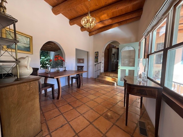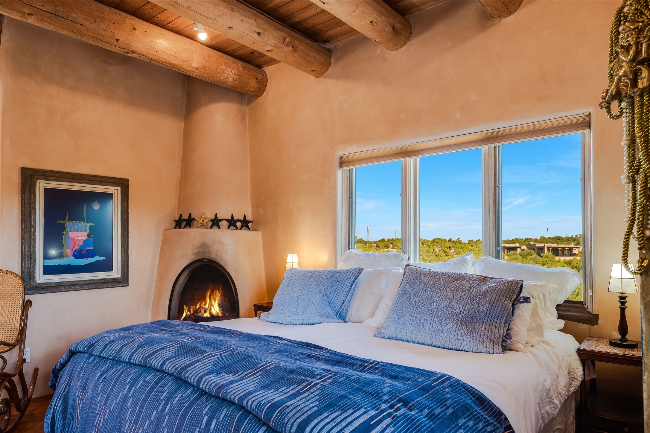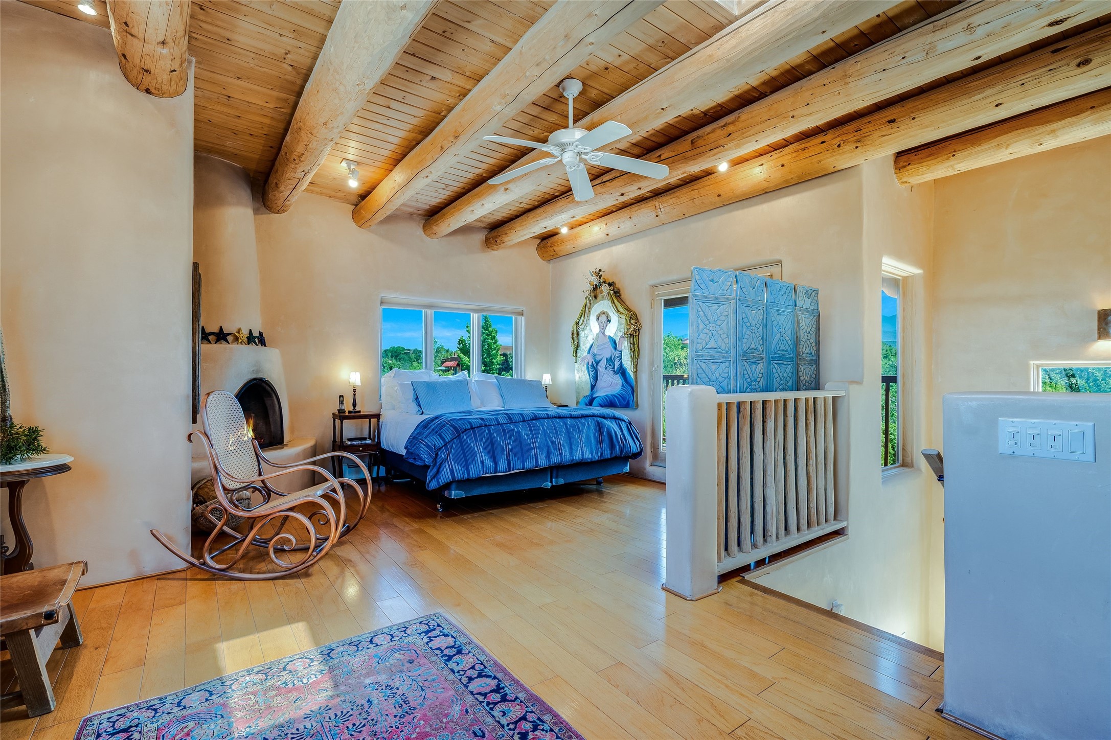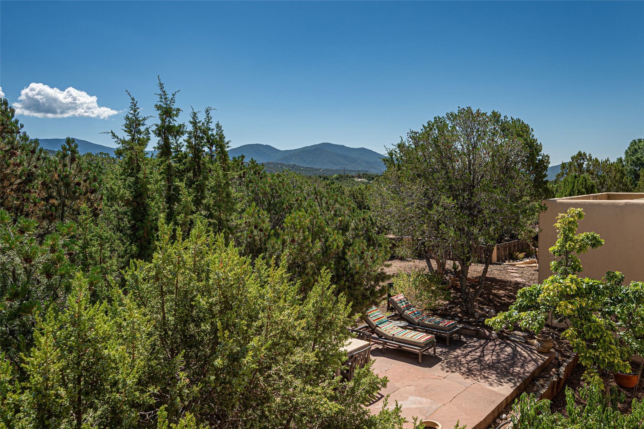 This handsome traditional residence is graced with enchanting and abundant architectural elements, including soaring ceilings, vigas, latillas, exceptional tilework, and arched doorways, as well as breathtaking sunsets and stunning mountain views. Warmth and elegance are hallmarks of this beautiful property, just five minutes from the Santa Fe Plaza. On over an acre on the coveted north side, the impressive size of the rooms is superb for both entertaining and private luxurious enjoyment. Abundant outdoor areas, accessible from several rooms, are embraced by handsome coyote and post-fencing, and stunning evergreens. Delightful alfresco and entertaining options include a dining portal, a grill area, and flagstone terraces. The flexible floor plan, with two kitchens, living and dining areas, is ideal for multi-generational living, or as a single residence with fabulous guest wing. There are two oversized principal suites, one with sweeping mountain views. The generous family room has a lovely fireplace, custom cabinetry, and French doors to a private terrace. The impressive dining room with an adjacent buffet area, is marvelous for gatherings with friends and family. There is also a beautiful library/music room that easily accommodates a grand piano - an extraordinary offering.