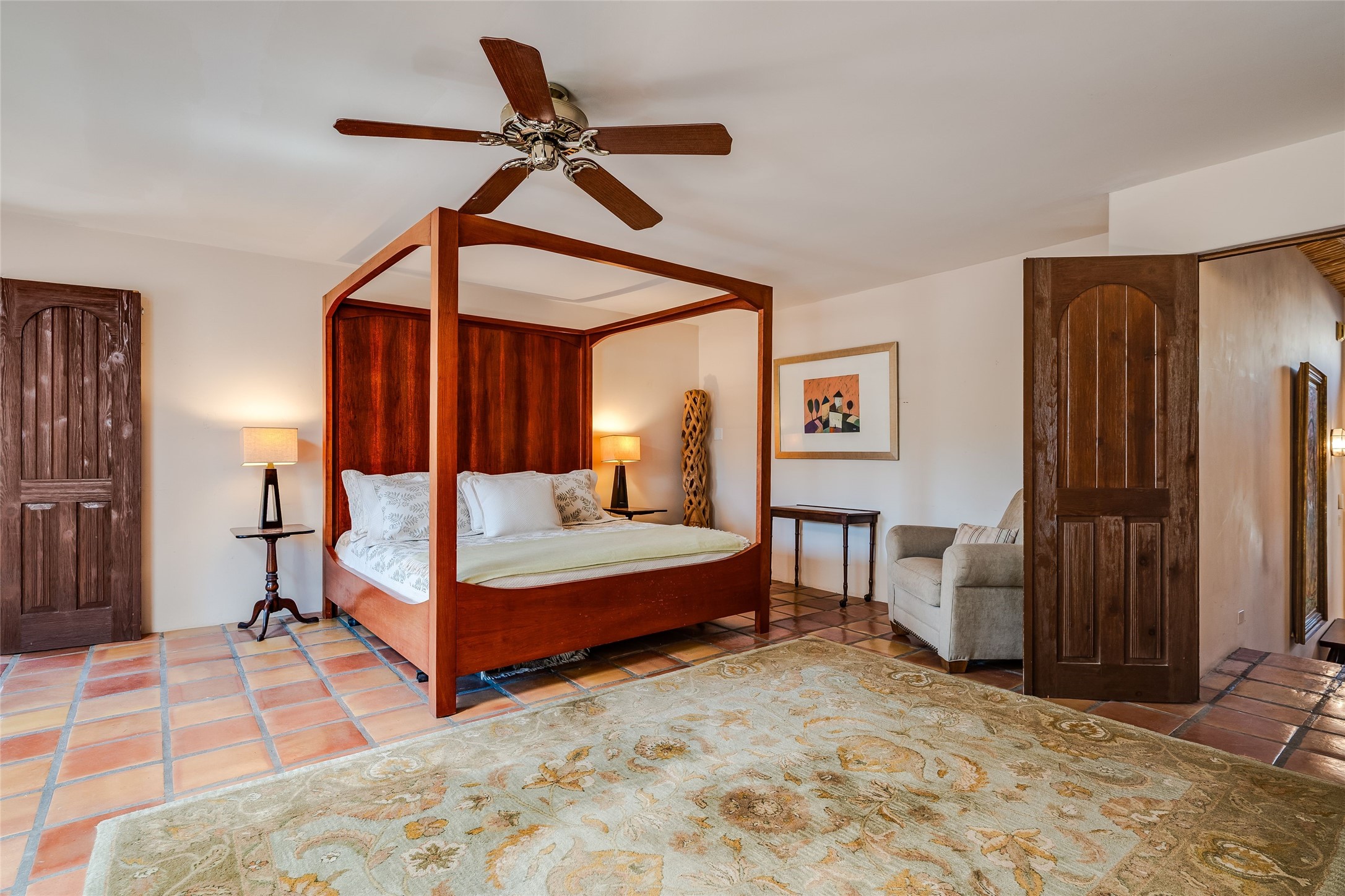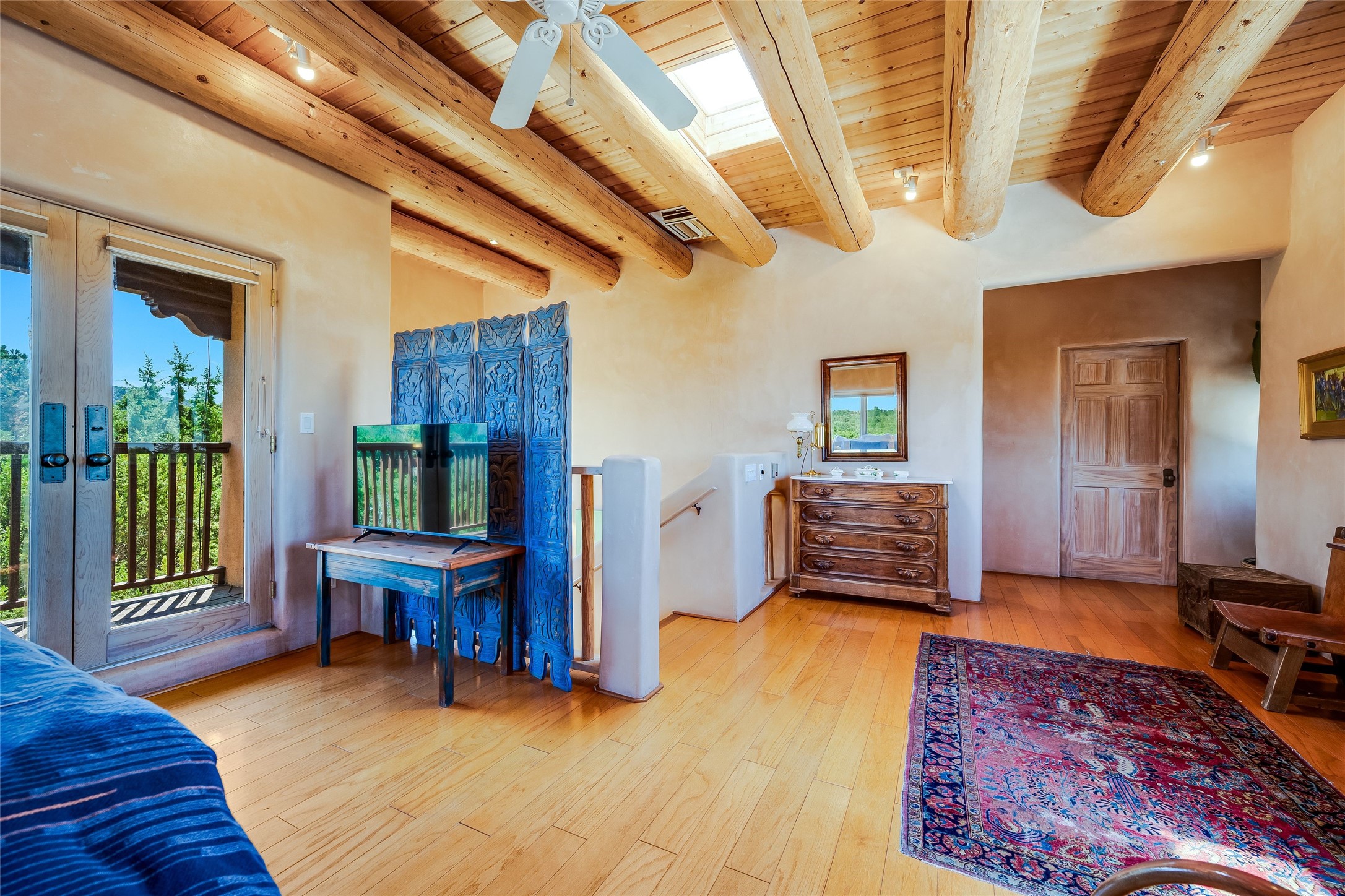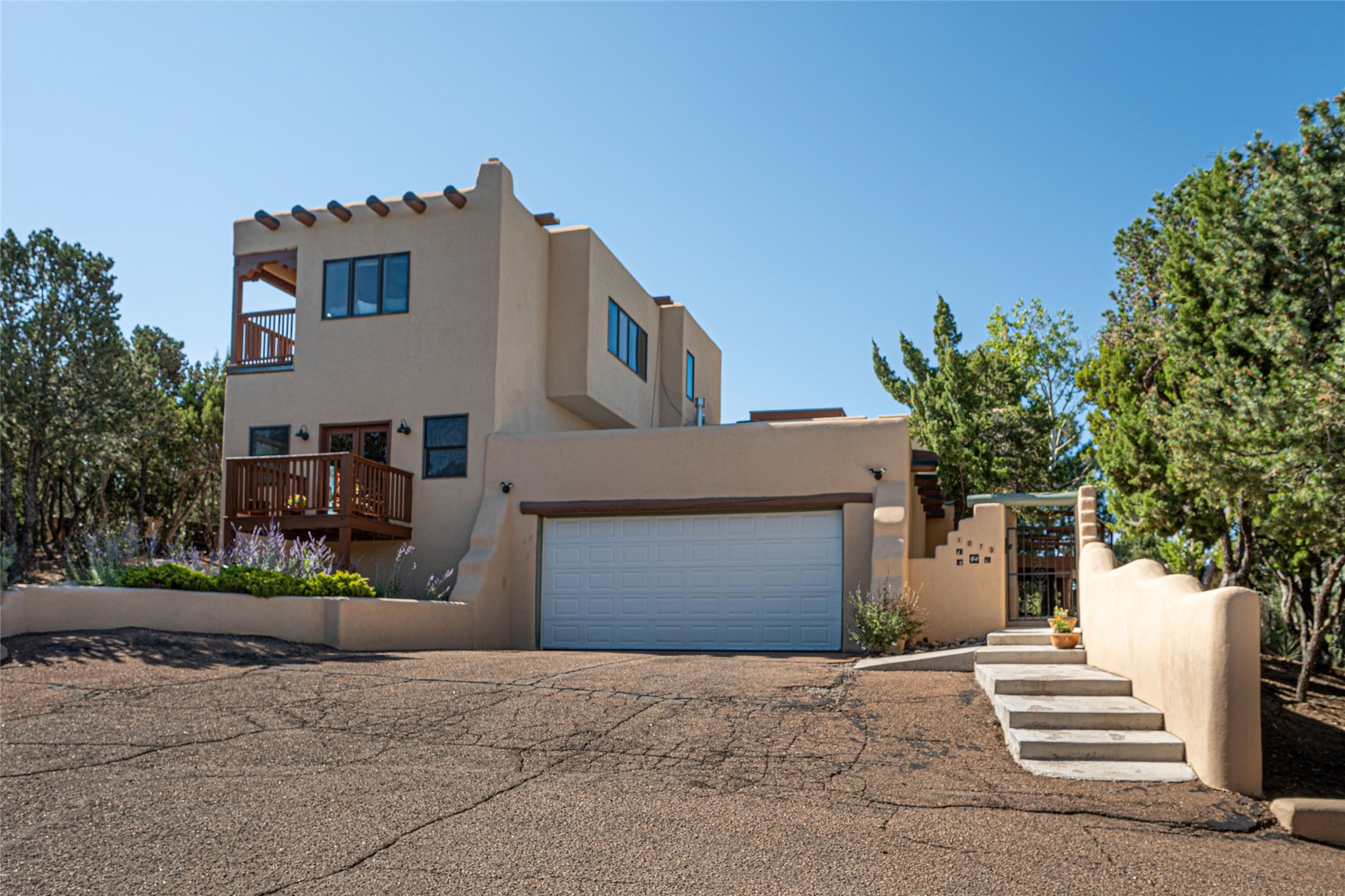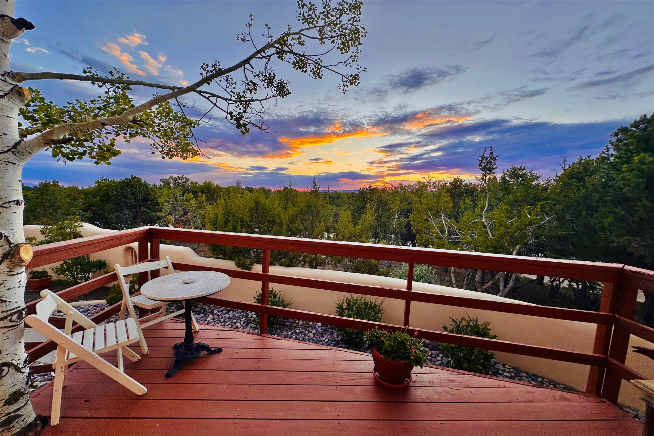 This handsome traditional residence is graced with enchanting and abundant architectural elements, including soaring ceilings, vigas, latillas, exceptional tilework, and arched doorways, as well as breathtaking sunsets and stunning mountain views. Warmth and elegance are hallmarks of this beautiful property, just five minutes from the Santa Fe Plaza. On over an acre on the coveted north side, the impressive size of the rooms is superb for both entertaining and private luxurious enjoyment. Abundant outdoor areas, accessible from several rooms, are embraced by handsome coyote and post-fencing, and stunning evergreens. Delightful alfresco and entertaining options include a dining portal, a grill area, and flagstone terraces. The flexible floor plan, with two kitchens, living and dining areas, is ideal for multi-generational living, or as a single residence with fabulous guest wing. There are two oversized principal suites, one with sweeping mountain views. The generous family room has a lovely fireplace, custom cabinetry, and French doors to a private terrace. The impressive dining room with an adjacent buffet area, is marvelous for gatherings with friends and family. There is also a beautiful library/music room that easily accommodates a grand piano - an extraordinary offering.