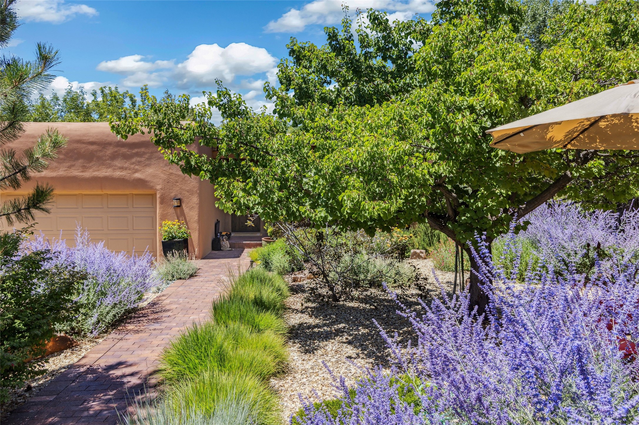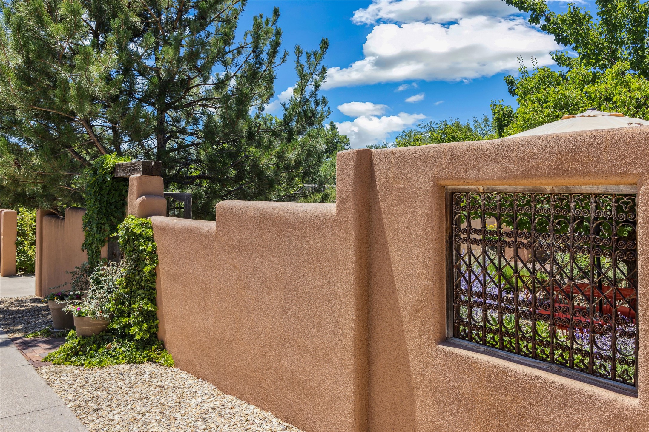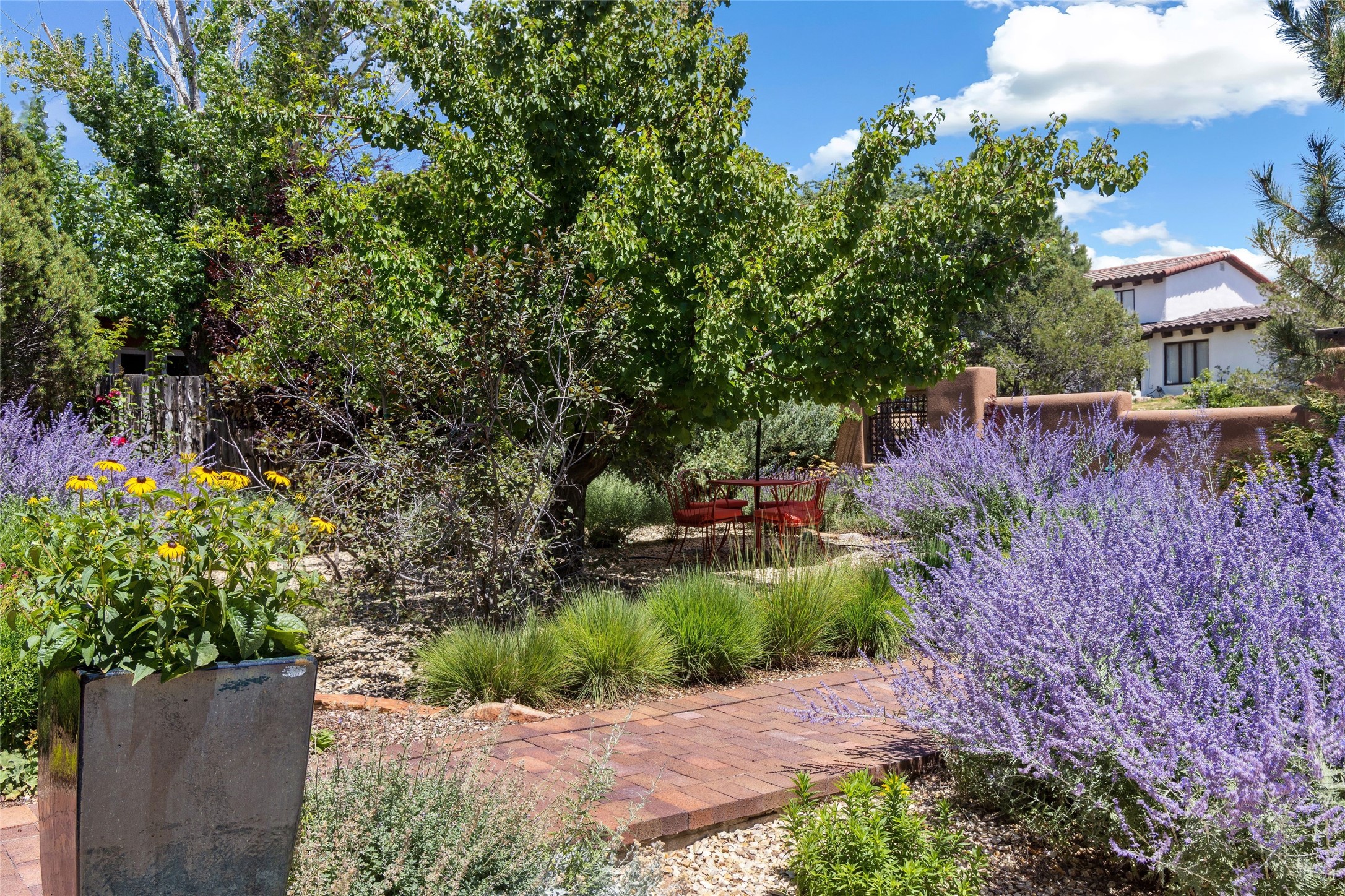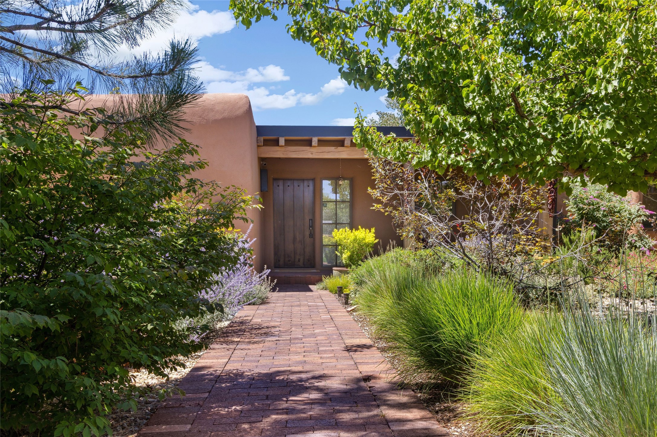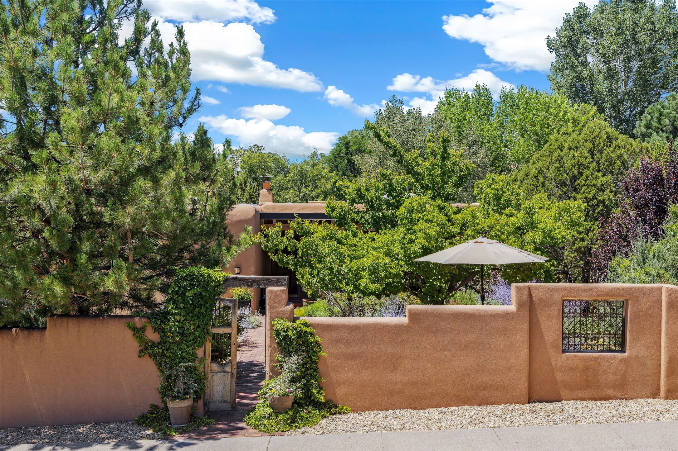 Nestled behind a private stucco-walled garden bursting with seasonal flowers, this single-level Santa Fe-style home reflects almost two decades of thoughtful design by its creative owners. Every detail tells a story--authentic, warm, and perfectly tailored for modern living. The convenient in town location is only blocks from the storied South Capital neighborhood. Step inside to discover sunlit interiors with rich hardwood floors, wood beamed ceilings, skylights, and an open flow that connects the heart of the home. The island kitchen, crowned with raised ceilings and Kitchen Aid appliances offers generous counter space and seamlessly opens to a cozy den anchored by a traditional kiva fireplace. The center hall floor plan offers a dining room with coved ceilings and views of an outdoor grilling patio with arbor. The sunken living room with corner kiva fireplace has access to the side courtyard with Aspen trees and fountain. The spacious bedrooms share an updated dual vanity bathroom with shower. The primary opens to the connecting side fountain courtyard. A luxurious laundry room, abundant storage, oversized attached two car garage and secondary gated driveway completes this home. Many updates over the years since ownership include adding landscaping, adding a front portal, replacing the windows/doors, updating the roof and stucco. Multiple outdoor living spaces invite you to savor Santa Fe's magical light--from mountain views from the front garden, morning coffee in the courtyard to evening gatherings under the stars. The landscaped grounds are a private sanctuary, with vibrant flowers and native plantings creating year-round beauty. This is more than a home--it's a carefully curated work of art, blending classic Southwestern architecture with the comfort and style of a designer's vision.