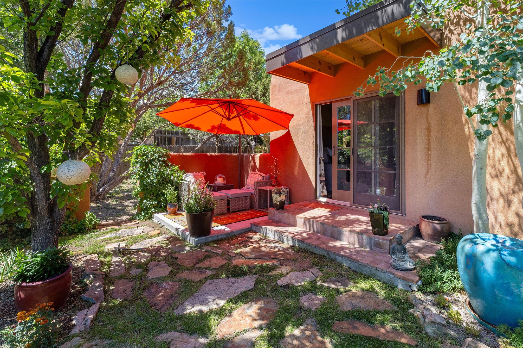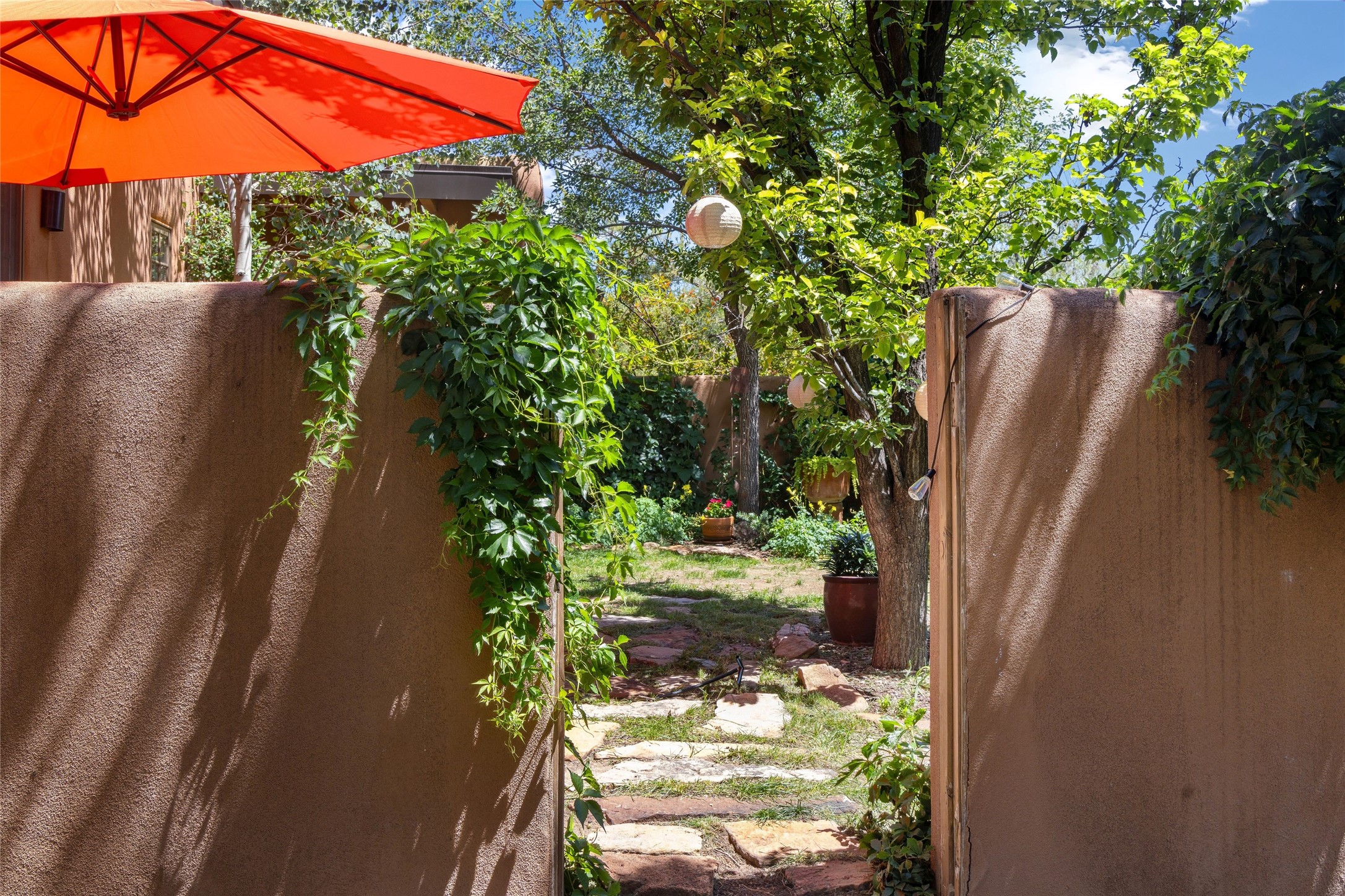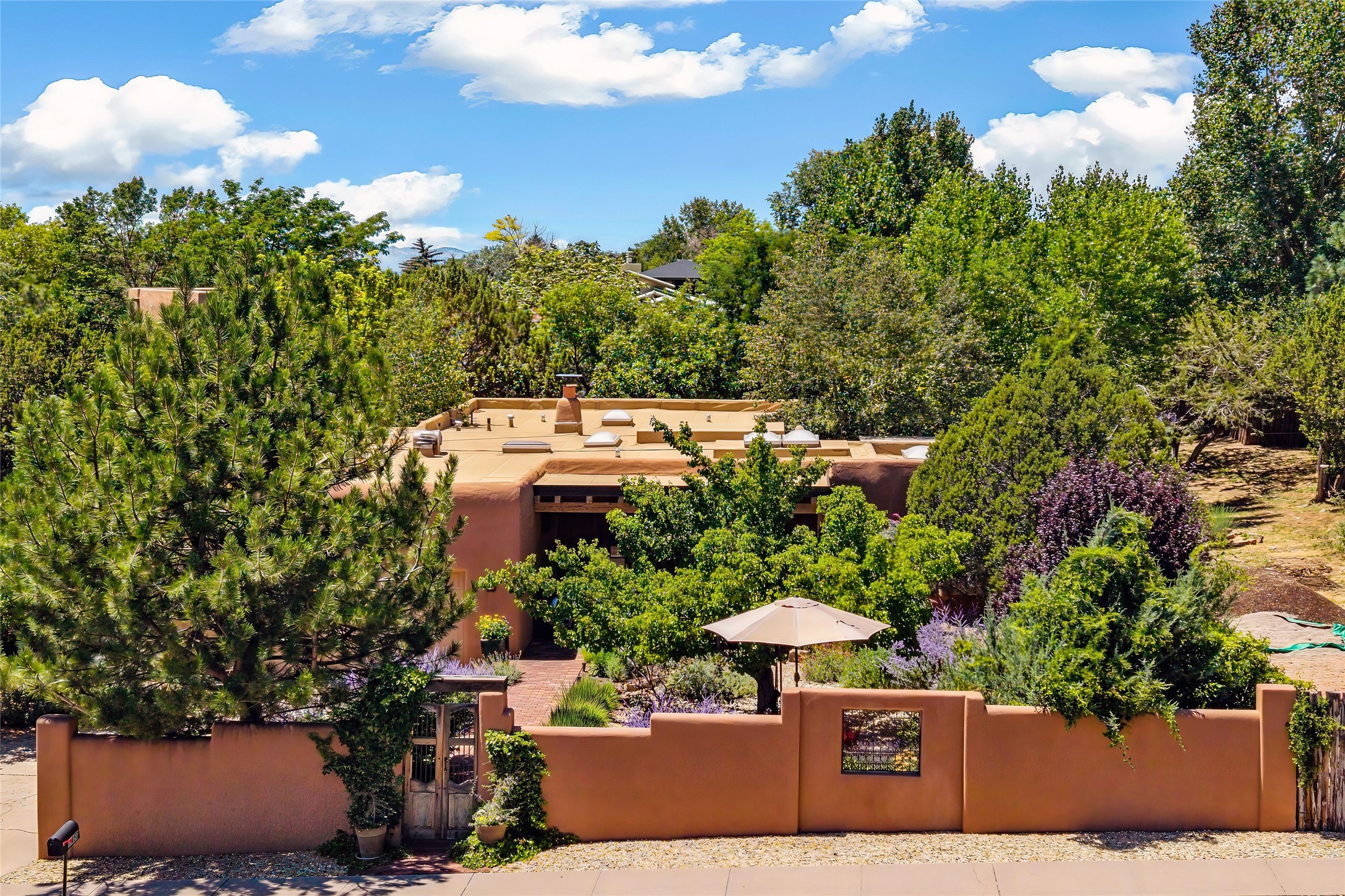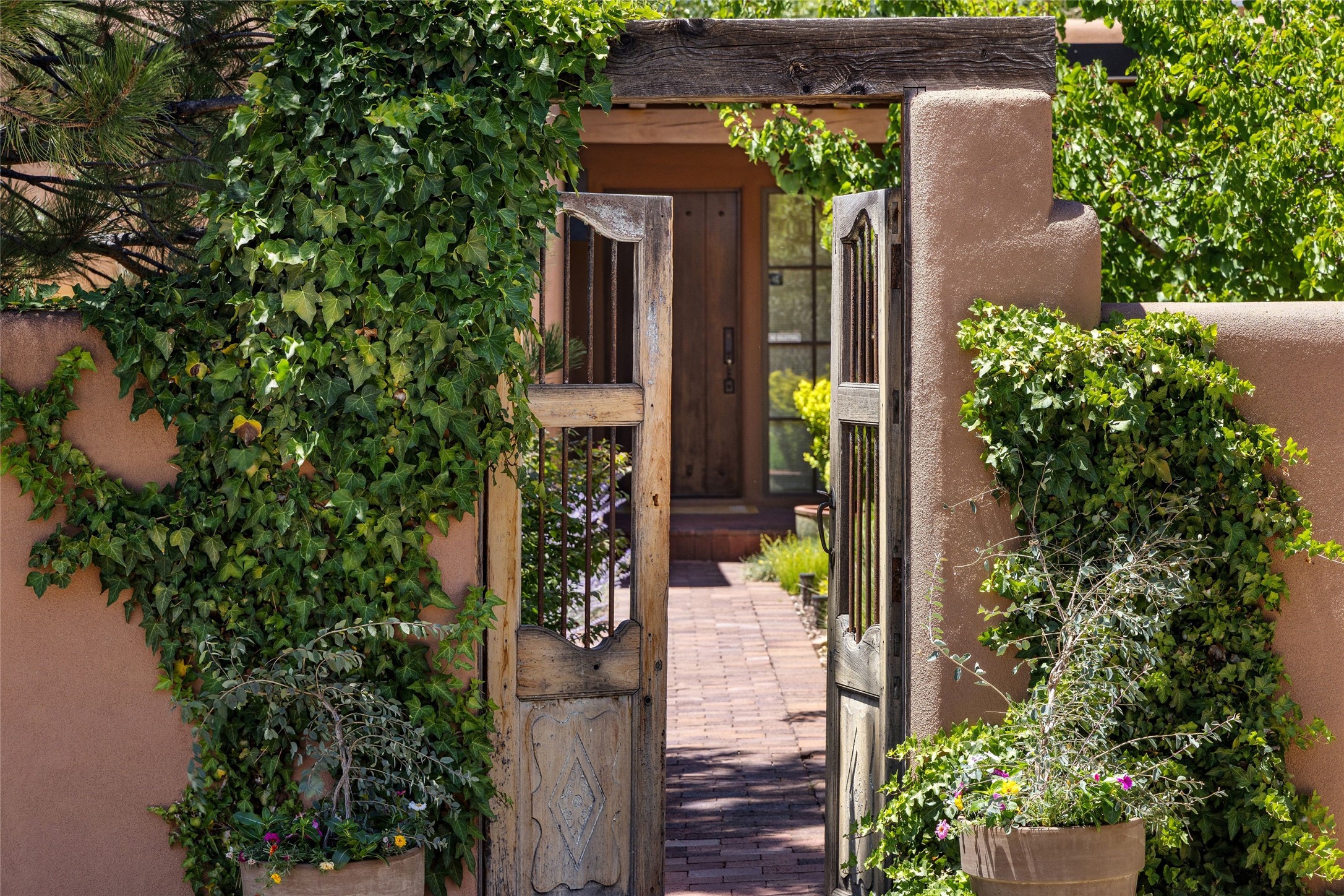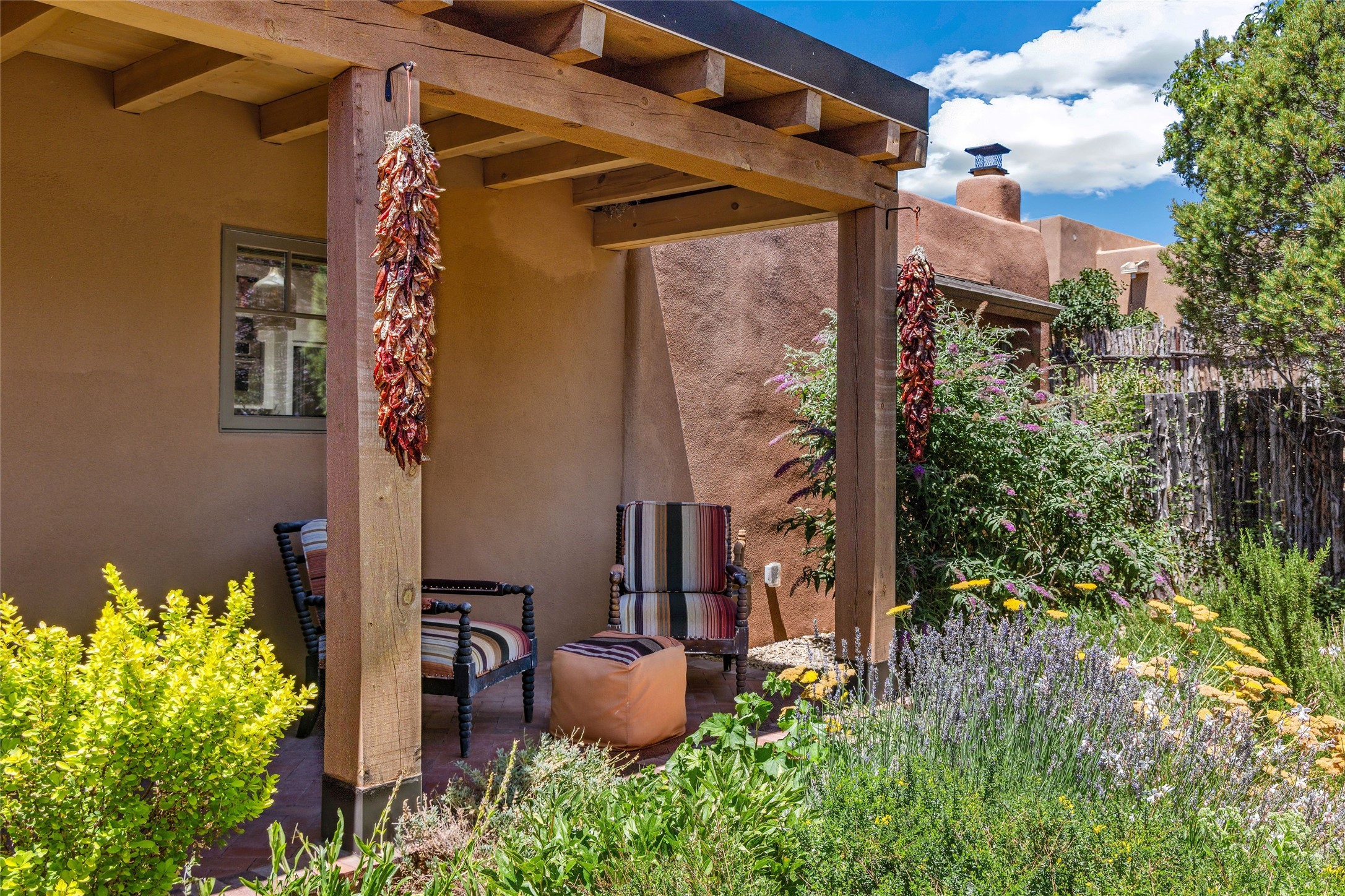 Nestled behind a private stucco-walled garden bursting with seasonal flowers, this single-level Santa Fe-style home reflects almost two decades of thoughtful design by its creative owners. Every detail tells a story--authentic, warm, and perfectly tailored for modern living. The convenient in town location is only blocks from the storied South Capital neighborhood. Step inside to discover sunlit interiors with rich hardwood floors, wood beamed ceilings, skylights, and an open flow that connects the heart of the home. The island kitchen, crowned with raised ceilings and Kitchen Aid appliances offers generous counter space and seamlessly opens to a cozy den anchored by a traditional kiva fireplace. The center hall floor plan offers a dining room with coved ceilings and views of an outdoor grilling patio with arbor. The sunken living room with corner kiva fireplace has access to the side courtyard with Aspen trees and fountain. The spacious bedrooms share an updated dual vanity bathroom with shower. The primary opens to the connecting side fountain courtyard. A luxurious laundry room, abundant storage, oversized attached two car garage and secondary gated driveway completes this home. Many updates over the years since ownership include adding landscaping, adding a front portal, replacing the windows/doors, updating the roof and stucco. Multiple outdoor living spaces invite you to savor Santa Fe's magical light--from mountain views from the front garden, morning coffee in the courtyard to evening gatherings under the stars. The landscaped grounds are a private sanctuary, with vibrant flowers and native plantings creating year-round beauty. This is more than a home--it's a carefully curated work of art, blending classic Southwestern architecture with the comfort and style of a designer's vision.