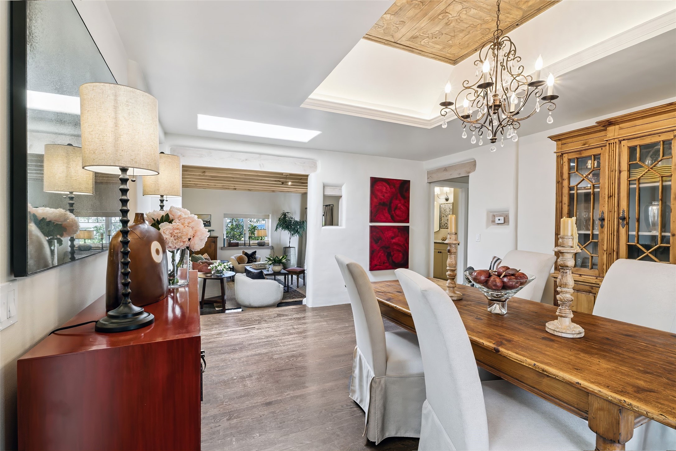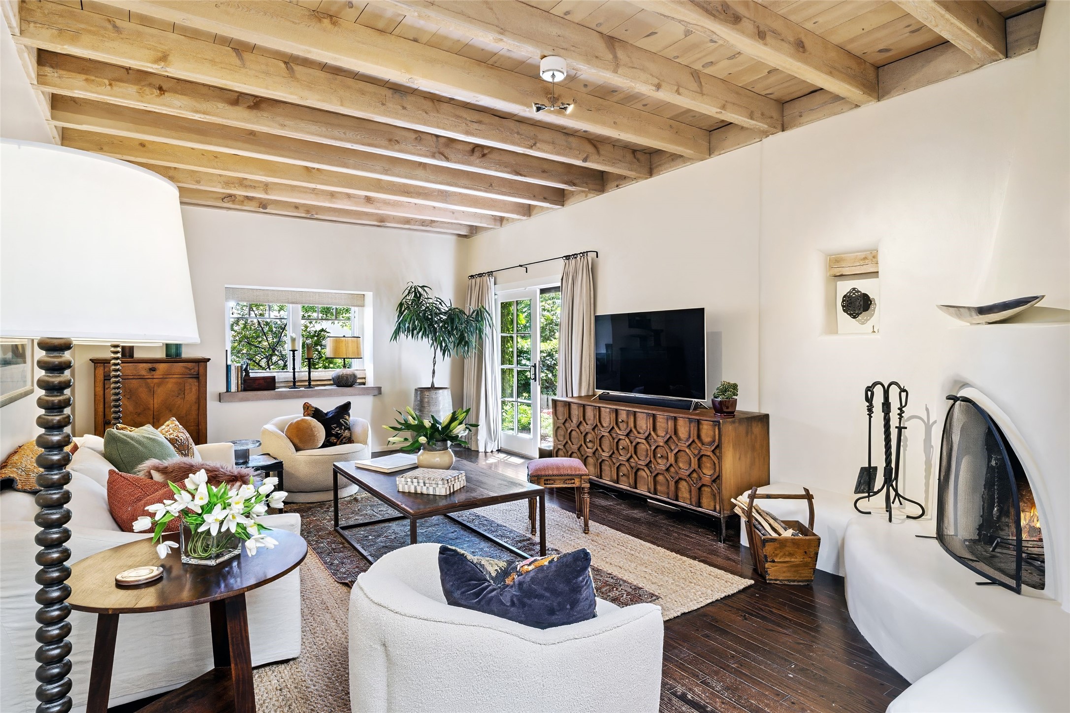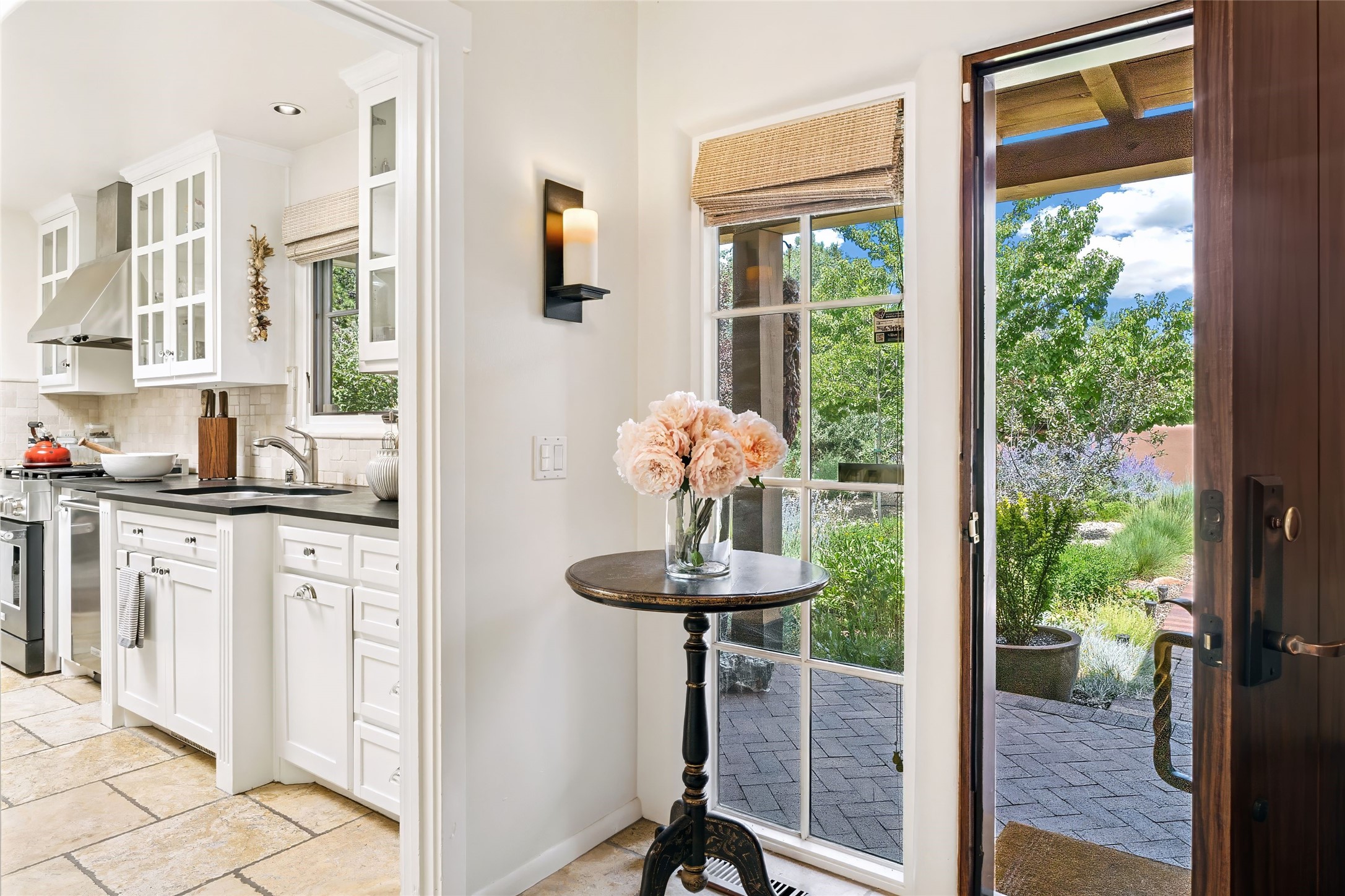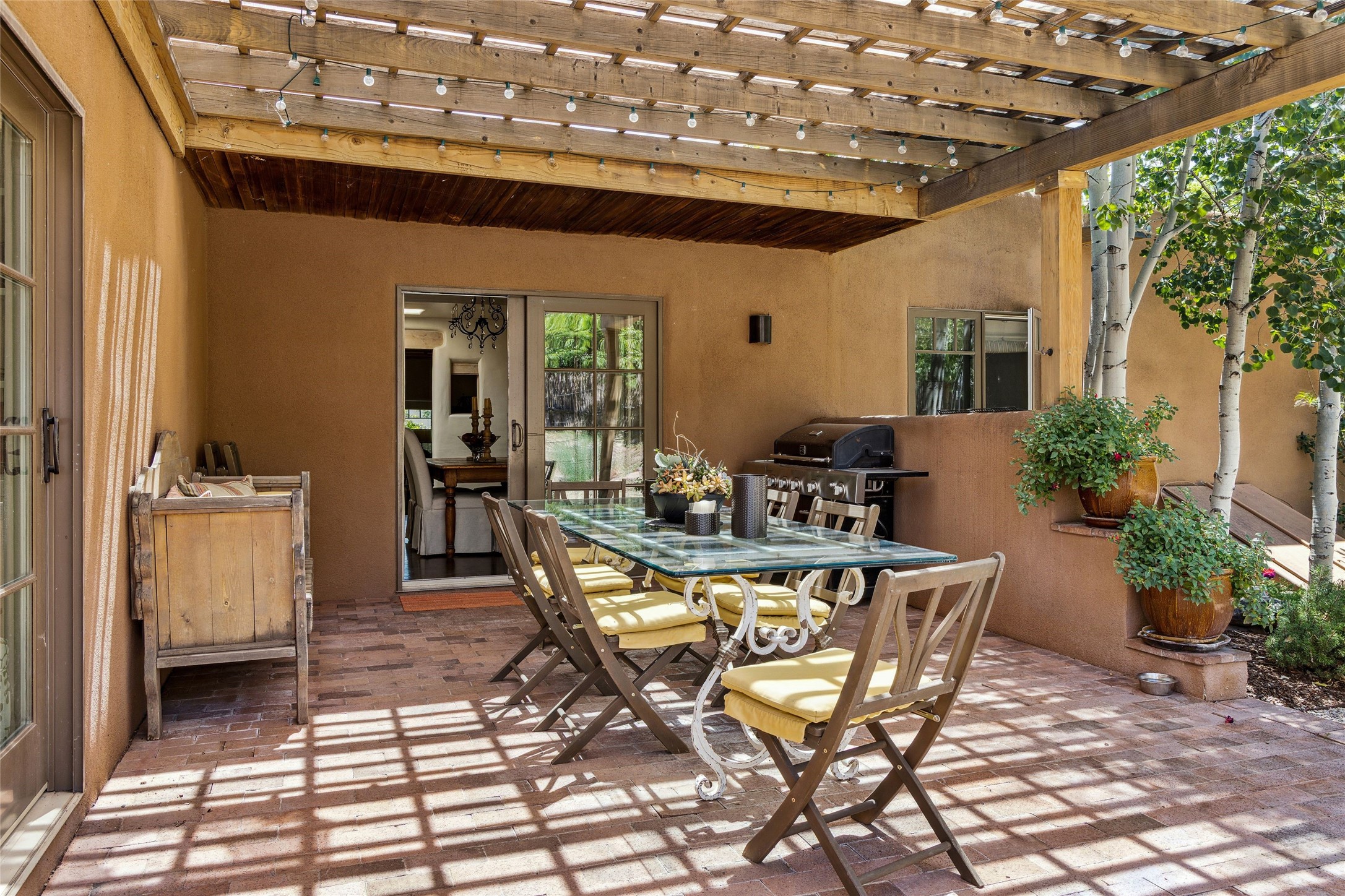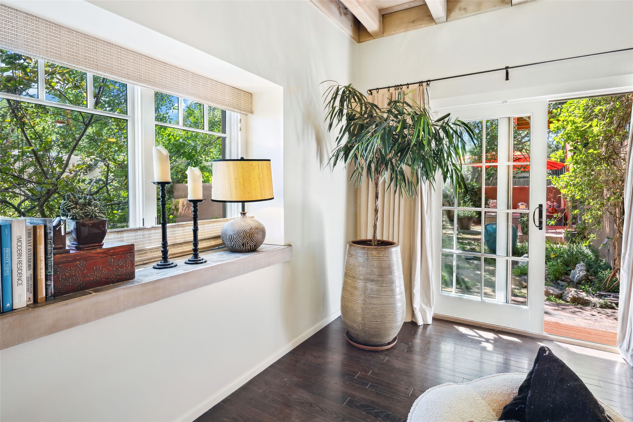 Nestled behind a private stucco-walled garden bursting with seasonal flowers, this single-level Santa Fe-style home reflects almost two decades of thoughtful design by its creative owners. Every detail tells a story--authentic, warm, and perfectly tailored for modern living. The convenient in town location is only blocks from the storied South Capital neighborhood. Step inside to discover sunlit interiors with rich hardwood floors, wood beamed ceilings, skylights, and an open flow that connects the heart of the home. The island kitchen, crowned with raised ceilings and Kitchen Aid appliances offers generous counter space and seamlessly opens to a cozy den anchored by a traditional kiva fireplace. The center hall floor plan offers a dining room with coved ceilings and views of an outdoor grilling patio with arbor. The sunken living room with corner kiva fireplace has access to the side courtyard with Aspen trees and fountain. The spacious bedrooms share an updated dual vanity bathroom with shower. The primary opens to the connecting side fountain courtyard. A luxurious laundry room, abundant storage, oversized attached two car garage and secondary gated driveway completes this home. Many updates over the years since ownership include adding landscaping, adding a front portal, replacing the windows/doors, updating the roof and stucco. Multiple outdoor living spaces invite you to savor Santa Fe's magical light--from mountain views from the front garden, morning coffee in the courtyard to evening gatherings under the stars. The landscaped grounds are a private sanctuary, with vibrant flowers and native plantings creating year-round beauty. This is more than a home--it's a carefully curated work of art, blending classic Southwestern architecture with the comfort and style of a designer's vision.