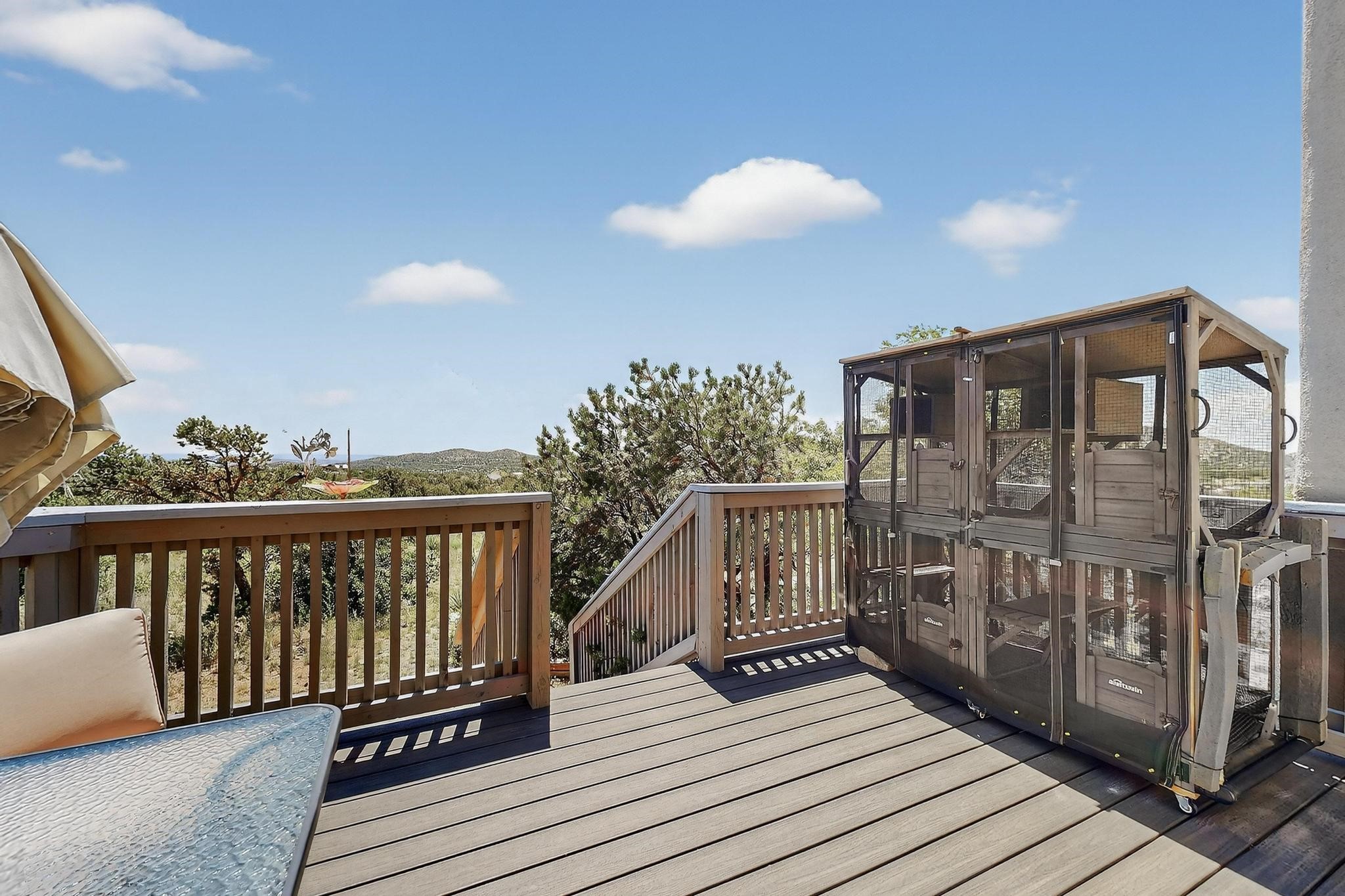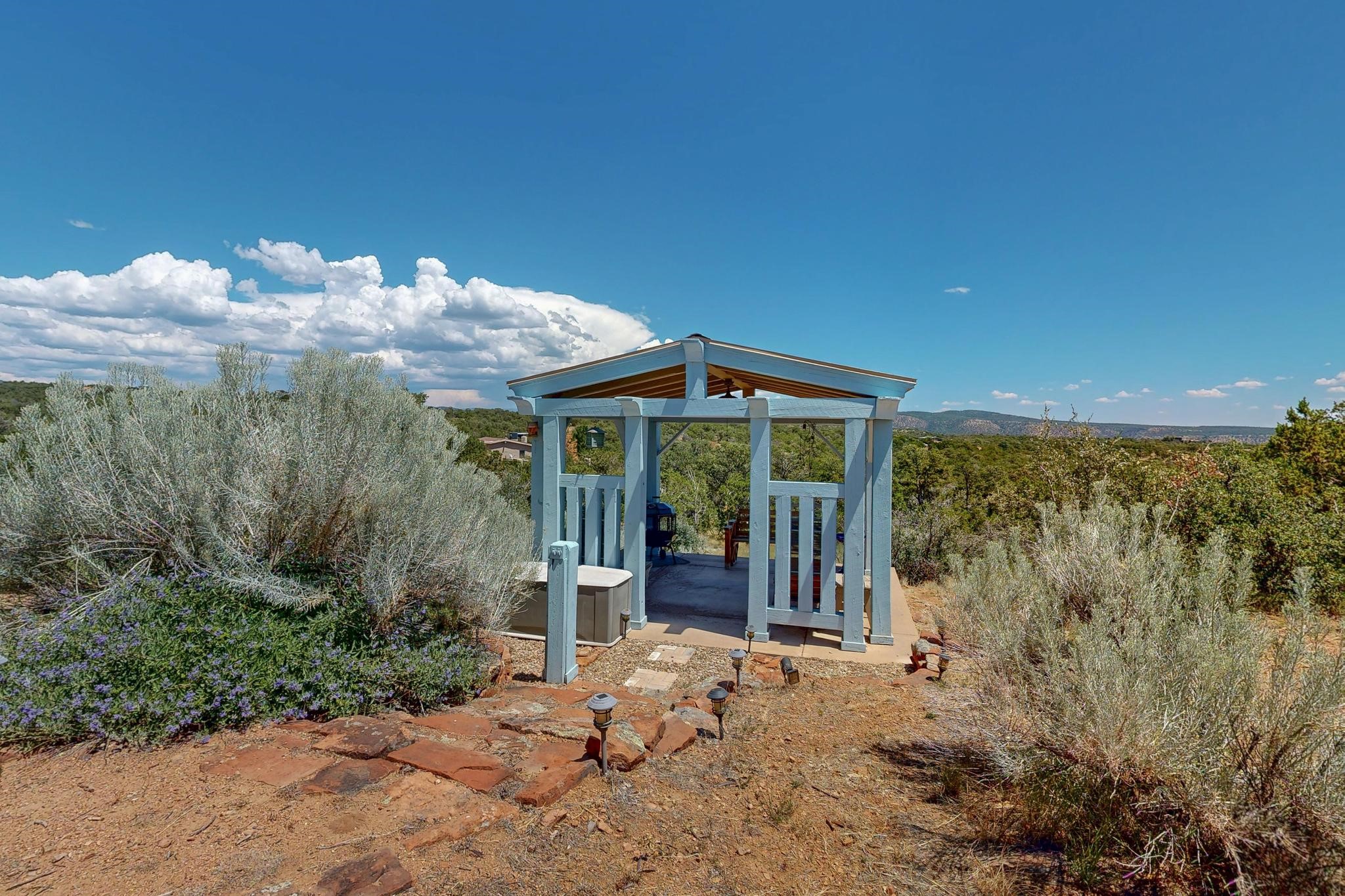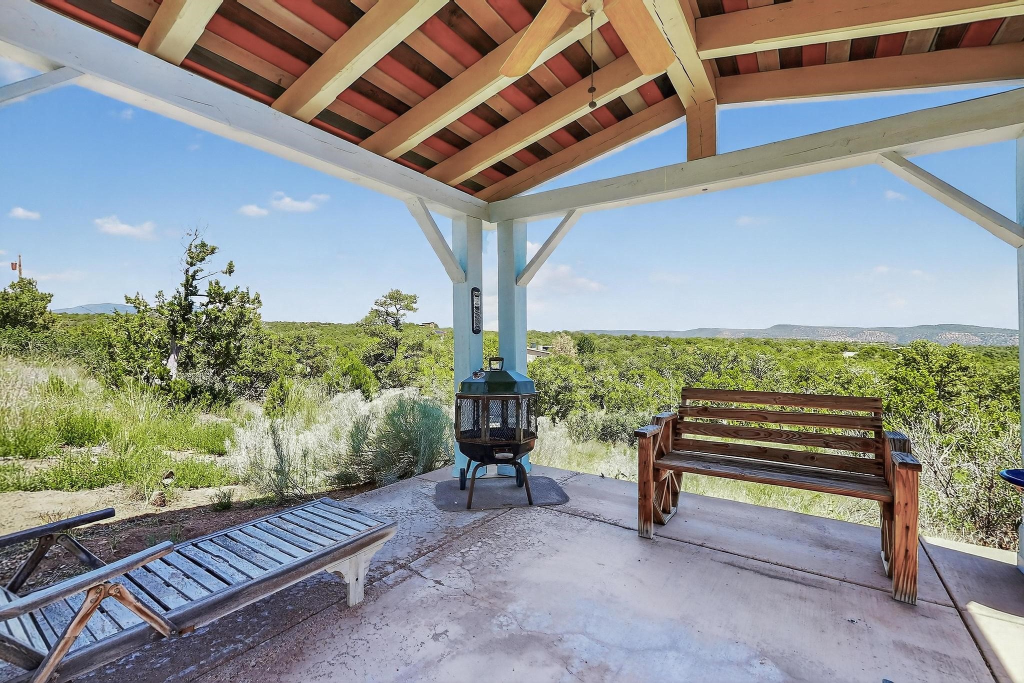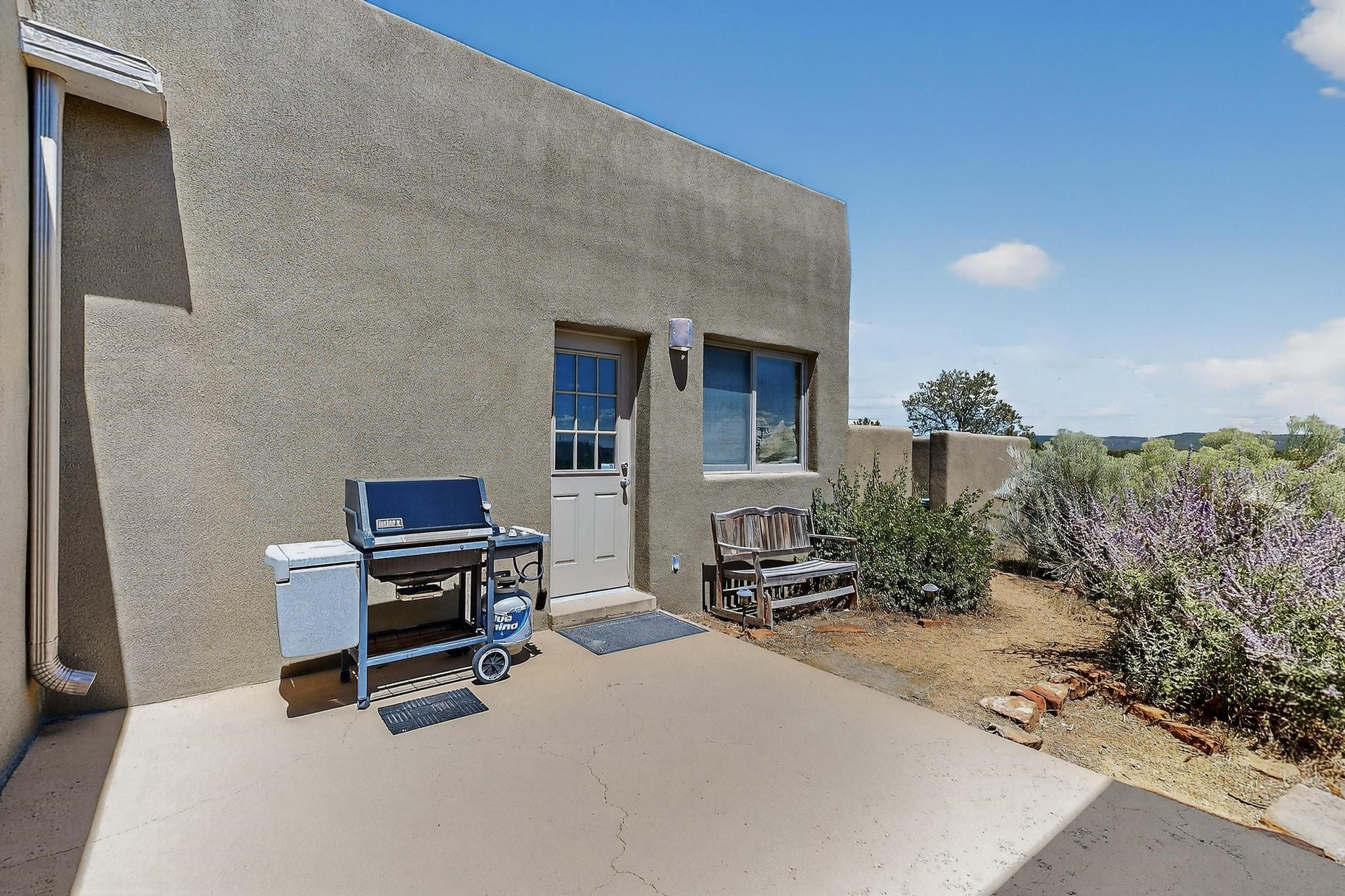 Priced to Sell! Wonderful passive solar trilevel design nestled on a hilltop with decks and a lighted gazebo enjoy the sweeping Sangre's and Pecos mountain views. A flexible floorpan with the owners suite, kitchen, dining and living areas on the main level. A TV / family room, and an office upstairs with a view deck. A walk out lower level includesl 2 guest bedrooms, a full bath and laundry. The 36' x 29' heated garage also has a workshop and storage room. In 2023 the stucco and roof were replaced, 3 Bosch mini splits added, a new tankless hot water heater, plus new windows and storm doors. 2 trex/wood decks, rain downspouts and the kitchen appliances. In 2024 the well pump was replaced, and there is a 1500 gallon underground cistern. The underground 500 gallon propane tank is owned, the hot tub is ready with fabulous views. All this on 5 acres, No HOA, horses and chickens welcome, only minutes to Eldorado area local shopping and services, or into historic Santa Fe.