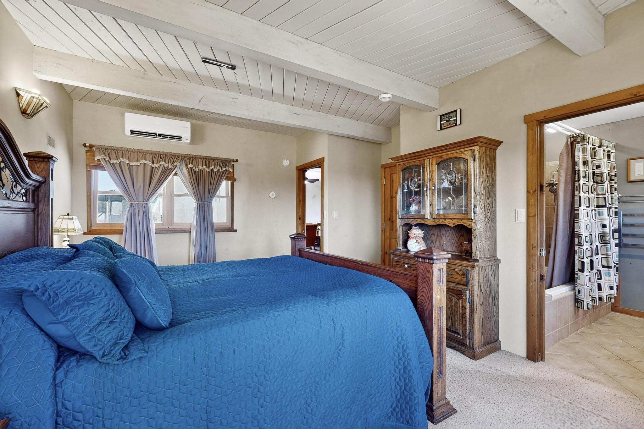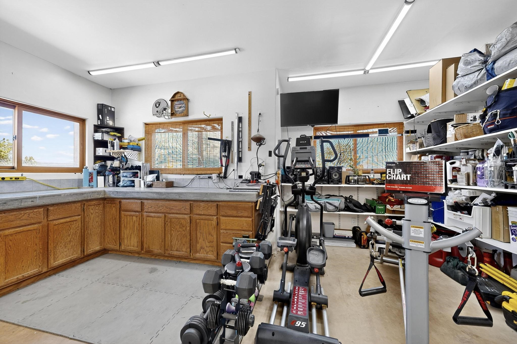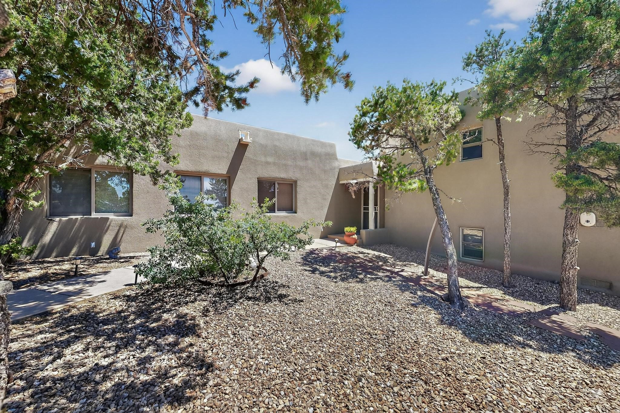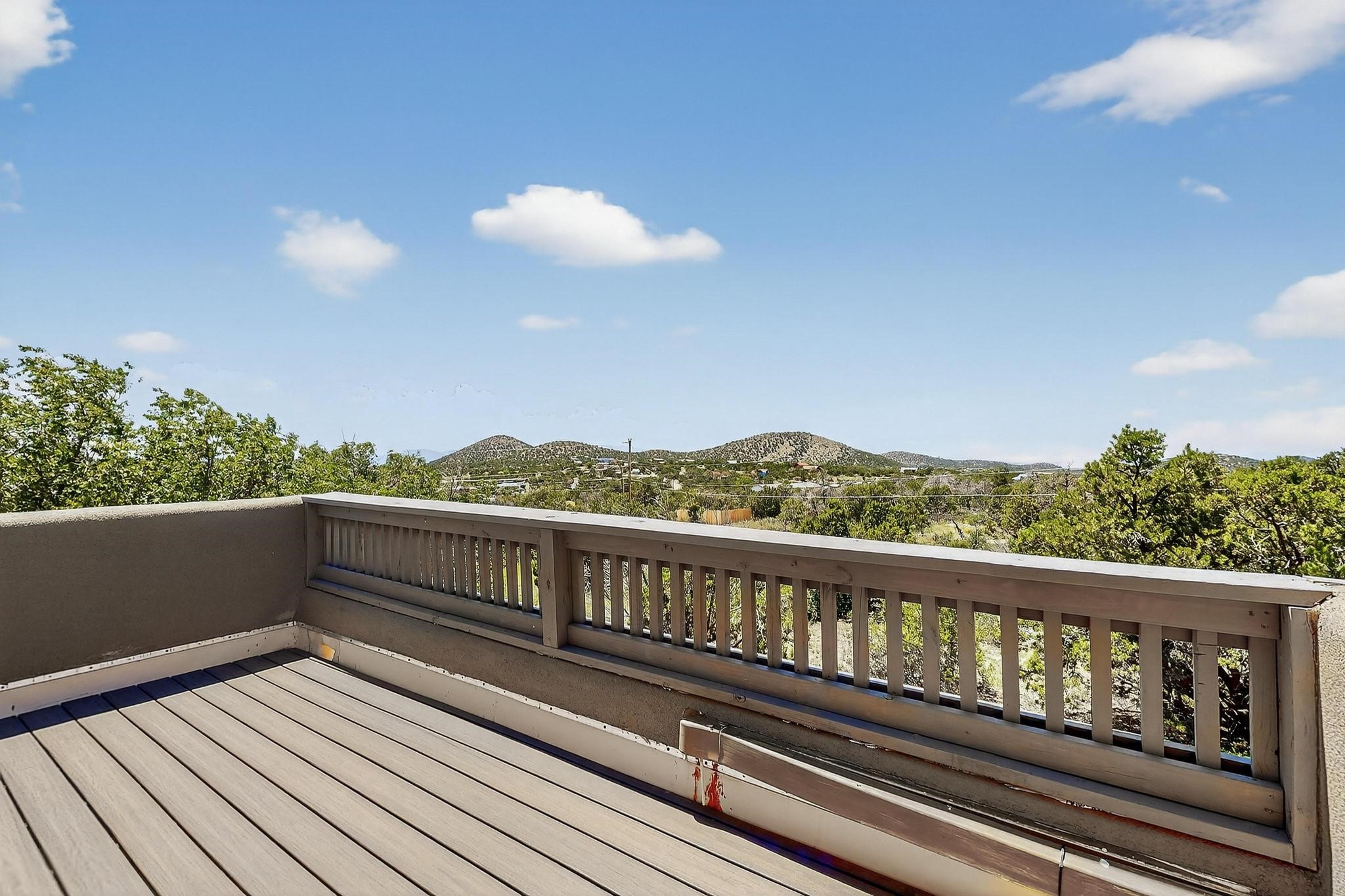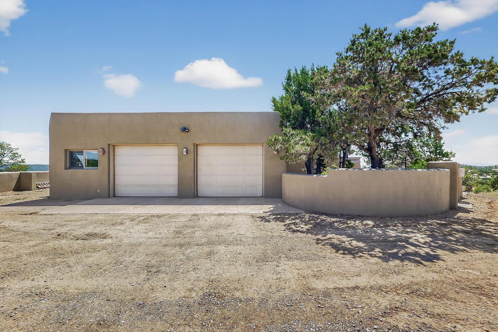 Priced to Sell! Wonderful passive solar trilevel design nestled on a hilltop with decks and a lighted gazebo enjoy the sweeping Sangre's and Pecos mountain views. A flexible floorpan with the owners suite, kitchen, dining and living areas on the main level. A TV / family room, and an office upstairs with a view deck. A walk out lower level includesl 2 guest bedrooms, a full bath and laundry. The 36' x 29' heated garage also has a workshop and storage room. In 2023 the stucco and roof were replaced, 3 Bosch mini splits added, a new tankless hot water heater, plus new windows and storm doors. 2 trex/wood decks, rain downspouts and the kitchen appliances. In 2024 the well pump was replaced, and there is a 1500 gallon underground cistern. The underground 500 gallon propane tank is owned, the hot tub is ready with fabulous views. All this on 5 acres, No HOA, horses and chickens welcome, only minutes to Eldorado area local shopping and services, or into historic Santa Fe.