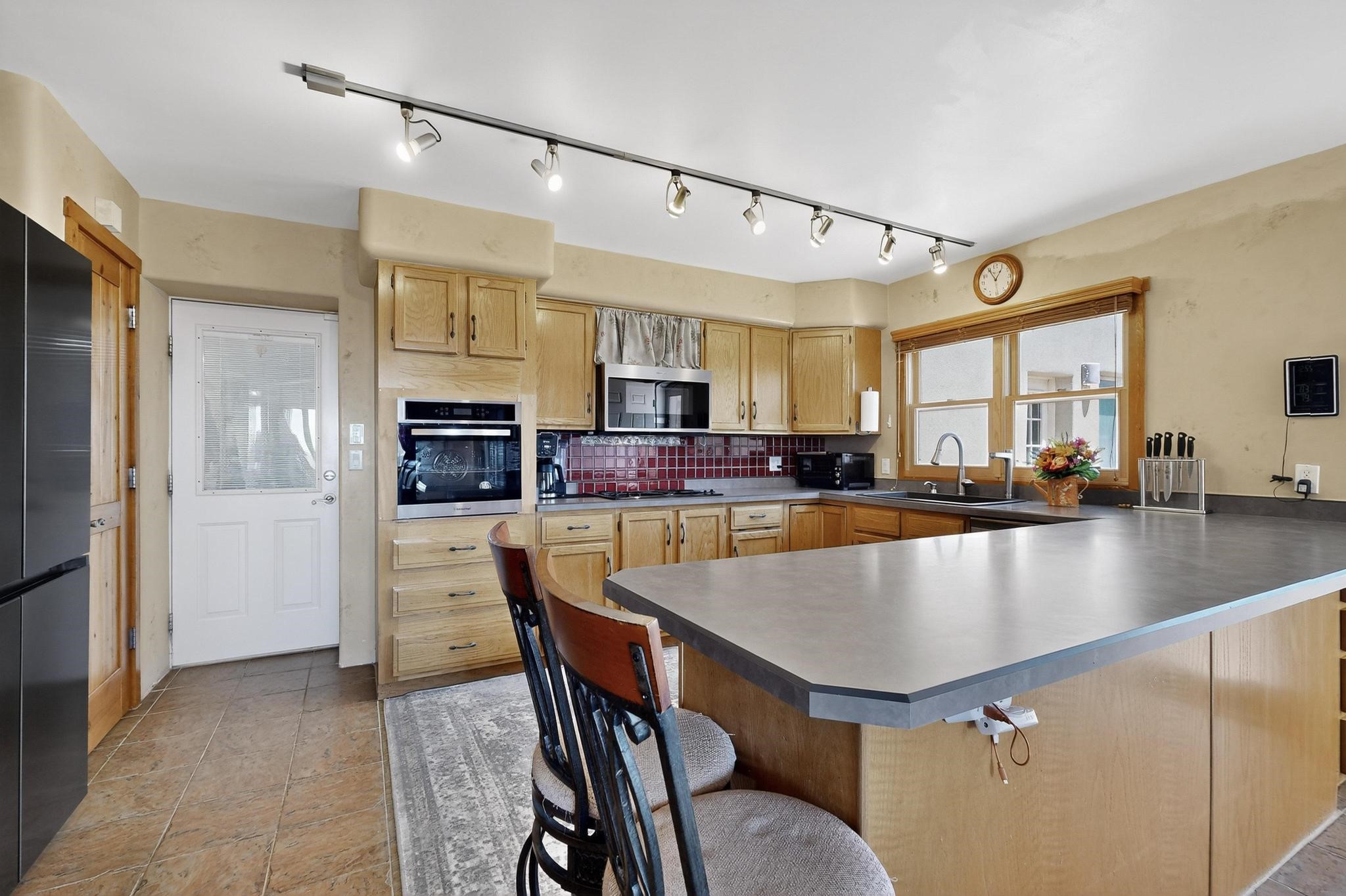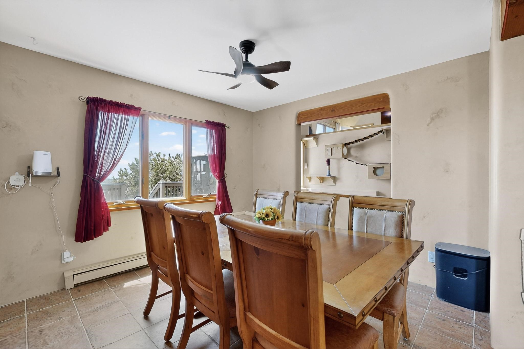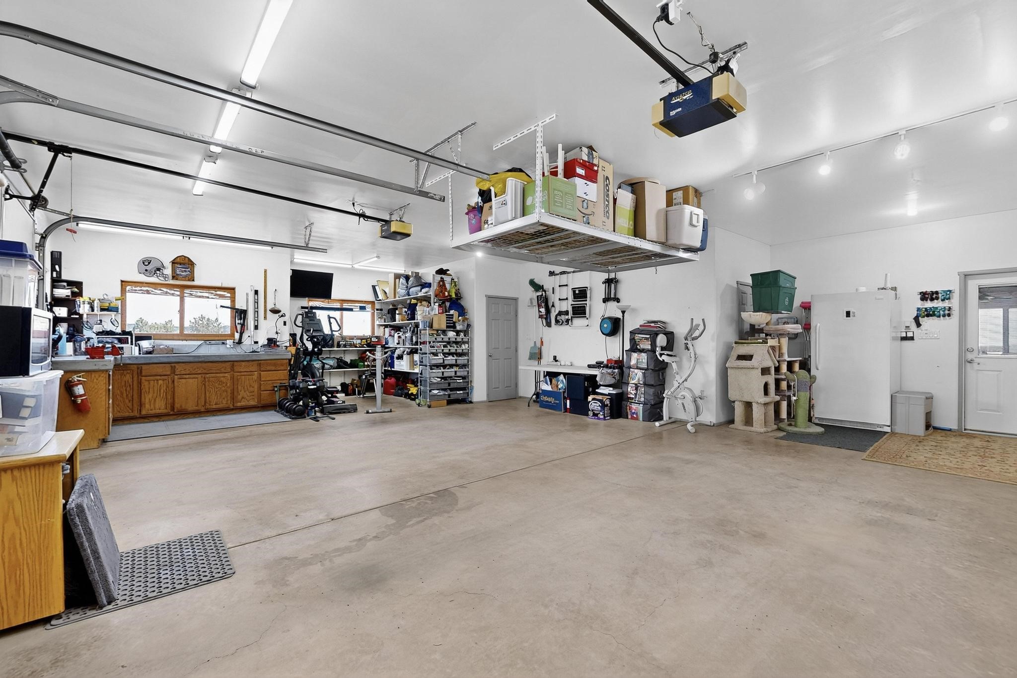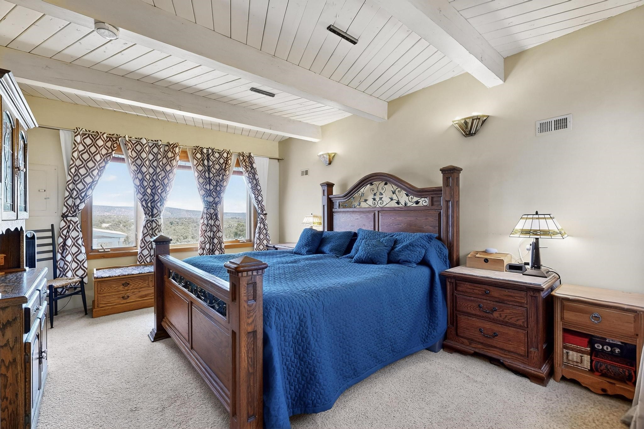 Priced to Sell! Wonderful passive solar trilevel design nestled on a hilltop with decks and a lighted gazebo enjoy the sweeping Sangre's and Pecos mountain views. A flexible floorpan with the owners suite, kitchen, dining and living areas on the main level. A TV / family room, and an office upstairs with a view deck. A walk out lower level includesl 2 guest bedrooms, a full bath and laundry. The 36' x 29' heated garage also has a workshop and storage room. In 2023 the stucco and roof were replaced, 3 Bosch mini splits added, a new tankless hot water heater, plus new windows and storm doors. 2 trex/wood decks, rain downspouts and the kitchen appliances. In 2024 the well pump was replaced, and there is a 1500 gallon underground cistern. The underground 500 gallon propane tank is owned, the hot tub is ready with fabulous views. All this on 5 acres, No HOA, horses and chickens welcome, only minutes to Eldorado area local shopping and services, or into historic Santa Fe.
