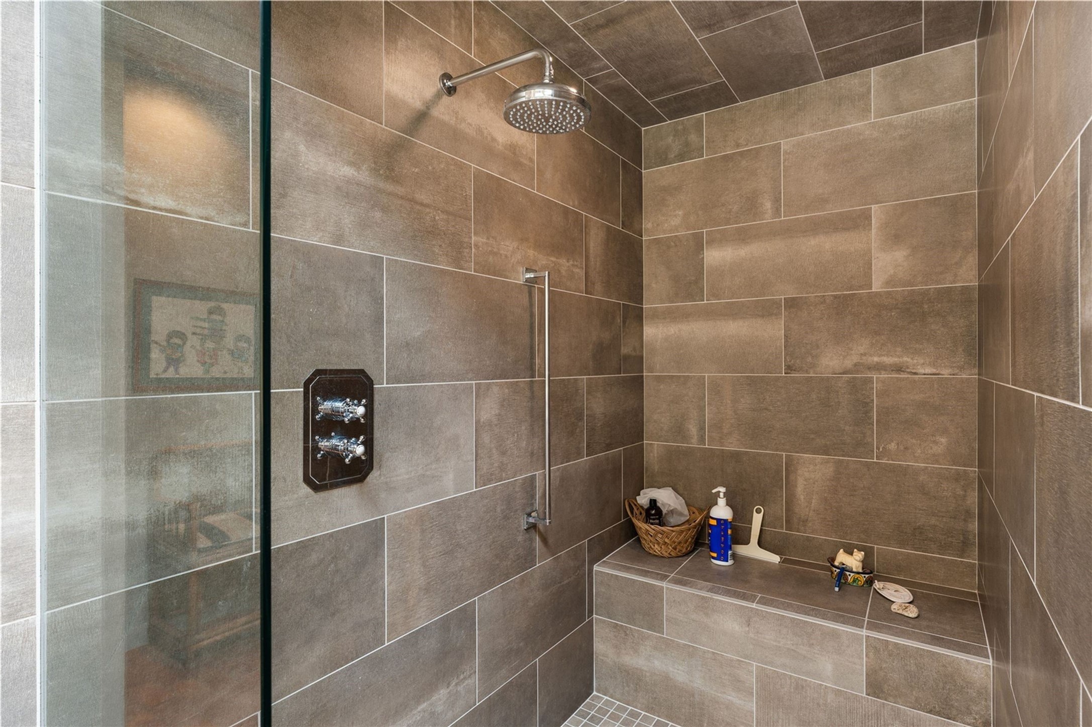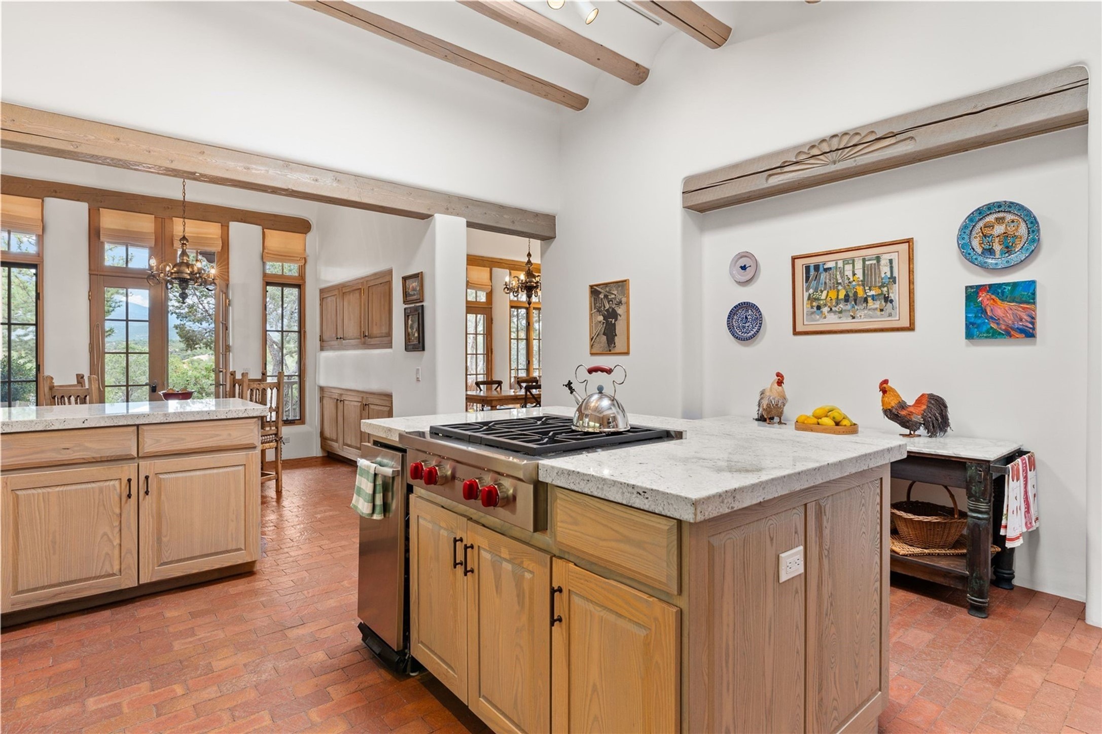 Gated Sangre de Cristo Estates 3 bedroom, 3.5 bath, single level, custom-built home with spectacular Sangre de Cristo Mountain views. Quality design features throughout include high ceilings, spacious rooms, vigas and beams, wood and brick floors, diamond finish plaster walls and arched doorways. Many recent improvements such as new (2023) membrane roof, completely renovated kitchen and baths, and brick driveways. Light and airy living room with stately fireplace. Spacious gourmet kitchen with high-end Bosch appliances, center island with Wolf gas range top, plentiful cabinetry and an informal breakfast room. Dining room with French doors and built in cabinetry. Dedicated personal library with a wood burning kiva fireplace and French doors to the outside in addition to a second living area or media room. There are 3-bedroom suites set apart from one another. Primary suite includes a kiva fireplace, sitting area and a wall of doors to the outside. Bonus flex space can be a personal gym or office. 2-car attached garage. The deep portals provide space for large events or leisurely relaxation in a secluded setting among mature pions and aspens, established landscaping, and sweeping mountain views. Conveniently located with easy access to 84/285 and only minutes away from the Santa Fe Opera and the historic downtown Plaza.