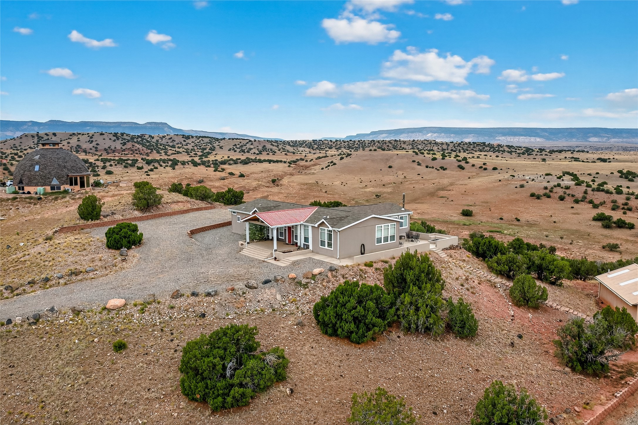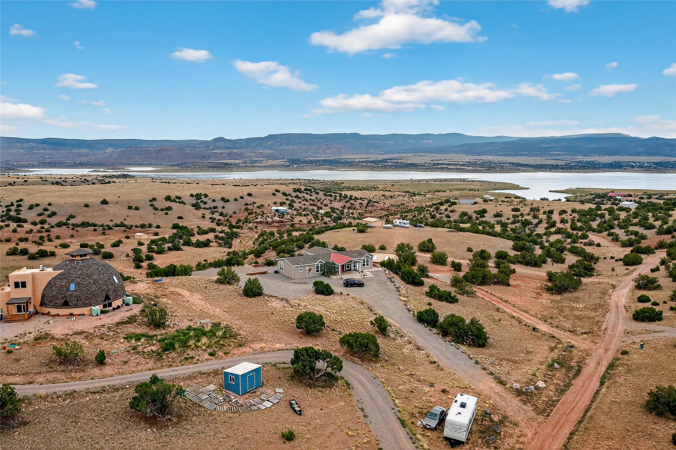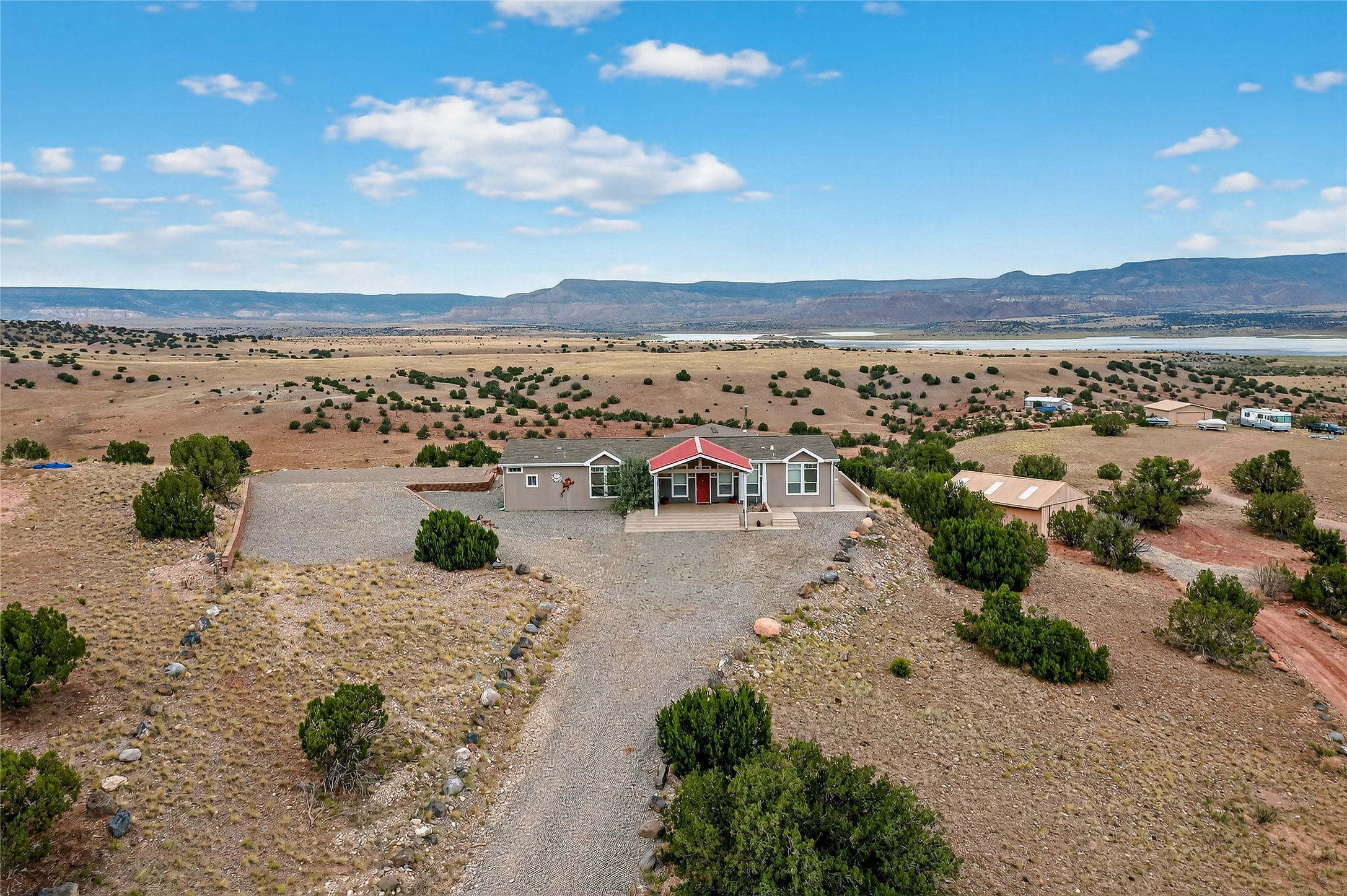 This home and its location has it all! When you have a place that has majestic views in all directions, your choices of where you sit and relax makes it exciting. The setting is incredible, Views to the north at the red rocks that are near the Ghost Ranch, the Canjilon Mountains farther north and the Comanche Canyon to the N East, and then the Sangre de Cristo to the east, the small mountains that are on either side of the Abiquiu Dam, and there is the Prominent Predenal Mountain. Magnificent as it stands proud as it can be seen from far away.This property is overlooking Abiquiu Lake and Mesa de Las Viejos, the walls of this Mesas offer a geologic time chart displaying different colors of strata. The view changes according to how the sun reflects on it. Never the same view but always an amazing view. This view can be seen from inside the home or outside on the side patio. Beginning with the drive up to the property, one is welcomed by the steps up to a wonderful porch leading to the front door entrance. The home has an open concept entry to the kitchen, dining, and living room and one can immediately walk into the special addition with all the exceptional views. The house is very well appointed with the owner suite on one side, along with another bedroom with, the other two other bedrooms and bath on the opposite side. There is also a large detached garage filled with many toys. The subdivision does offer a boat ramp that is available to all members, depending on the elevation of the lake. The home could be sold with all the furnishing, to include a pool table and all the toys in the garage with an accepted offer. This is a home you definitely want to see. It is move in ready! Once purchased one only needs to pack a bag with clothes, a toothbrush and tooth paste, and groceries. This is a home you never want to leave and always look forward to one's return.