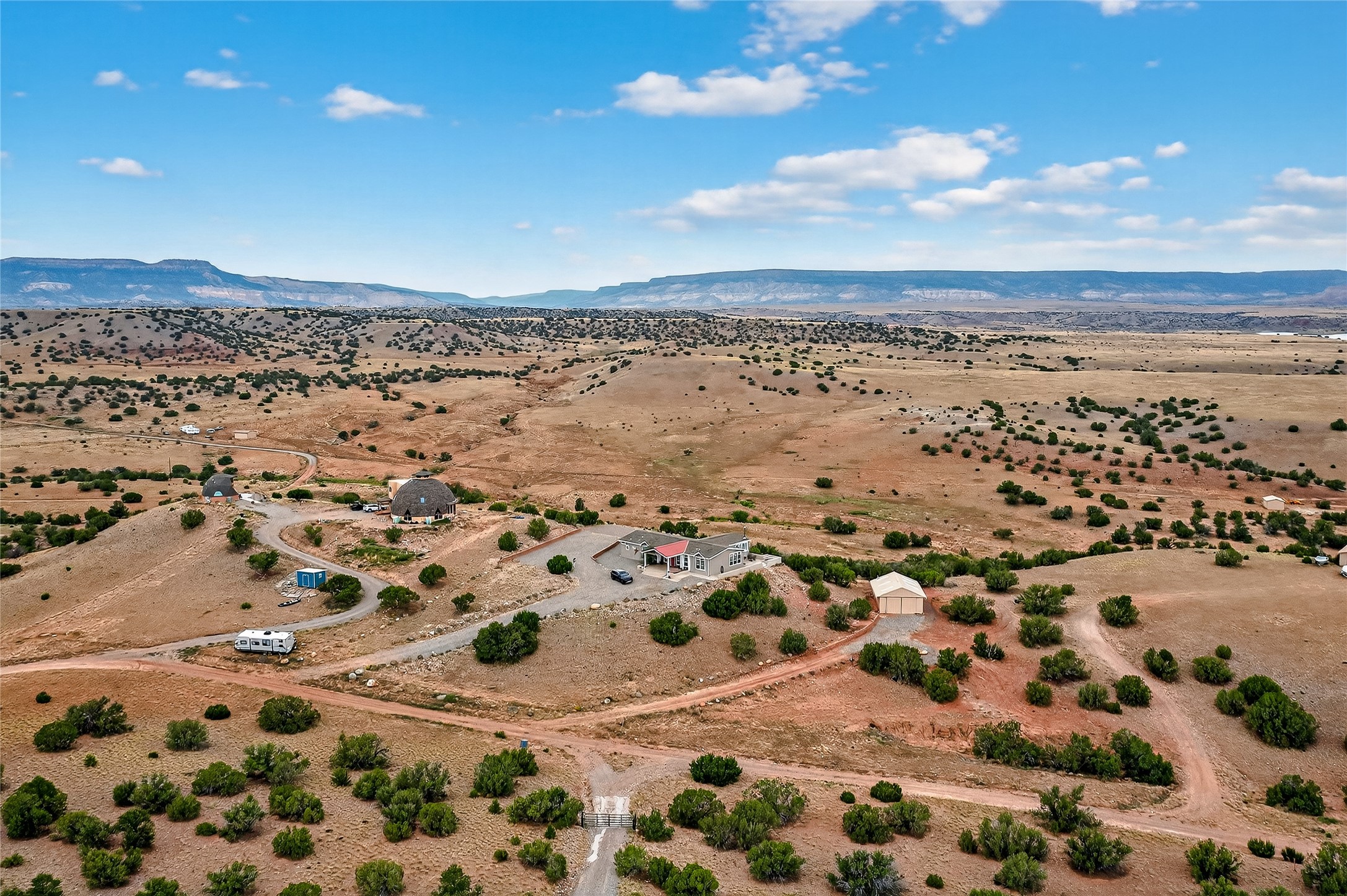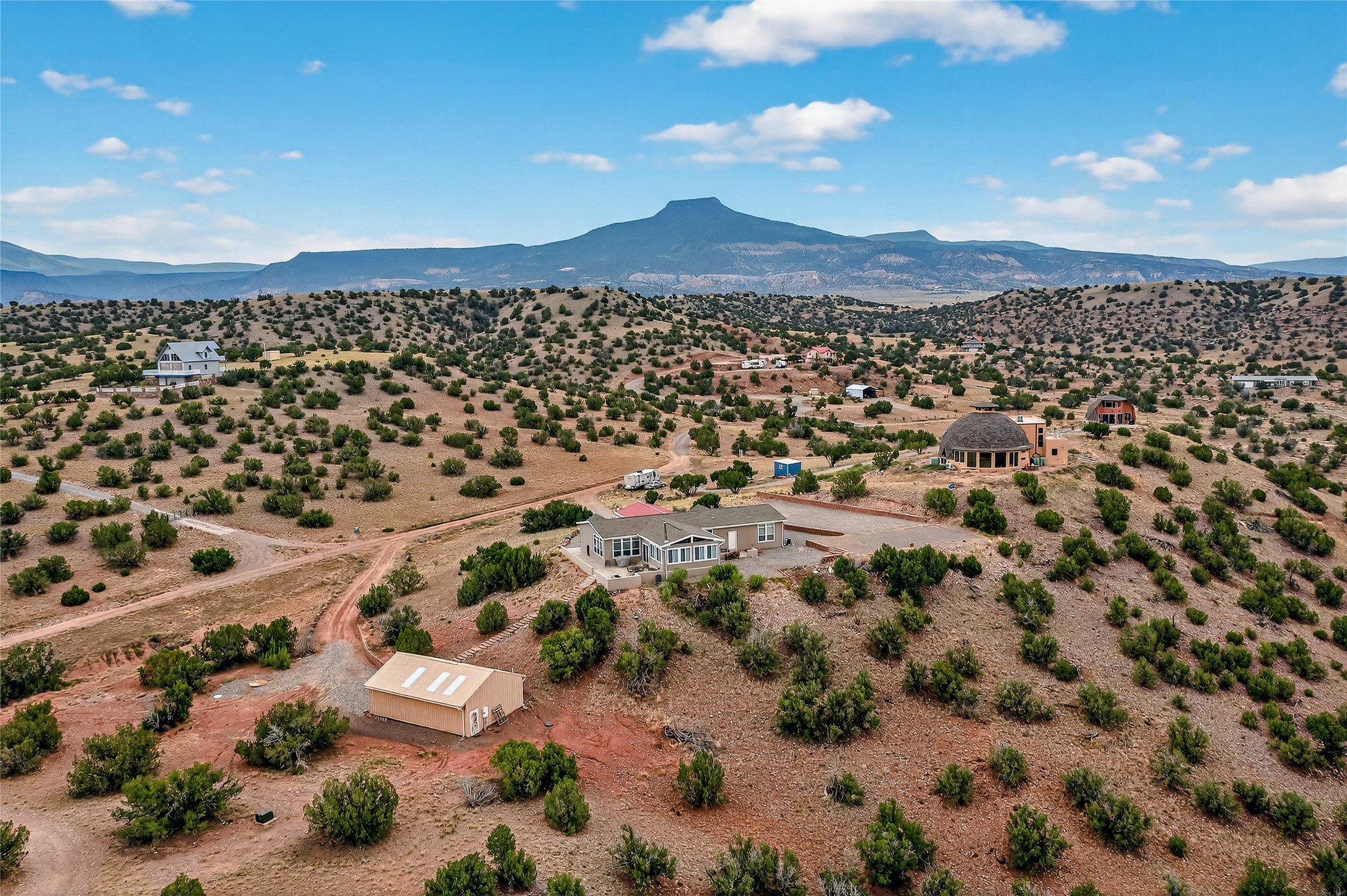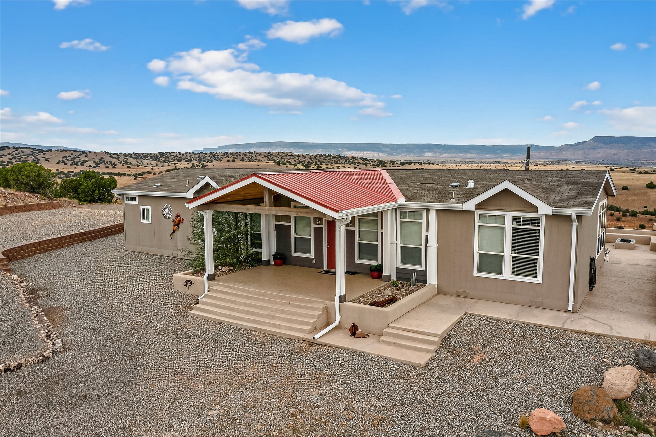 This home and its location has it all! When you have a place that has majestic views in all directions, your choices of where you sit and relax makes it exciting. The setting is incredible, Views to the north at the red rocks that are near the Ghost Ranch, the Canjilon Mountains farther north and the Comanche Canyon to the N East, and then the Sangre de Cristo to the east, the small mountains that are on either side of the Abiquiu Dam, and there is the Prominent Predenal Mountain. Magnificent as it stands proud as it can be seen from far away.This property is overlooking Abiquiu Lake and Mesa de Las Viejos, the walls of this Mesas offer a geologic time chart displaying different colors of strata. The view changes according to how the sun reflects on it. Never the same view but always an amazing view. This view can be seen from inside the home or outside on the side patio. Beginning with the drive up to the property, one is welcomed by the steps up to a wonderful porch leading to the front door entrance. The home has an open concept entry to the kitchen, dining, and living room and one can immediately walk into the special addition with all the exceptional views. The house is very well appointed with the owner suite on one side, along with another bedroom with, the other two other bedrooms and bath on the opposite side. There is also a large detached garage filled with many toys. The subdivision does offer a boat ramp that is available to all members, depending on the elevation of the lake. The home could be sold with all the furnishing, to include a pool table and all the toys in the garage with an accepted offer. This is a home you definitely want to see. It is move in ready! Once purchased one only needs to pack a bag with clothes, a toothbrush and tooth paste, and groceries. This is a home you never want to leave and always look forward to one's return.