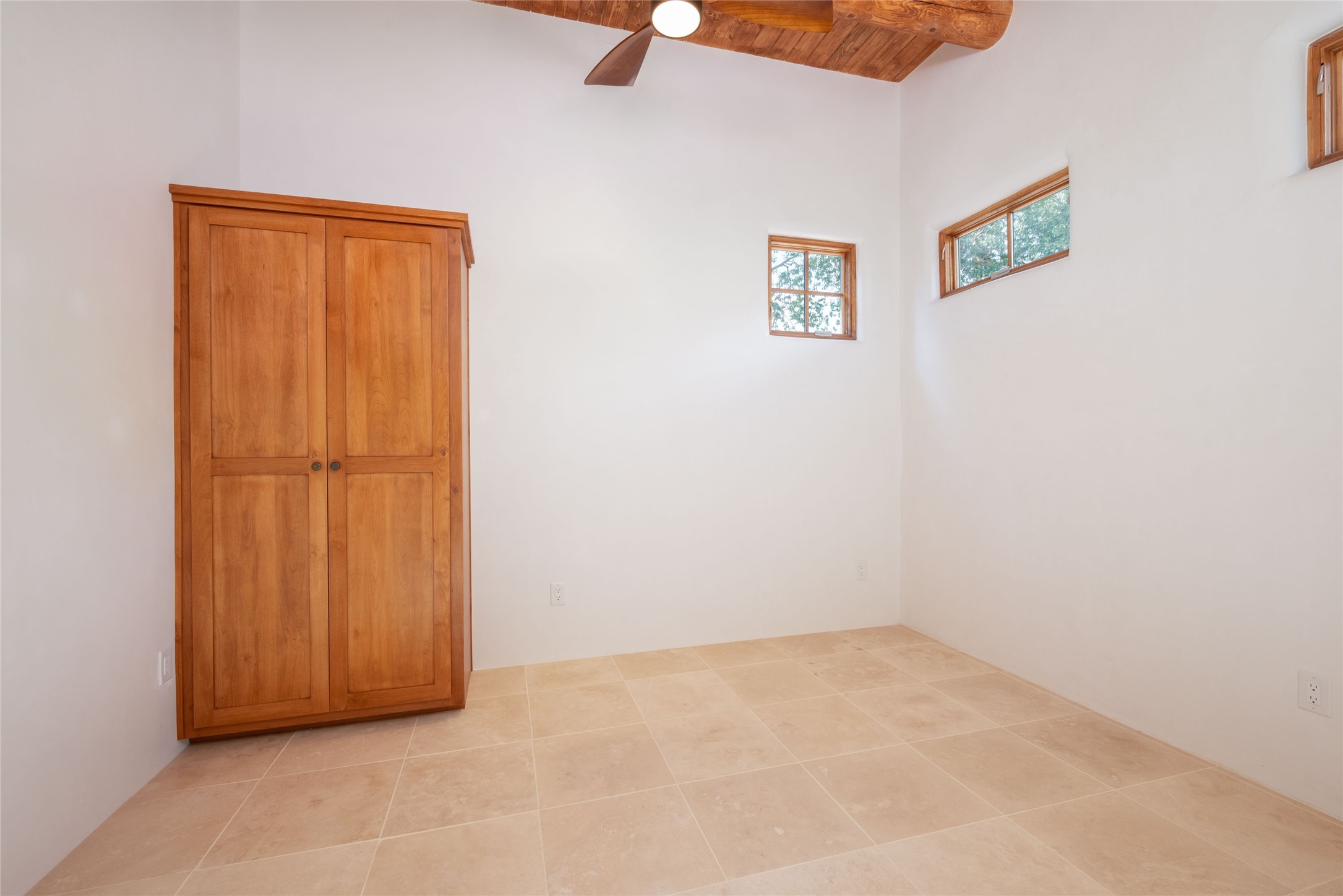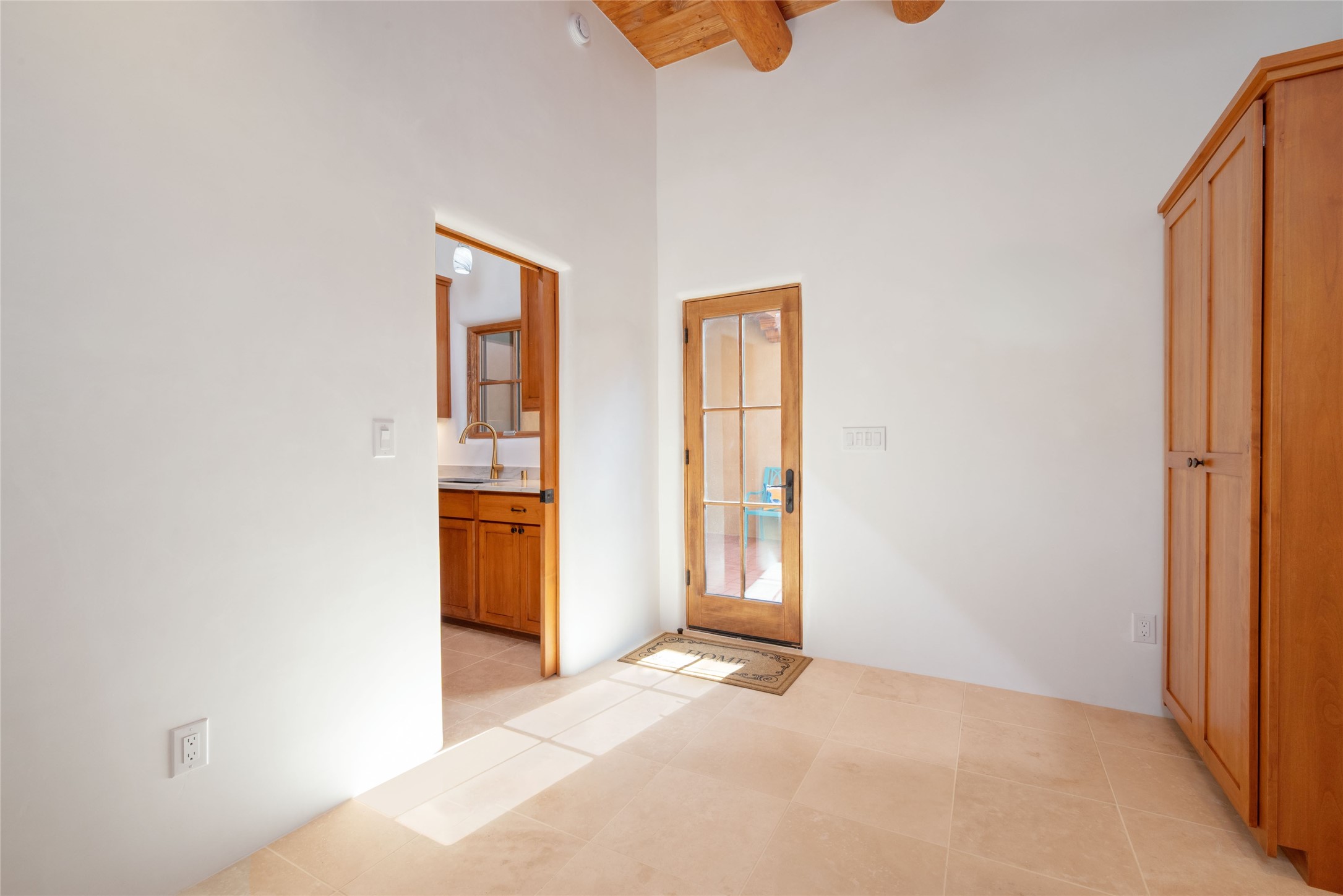 New construction throughout with a beautifully designed and hand-crafted adobe remodel and addition, this home blends classic Santa Fe style with modern comfort. A charming private courtyard greets you before the front door opens to a light-filled living room with high ceilings, exposed vigas, hand-troweled plaster walls, wood floors, and a custom-designed fireplace with quartz stone mantles. The gourmet kitchen features custom Alder cabinets, a built-in Wolf cooktop and oven, Fisher & Paykel refrigerator/freezer, Bosch dishwasher, quartz stone countertops, custom hardware and lighting, and travertine stone tile floors. The thoughtful three-bedroom, two-bath floor plan provides excellent separation between the luxurious primary suite and the additional bedrooms. One bedroom, located near the kitchen with its own entrance, offers flexibility for guests or use as a home office/den, with easy access to the courtyard. The primary suite exudes a spa-like feel, with warm plaster tones, natural wood finishes, custom Alder cabinetry and vanities, Italian porcelain tile surrounds, quartz countertops, a whirlpool bath, and a Kohler shower with body sprays. Additional bath features include mirrored, lighted anti-fog cabinets, a built-in makeup table with a lighted mirror, and elegant fixtures throughout. Other highlights include a custom-built entry gate, solid Alder doors, refrigerated air conditioning and heating, Pella windows, and Hunter Douglas blinds. Ideal as a full-time residence or a Santa Fe getaway, this home combines craftsmanship, comfort, and style in a prime location.